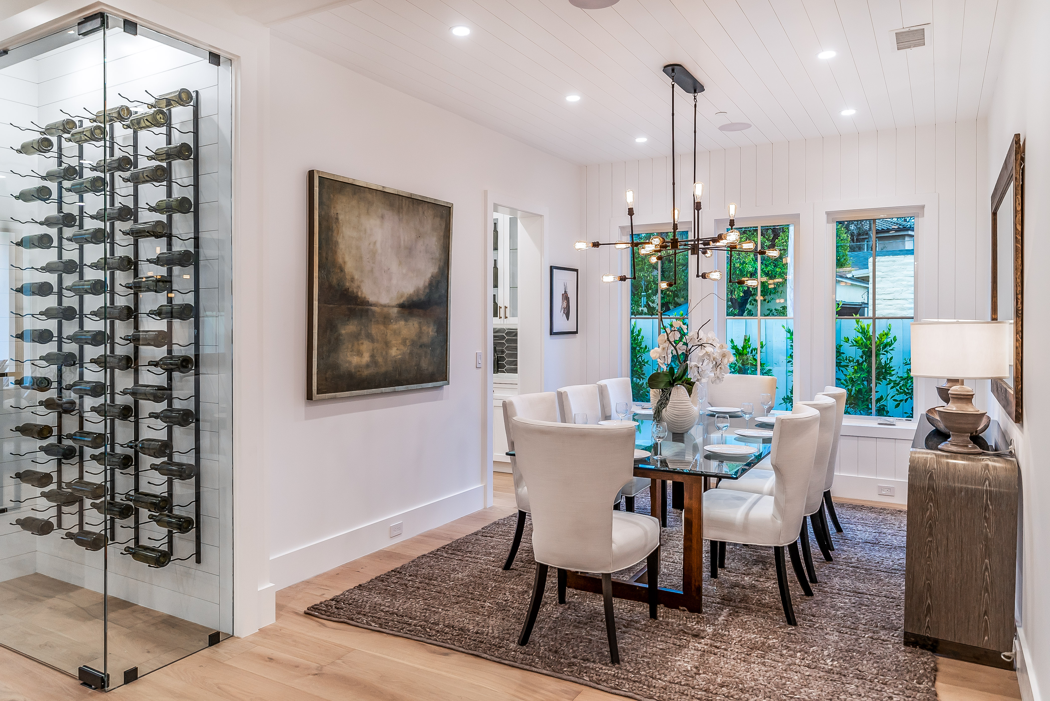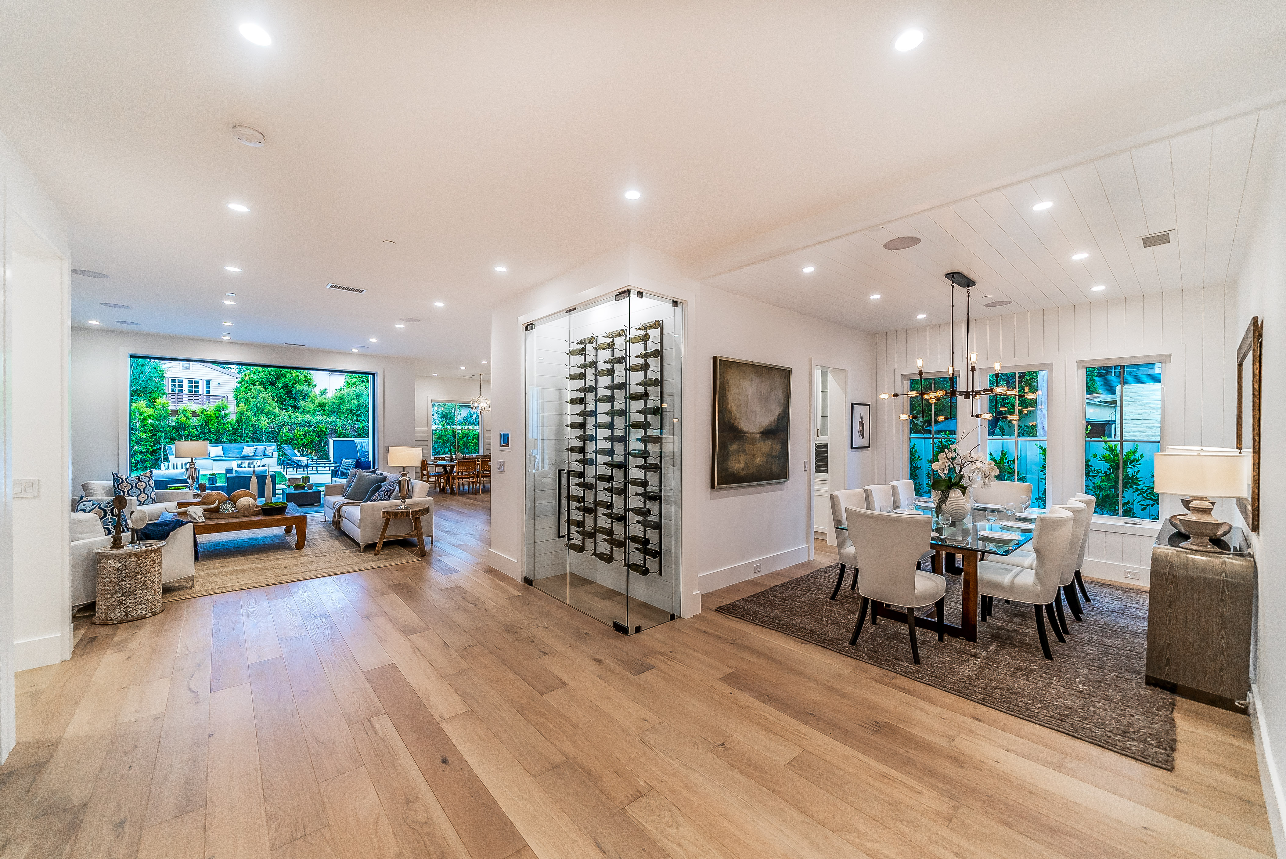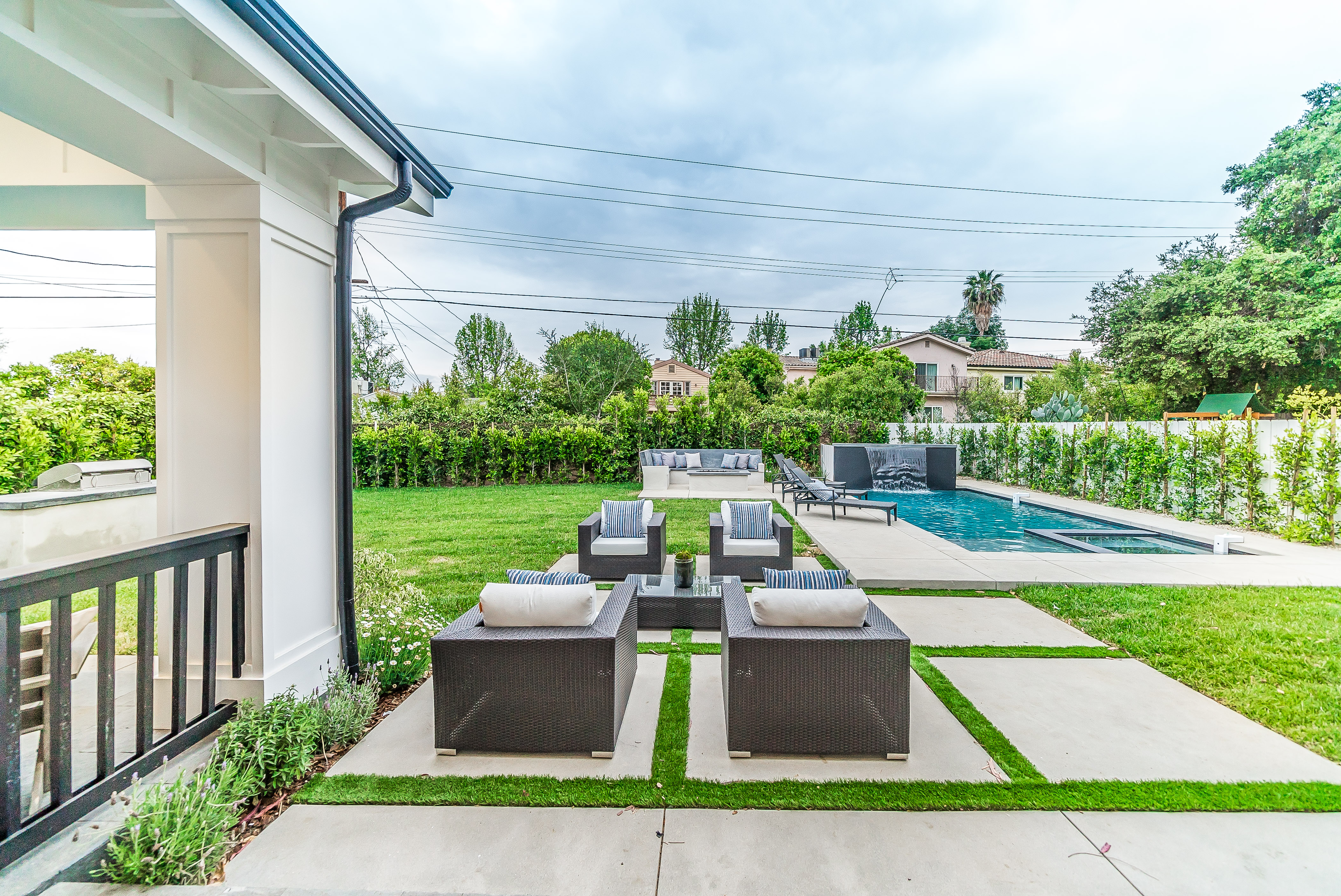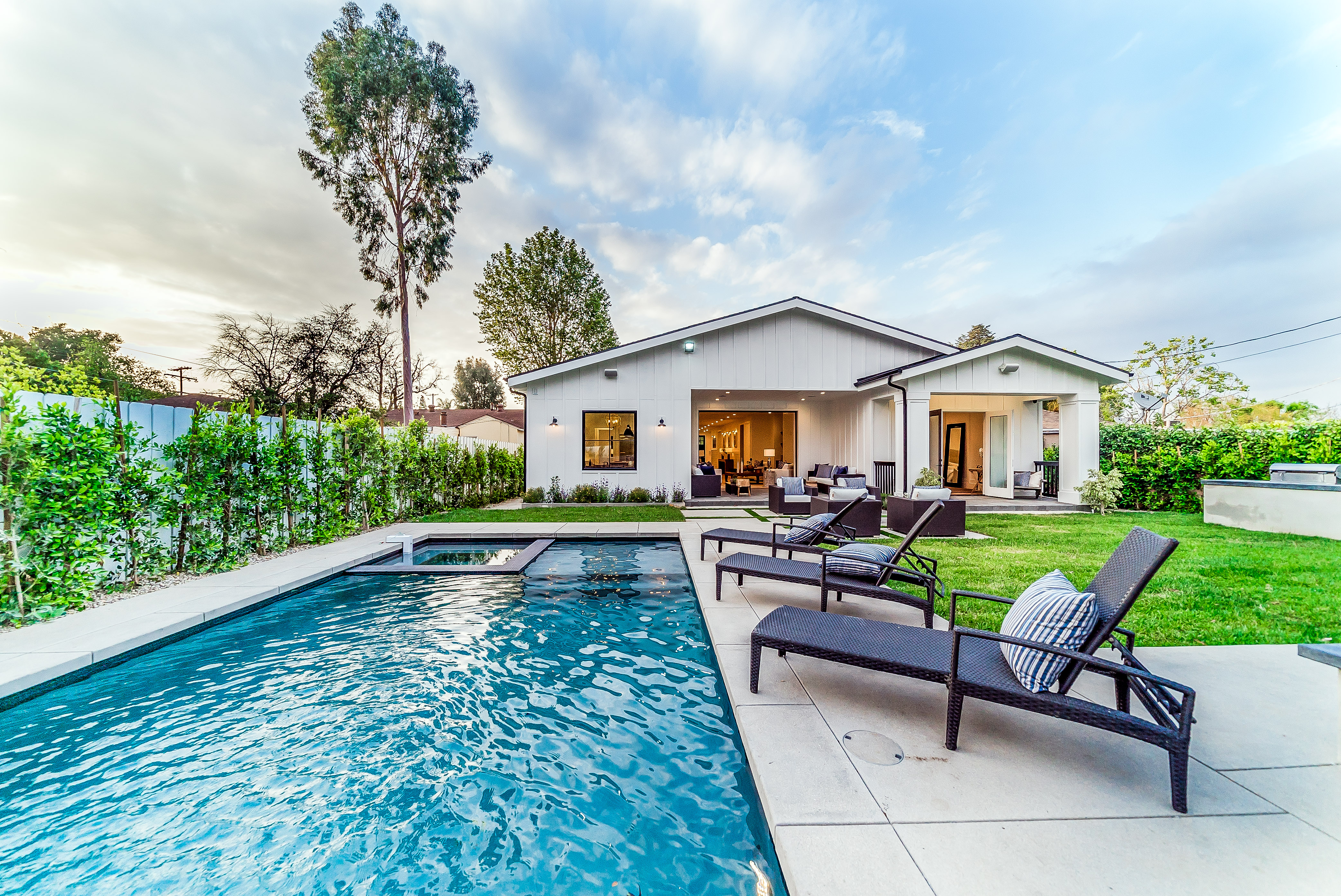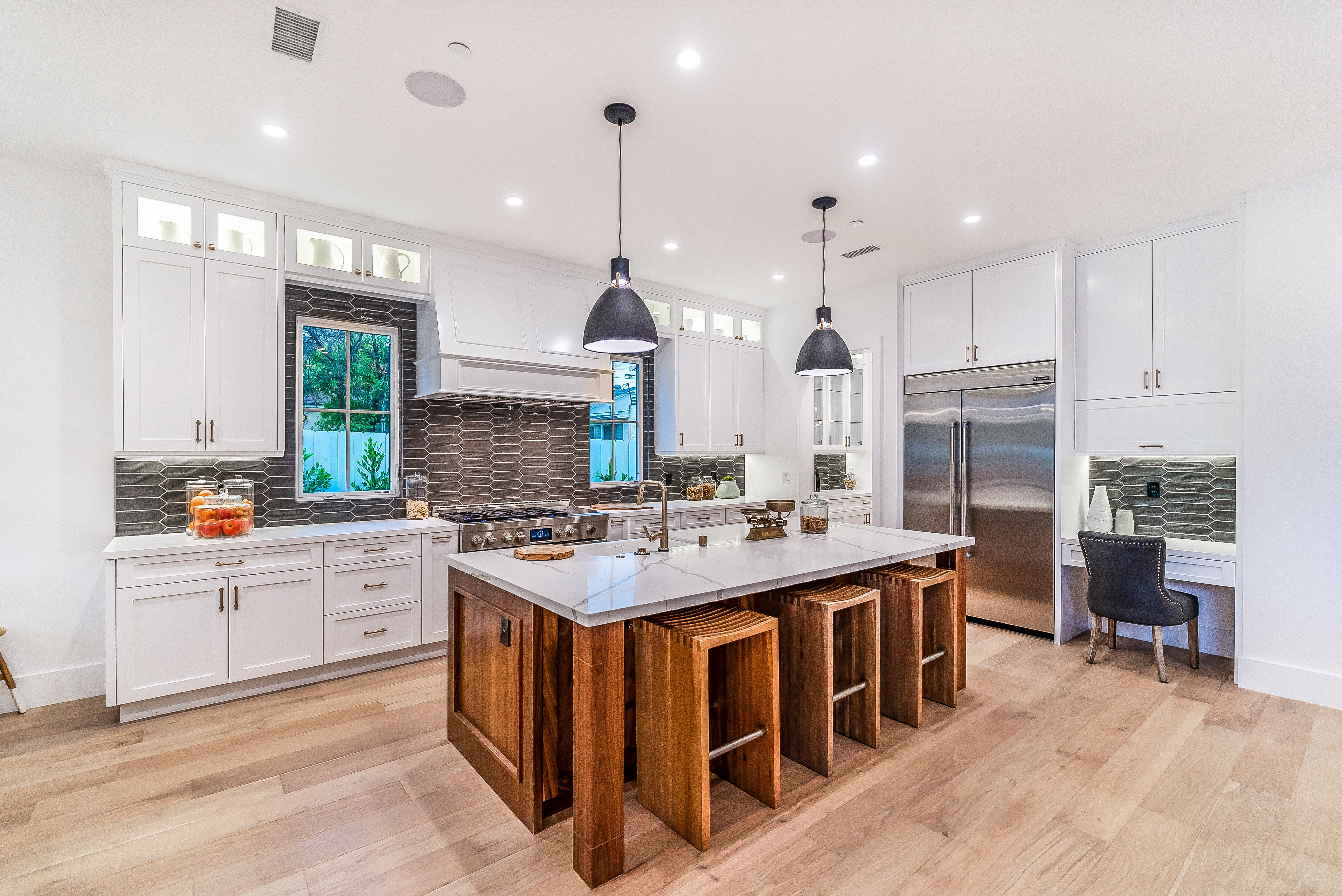 Situated in a quaint family neighborhood in Encino, this striking new custom designed home perfectly balances modern sophistication and timeless classic style. Pass lush landscaped grounds as you walk through the front doors and are greeted by soaring ceilings, white oak flooring, a bright open floor plan that flows seamlessly across all main living areas. A grand formal living room for entertaining with large windows that bring in natural light. With approx. 3,600 square-feet of designer living space boasting 4 ensuite bedrooms with built-in closets, 4.5 bathrooms all laid out on a 9,000 square-foot lot! Amenities include a custom glass-enclosed wine cellar, dining area with paneled wall+ceiling details, industrial style light fixtures and beautiful flooring. The living room hosts a sleek white brick fireplace accompanied by custom built-ins & tall glass sliding doors. The chef’s kitchen comes complete with high-end appliances, stone countertops & center island with farmhouse sink, separate breakfast area, & a butler’s pantry. The master bedroom is one to boast about, with a custom walk-in closet, high pitched ceilings and elegant master bathroom. Perfect single story family home!
