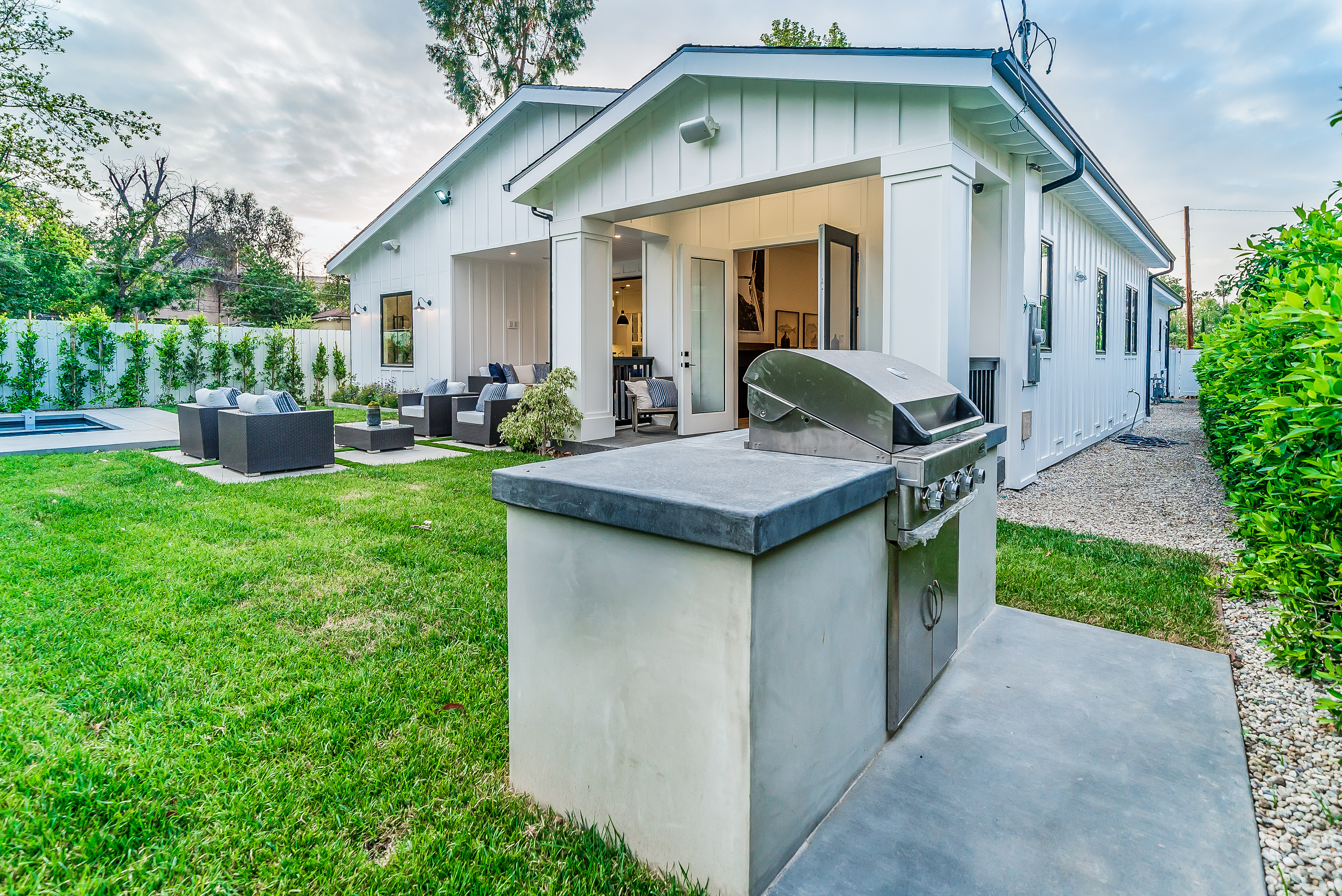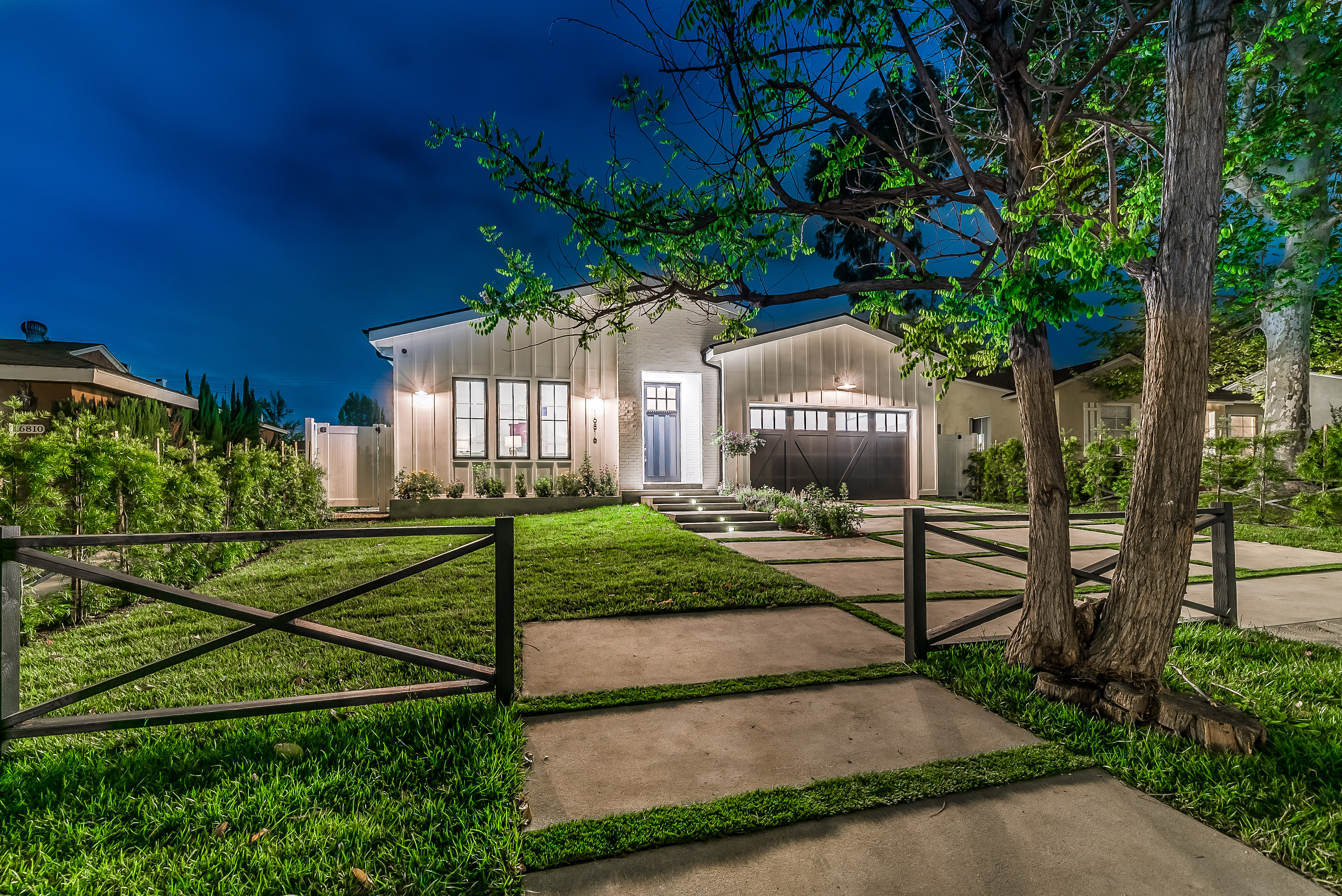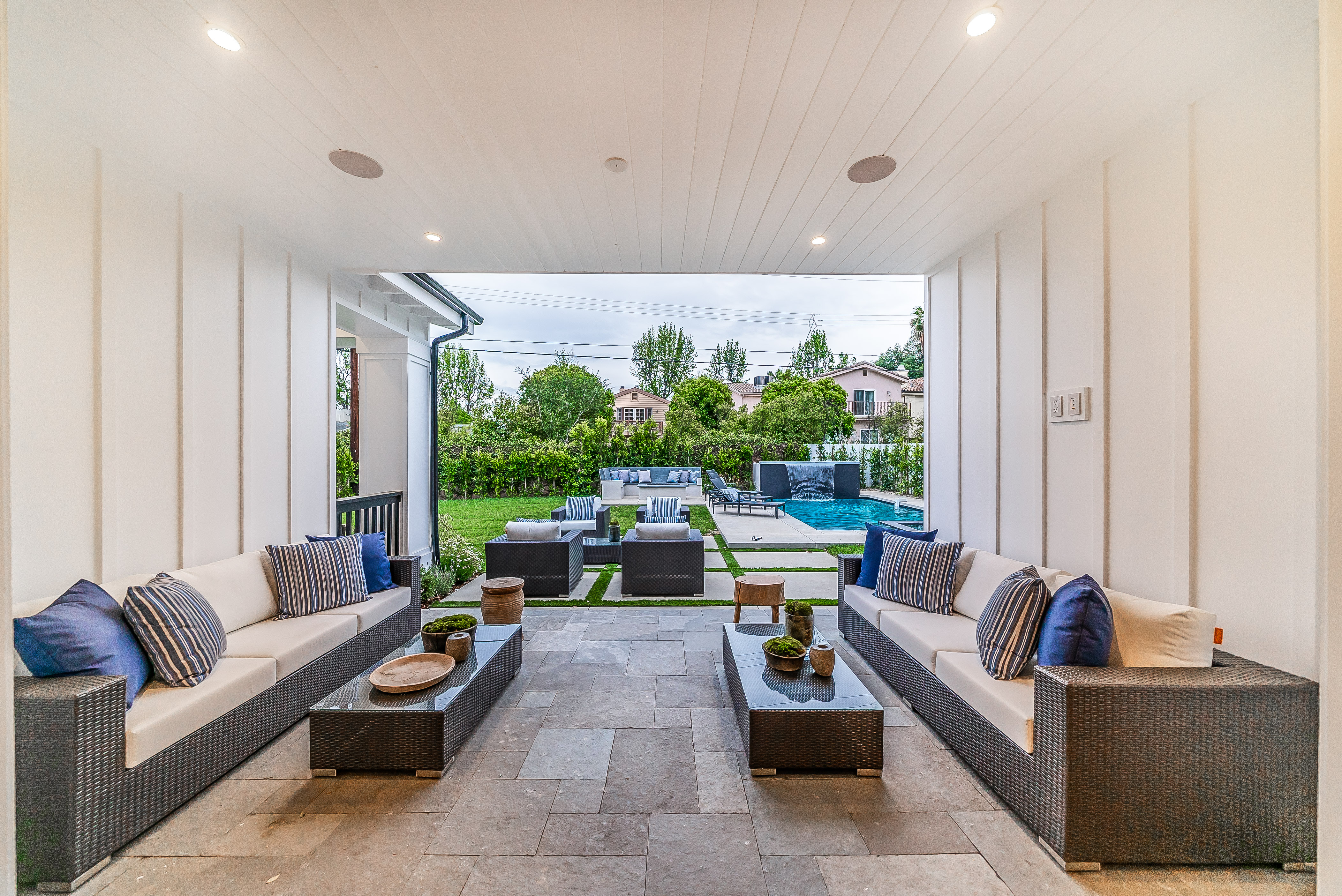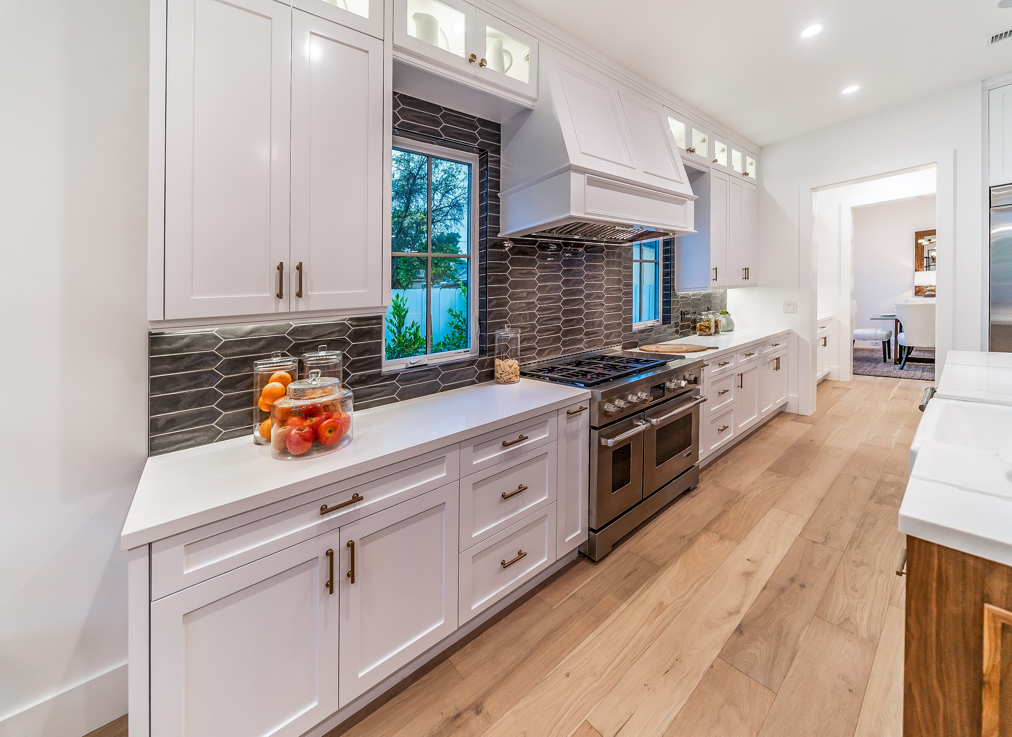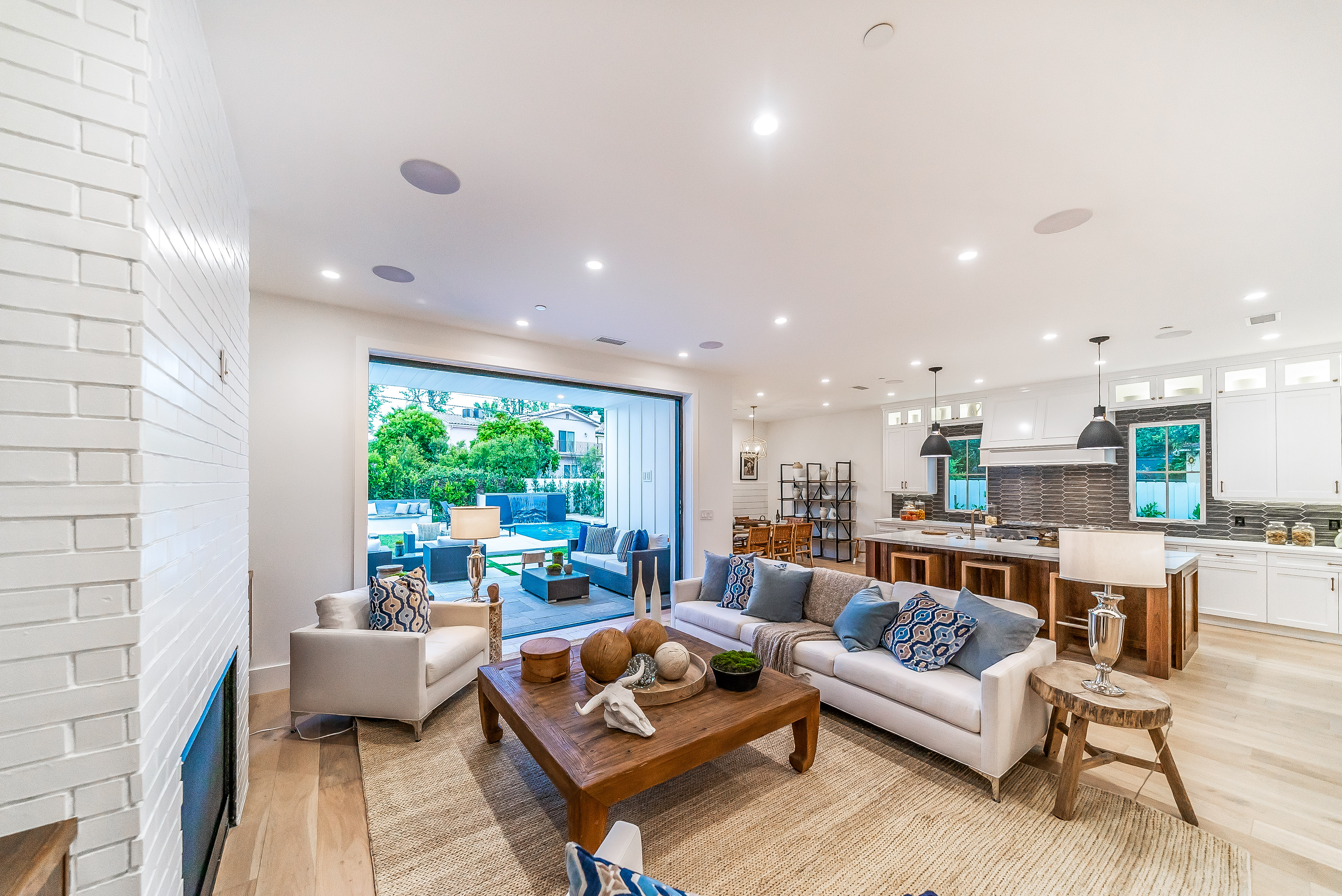 Situated in a quaint family neighborhood in Encino, this striking new custom designed home perfectly balances modern sophistication and timeless classic style. Pass lush landscaped grounds as you walk through the front doors and are greeted by soaring ceilings, white oak flooring, a bright open floor plan that flows seamlessly across all main living areas. A grand formal living room for entertaining with large windows that bring in natural light. With approx. 3,600 square-feet of designer living space boasting 4 ensuite bedrooms with built-in closets, 4.5 bathrooms all laid out on a 9,000 square-foot lot! Amenities include a custom glass-enclosed wine cellar, dining area with paneled wall+ceiling details, industrial style light fixtures and beautiful flooring. The living room hosts a sleek white brick fireplace accompanied by custom built-ins & tall glass sliding doors. The chef’s kitchen comes complete with high-end appliances, stone countertops & center island with farmhouse sink, separate breakfast area, & a butler’s pantry. The master bedroom is one to boast about, with a custom walk-in closet, high pitched ceilings and elegant master bathroom. Perfect single story family home!