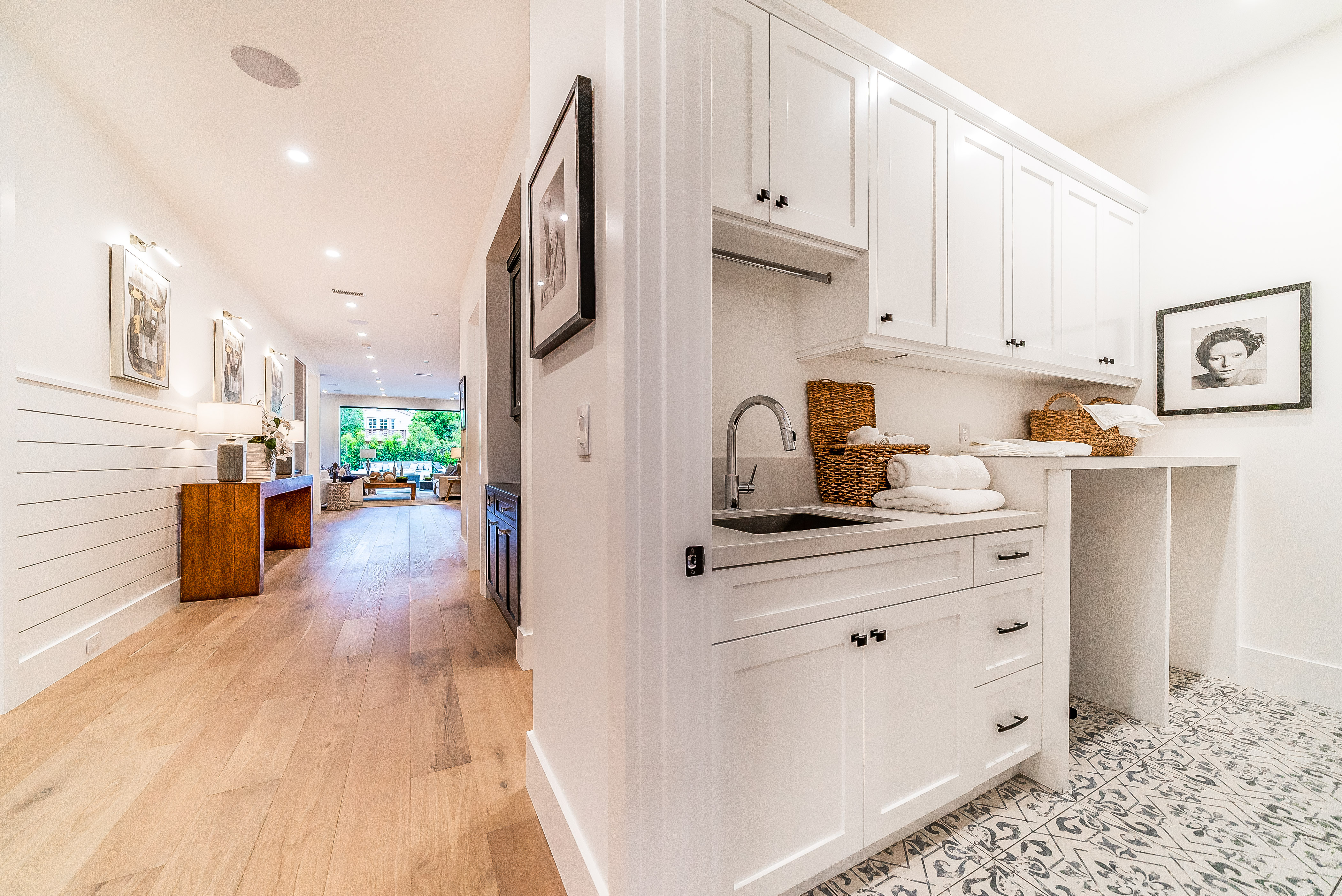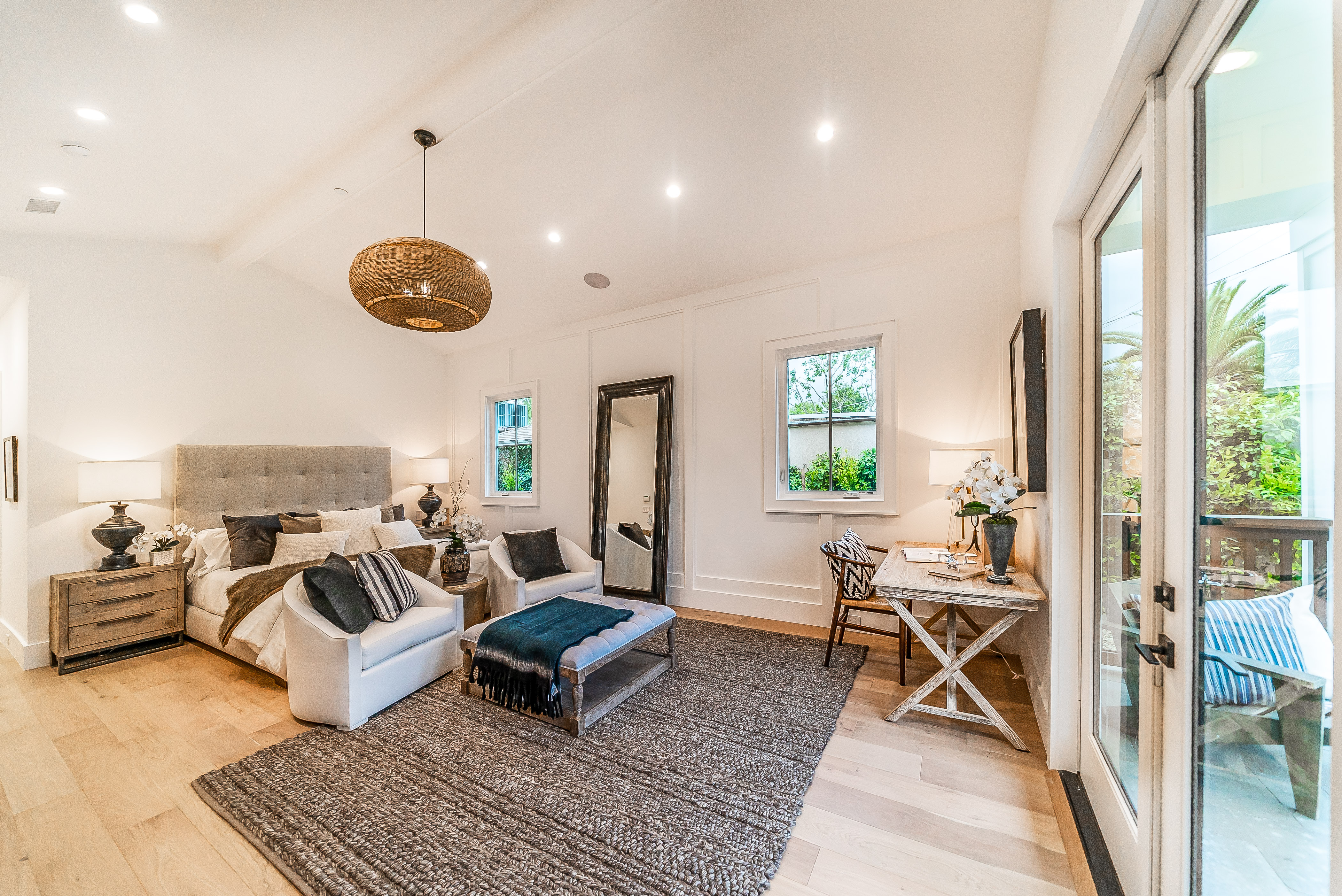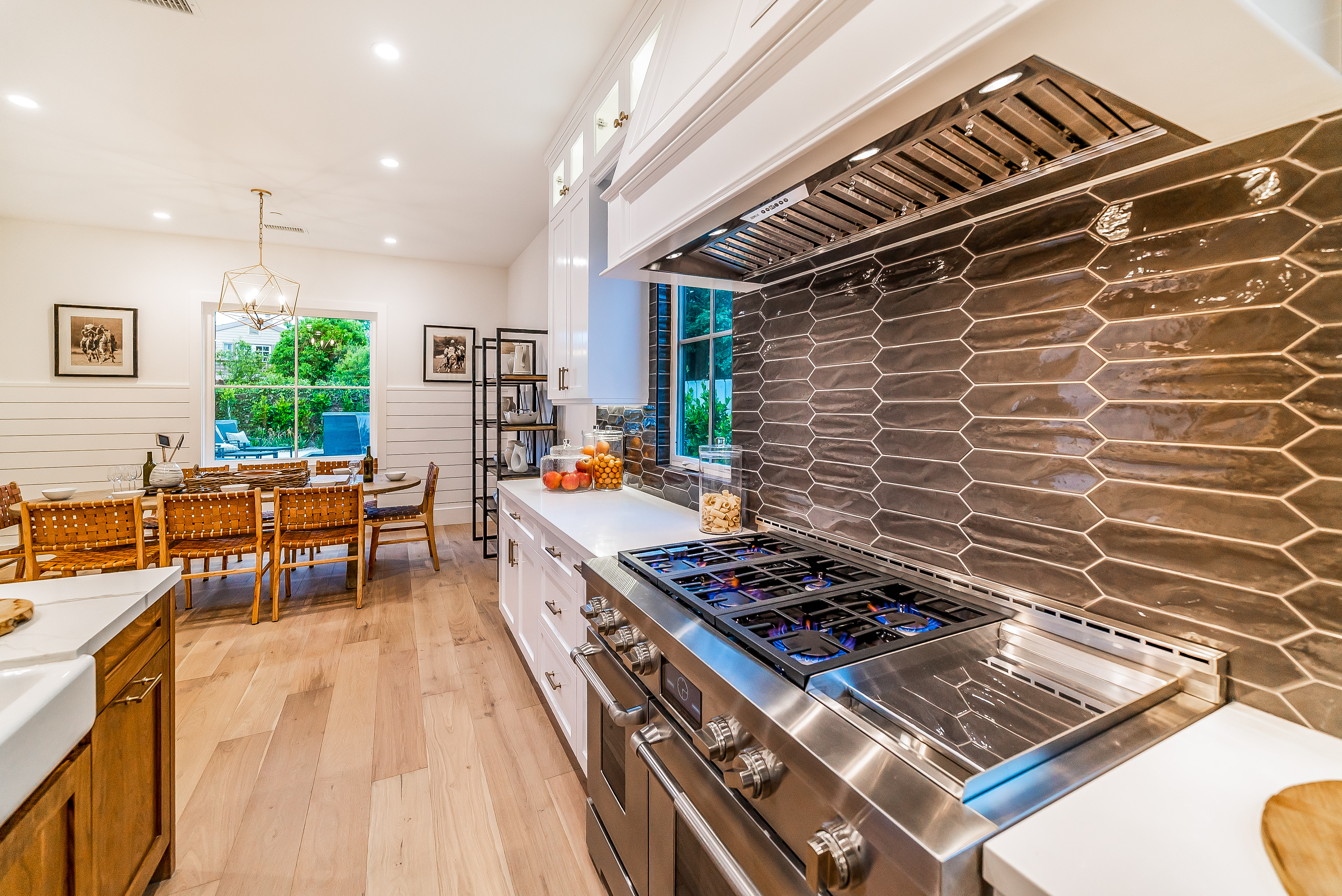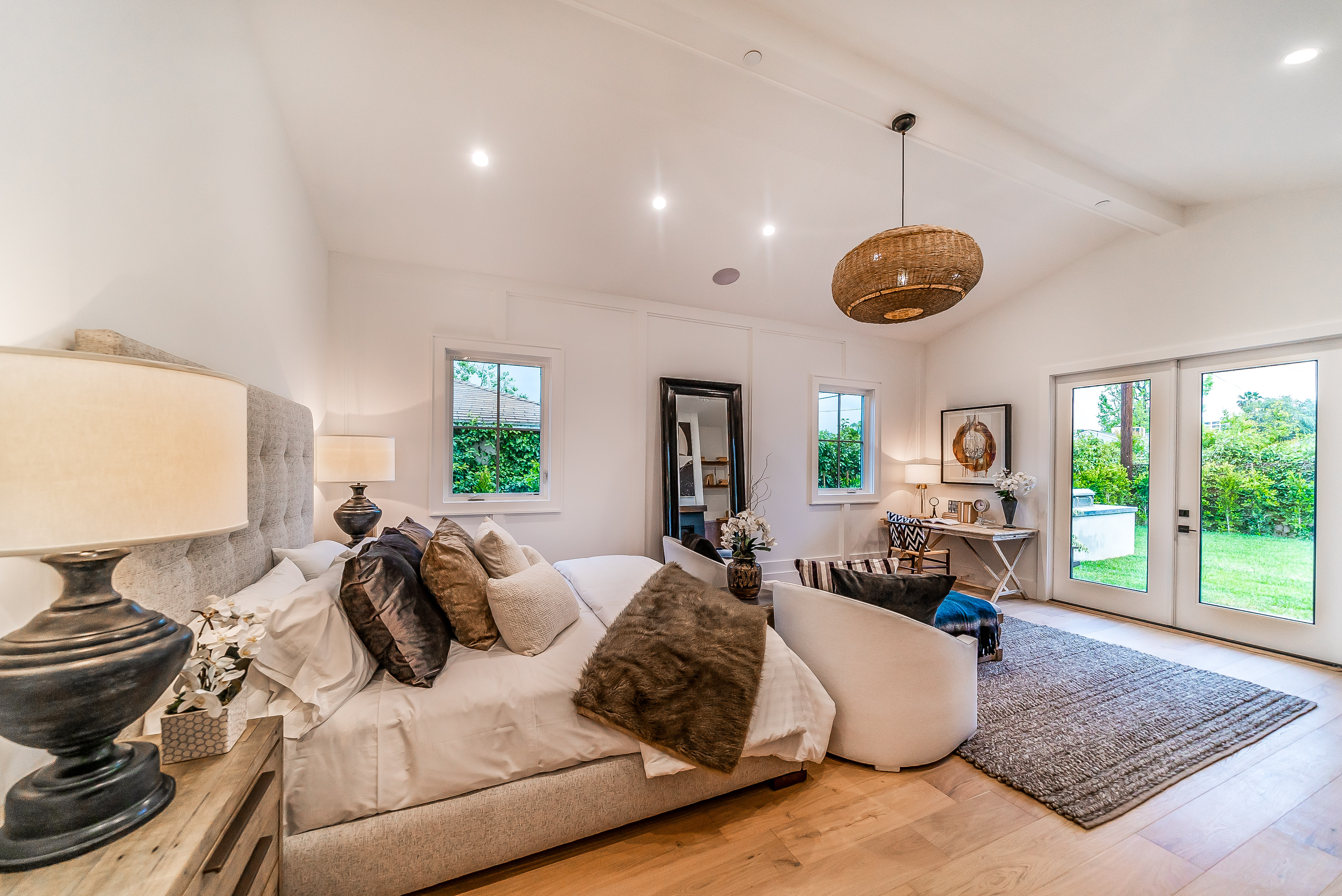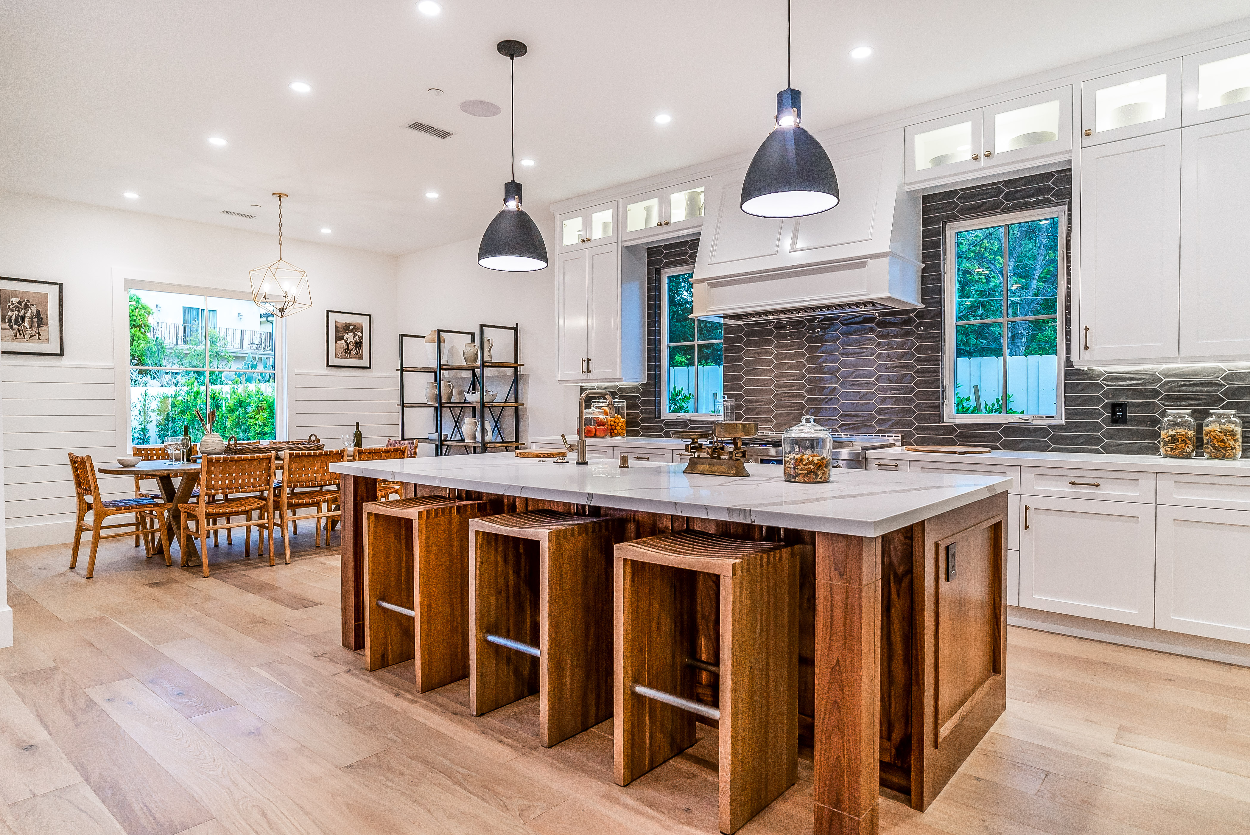 Situated in a quaint family neighborhood in Encino, this striking new custom designed home perfectly balances modern sophistication and timeless classic style. Pass lush landscaped grounds as you walk through the front doors and are greeted by soaring ceilings, white oak flooring, a bright open floor plan that flows seamlessly across all main living areas. A grand formal living room for entertaining with large windows that bring in natural light. With approx. 3,600 square-feet of designer living space boasting 4 ensuite bedrooms with built-in closets, 4.5 bathrooms all laid out on a 9,000 square-foot lot! Amenities include a custom glass-enclosed wine cellar, dining area with paneled wall+ceiling details, industrial style light fixtures and beautiful flooring. The living room hosts a sleek white brick fireplace accompanied by custom built-ins & tall glass sliding doors. The chef’s kitchen comes complete with high-end appliances, stone countertops & center island with farmhouse sink, separate breakfast area, & a butler’s pantry. The master bedroom is one to boast about, with a custom walk-in closet, high pitched ceilings and elegant master bathroom. Perfect single story family home!