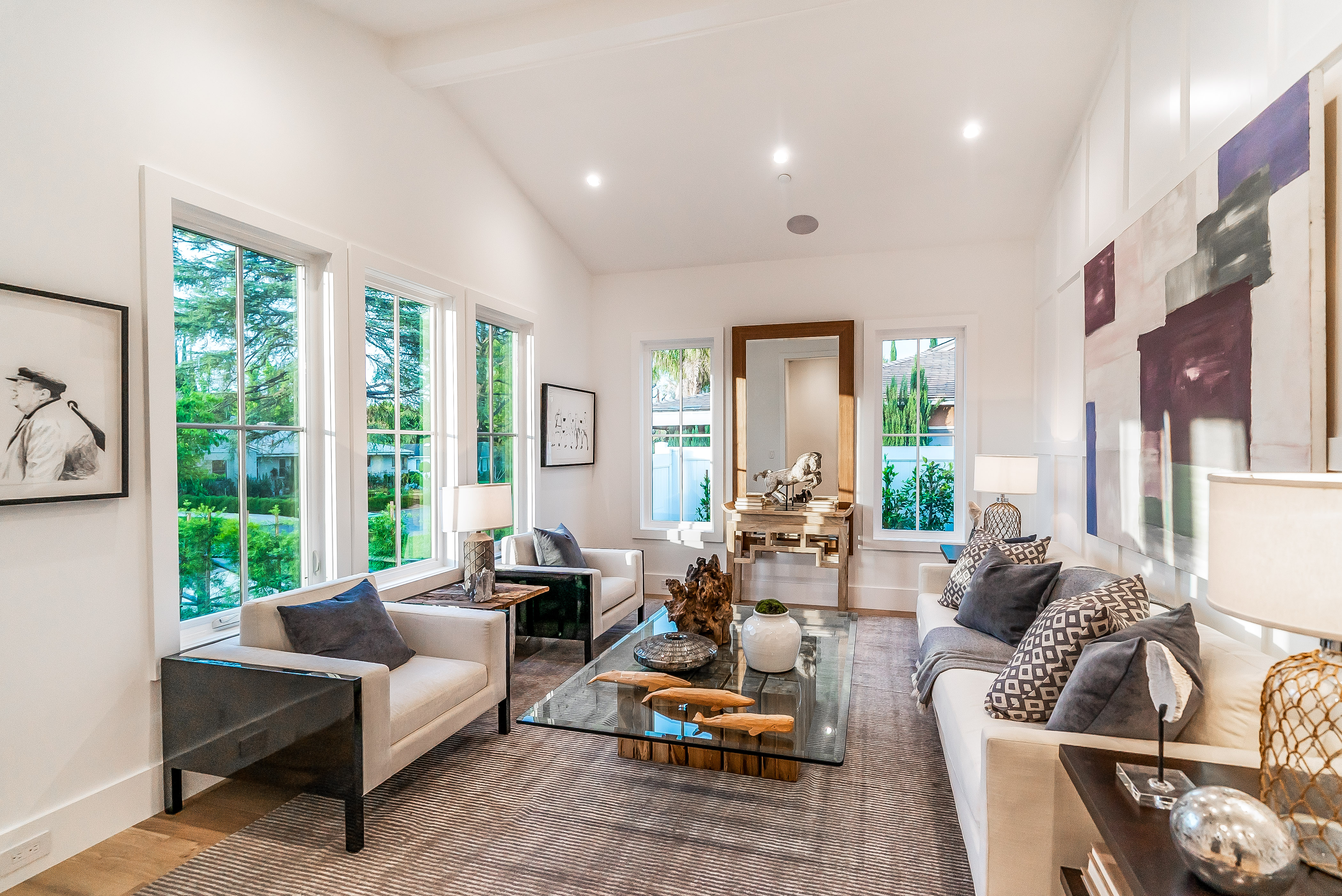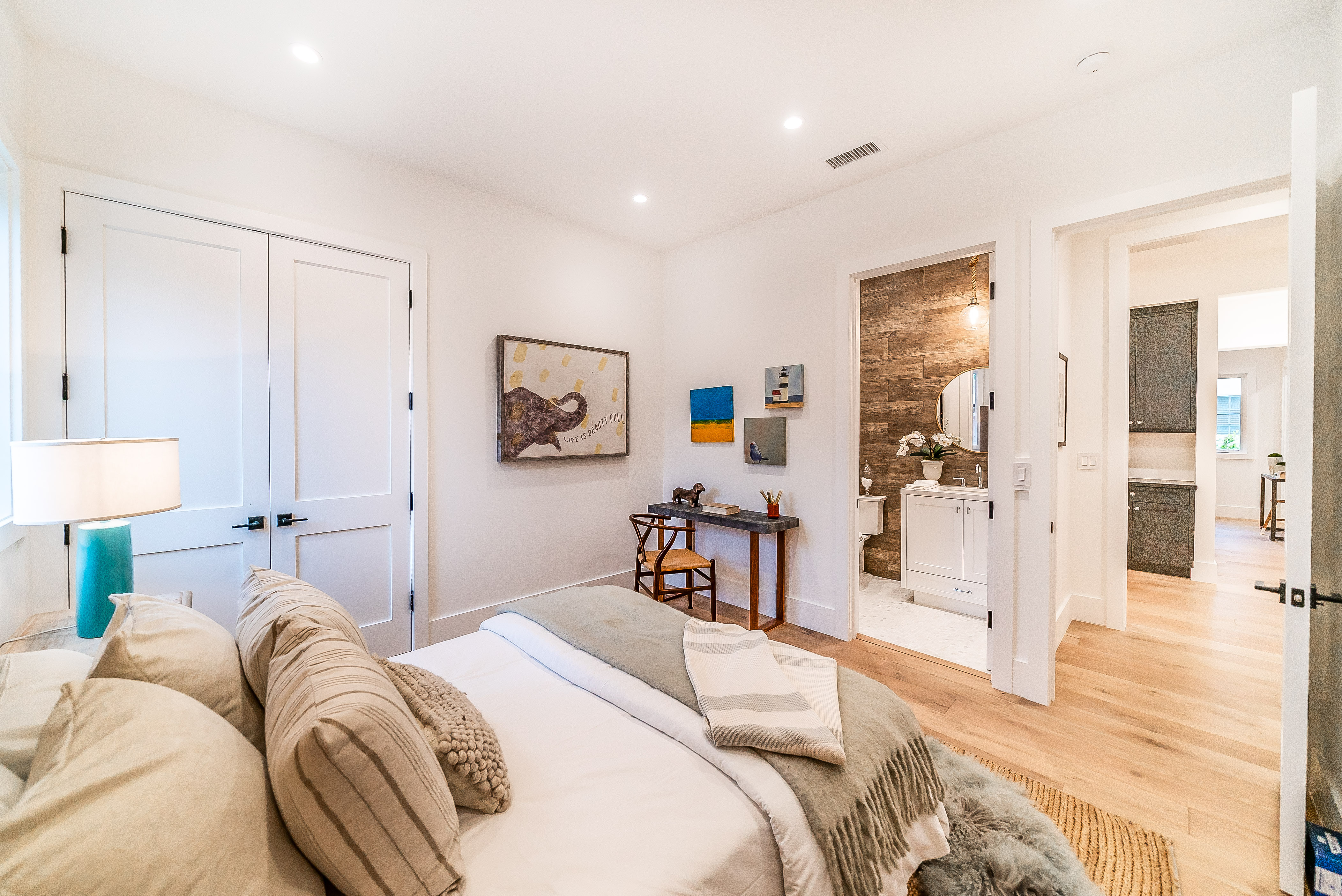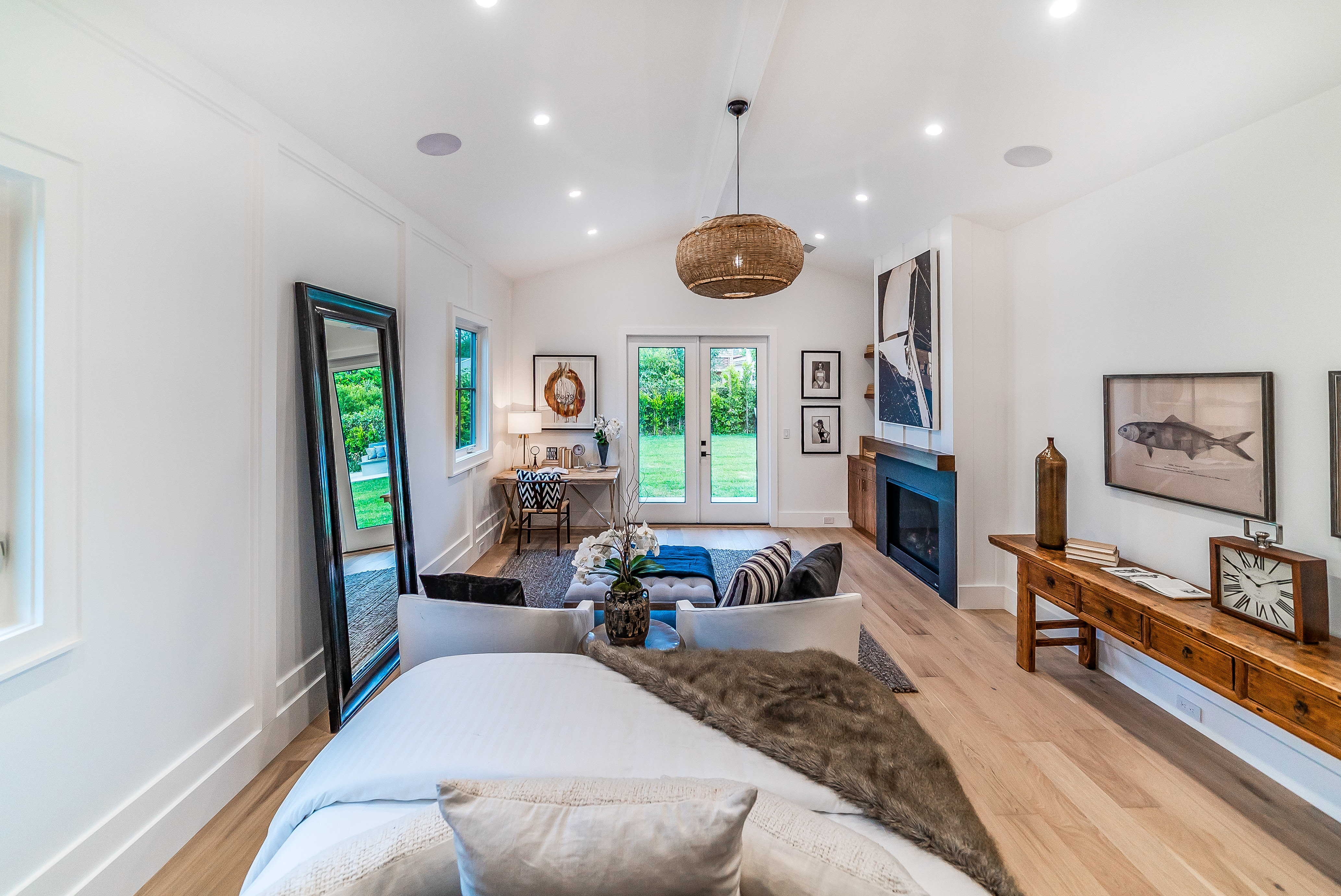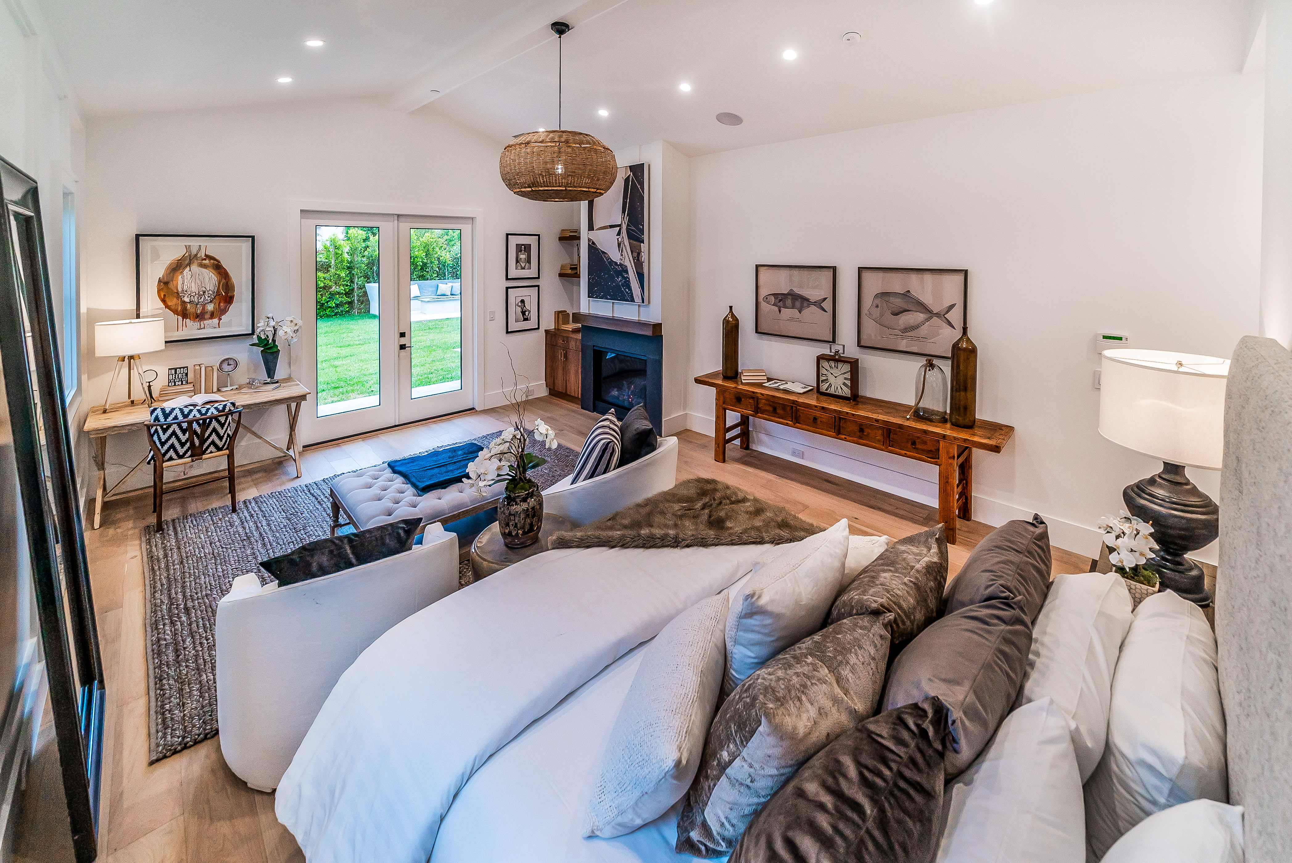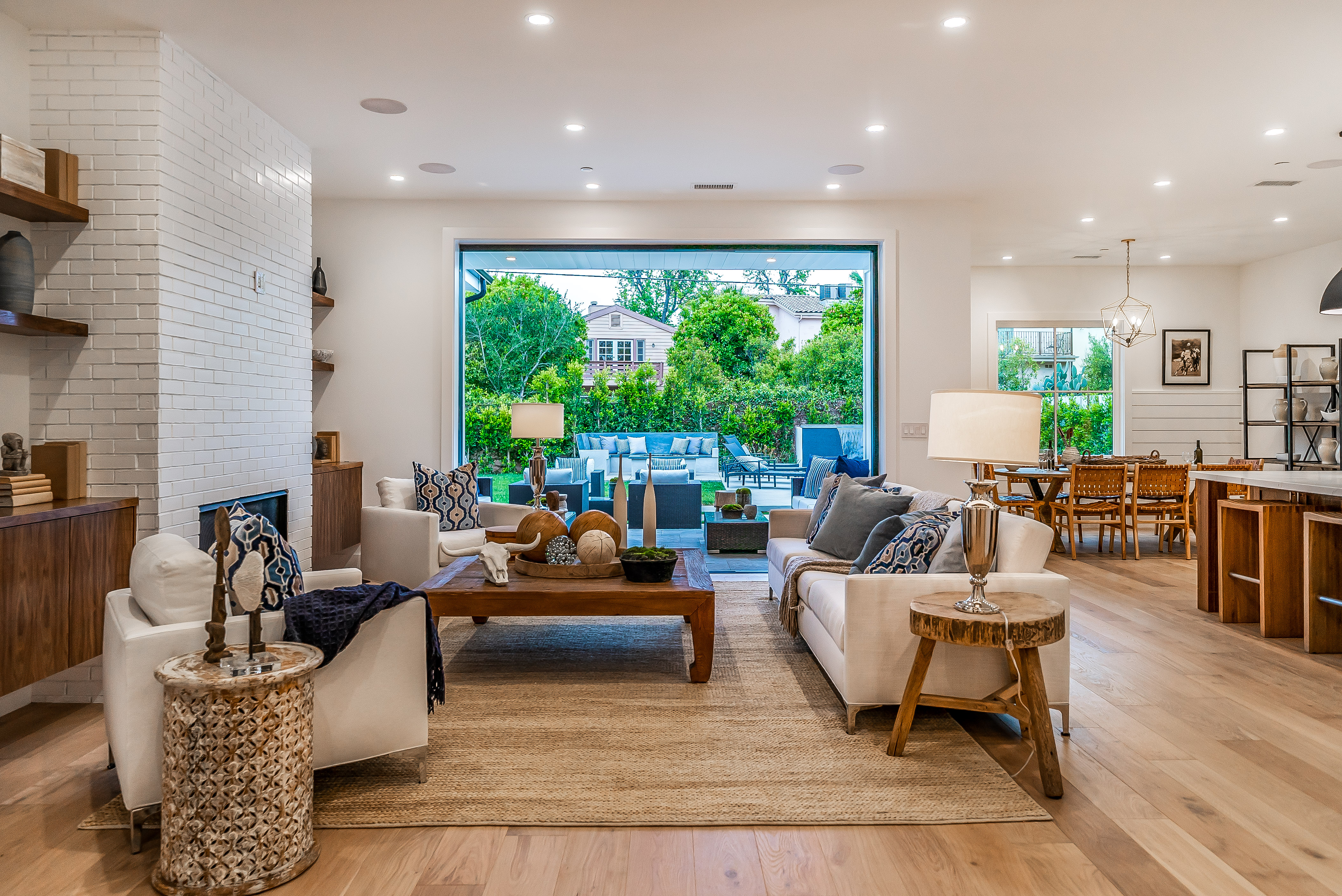 Situated in a quaint family neighborhood in Encino, this striking new custom designed home perfectly balances modern sophistication and timeless classic style. Pass lush landscaped grounds as you walk through the front doors and are greeted by soaring ceilings, white oak flooring, a bright open floor plan that flows seamlessly across all main living areas. A grand formal living room for entertaining with large windows that bring in natural light. With approx. 3,600 square-feet of designer living space boasting 4 ensuite bedrooms with built-in closets, 4.5 bathrooms all laid out on a 9,000 square-foot lot! Amenities include a custom glass-enclosed wine cellar, dining area with paneled wall+ceiling details, industrial style light fixtures and beautiful flooring. The living room hosts a sleek white brick fireplace accompanied by custom built-ins & tall glass sliding doors. The chef’s kitchen comes complete with high-end appliances, stone countertops & center island with farmhouse sink, separate breakfast area, & a butler’s pantry. The master bedroom is one to boast about, with a custom walk-in closet, high pitched ceilings and elegant master bathroom. Perfect single story family home!