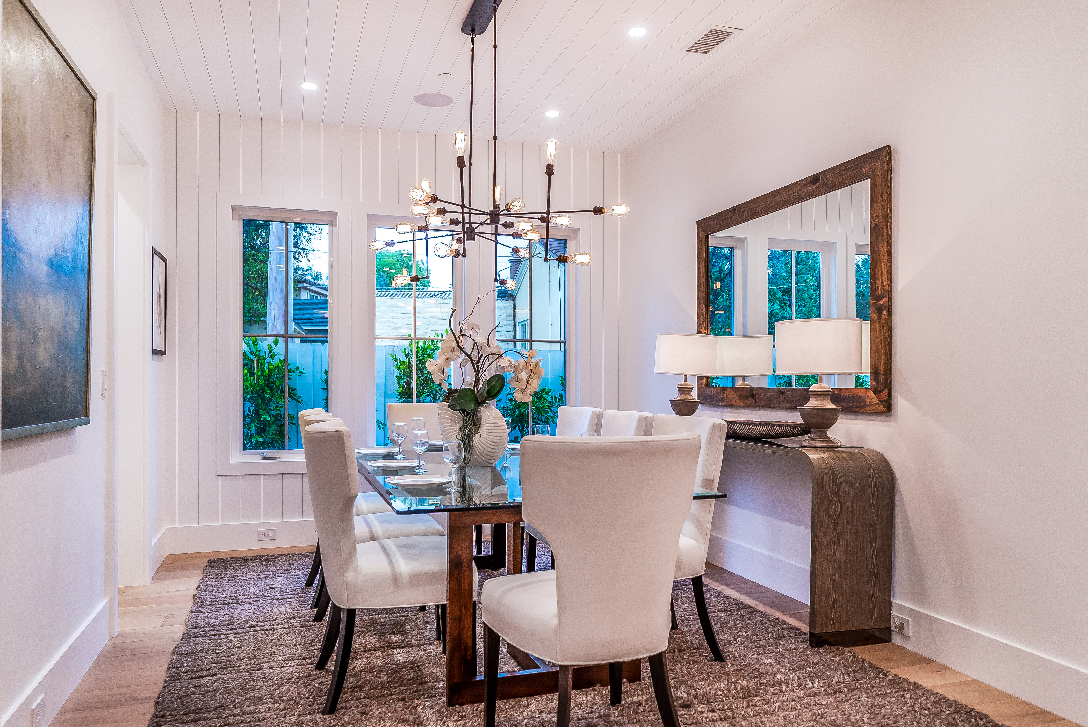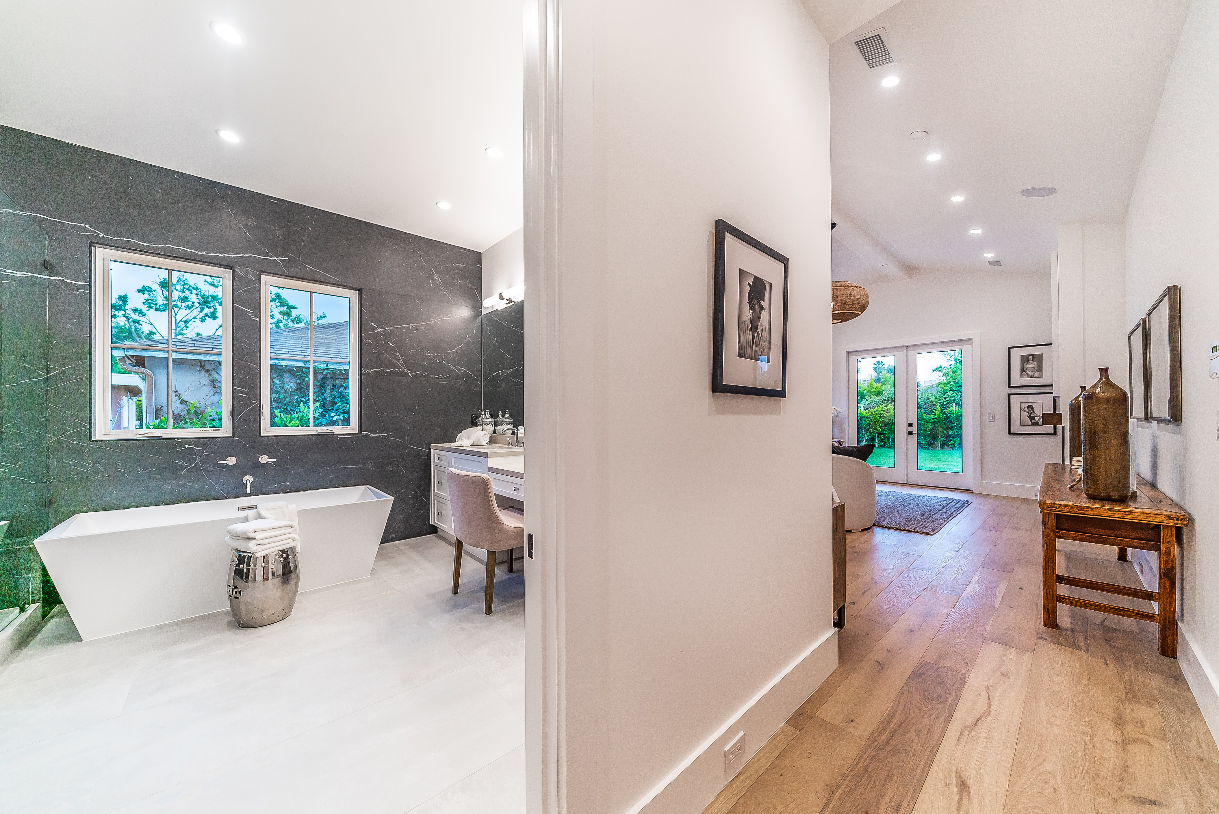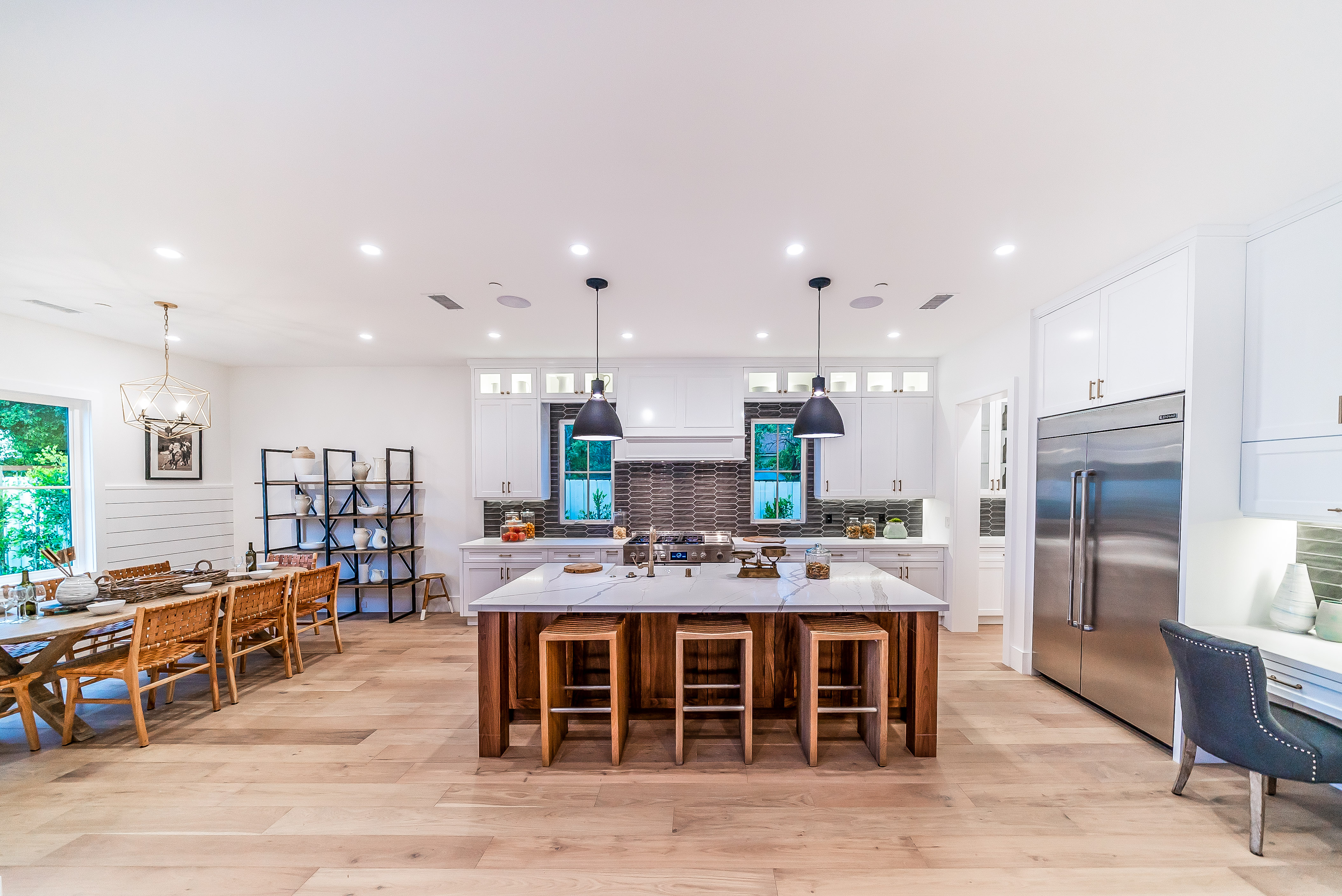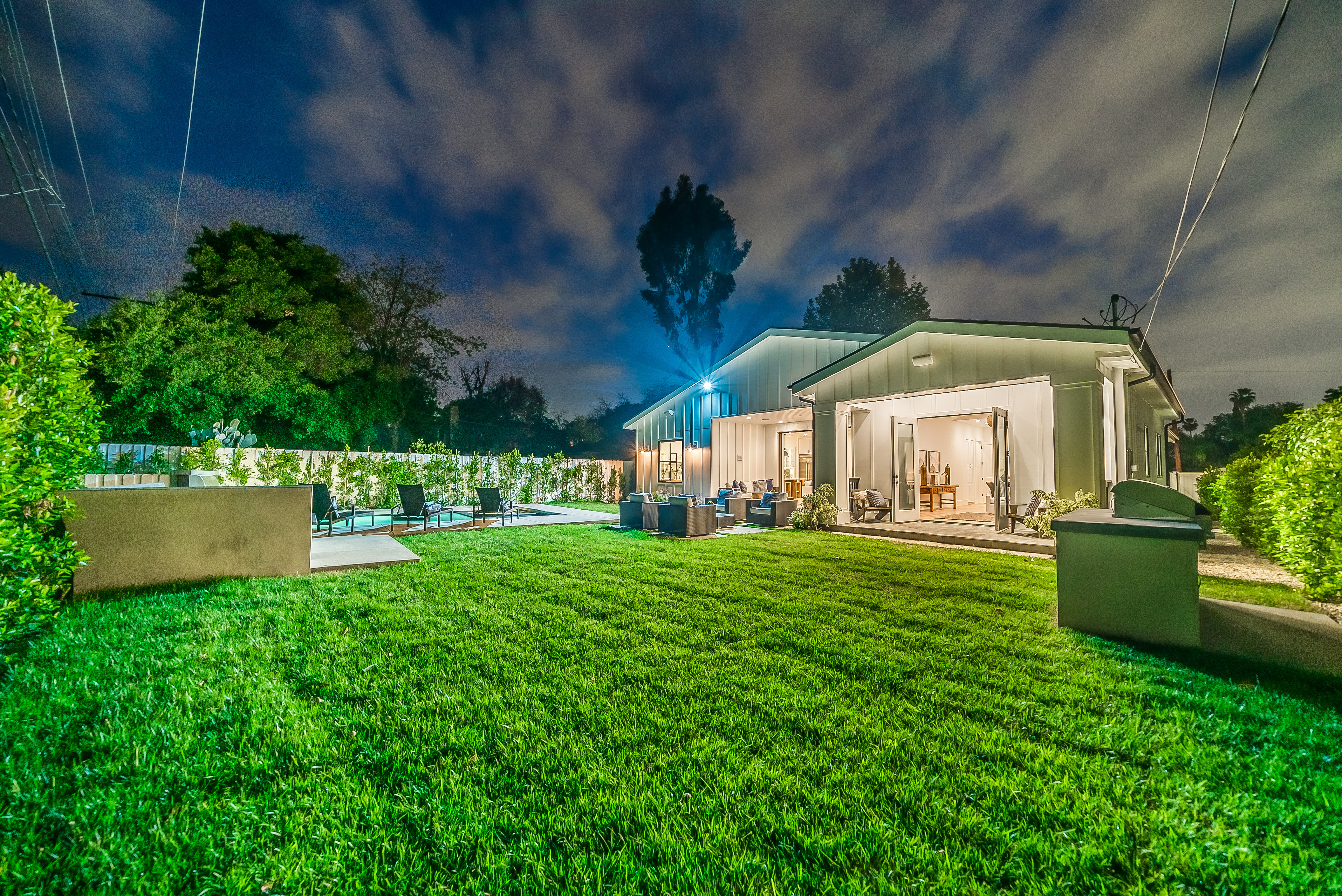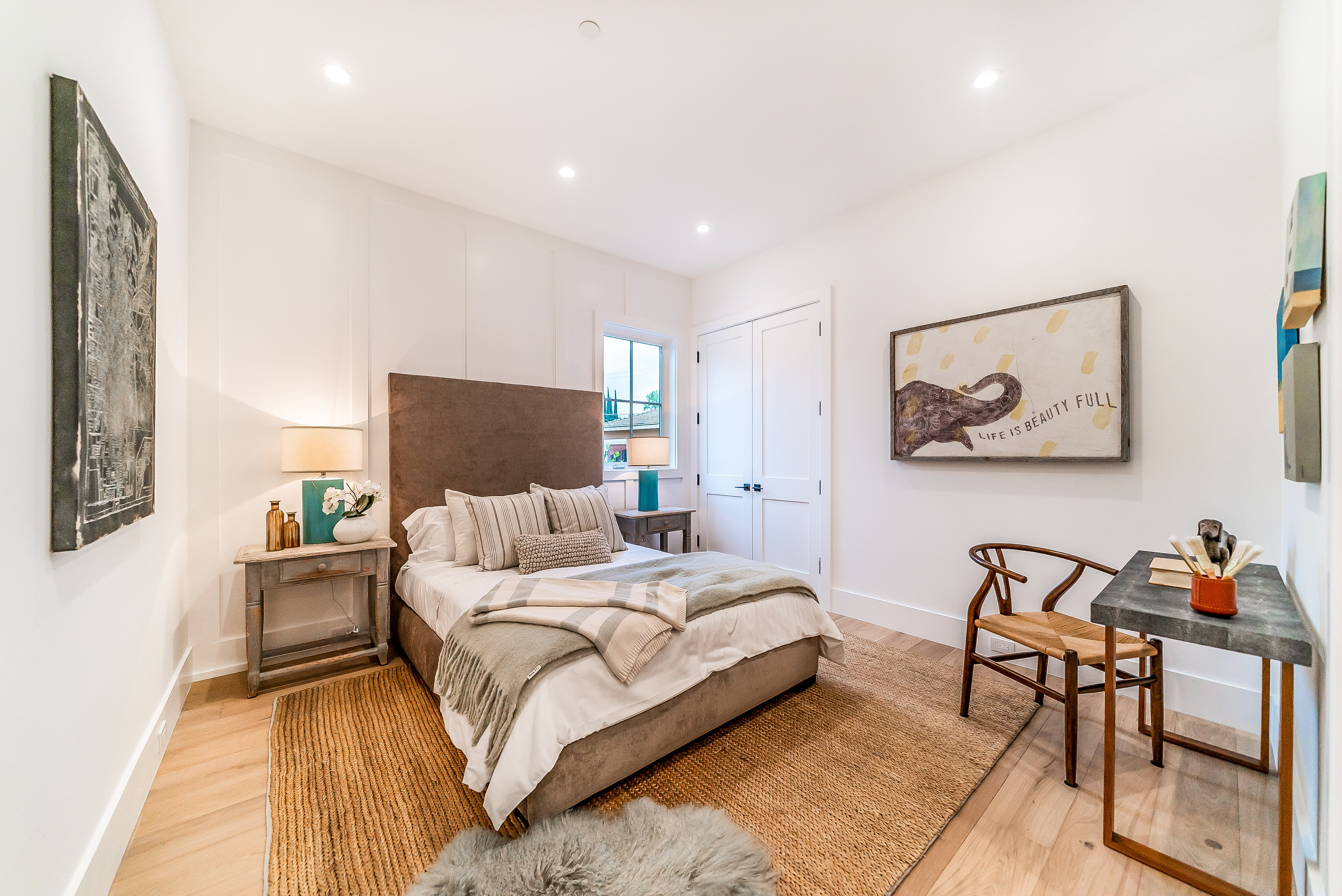Situated in a quaint family neighborhood in Encino, this striking new custom designed home perfectly balances modern sophistication and timeless classic style. Pass lush landscaped grounds as you walk through the front doors and are greeted by soaring ceilings, white oak flooring, a bright open floor plan that flows seamlessly across all main living areas. A grand formal living room for entertaining with large windows that bring in natural light. With approx. 3,600 square-feet of designer living space boasting 4 ensuite bedrooms with built-in closets, 4.5 bathrooms all laid out on a 9,000 square-foot lot! Amenities include a custom glass-enclosed wine cellar, dining area with paneled wall+ceiling details, industrial style light fixtures and beautiful flooring. The living room hosts a sleek white brick fireplace accompanied by custom built-ins & tall glass sliding doors. The chef’s kitchen comes complete with high-end appliances, stone countertops & center island with farmhouse sink, separate breakfast area, & a butler’s pantry. The master bedroom is one to boast about, with a custom walk-in closet, high pitched ceilings and elegant master bathroom. Perfect single story family home!