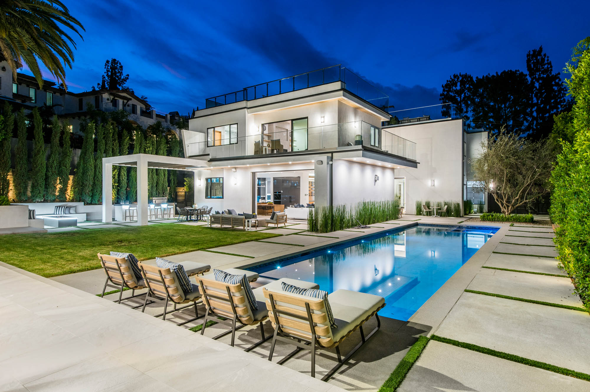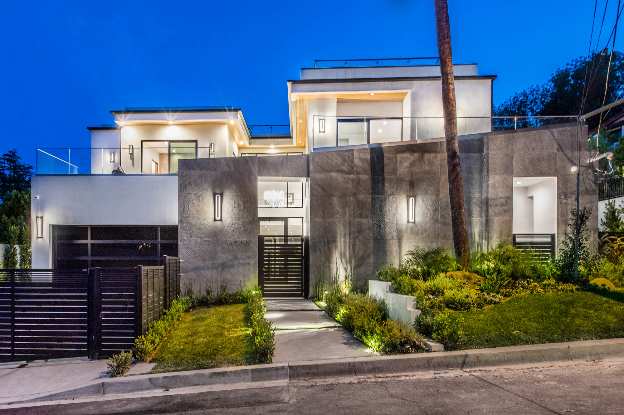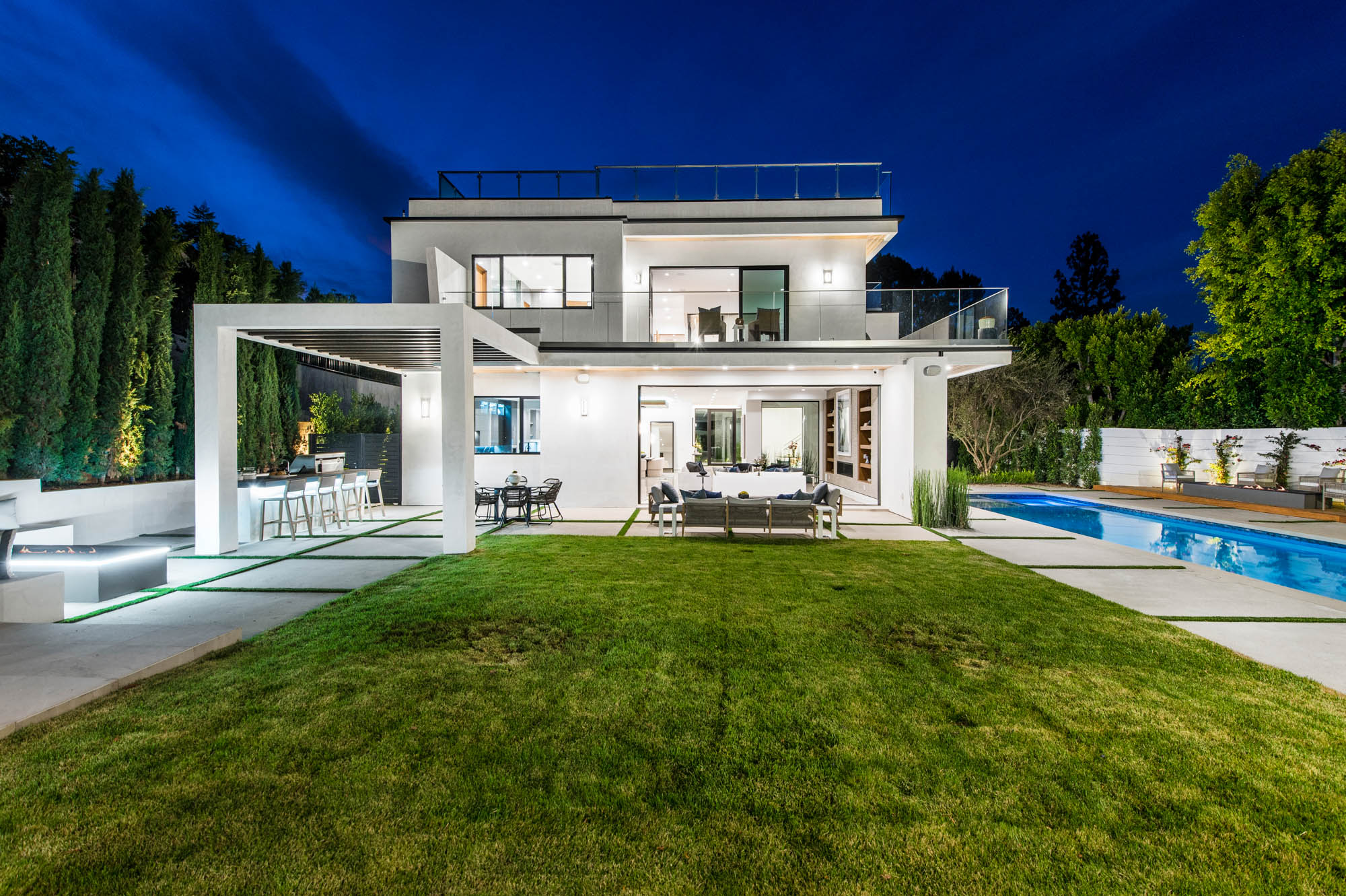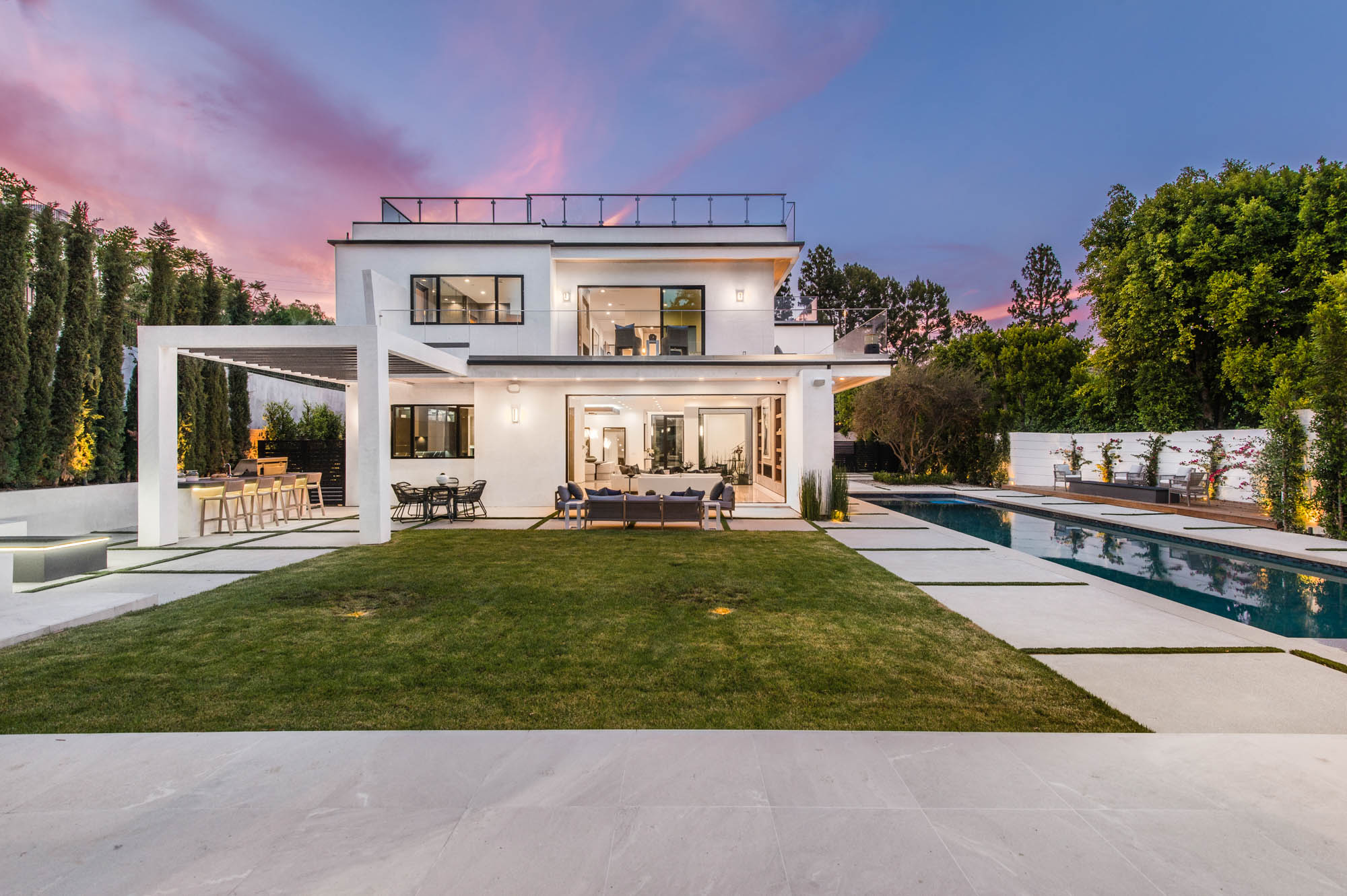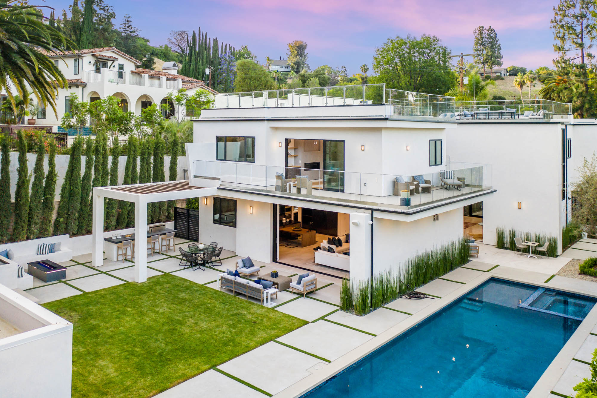 Situated on a Quiet Street South of the Blvd in Encino, this new construction contemporary modern estate is Encino's newest gem. Inside, soaring ceilings and wide glass staircase adorn a large main foyer, overlooking the expansive Entertainer's floor plan. An elegant formal dining room features a large wine cabinet flanked by a spacious interior courtyard. A sophisticated formal living room showcases a large linear fireplace, custom built-ins and large floor to ceiling pocket sliding doors that open up to an entertainer's dream backyard. The gourmet Chef's kitchen showcases quartz counters, stainless steel appliances, a large center island with an attached stone breakfast table adjacent to a second prep kitchen tucked away behind the dining room. Upstairs, the master suite features high ceilings, fireplace, sliding glass pocket doors, private balconies, and a spa-like master bath with large shower and soaking tub and spacious illuminated walk-in closet. A loft and three additional upstairs suites offer wonderful accommodations for family and friends. A spacious rooftop patio completes this property that provides you with a jetliner of the city and mountains. The Entertainer's backyard features a large sparkling pool and spa, pool cabana and pool house, sports court, numerous patio spaces complete with outdoor kitchen and 2 fire-pits. Additional conveniences include the Control4 smart home automation system. A luxurious lifestyle located near fine dining, shopping and more.