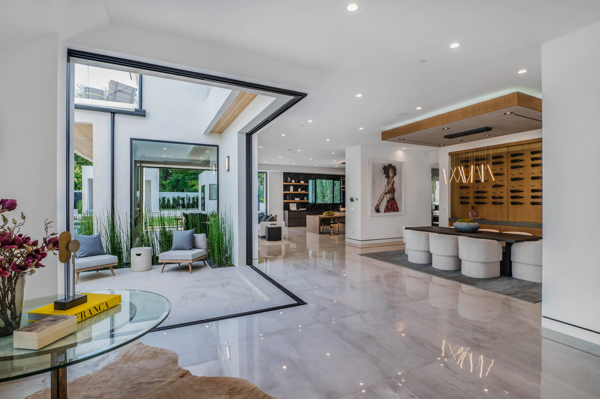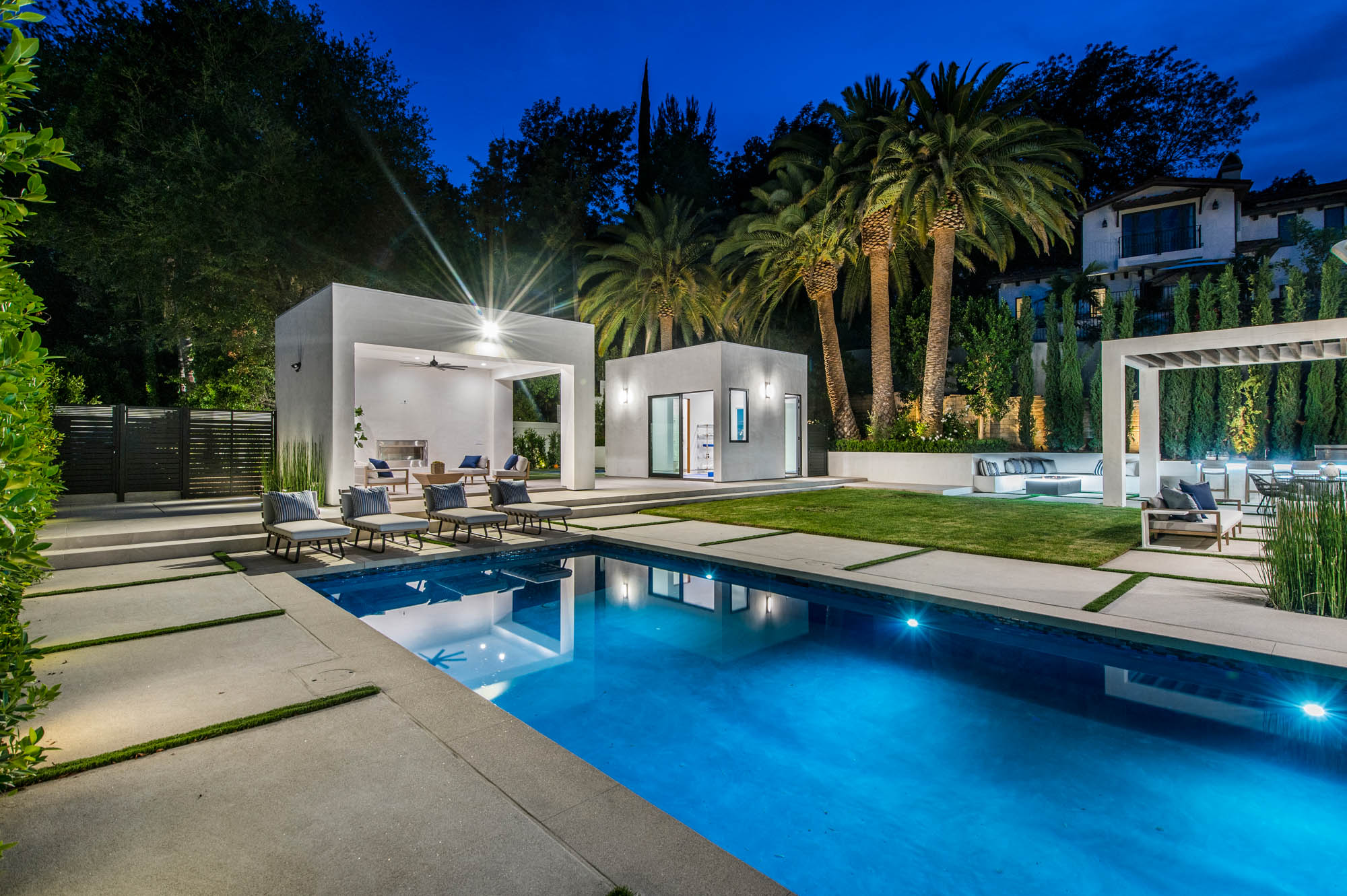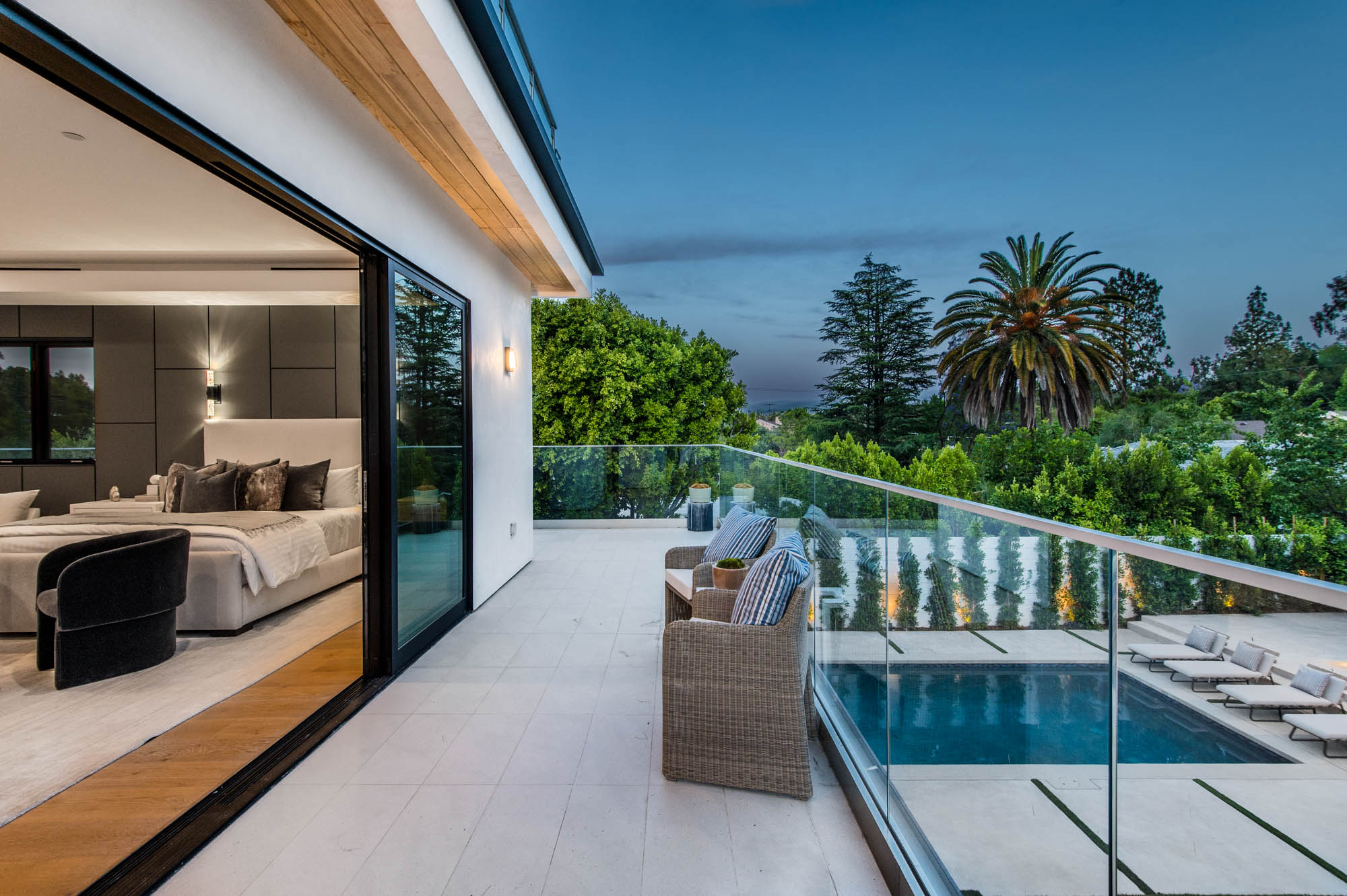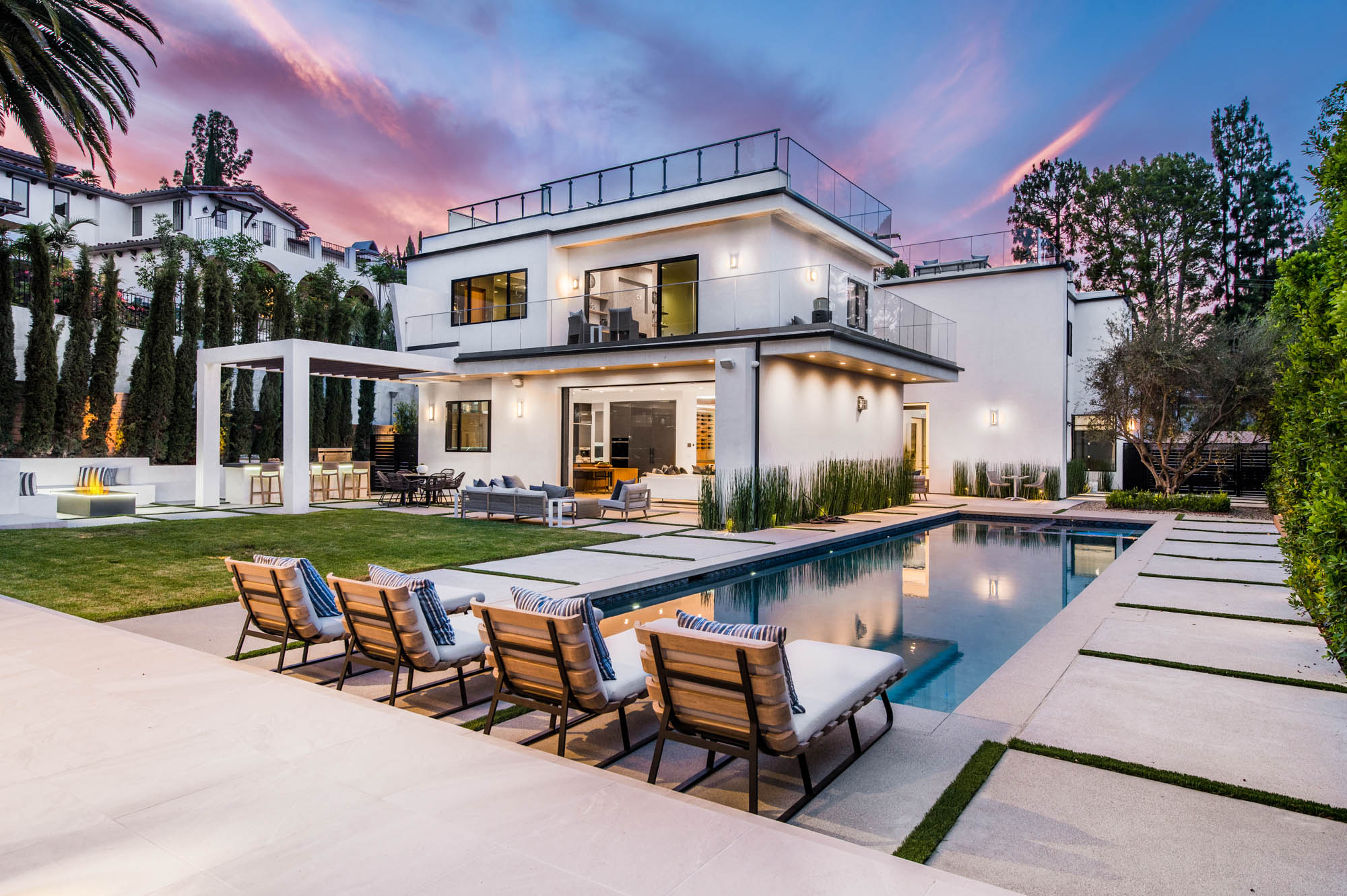 Situated on a Quiet Street South of the Blvd in Encino, this new construction contemporary modern estate is Encino's newest gem. Inside, soaring ceilings and wide glass staircase adorn a large main foyer, overlooking the expansive Entertainer's floor plan. An elegant formal dining room features a large wine cabinet flanked by a spacious interior courtyard. A sophisticated formal living room showcases a large linear fireplace, custom built-ins and large floor to ceiling pocket sliding doors that open up to an entertainer's dream backyard. The gourmet Chef's kitchen showcases quartz counters, stainless steel appliances, a large center island with an attached stone breakfast table adjacent to a second prep kitchen tucked away behind the dining room. Upstairs, the master suite features high ceilings, fireplace, sliding glass pocket doors, private balconies, and a spa-like master bath with large shower and soaking tub and spacious illuminated walk-in closet. A loft and three additional upstairs suites offer wonderful accommodations for family and friends. A spacious rooftop patio completes this property that provides you with a jetliner of the city and mountains. The Entertainer's backyard features a large sparkling pool and spa, pool cabana and pool house, sports court, numerous patio spaces complete with outdoor kitchen and 2 fire-pits. Additional conveniences include the Control4 smart home automation system. A luxurious lifestyle located near fine dining, shopping and more.