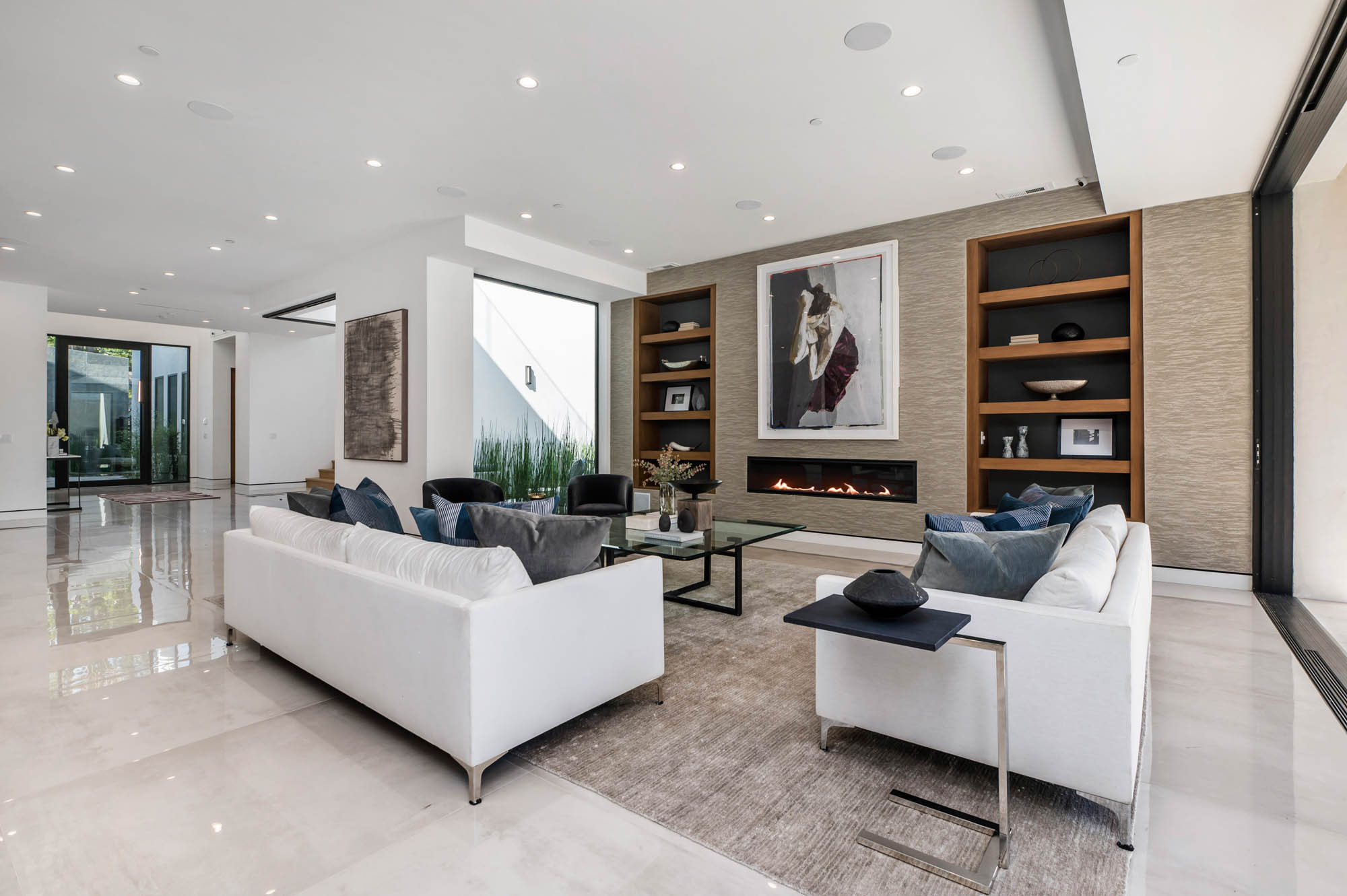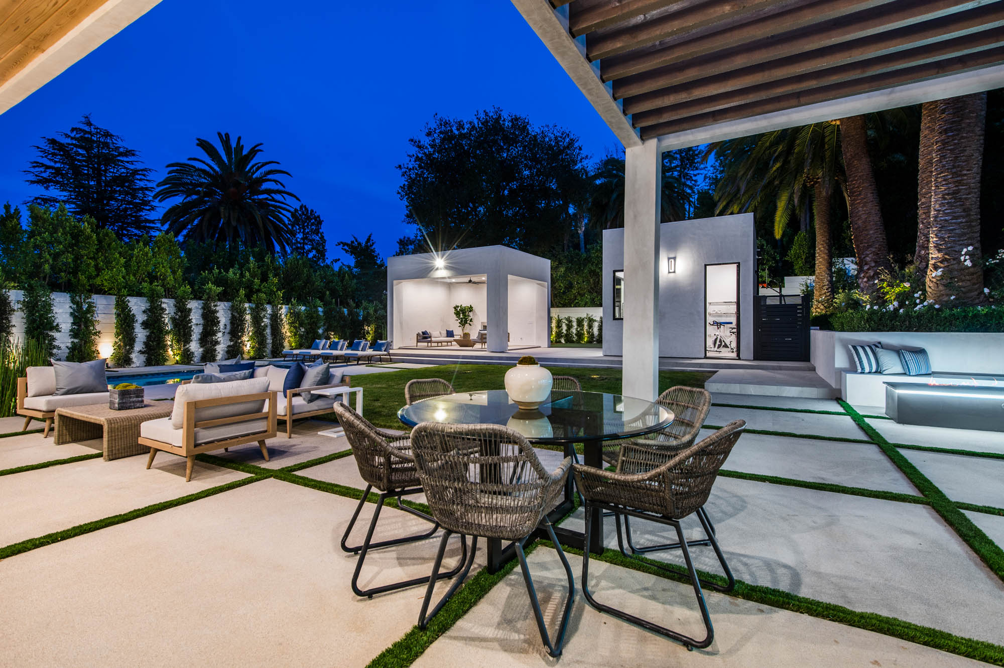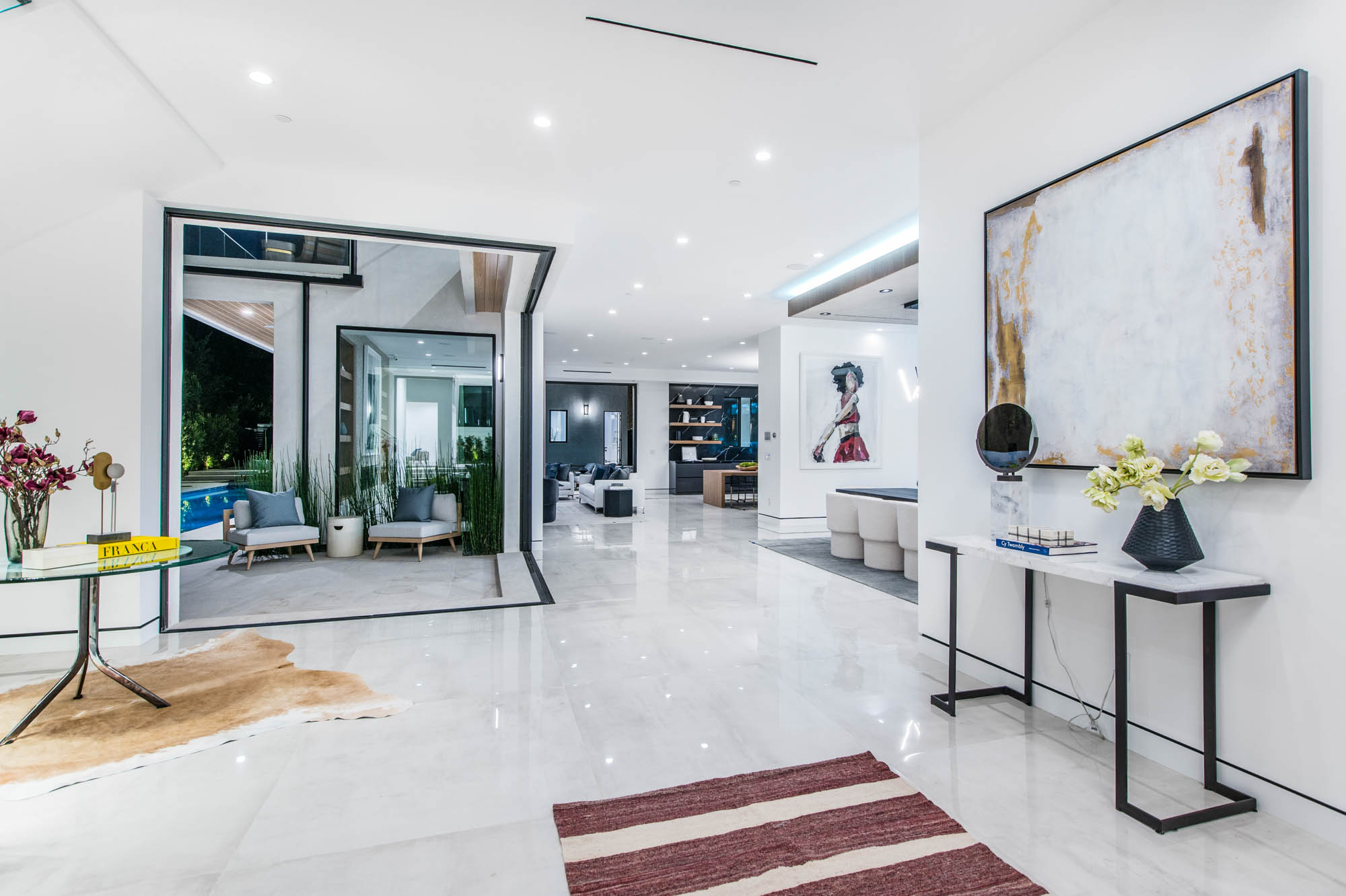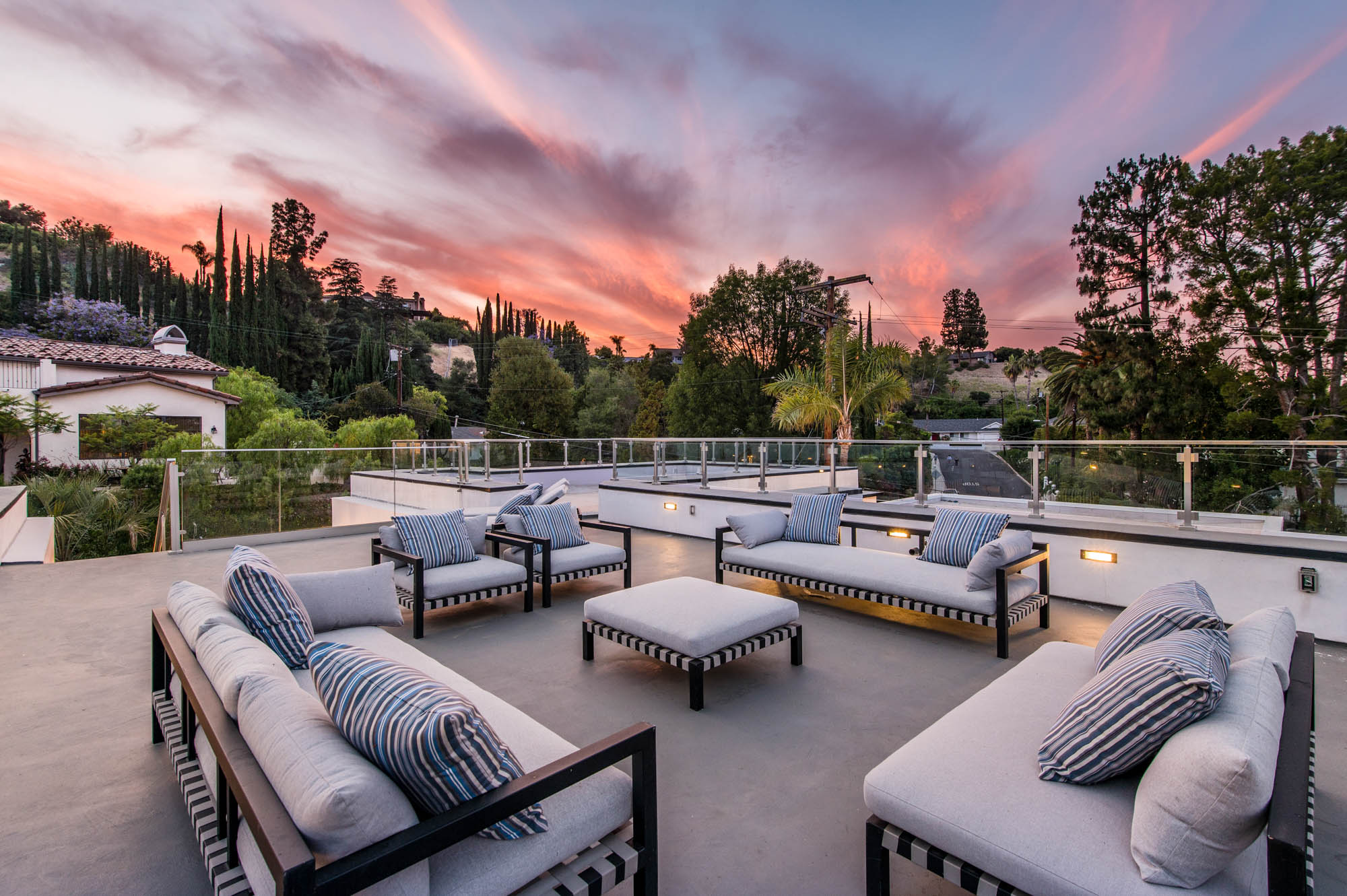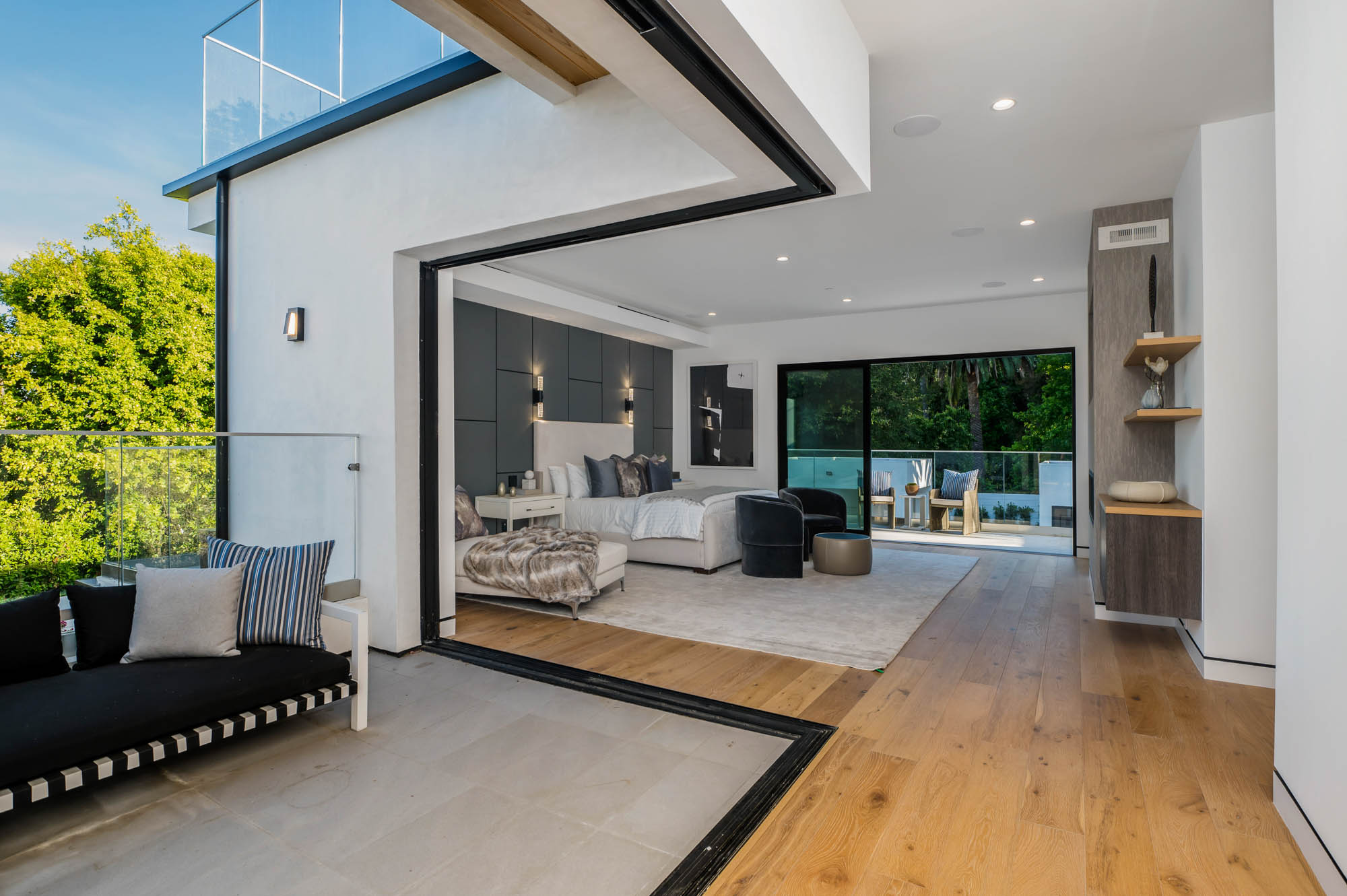 Situated on a Quiet Street South of the Blvd in Encino, this new construction contemporary modern estate is Encino's newest gem. Inside, soaring ceilings and wide glass staircase adorn a large main foyer, overlooking the expansive Entertainer's floor plan. An elegant formal dining room features a large wine cabinet flanked by a spacious interior courtyard. A sophisticated formal living room showcases a large linear fireplace, custom built-ins and large floor to ceiling pocket sliding doors that open up to an entertainer's dream backyard. The gourmet Chef's kitchen showcases quartz counters, stainless steel appliances, a large center island with an attached stone breakfast table adjacent to a second prep kitchen tucked away behind the dining room. Upstairs, the master suite features high ceilings, fireplace, sliding glass pocket doors, private balconies, and a spa-like master bath with large shower and soaking tub and spacious illuminated walk-in closet. A loft and three additional upstairs suites offer wonderful accommodations for family and friends. A spacious rooftop patio completes this property that provides you with a jetliner of the city and mountains. The Entertainer's backyard features a large sparkling pool and spa, pool cabana and pool house, sports court, numerous patio spaces complete with outdoor kitchen and 2 fire-pits. Additional conveniences include the Control4 smart home automation system. A luxurious lifestyle located near fine dining, shopping and more.