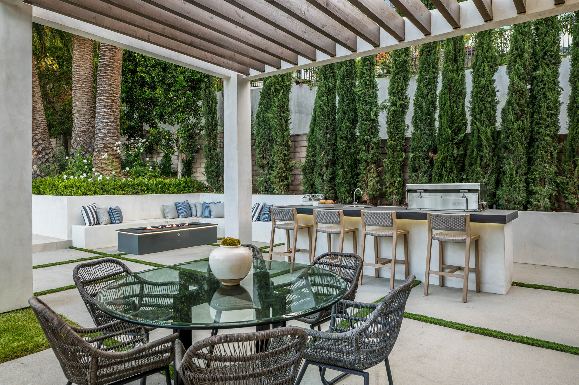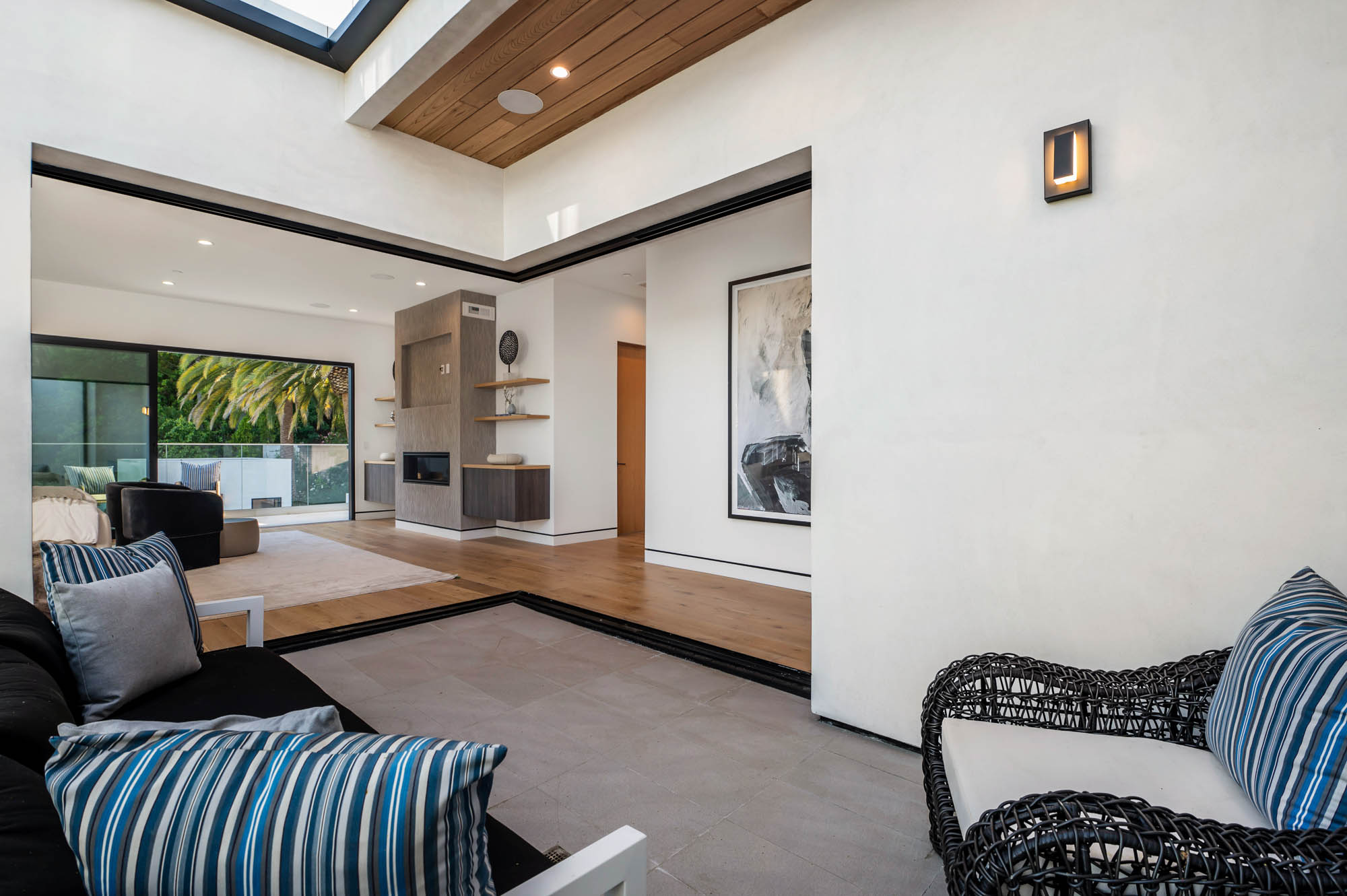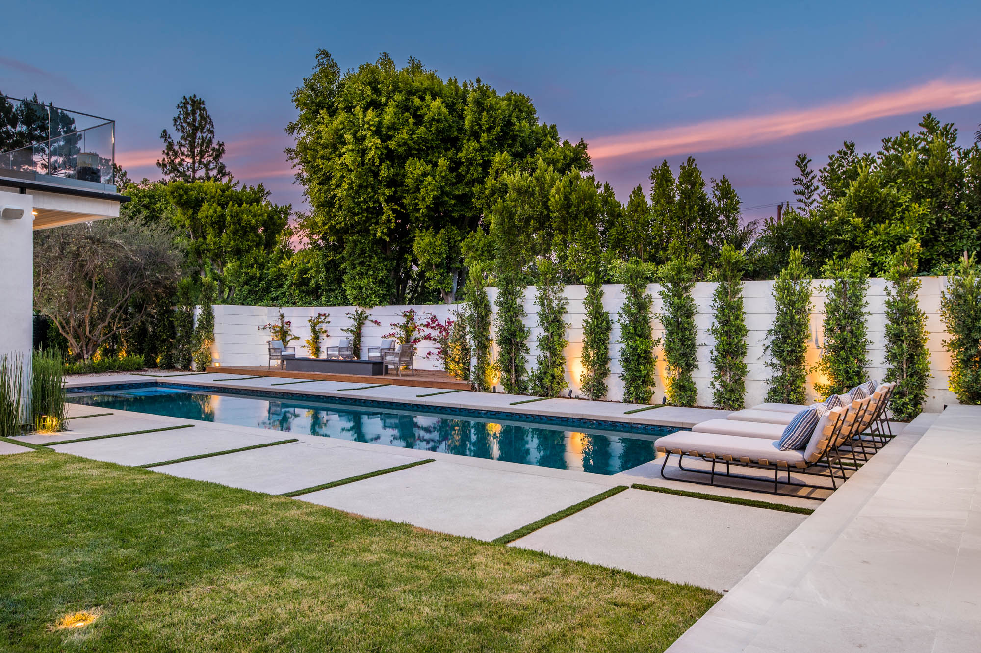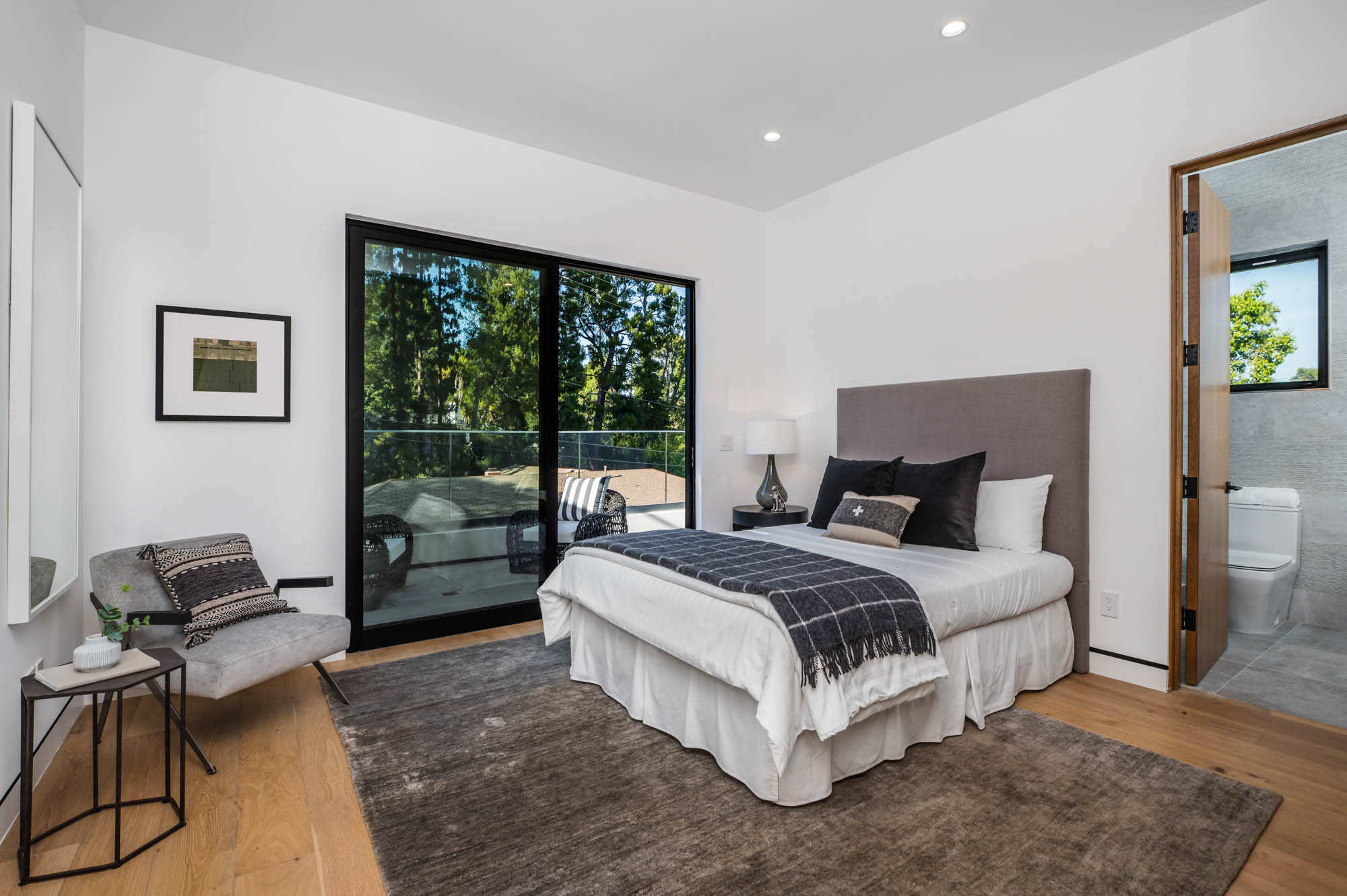 Situated on a Quiet Street South of the Blvd in Encino, this new construction contemporary modern estate is Encino's newest gem. Inside, soaring ceilings and wide glass staircase adorn a large main foyer, overlooking the expansive Entertainer's floor plan. An elegant formal dining room features a large wine cabinet flanked by a spacious interior courtyard. A sophisticated formal living room showcases a large linear fireplace, custom built-ins and large floor to ceiling pocket sliding doors that open up to an entertainer's dream backyard. The gourmet Chef's kitchen showcases quartz counters, stainless steel appliances, a large center island with an attached stone breakfast table adjacent to a second prep kitchen tucked away behind the dining room. Upstairs, the master suite features high ceilings, fireplace, sliding glass pocket doors, private balconies, and a spa-like master bath with large shower and soaking tub and spacious illuminated walk-in closet. A loft and three additional upstairs suites offer wonderful accommodations for family and friends. A spacious rooftop patio completes this property that provides you with a jetliner of the city and mountains. The Entertainer's backyard features a large sparkling pool and spa, pool cabana and pool house, sports court, numerous patio spaces complete with outdoor kitchen and 2 fire-pits. Additional conveniences include the Control4 smart home automation system. A luxurious lifestyle located near fine dining, shopping and more.