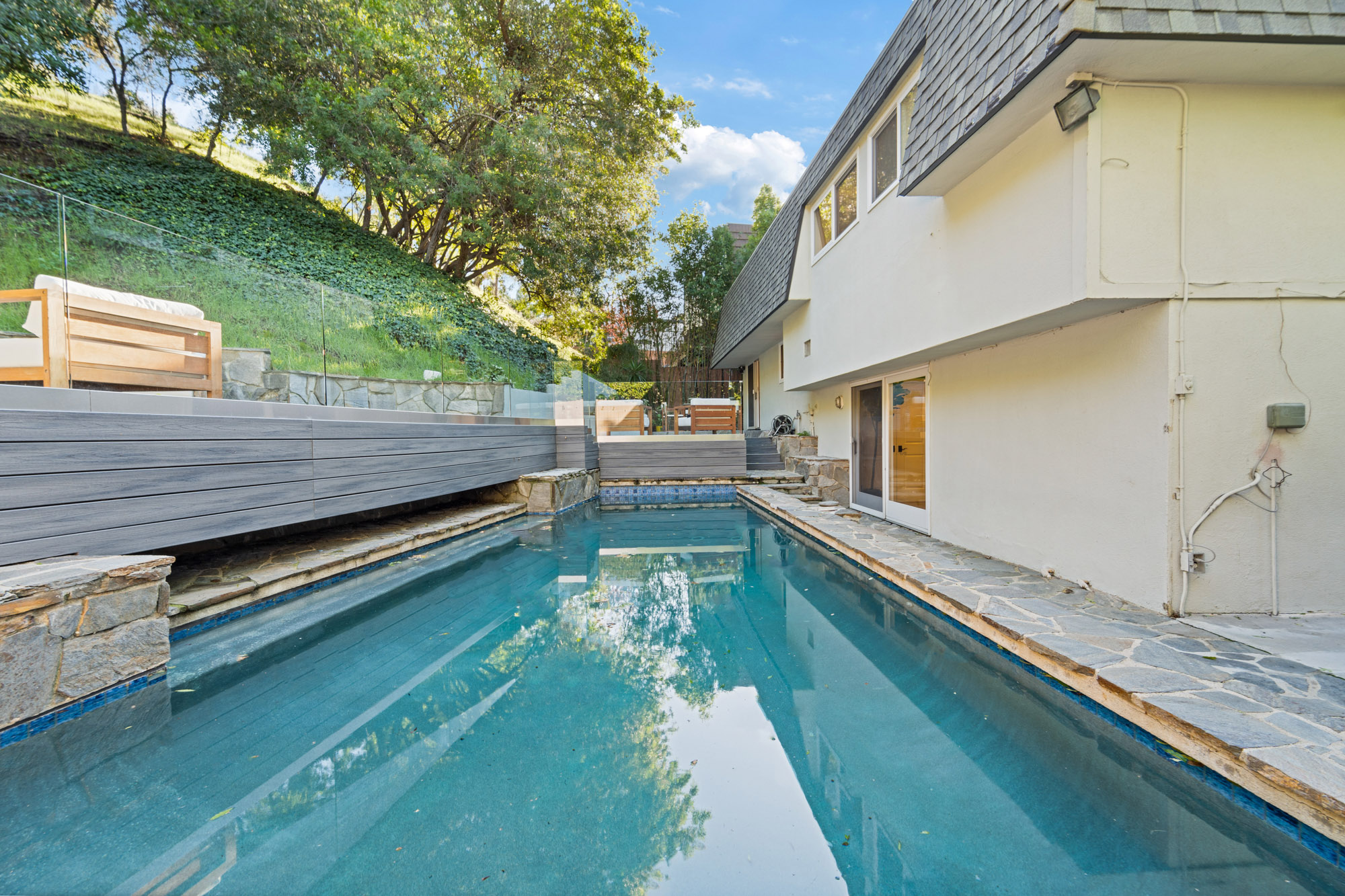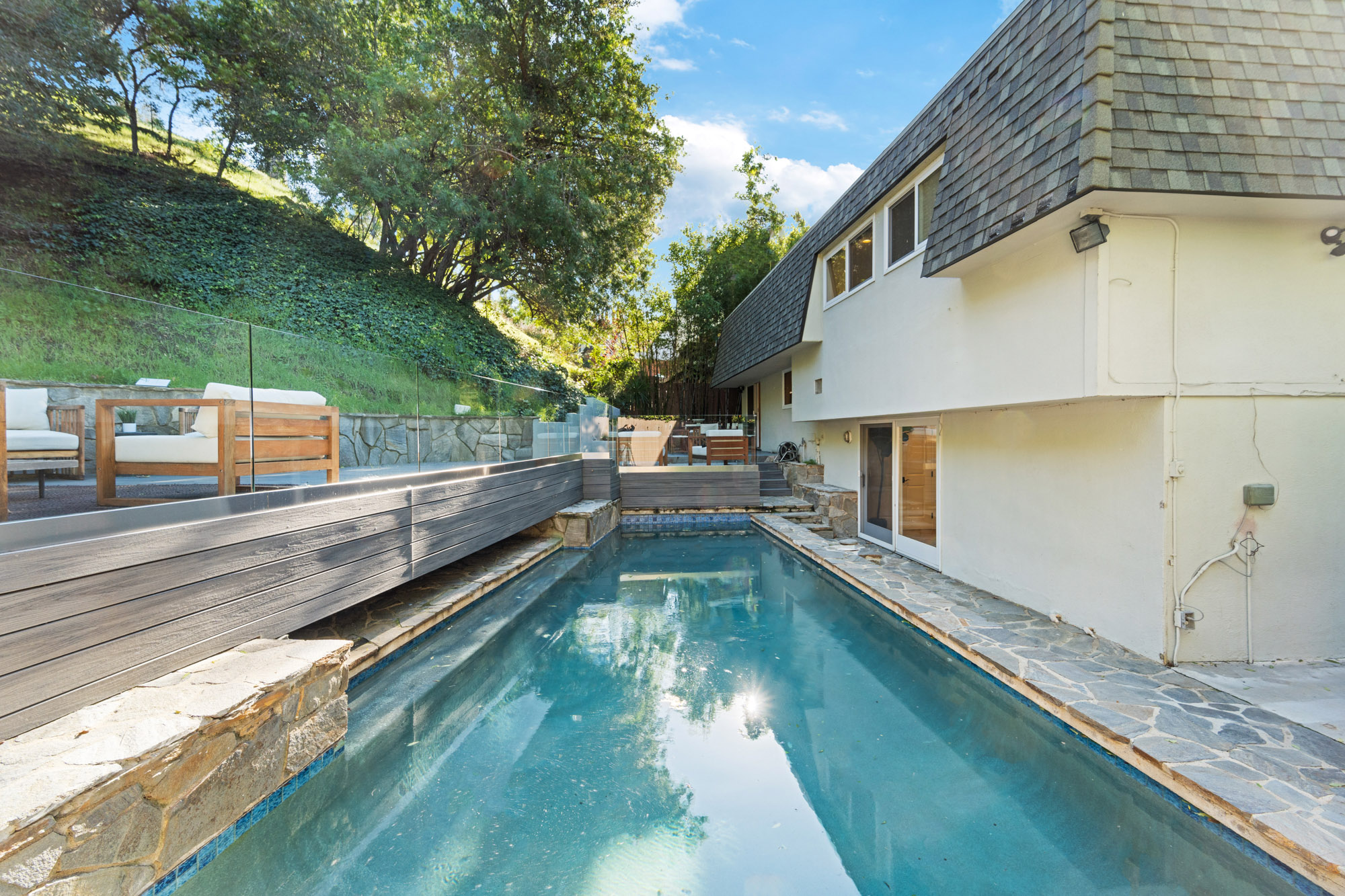 Tucked away in the hills of Encino, this thoughtfully designed split-level home by renowned architect Harlan Lee effortlessly blends timeless charm with modern amenities. Inside, the spacious living room opens seamlessly to the formal dining area and is accentuated by lofty wood-beamed ceilings, while the updated kitchen is outfitted with stainless steel appliances and sleek quartz countertops. On the upper level you will find three generously sized bedrooms and two full bathrooms, including a serene primary suite complete with a large walk-in closet and private ensuite bath. The lower level offers an additional bedroom with its own walk-in closet and ensuite bath, ideal for guests, family or as additional living space. With no neighbors directly behind you, the entertainers' backyard is your private retreat. Perfect for year-round enjoyment, the space is highlighted by a sparkling pool, built-in firepit and gorgeous stone patio. Additional features include rich hardwood flooring and an attached two-car garage. Ideally located south of the Boulevard within the highly sought-after Lanai Road School District, this property provides easy access to everything the Valley and the Westside have to offer.