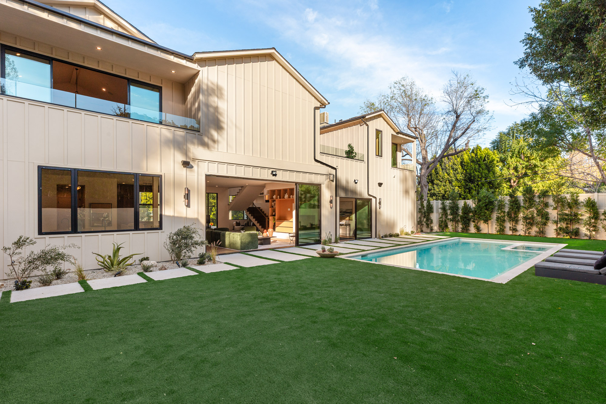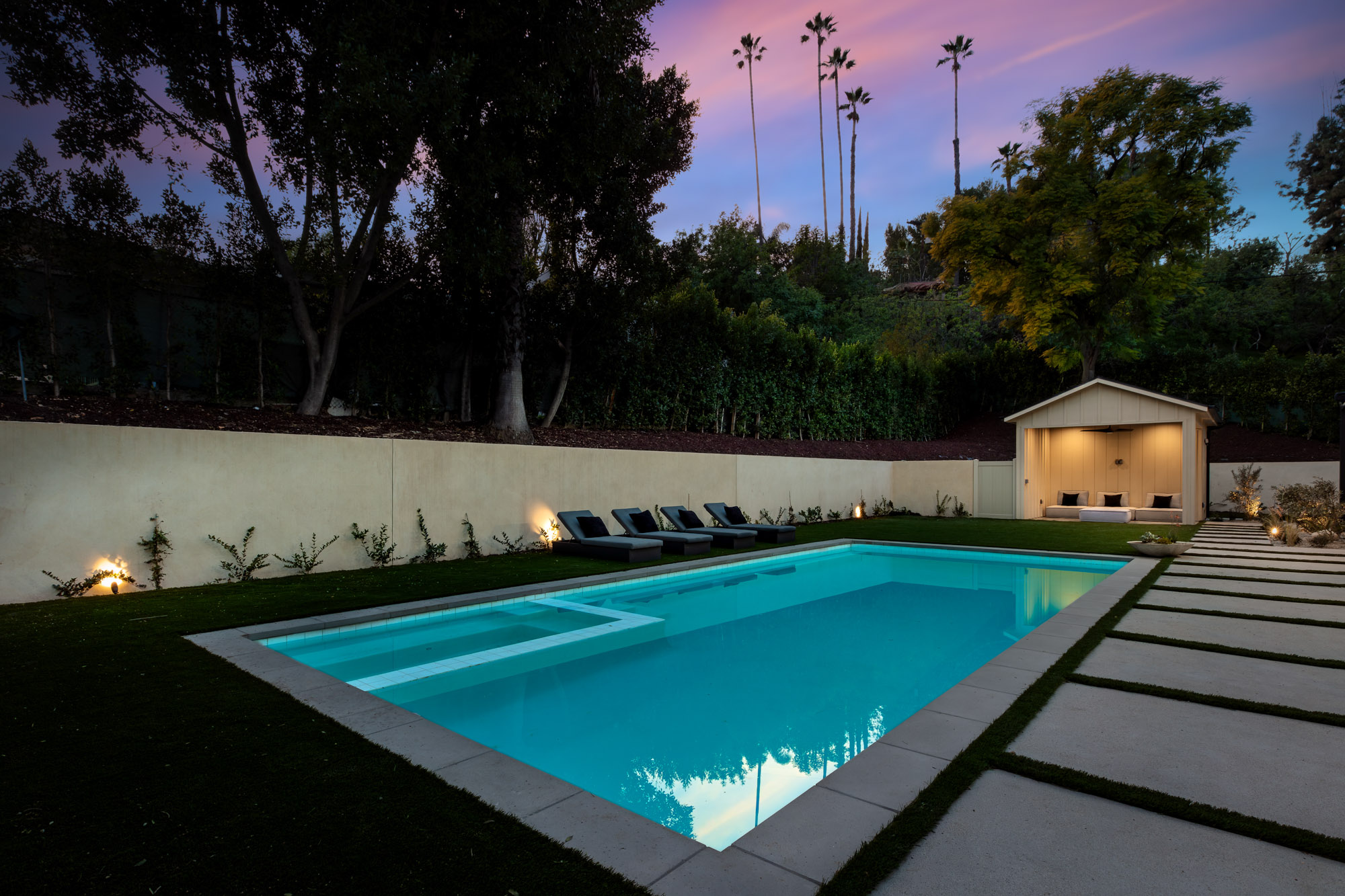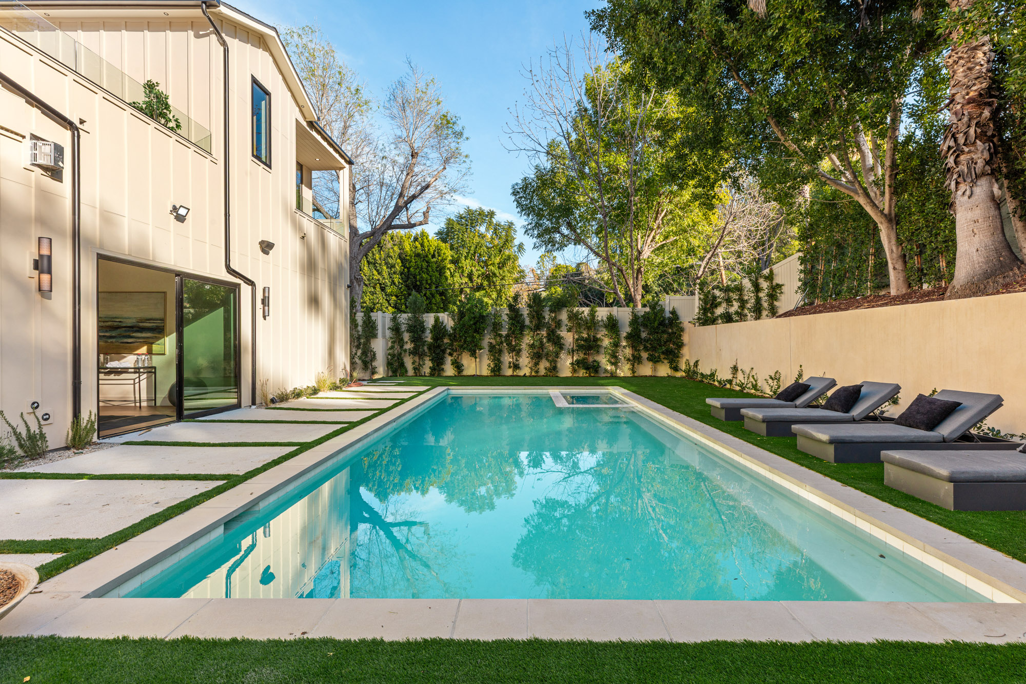 Tucked away in the hills of Tarzana, this newly constructed estate is set behind private gates on an expansive 16,000+ sqft lot, offering a rare sense of seclusion and serenity. From the moment you arrive, there is an unmistakable feeling of having found something truly special. Grand double doors open to an awe-inspiring open-concept interior where soaring ceilings and dramatic walls of glass frame the natural light like living art. Sunlight pours in, illuminating refined finishes and creating an atmosphere that feels both elevated and warmly inviting. Every detail has been thoughtfully curated to balance modern sophistication with effortless comfort. At the heart of the home, the epicurean kitchen is a statement of style and substance. Outfitted with top-tier appliances, an impressive center island, and an expansive walk-in pantry, it is designed as much for gathering as it is for culinary excellence. The formal dining room, complete with a built-in beverage refrigerator, sets the stage for elegant dinner parties and intimate celebrations alike. An oversized sliding glass door disappears to seamlessly unite the living room with the outdoors, transforming everyday living into a resort-like experience. The backyard is a private sanctuary, lush, tranquil, and designed for both indulgence and connection. Lounge beside the shimmering pool and spa, entertain effortlessly in the cabana with its 3/4 bath, or savor evenings under the pergola with a fully appointed outdoor kitchen as the sun sets over the hills. The main level continues to impress with a thoughtfully designed media room, perfect for cinematic evenings and elevated entertaining, alongside a versatile bonus room, a gracious ensuite guest bedroom, a sophisticated powder room, and a mudroom with direct access to the two-car garage. Upstairs, the primary suite unfolds as a retreat of true refinement. A private balcony offers a peaceful vantage point, while the oversized dual walk-in closets provide boutique-inspired luxury. The spa-inspired bath is a haven of relaxation, featuring a sculptural soaking tub, an expansive 2-person rainfall shower, a floating oversized vanity with dual sinks, a dedicated makeup vanity, and a private water closet, an environment designed for restoration and calm. Three additional ensuite bedrooms, a dedicated laundry room, and a sun-drenched balcony complete the upper level with both comfort and elegance. Fully integrated with a Control4 smart home system, the residence offers seamless command of lighting, climate, audio, and a comprehensive security system featuring exterior cameras, bringing modern ease to refined living. Ideally situated South of the Boulevard within an exceptional school district, this extraordinary property offers the rare balance of privacy and proximity to the finest dining, shopping, and lifestyle amenities the valley has to offer, yet worlds away in its peace and exclusivity.