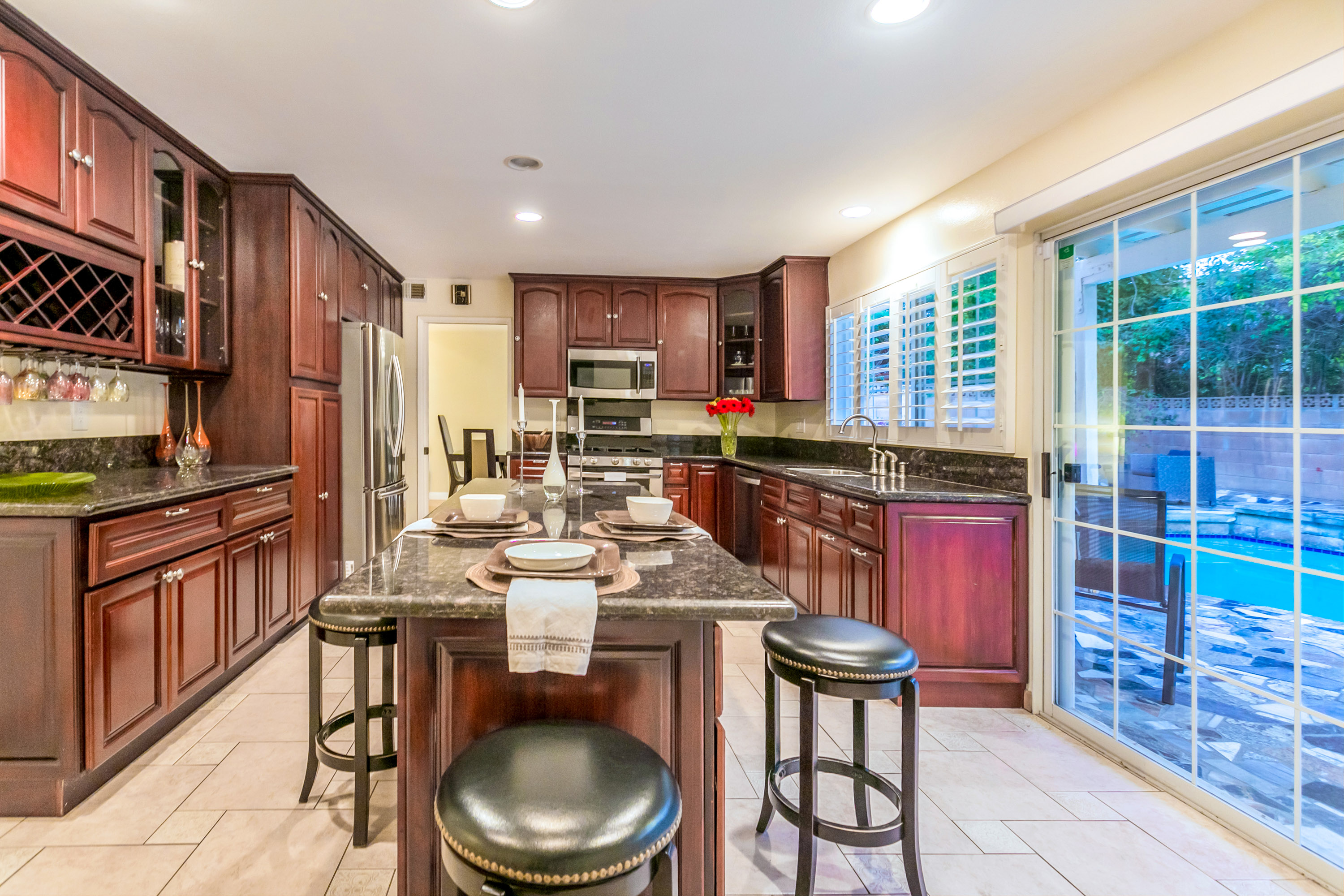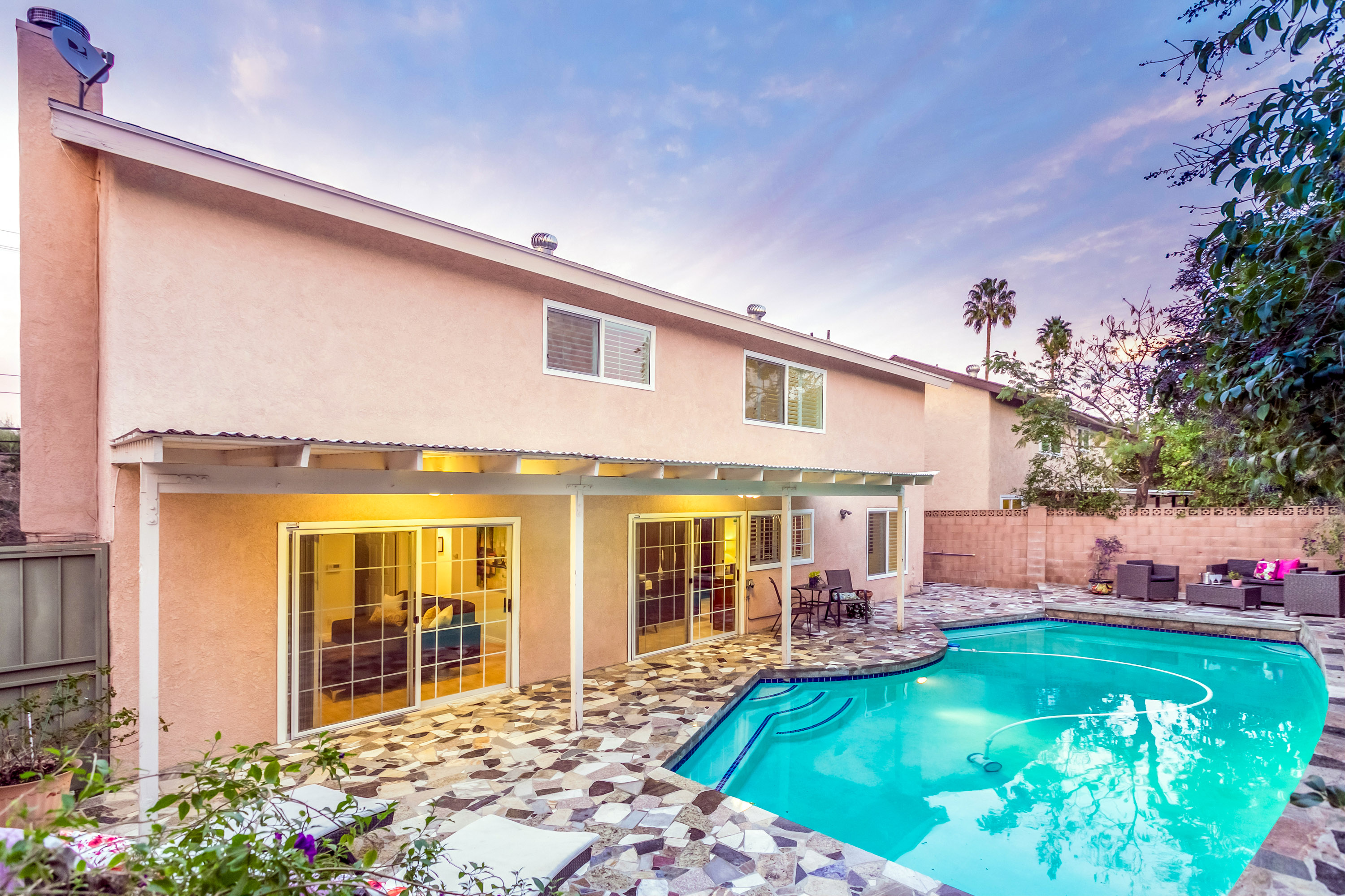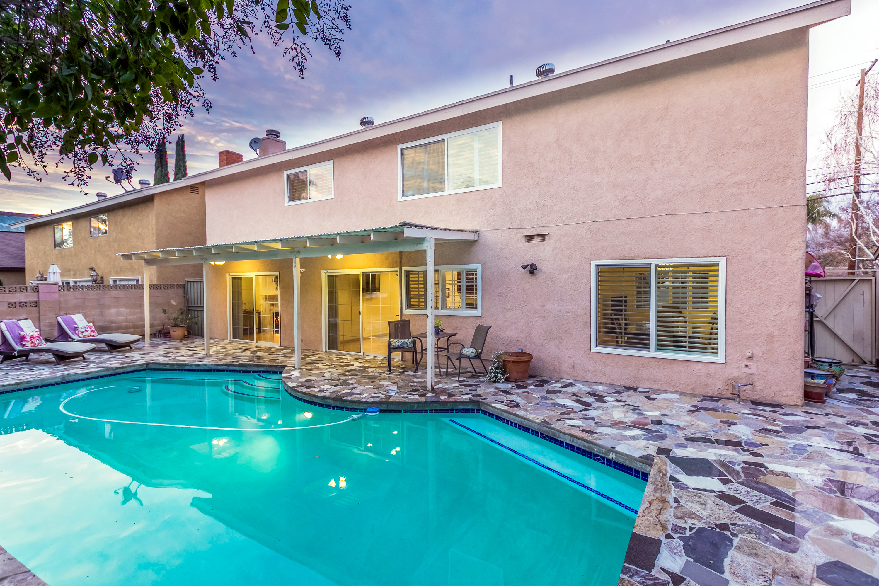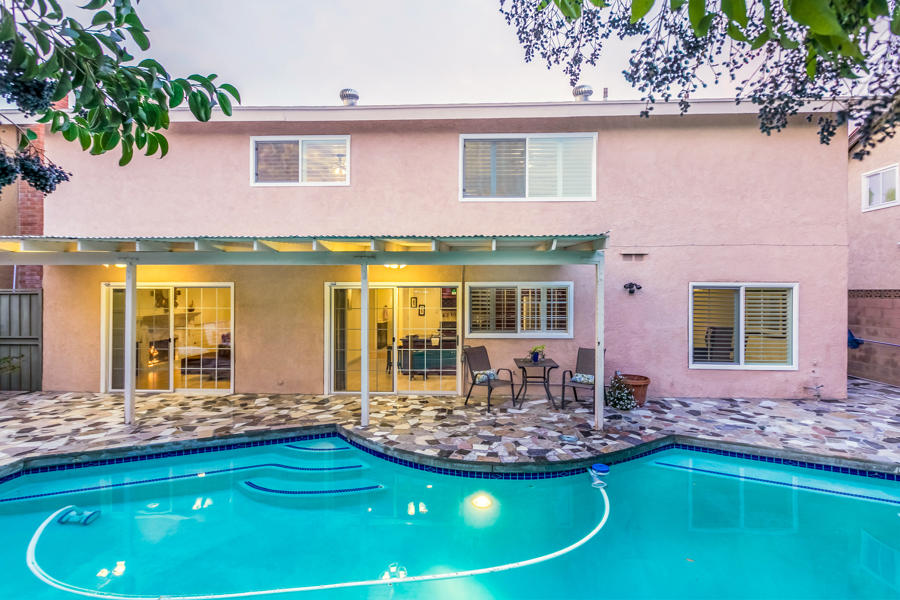 Charming 2-story traditional home in Tarzana. Walk up the front path, through a rose garden, to the private and inviting double door entrance. As you walk in, you are greeted by high ceilings and skylights, creating a grand entrance flooded with an abundance of natural light. The spacious living room opens to the formal dining room, highlighted by a gorgeous chandelier which adds character and elegance. Conveniently located off the dining room is the kitchen, complete with granite countertops, oversized center island, an abundance of cabinets, and stainless steel appliances. The home also features a large family room with an ornate fireplace and extra storage. Both the kitchen and family rooms offer glass sliding doors that open to the backyard with view of the sparkling pool! Upstairs you will find all four generously sized bedrooms, as well as two full bathrooms both with double sinks. The Master bedroom offers plenty of natural light, spacious closets, and in-suite bathroom. Plantation shutters and recessed lighting embellish every room. This home is centrally located to the 101 freeway and the highly desirable Tarzana Safari Walk with shops, restaurants, and so much more, this home is a must see!