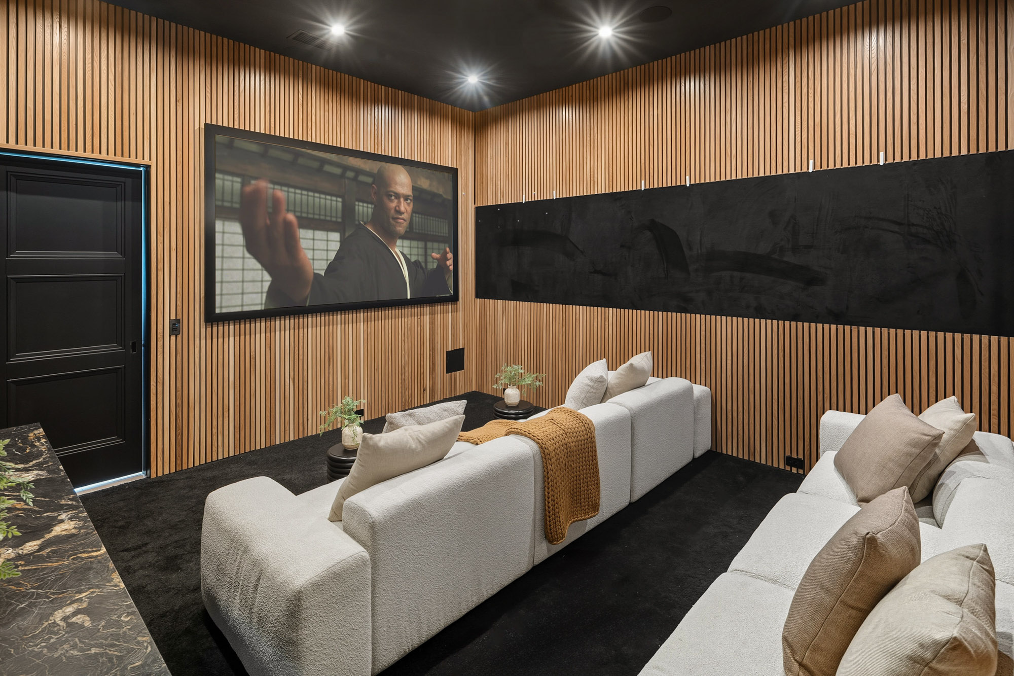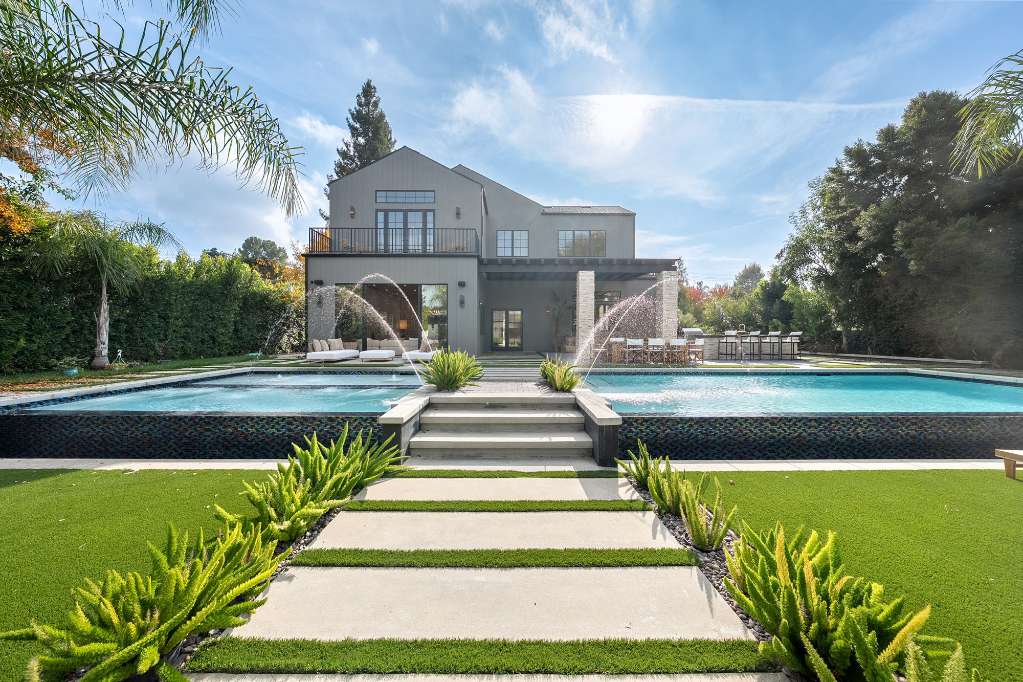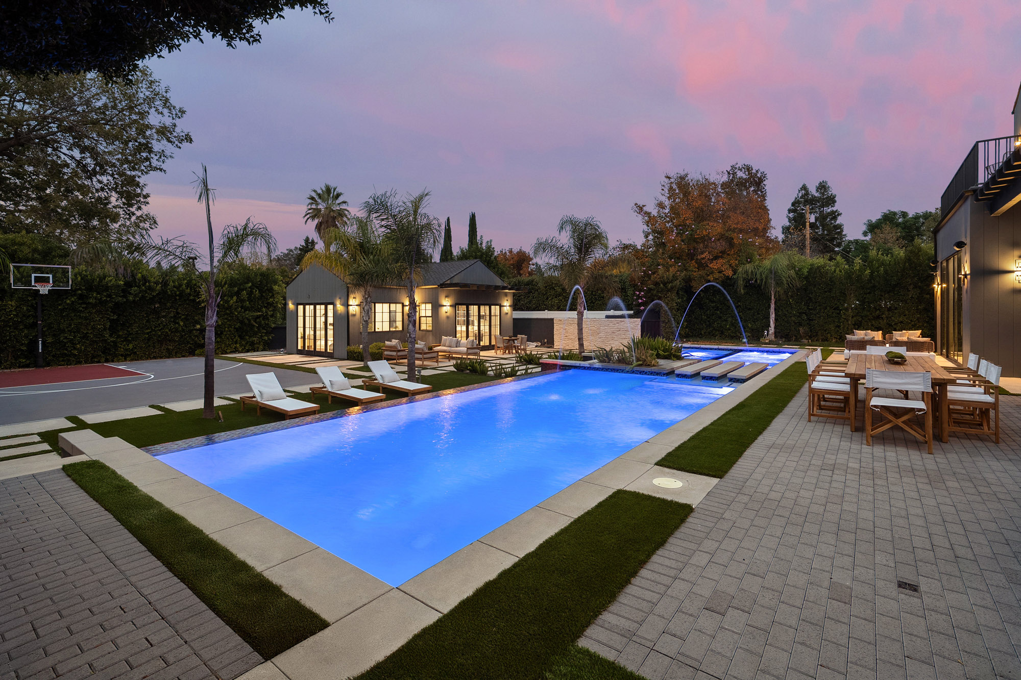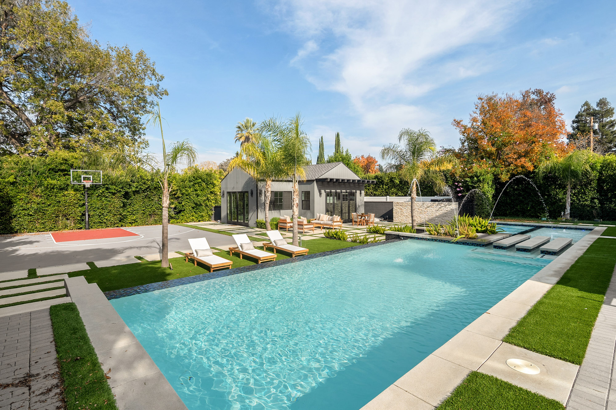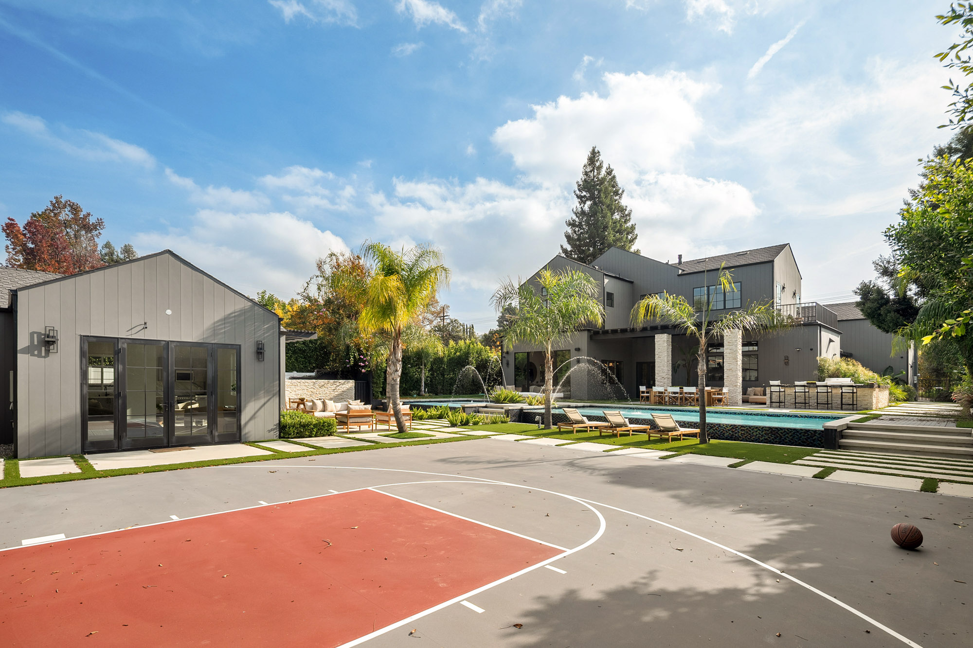 Tucked behind private gates on nearly half an acre in the heart of prime Woodland hills, this newer-construction estate features a 5-bed, 6-bath main residence and 1-bed, 1-bath ADU. Designed for modern living, the bright and airy open-concept floor plan is accentuated by lofty ceilings and wide-plank European floors that carry throughout the home. A culinary enthusiast's dream, the designer kitchen comes equipped with premium Thermador appliances, double islands and a large walk-in pantry. The formal dining room effortlessly connects the kitchen with the spacious family room, creating a seamless flow for entertaining and everyday living, while a floor-to-ceiling sliding glass door opens to extend your living space outside. Completing the main level is an inviting formal living room, state-of-the-art home theater and ensuite bedroom. Head upstairs to find four generously sized ensuite bedrooms and a dedicated laundry room. The luxurious primary suite boasts two private balconies, a custom walk-in closet and spa-inspired bathroom, complete with an oversized steam shower, soaking tub, dual water closets, dual vanities and a separate makeup vanity. Reminiscent of a five-star resort, the expansive backyard retreat is surrounded by mature privacy hedges and features a sparkling infinity-edge pool with a massive spa, a sports court, outdoor kitchen with bar seating and an in-ground fire pit. Perfect for extended family, guests or as additional living space, the versatile ADU has its own address, a living room with a full kitchen, bedroom, bathroom and walk-in closet. Additional highlights include a Control4 smart home system that operates the built-in speakers, lights and thermostat, a security system, wine storage, two-car garage and circular driveway. Located south of the Boulevard, this exceptional property offers convenient access to shops, restaurants, the 101 freeway and so much more.