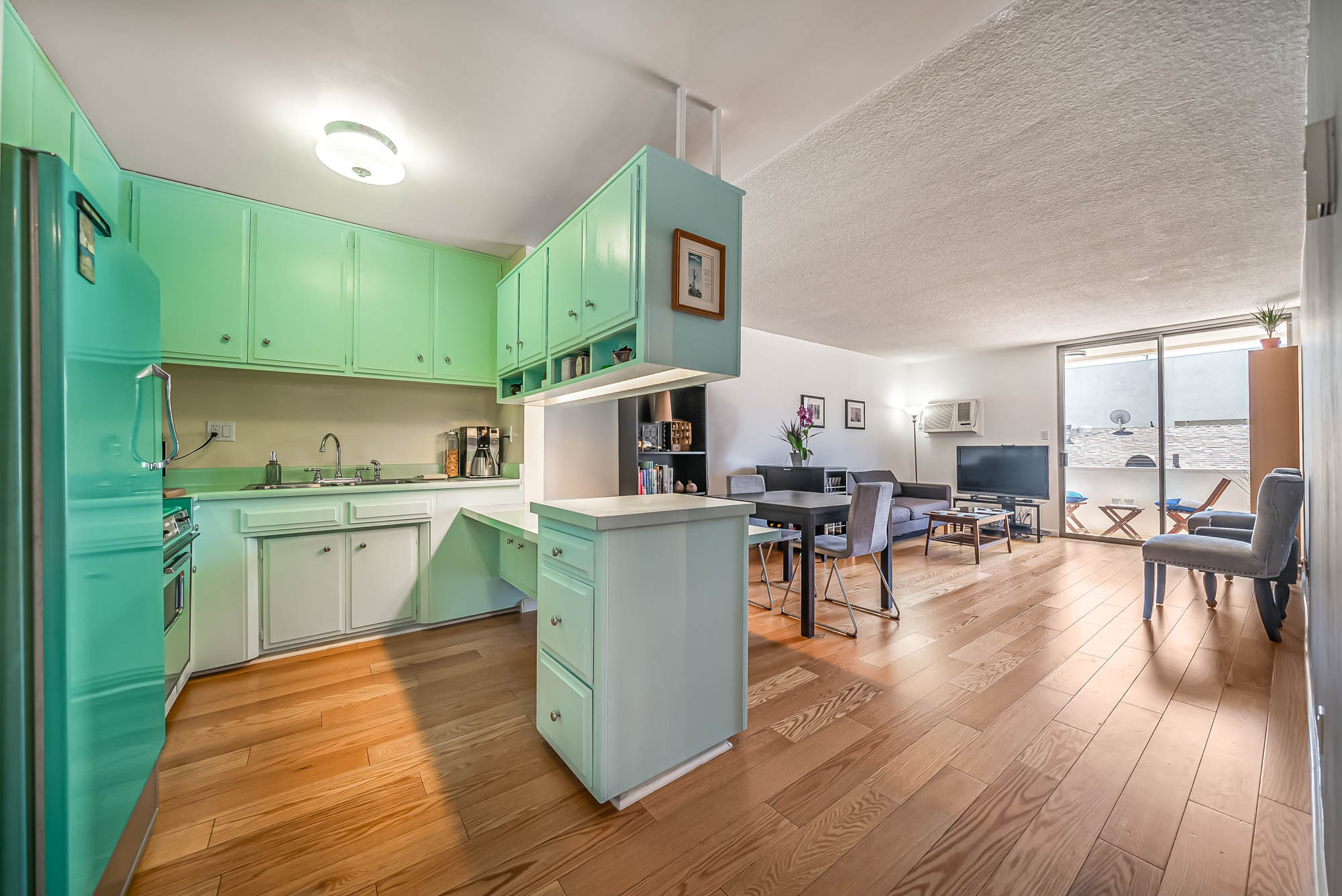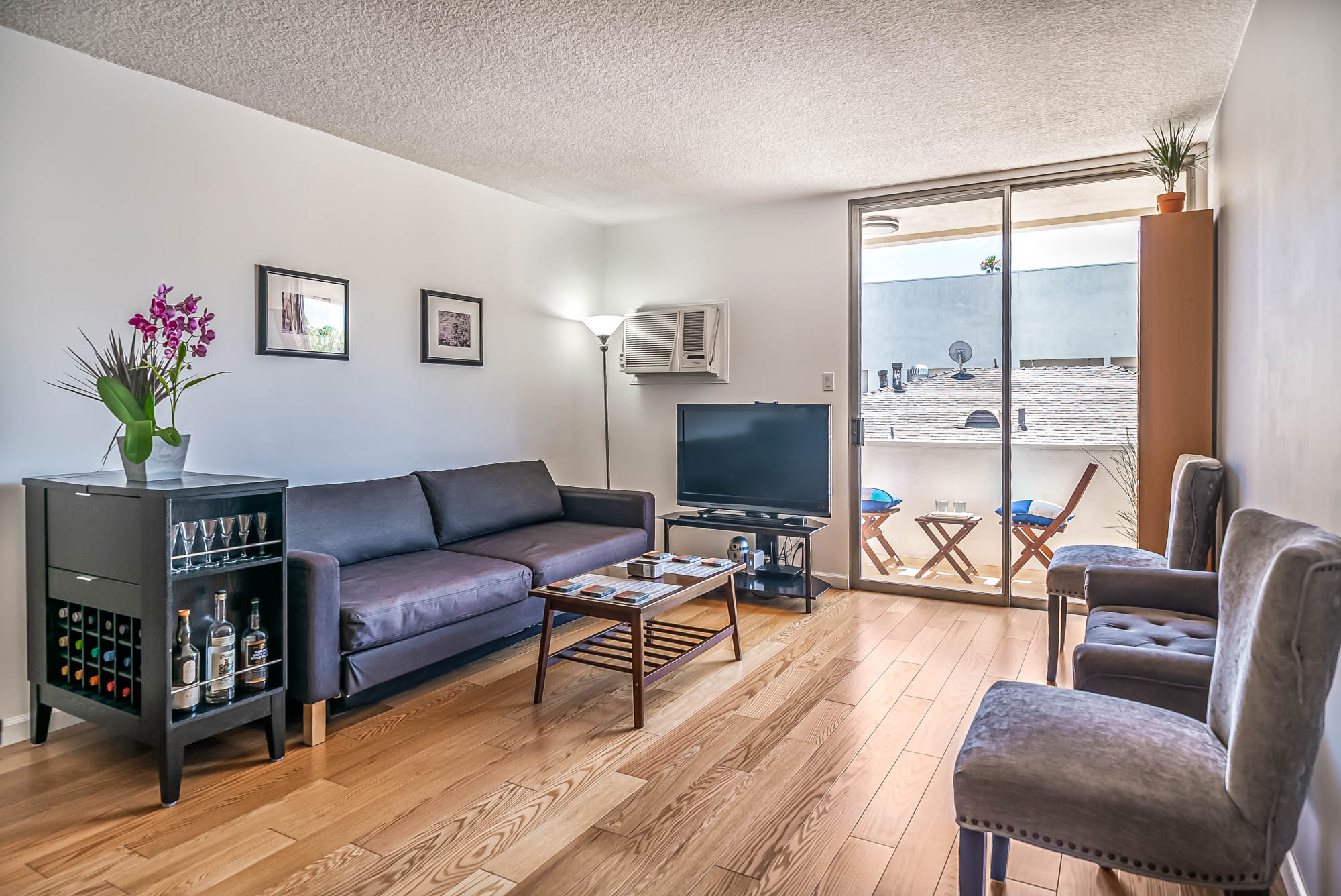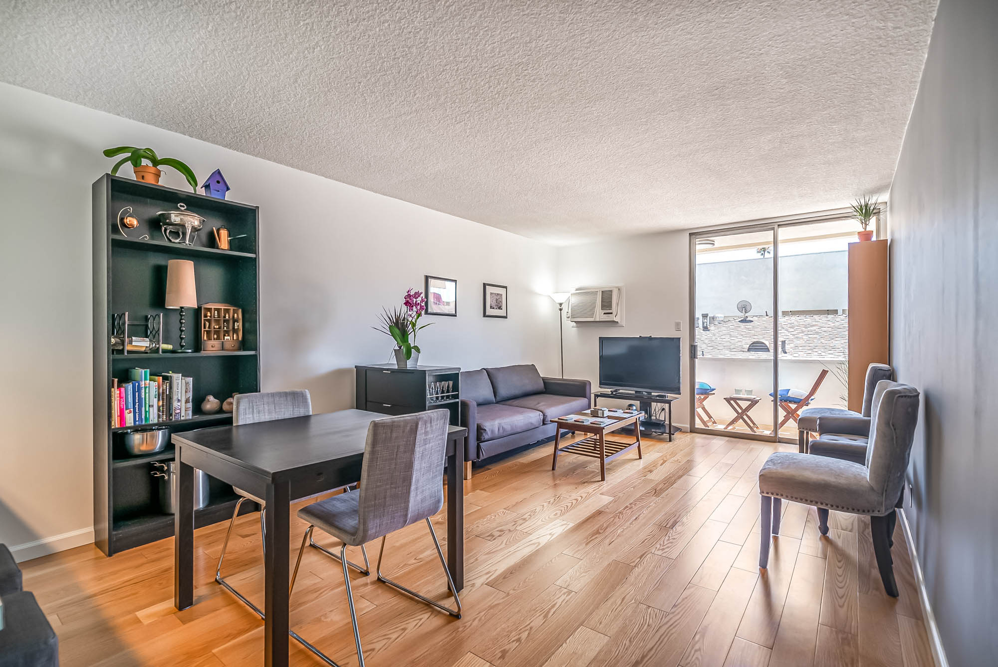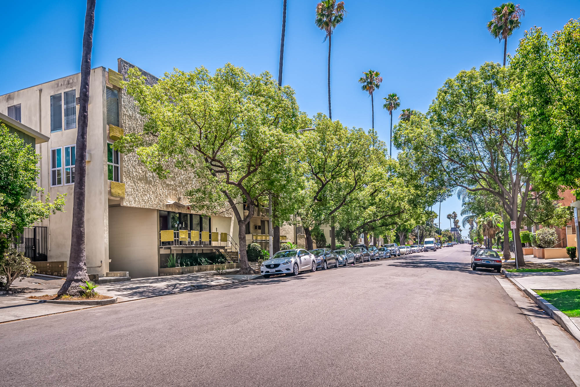 Welcome home to this bright and cheerful one bedroom one bath condo with amazingly cool retro vibes! Prime Hancock Park location close to Larchmont Village shops and restaurants, The Wiltern and Western Avenue. This quiet top floor unit features an open concept floor plan with recently upgraded hardwood flooring throughout. The vintage kitchen features a breakfast bar that opens to the dining area and an abundance of storage. Located off of the living area is a balcony perfect for your morning cup of coffee or to enjoy the evening sunsets. The spacious bedroom has a large window with beautiful treetop views and two closets. The retro theme continues into the pristine bathroom with black and white tile floors, tons of counter space, and a vanity area. Other highlights include a rooftop deck, with views of Griffith Observatory and the Hollywood Sign, newer air conditioning unit, and fresh paint.