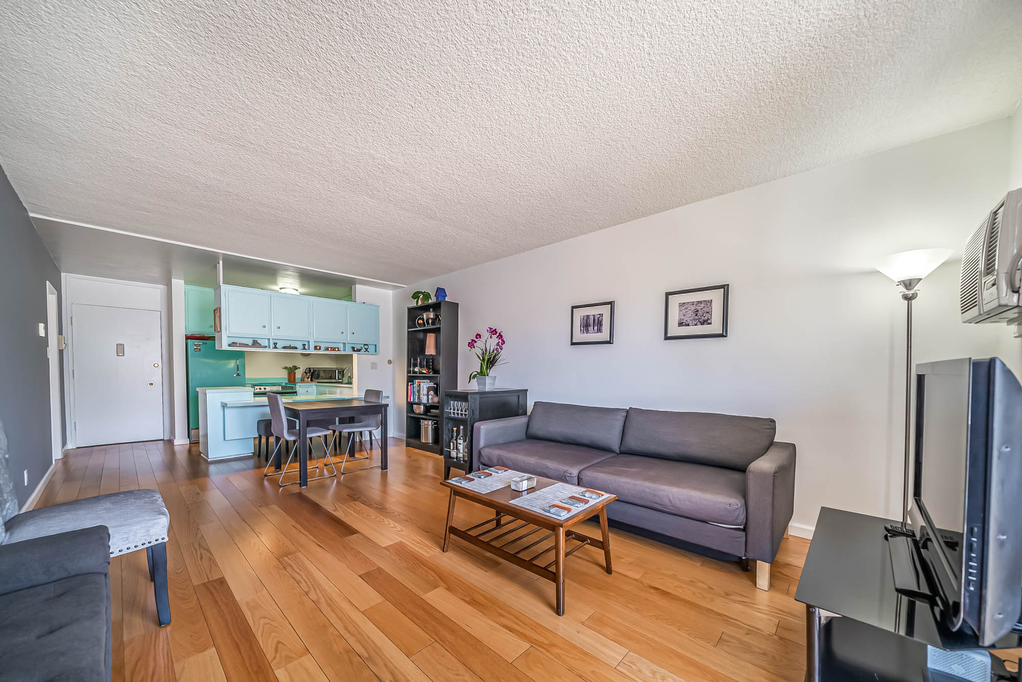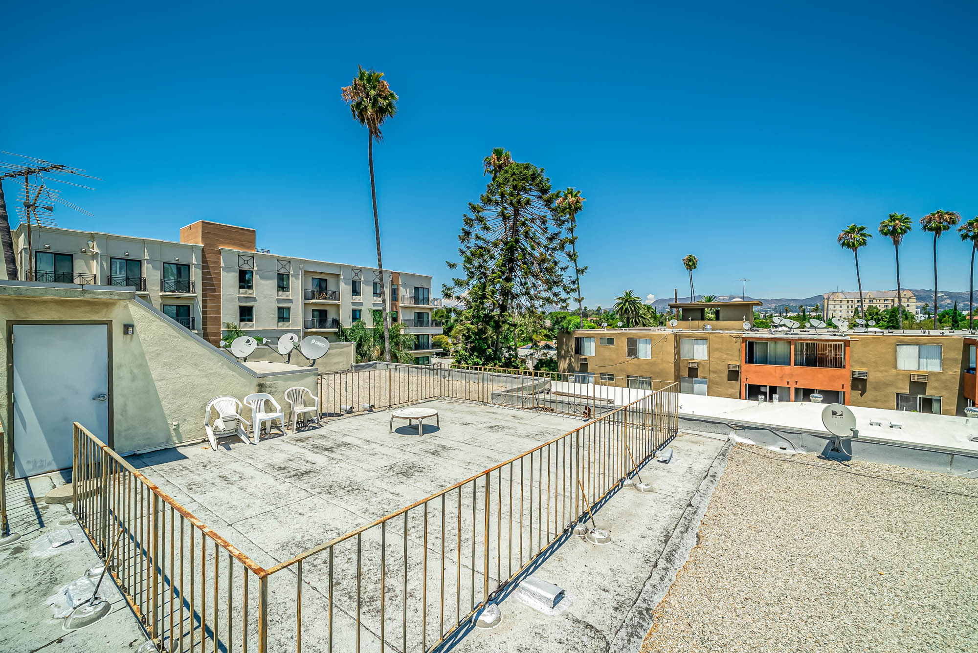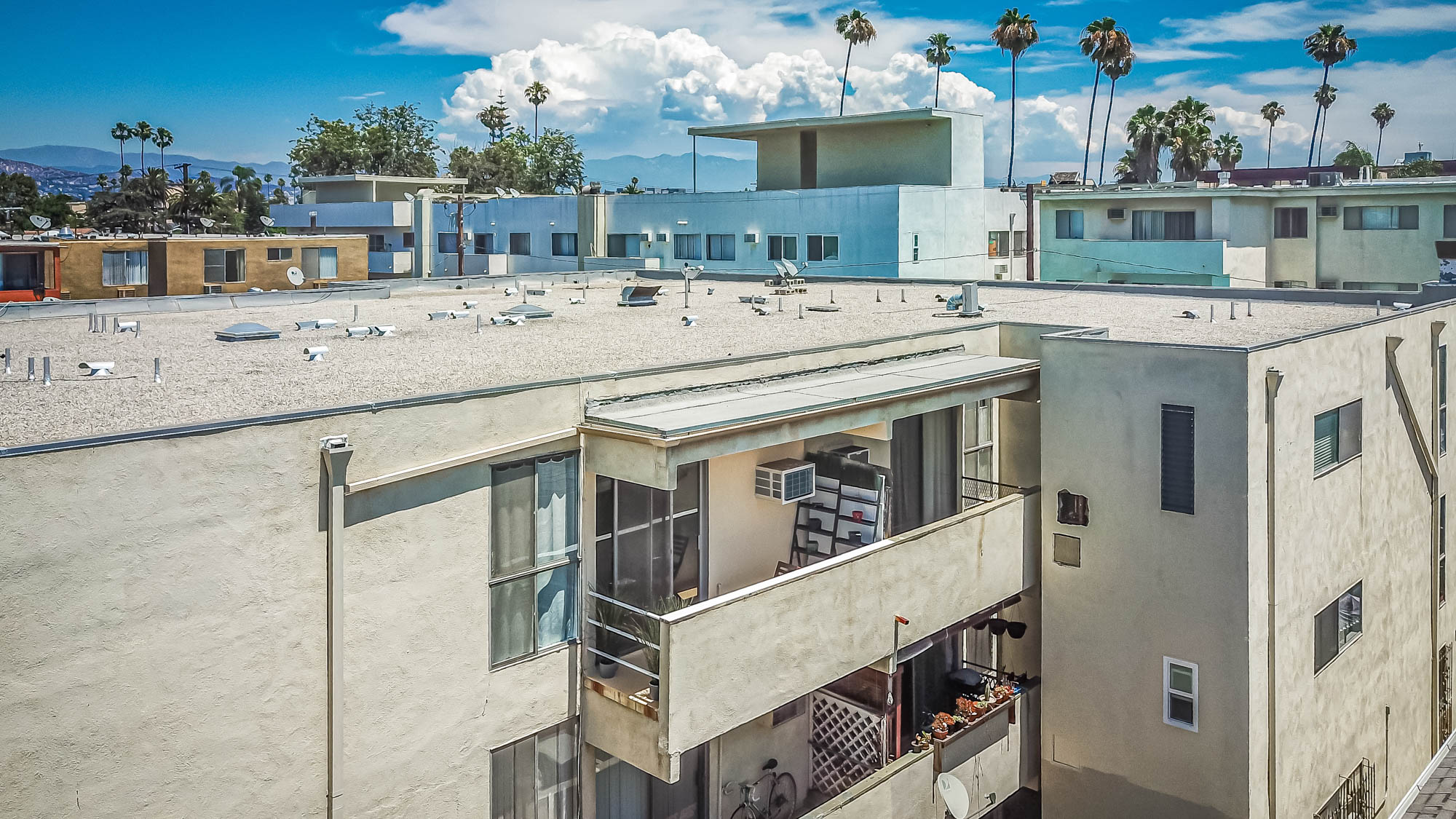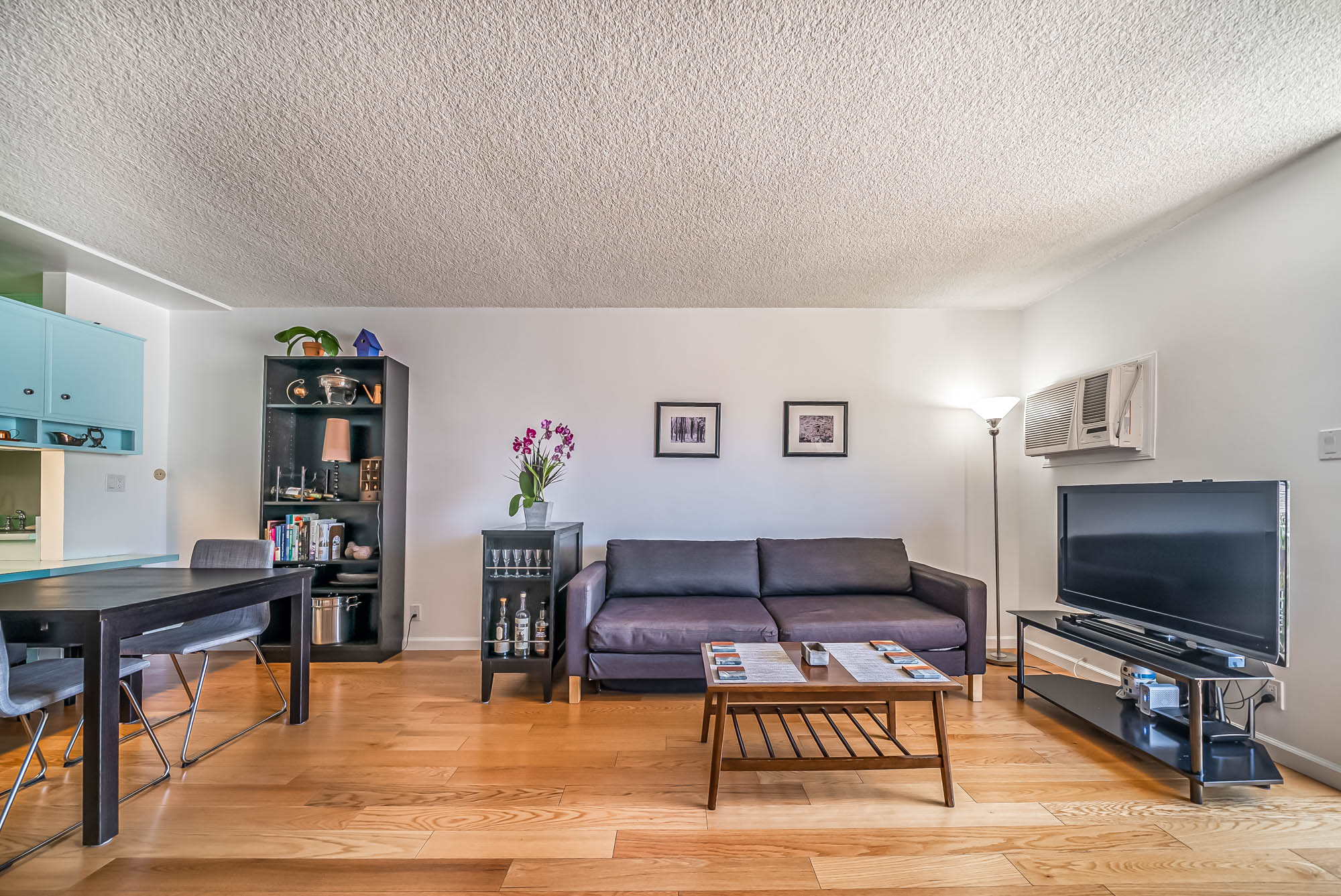 Welcome home to this bright and cheerful one bedroom one bath condo with amazingly cool retro vibes! Prime Hancock Park location close to Larchmont Village shops and restaurants, The Wiltern and Western Avenue. This quiet top floor unit features an open concept floor plan with recently upgraded hardwood flooring throughout. The vintage kitchen features a breakfast bar that opens to the dining area and an abundance of storage. Located off of the living area is a balcony perfect for your morning cup of coffee or to enjoy the evening sunsets. The spacious bedroom has a large window with beautiful treetop views and two closets. The retro theme continues into the pristine bathroom with black and white tile floors, tons of counter space, and a vanity area. Other highlights include a rooftop deck, with views of Griffith Observatory and the Hollywood Sign, newer air conditioning unit, and fresh paint.