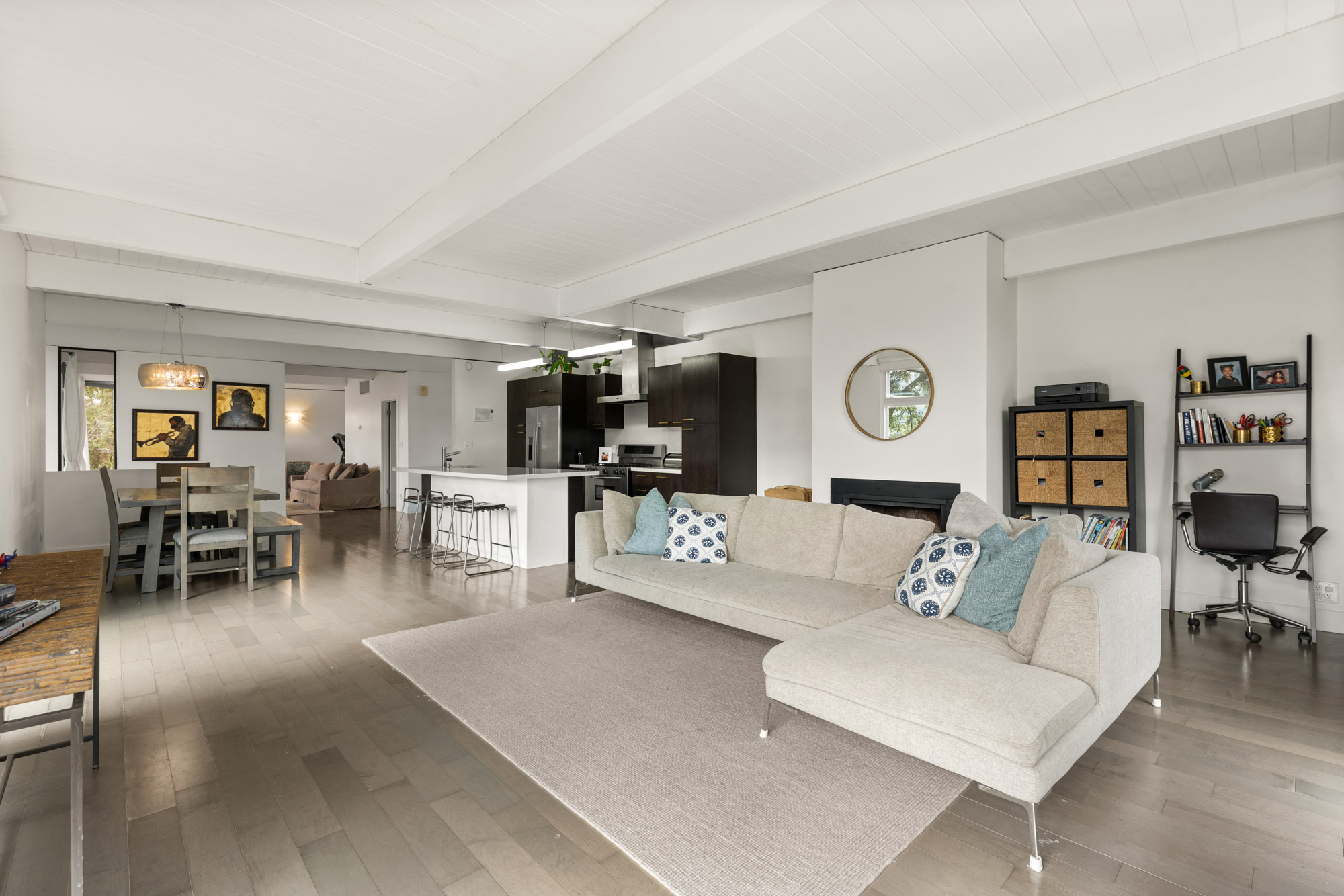 Nestled in the heart of the Hollywood Hills, this stunning home showcases sweeping hillside views and an unbeatable location just moments from the major studios, Lake Hollywood and everything the Valley, Westside and Downtown LA have to offer. Designed in a timeless mid-century modern style, this home blends architectural character with contemporary comfort. The upper level offers a spacious open-concept layout featuring a gourmet kitchen with stainless steel appliances, dining area and living room, ideal for both everyday living and entertaining, along with a versatile den and full bathroom. Downstairs, you’ll find three generously sized bedrooms, another full bathroom and a dedicated laundry area. Additional highlights include floor-to-ceiling windows throughout, a gated front courtyard, large backyard and two-car garage.