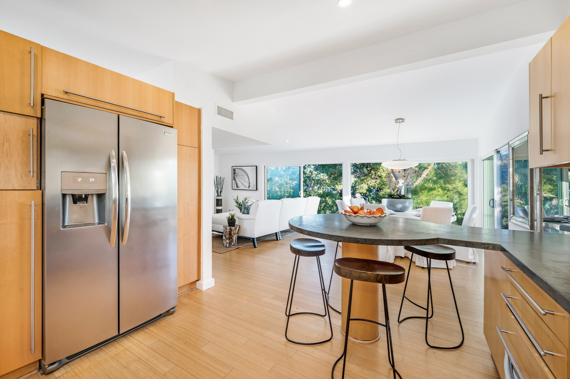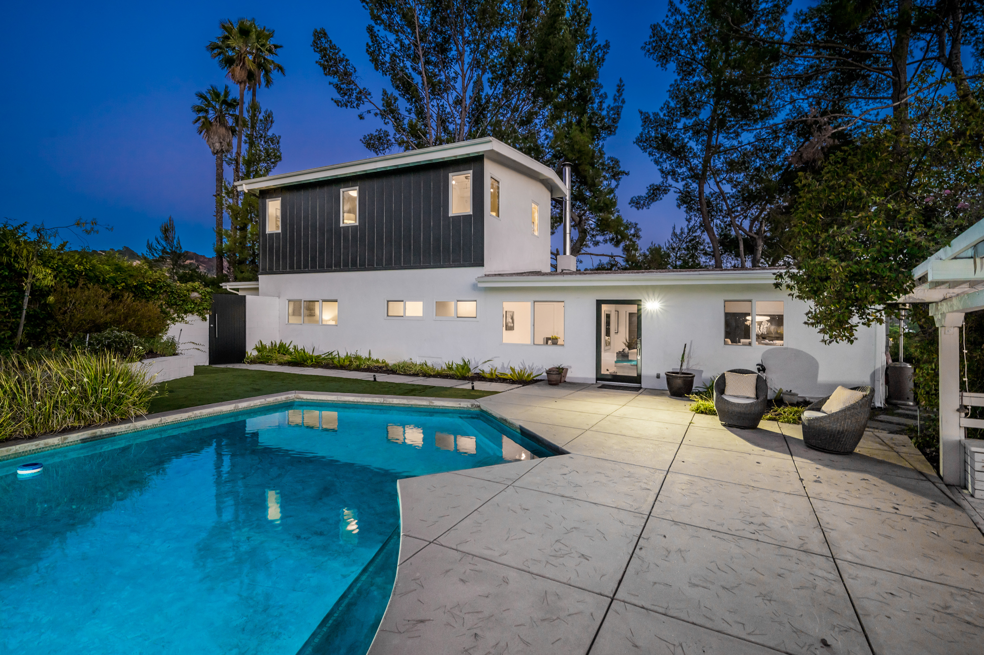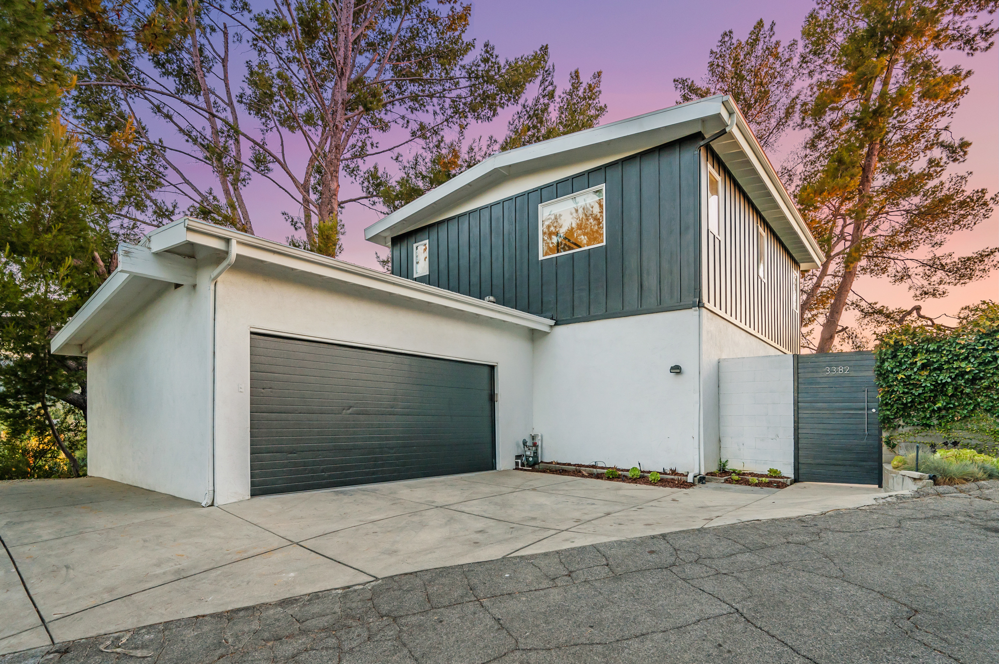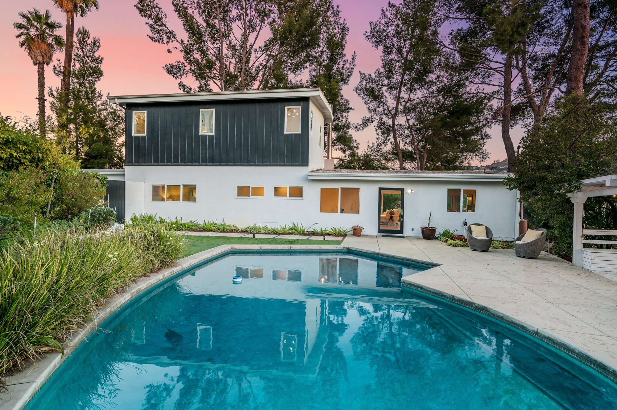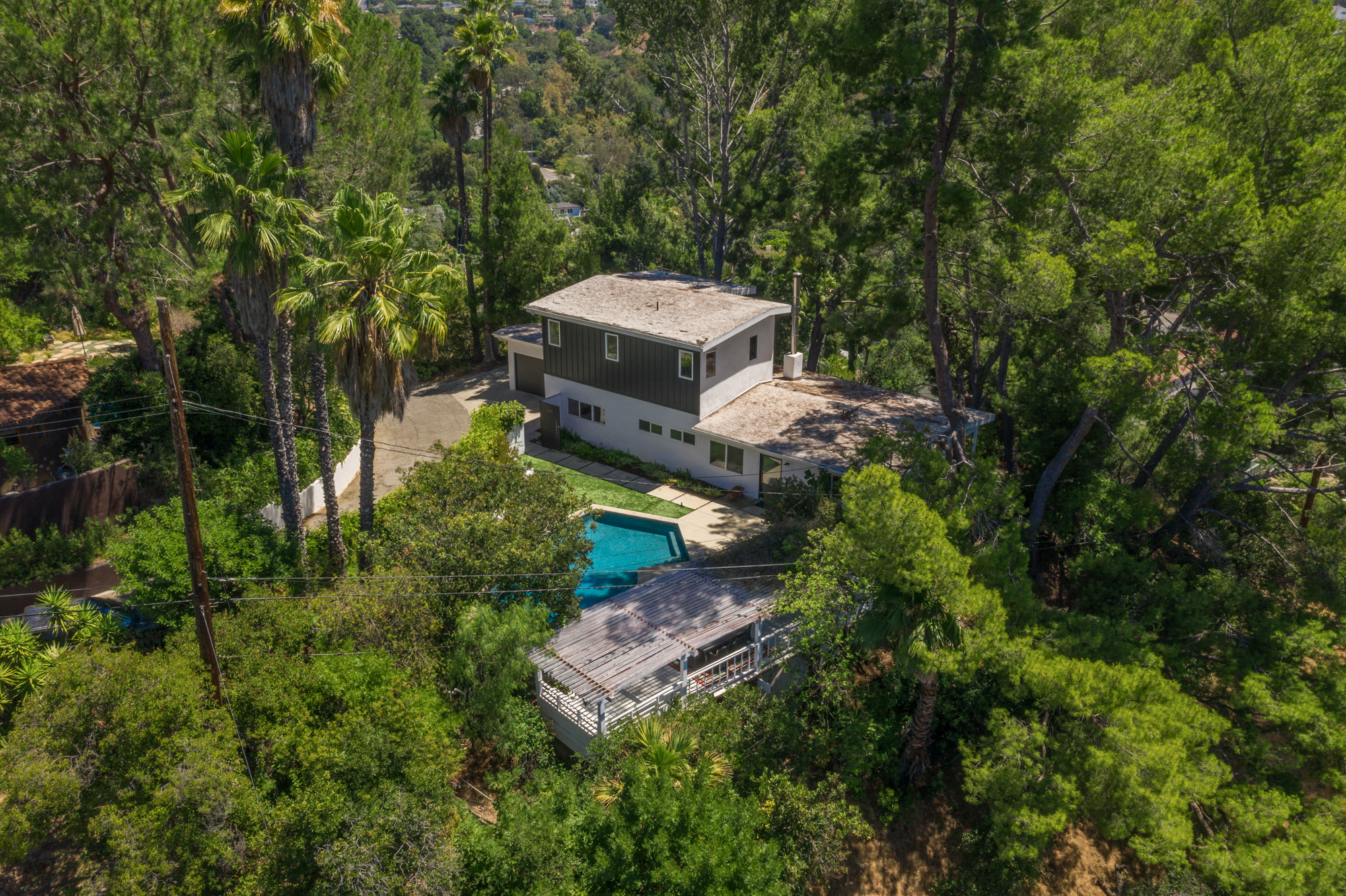 Perched at the end of a quiet cul-de-sac and surrounded by mature trees in the Carpenter School District is this captivating modern view home in the hills of Studio City. Through the front gate, you are met with stunning mountain views, a sparkling pool, and a charming vine-covered pergola. The home’s architecture and many windows perfectly complement the outdoors, infusing the interior with an abundance of natural light. The first floor’s open concept layout has high ceilings and seamlessly connects the updated kitchen, dining room, and living room with walls of sliding glass doors that offer more tranquil views of the surrounding hills. The first floor also offers three bedrooms and an office. Upstairs the spacious master bedroom features a beautifully updated master bath with natural limestone surfaces. The additional upstairs bedroom is ideal as a kid’s bedroom, studio, or 2nd office. Moments from Fryman Canyon hiking trails and conveniently located to the West Side.