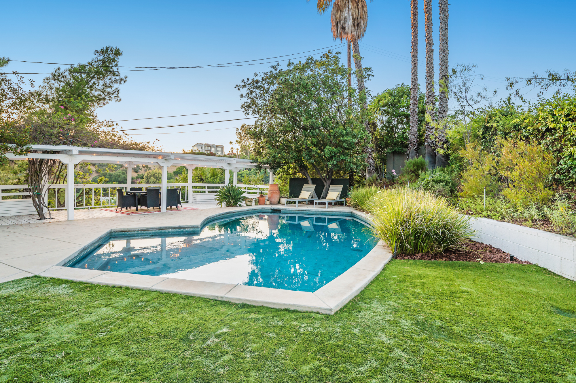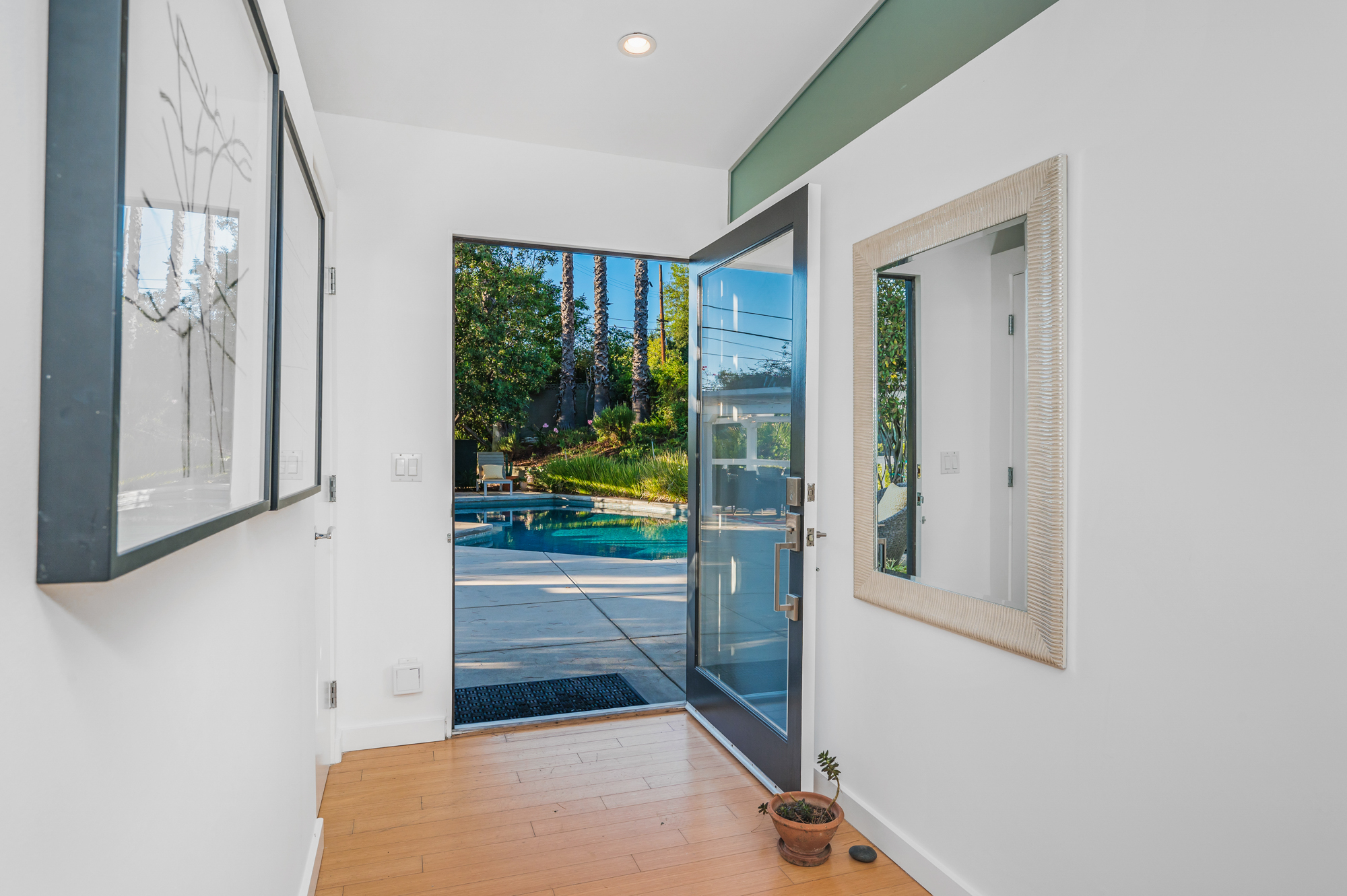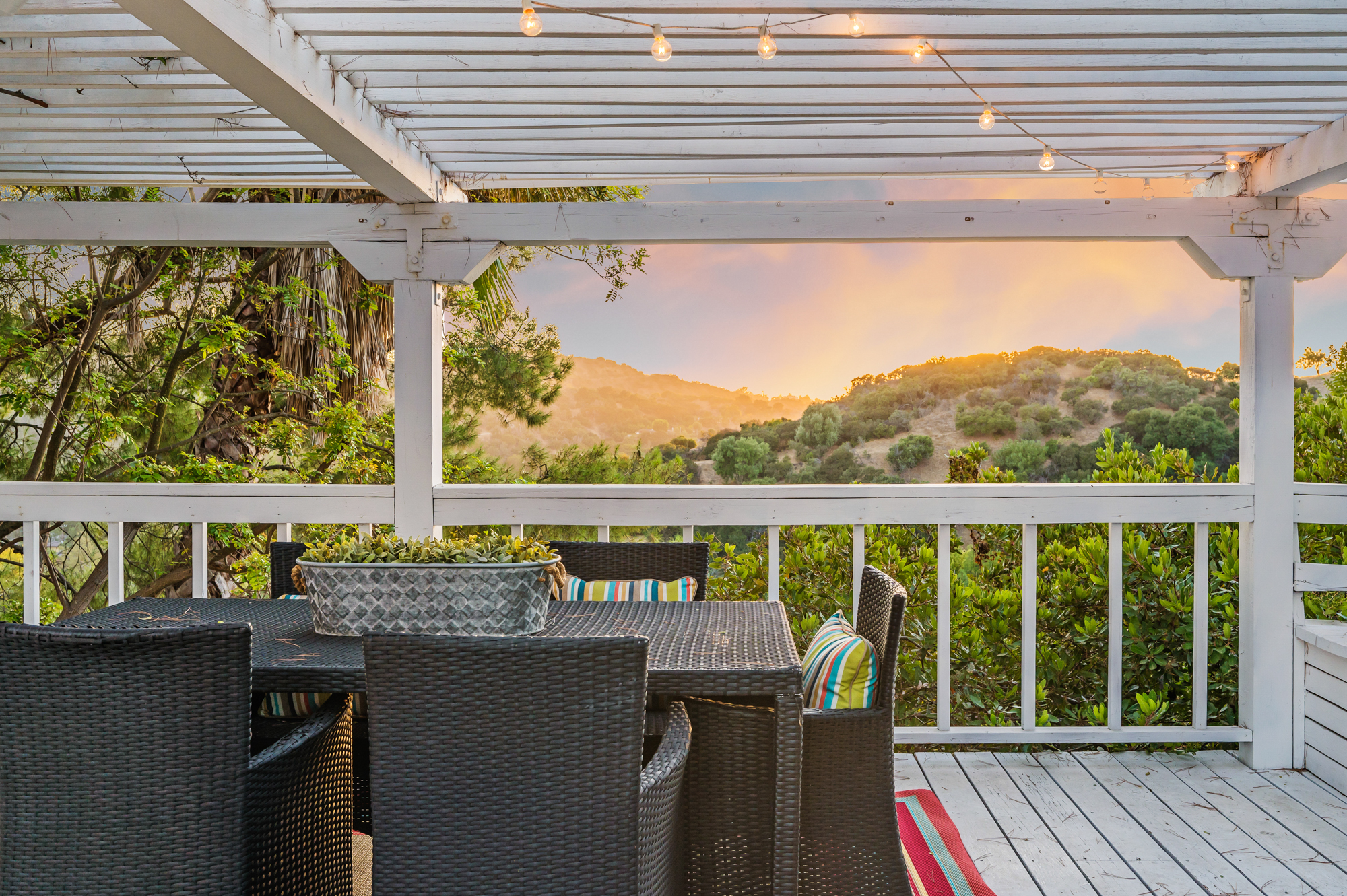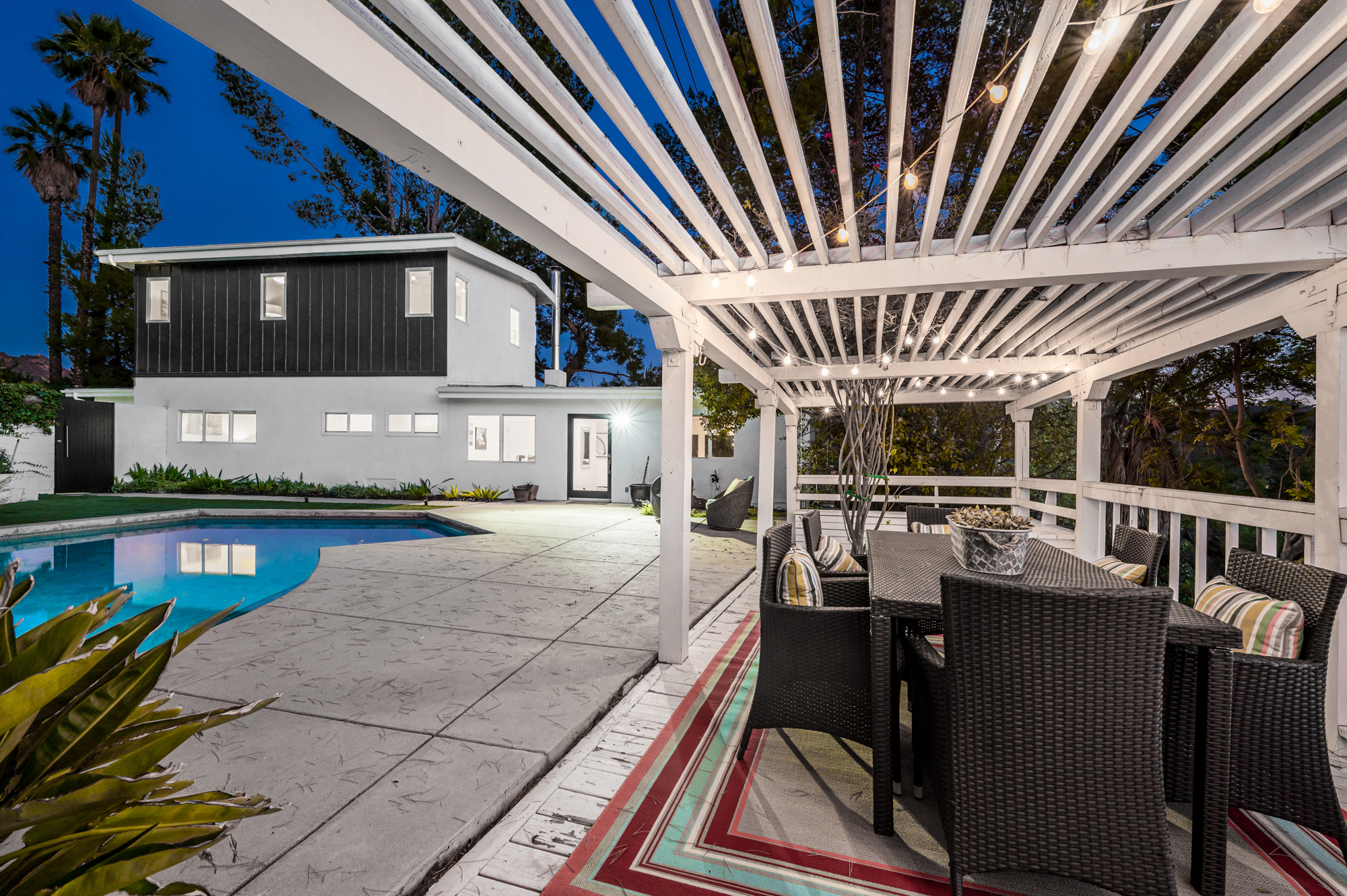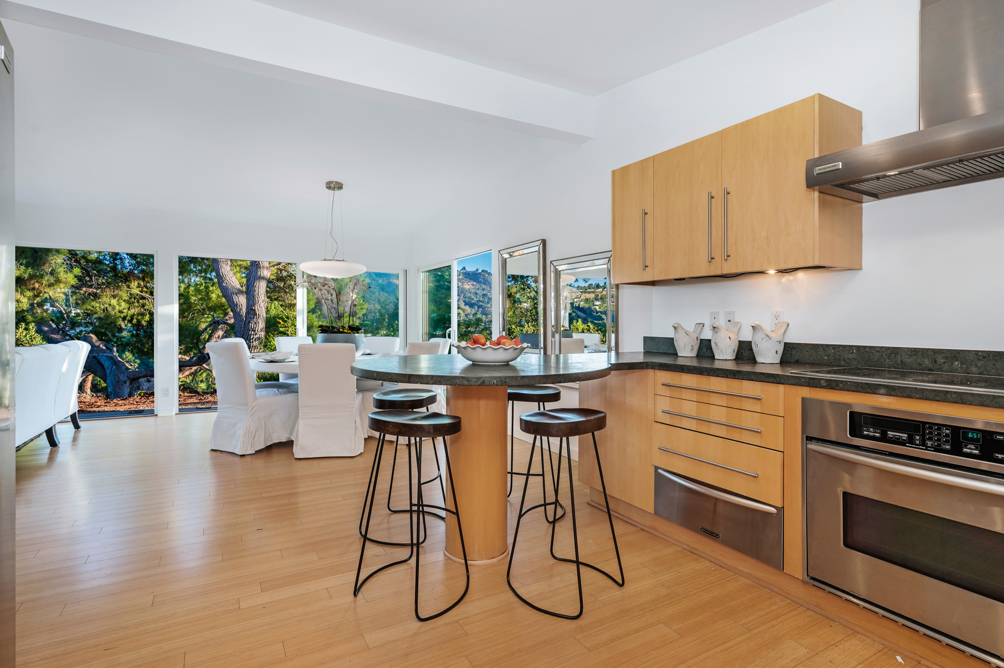 Perched at the end of a quiet cul-de-sac and surrounded by mature trees in the Carpenter School District is this captivating modern view home in the hills of Studio City. Through the front gate, you are met with stunning mountain views, a sparkling pool, and a charming vine-covered pergola. The home’s architecture and many windows perfectly complement the outdoors, infusing the interior with an abundance of natural light. The first floor’s open concept layout has high ceilings and seamlessly connects the updated kitchen, dining room, and living room with walls of sliding glass doors that offer more tranquil views of the surrounding hills. The first floor also offers three bedrooms and an office. Upstairs the spacious master bedroom features a beautifully updated master bath with natural limestone surfaces. The additional upstairs bedroom is ideal as a kid’s bedroom, studio, or 2nd office. Moments from Fryman Canyon hiking trails and conveniently located to the West Side.