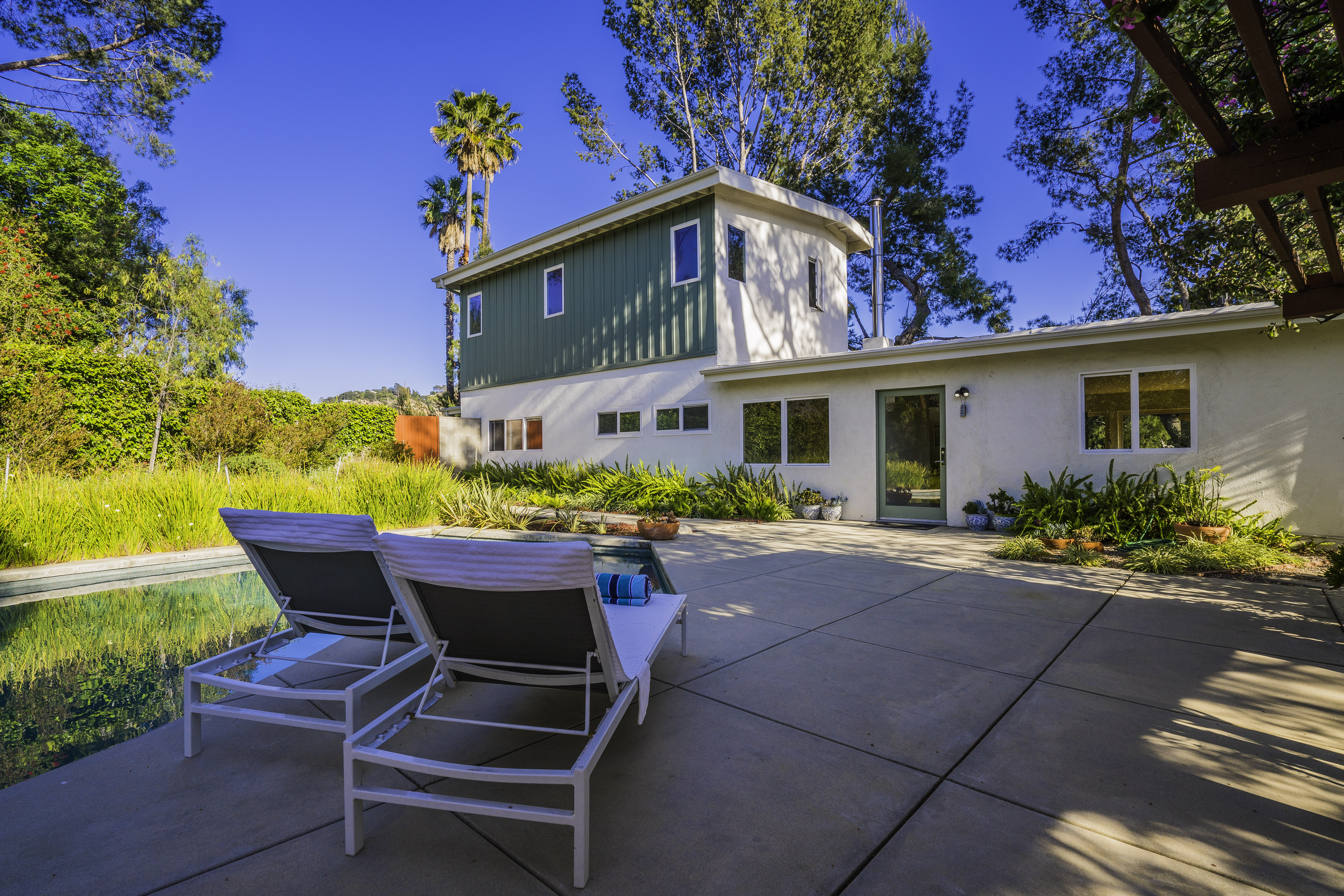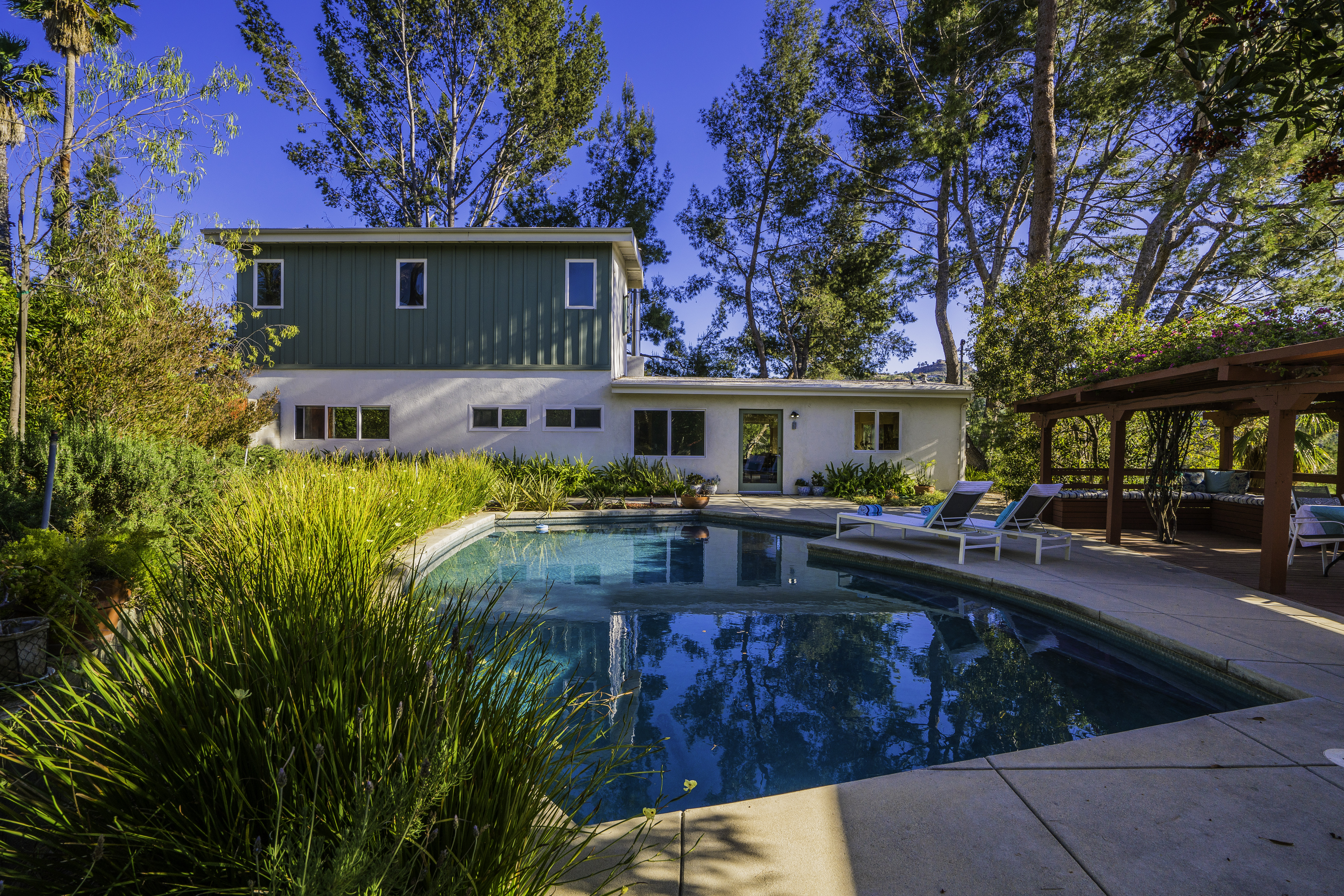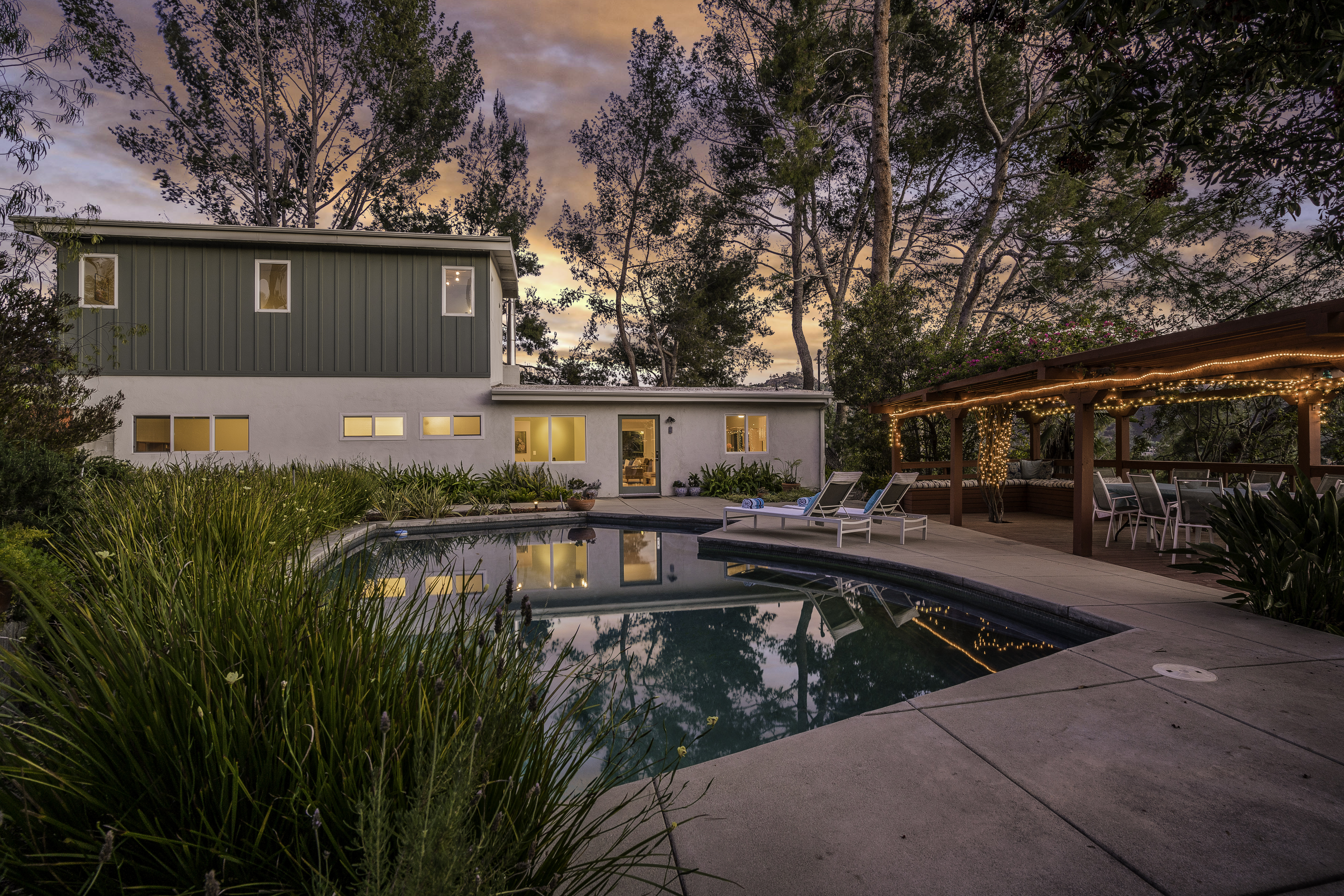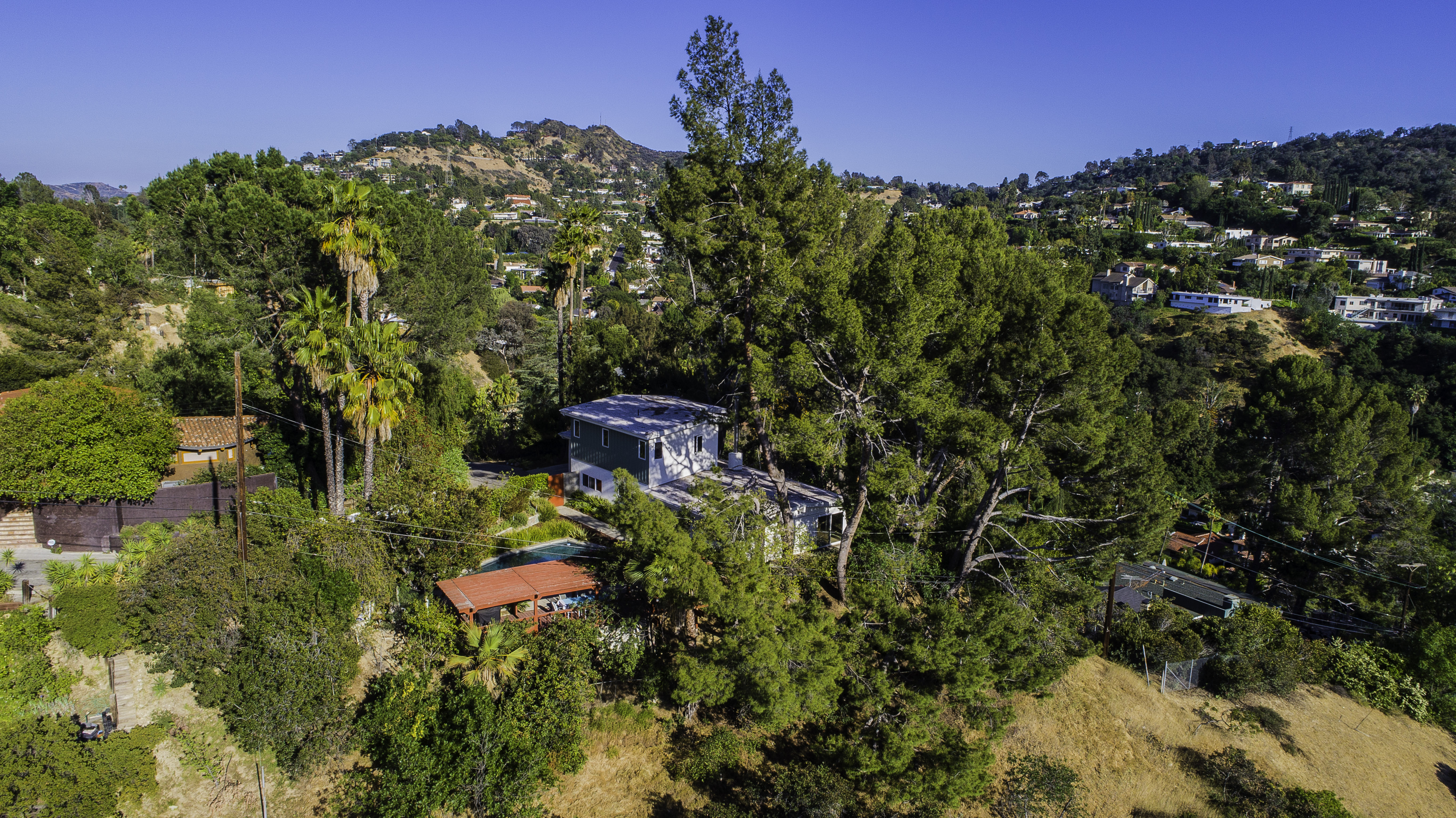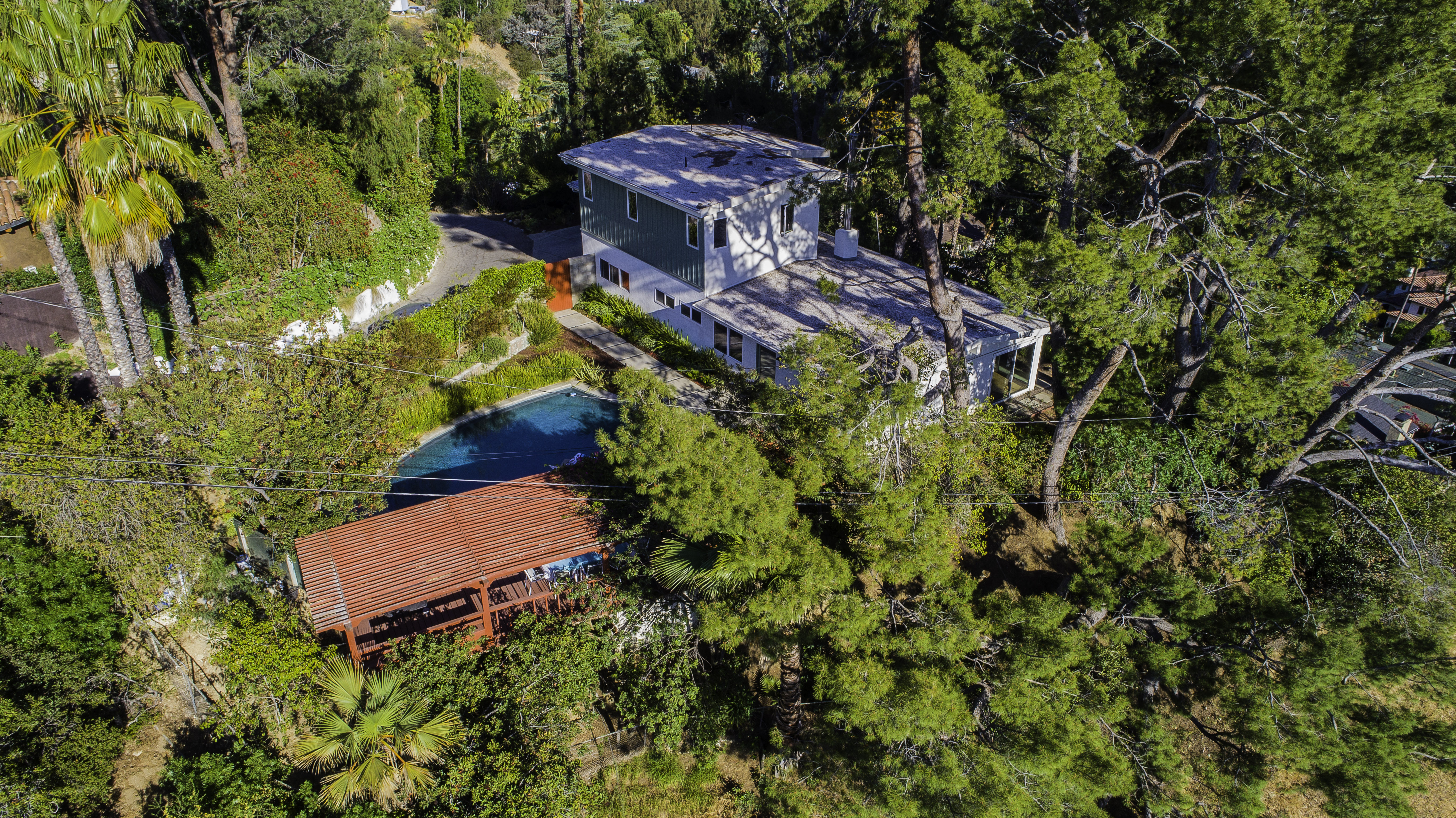 Nestled among the trees, off a serene cul-de-sac, this stunning modern-view home sits in the forest-like hills of Studio City. As you enter the property through the privacy gate, you are greeted by the sparkling pool, designer landscaping, spacious covered patio, and spectacular mountain views. The home's architecture perfectly compliments the outdoors, infusing the interior with an abundance of natural light which highlights the home's sleek styling. The first floor offers high ceilings and open-concept living, seamlessly connecting the updated kitchen, dining room, and living room with walls of sliding glass doors that offer stunning views of the surrounding hills and allow in the cooling, fresh mountain breeze in the afternoon. Downstairs are three bedrooms and an office. Upstairs, the spacious master bedroom features a beautifully updated master bath with natural limestone surfaces. The additional bedroom upstairs is perfect for a child's bedroom, guest room, studio, or office space. The liberal use of glass throughout the home ensures 360-degree views of the entire area. Located in the highly desired Carpenter Avenue School District, and only moments away from all of the Studio City "hot spots," Fryman Canyon hiking trails and the Westside. This unique property won't last long.