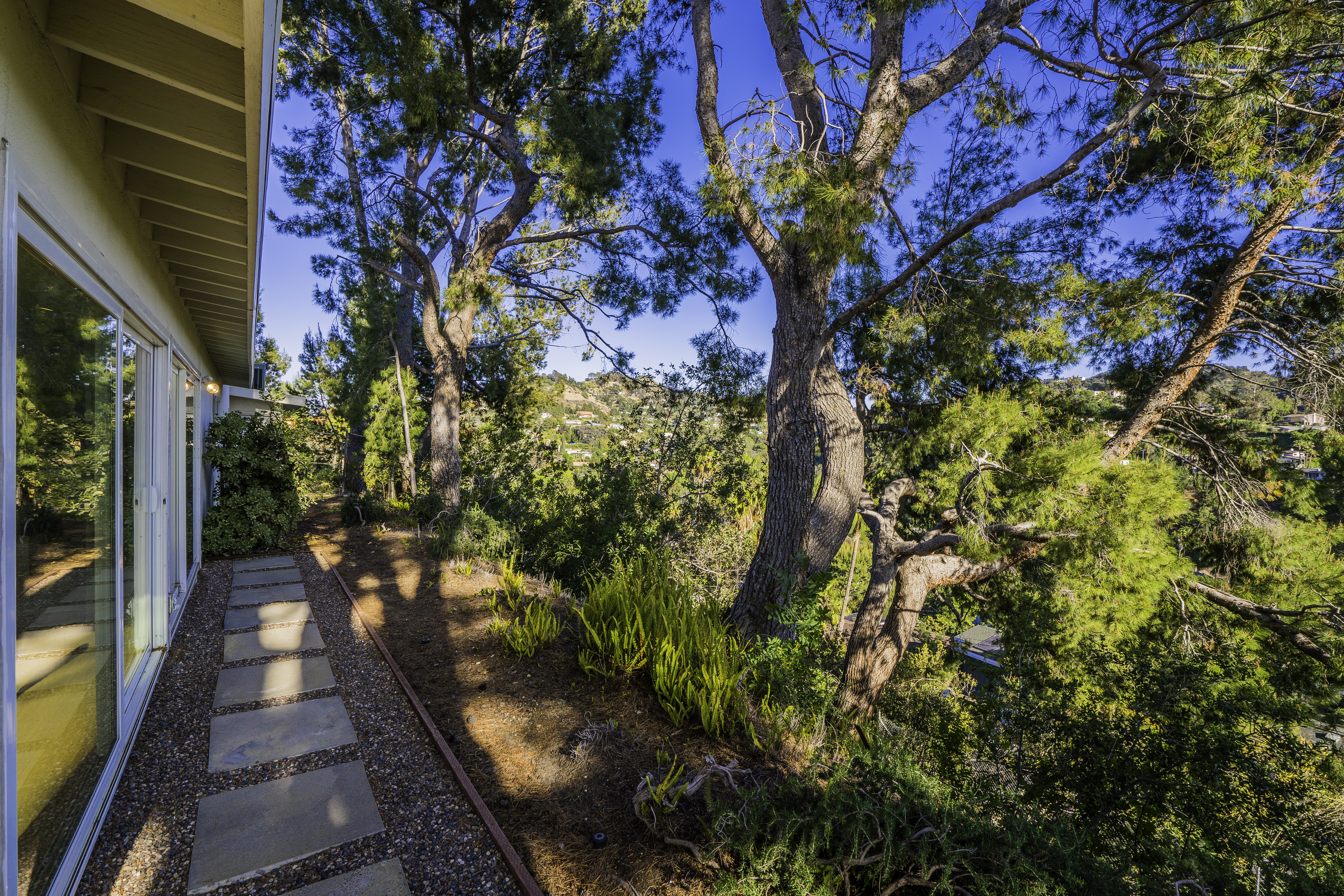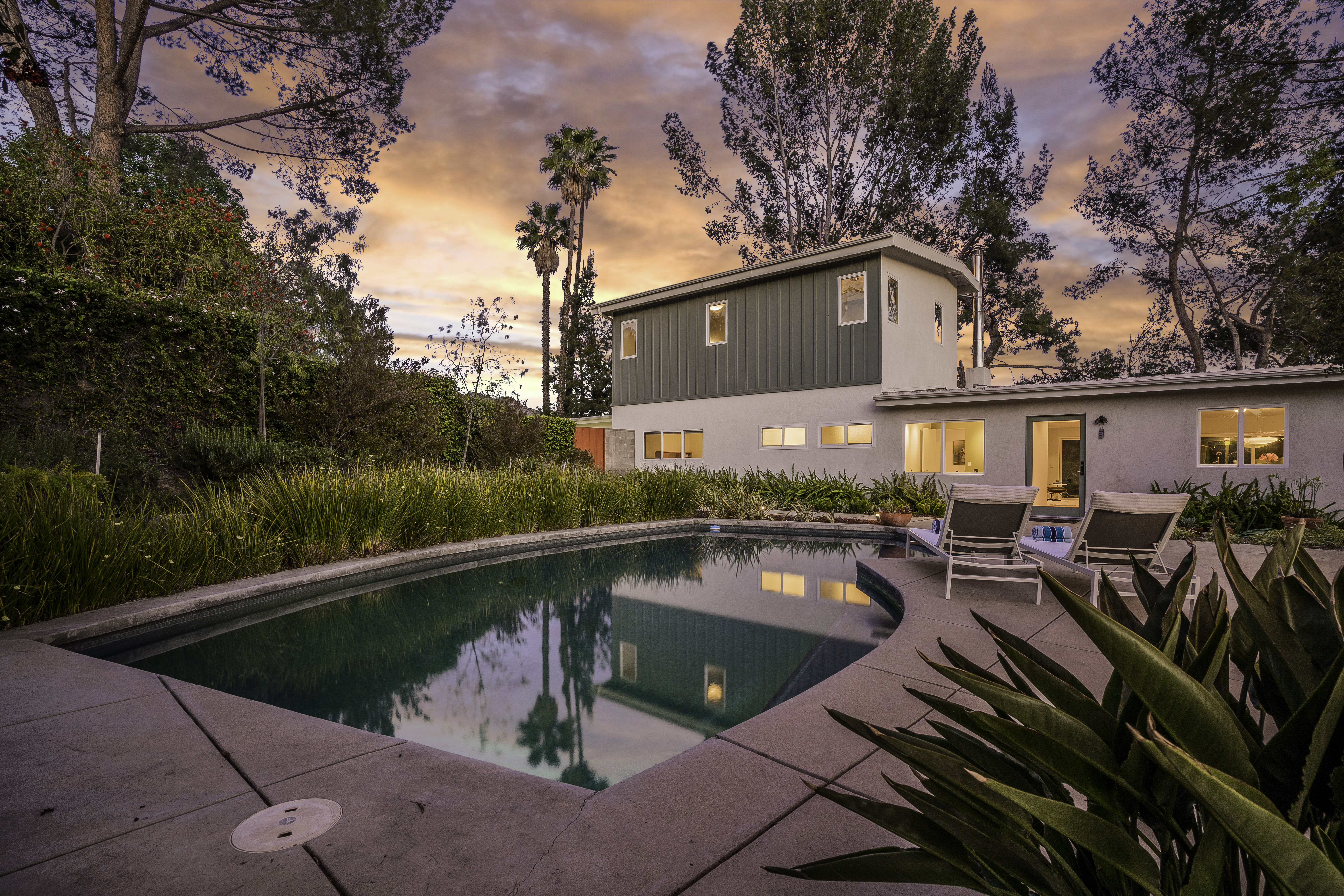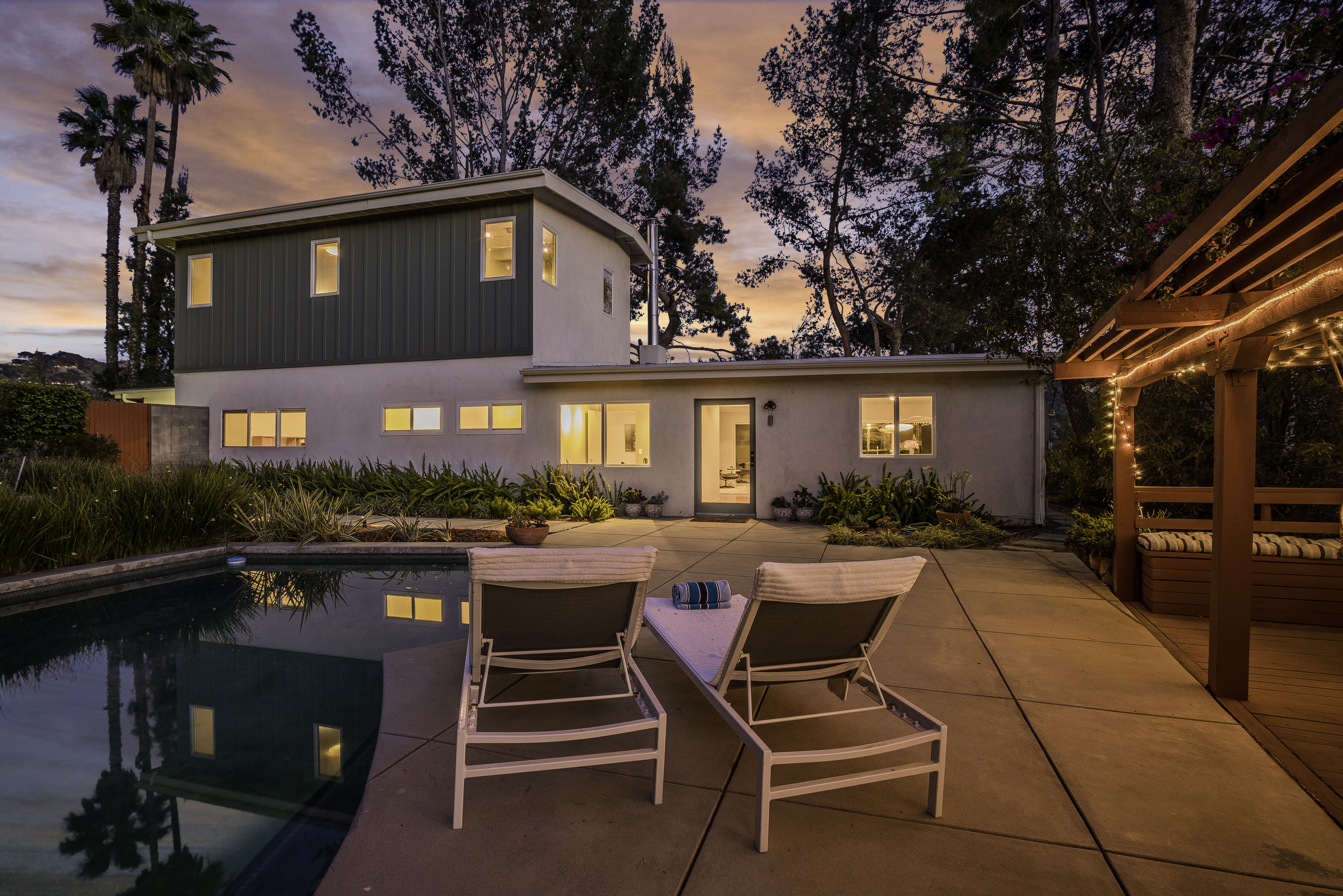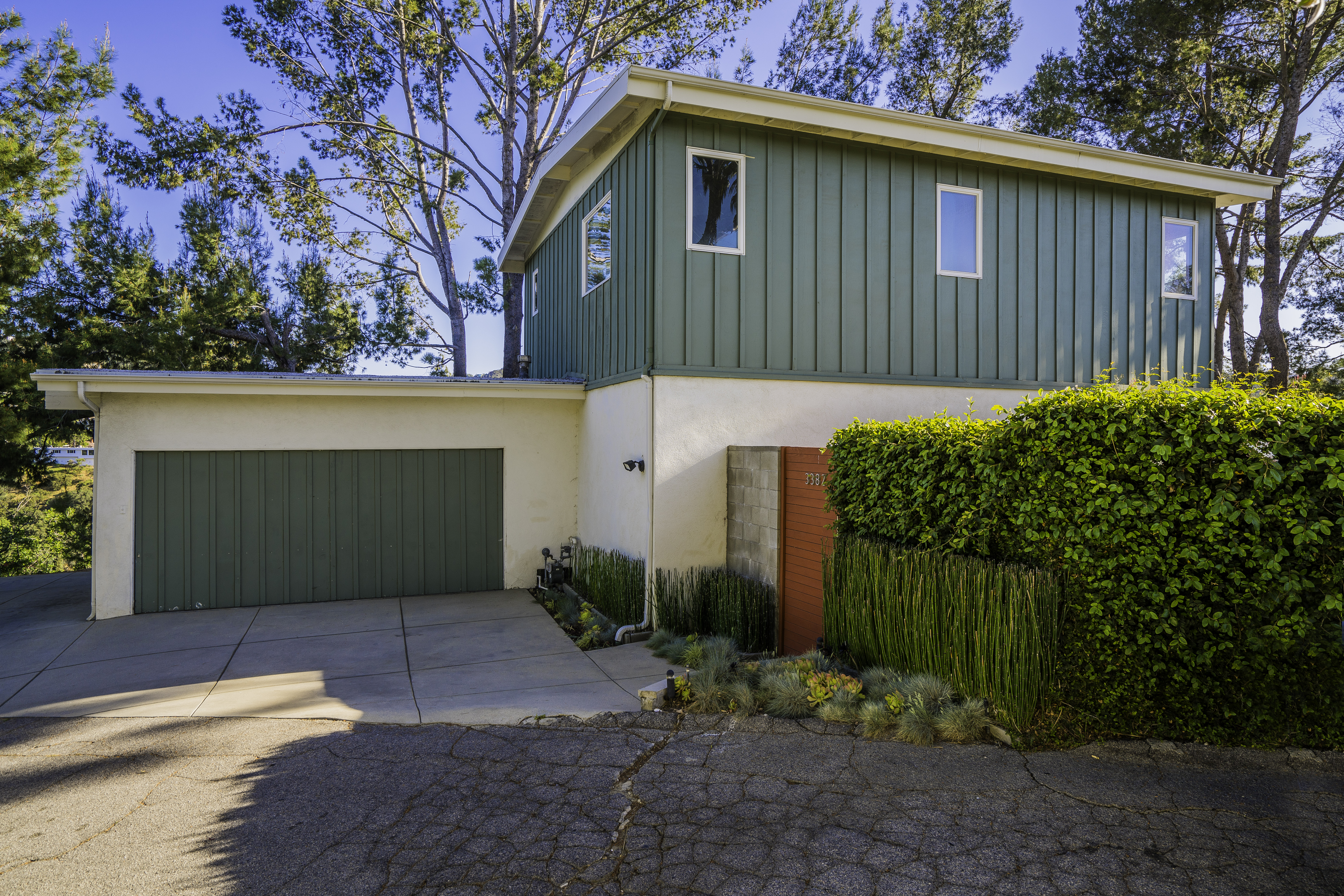 Nestled among the trees, off a serene cul-de-sac, this stunning modern-view home sits in the forest-like hills of Studio City. As you enter the property through the privacy gate, you are greeted by the sparkling pool, designer landscaping, spacious covered patio, and spectacular mountain views. The home's architecture perfectly compliments the outdoors, infusing the interior with an abundance of natural light which highlights the home's sleek styling. The first floor offers high ceilings and open-concept living, seamlessly connecting the updated kitchen, dining room, and living room with walls of sliding glass doors that offer stunning views of the surrounding hills and allow in the cooling, fresh mountain breeze in the afternoon. Downstairs are three bedrooms and an office. Upstairs, the spacious master bedroom features a beautifully updated master bath with natural limestone surfaces. The additional bedroom upstairs is perfect for a child's bedroom, guest room, studio, or office space. The liberal use of glass throughout the home ensures 360-degree views of the entire area. Located in the highly desired Carpenter Avenue School District, and only moments away from all of the Studio City "hot spots," Fryman Canyon hiking trails and the Westside. This unique property won't last long.