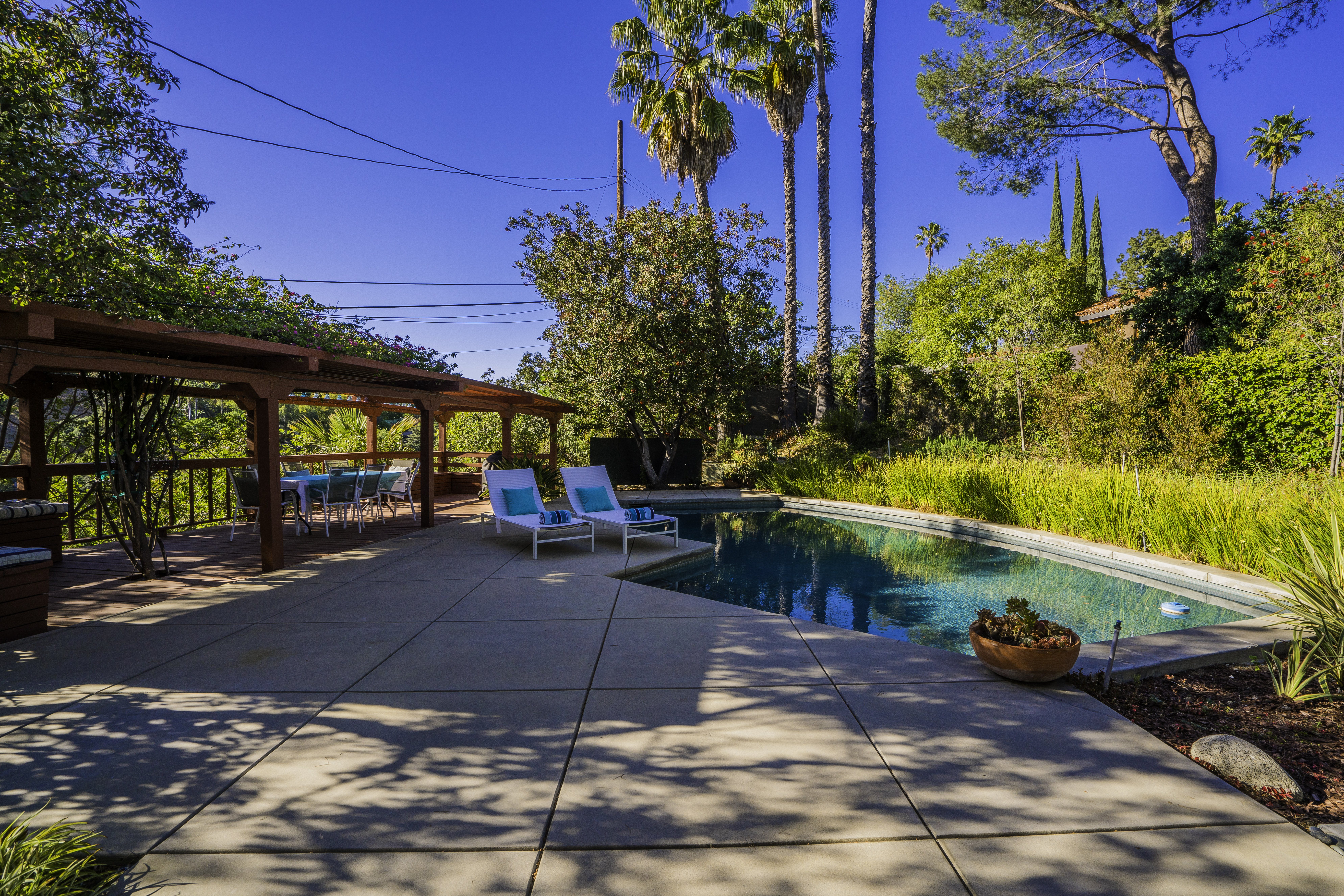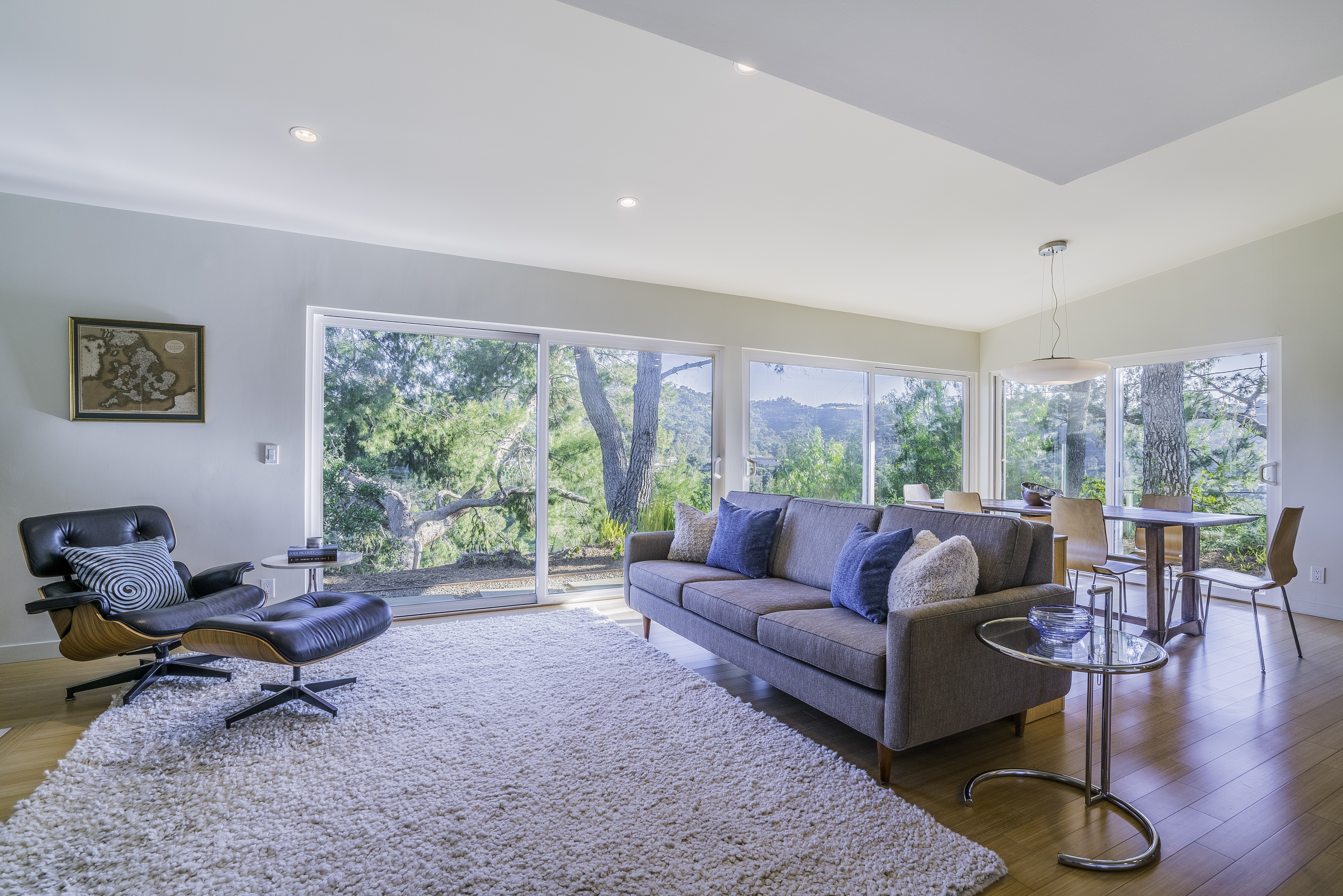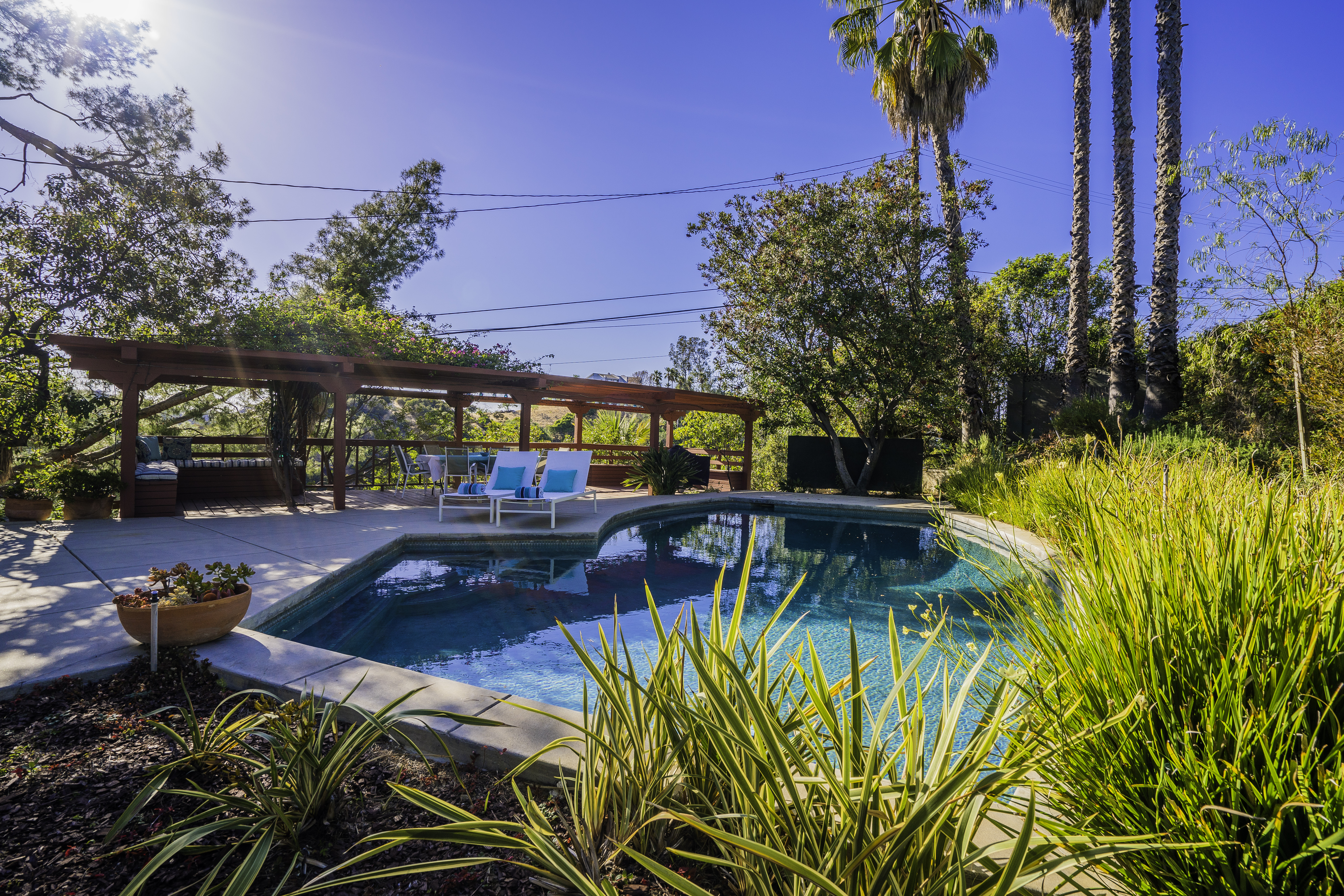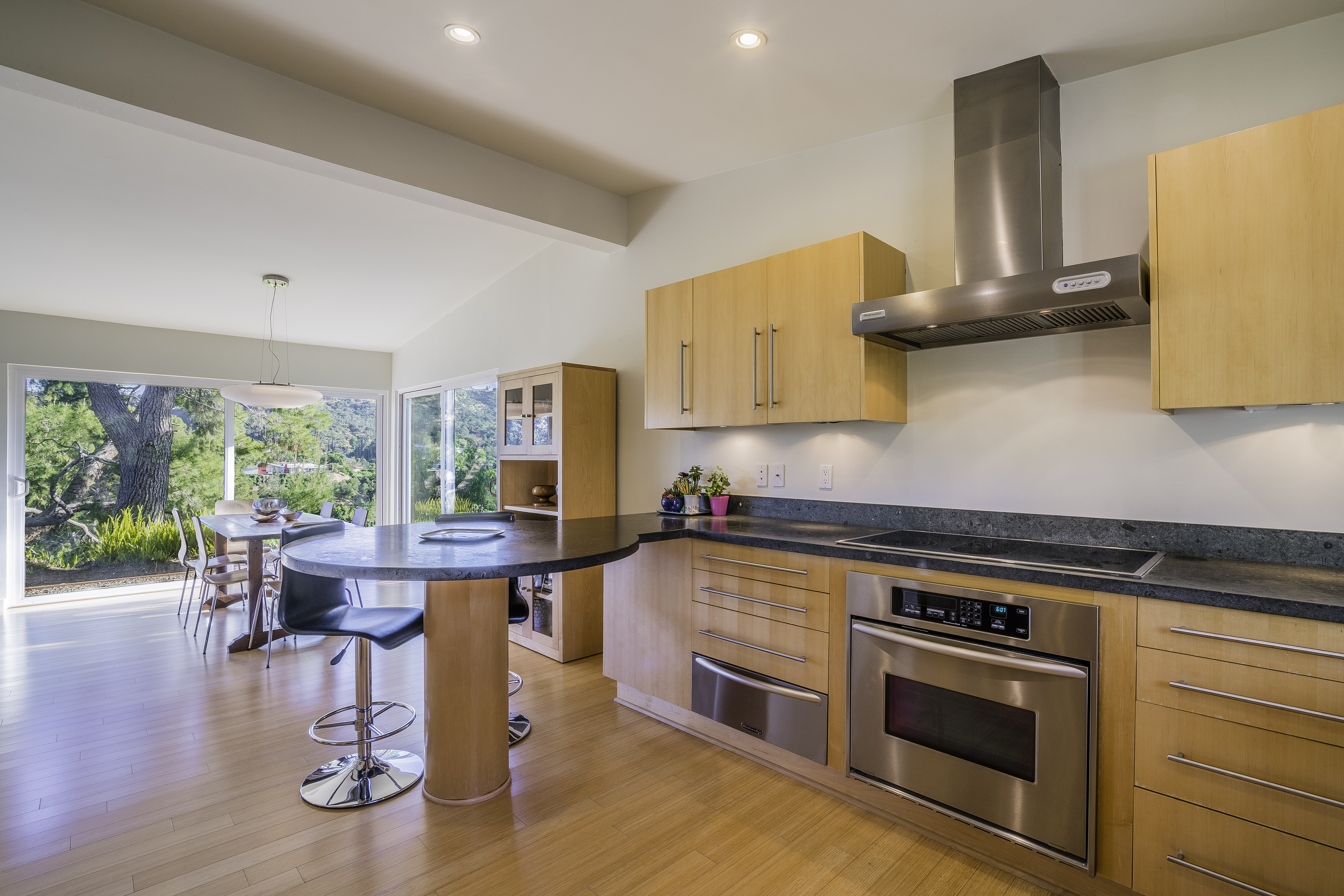 Nestled among the trees, off a serene cul-de-sac, this stunning modern-view home sits in the forest-like hills of Studio City. As you enter the property through the privacy gate, you are greeted by the sparkling pool, designer landscaping, spacious covered patio, and spectacular mountain views. The home's architecture perfectly compliments the outdoors, infusing the interior with an abundance of natural light which highlights the home's sleek styling. The first floor offers high ceilings and open-concept living, seamlessly connecting the updated kitchen, dining room, and living room with walls of sliding glass doors that offer stunning views of the surrounding hills and allow in the cooling, fresh mountain breeze in the afternoon. Downstairs are three bedrooms and an office. Upstairs, the spacious master bedroom features a beautifully updated master bath with natural limestone surfaces. The additional bedroom upstairs is perfect for a child's bedroom, guest room, studio, or office space. The liberal use of glass throughout the home ensures 360-degree views of the entire area. Located in the highly desired Carpenter Avenue School District, and only moments away from all of the Studio City "hot spots," Fryman Canyon hiking trails and the Westside. This unique property won't last long.