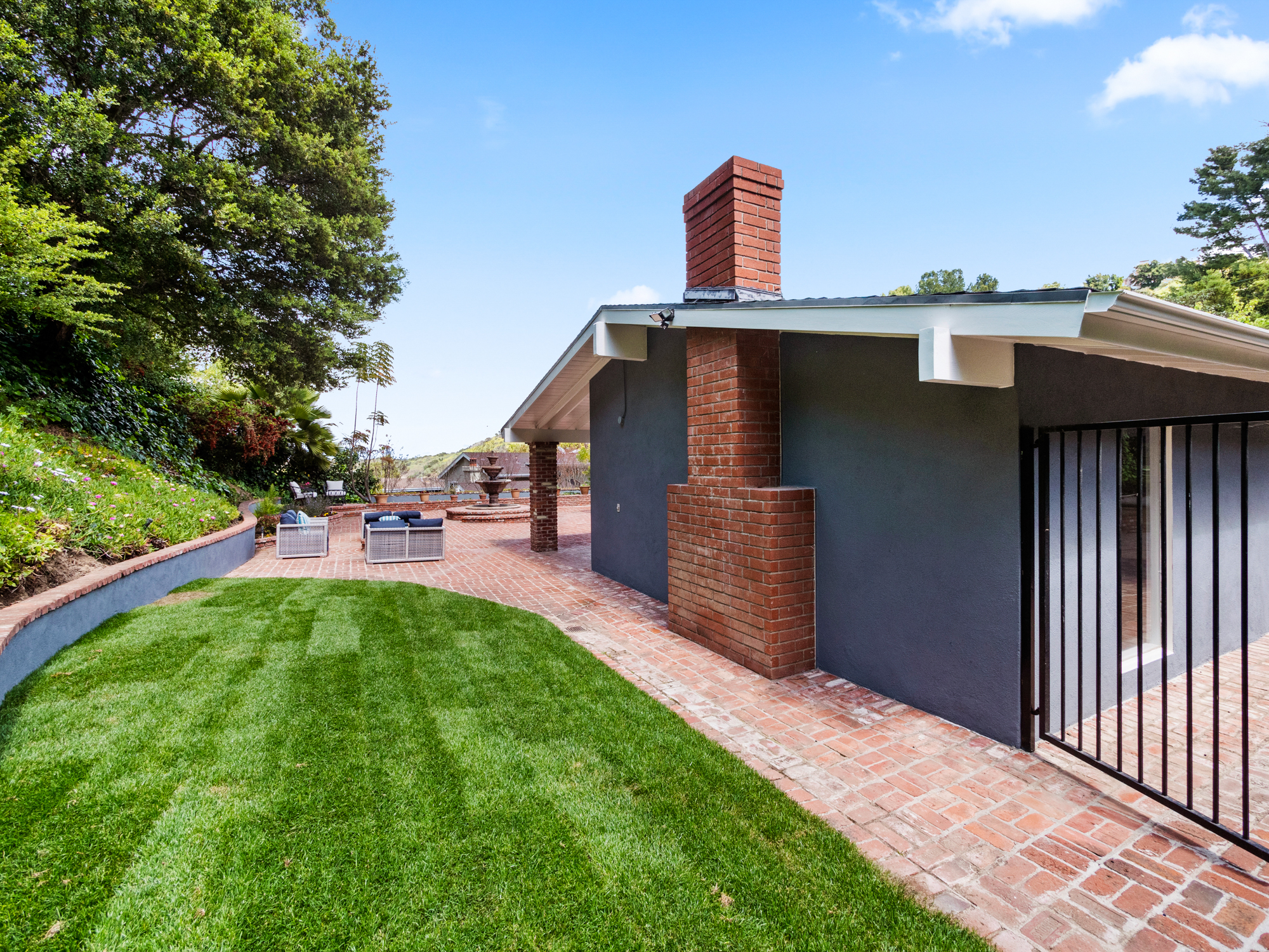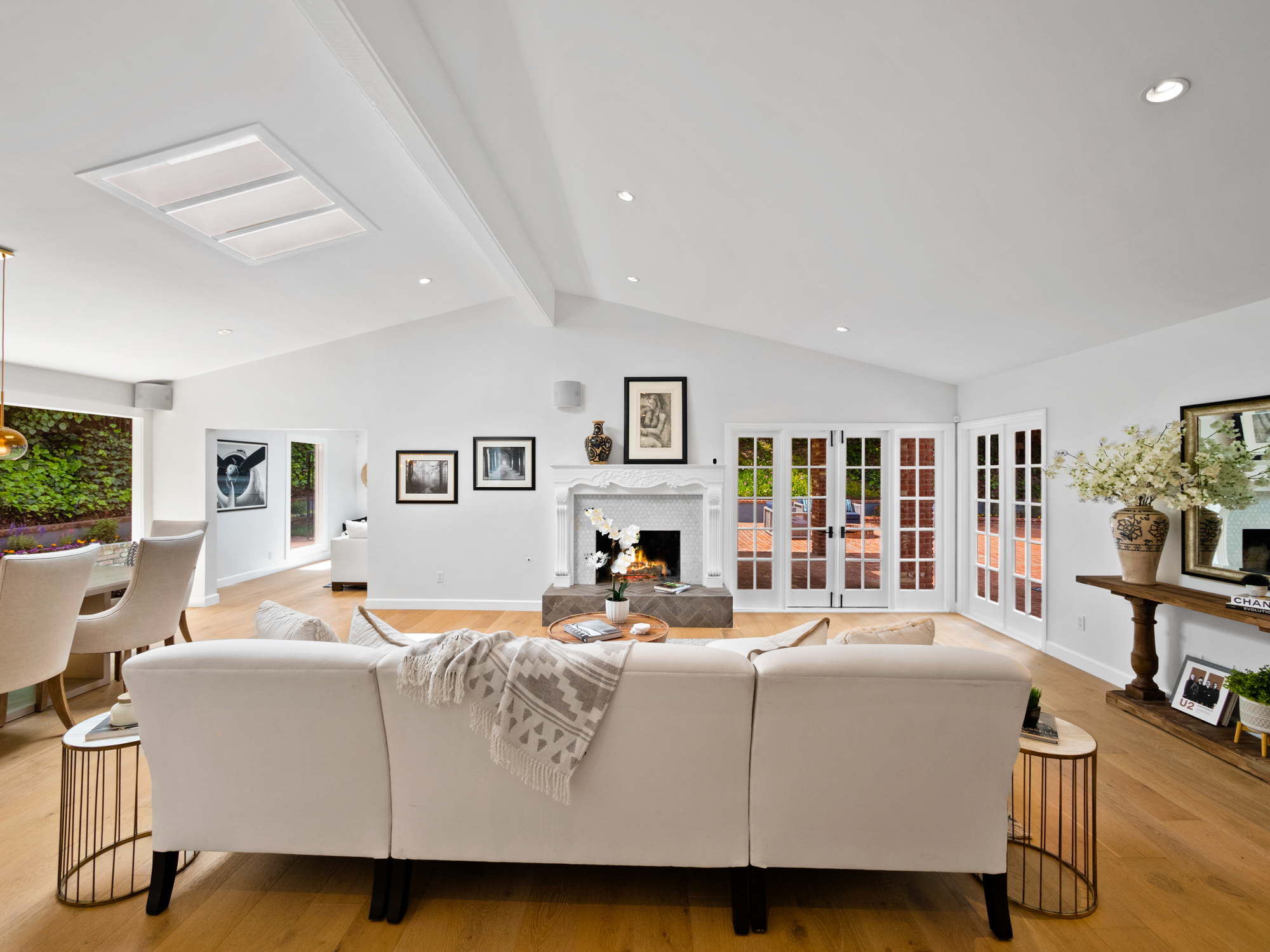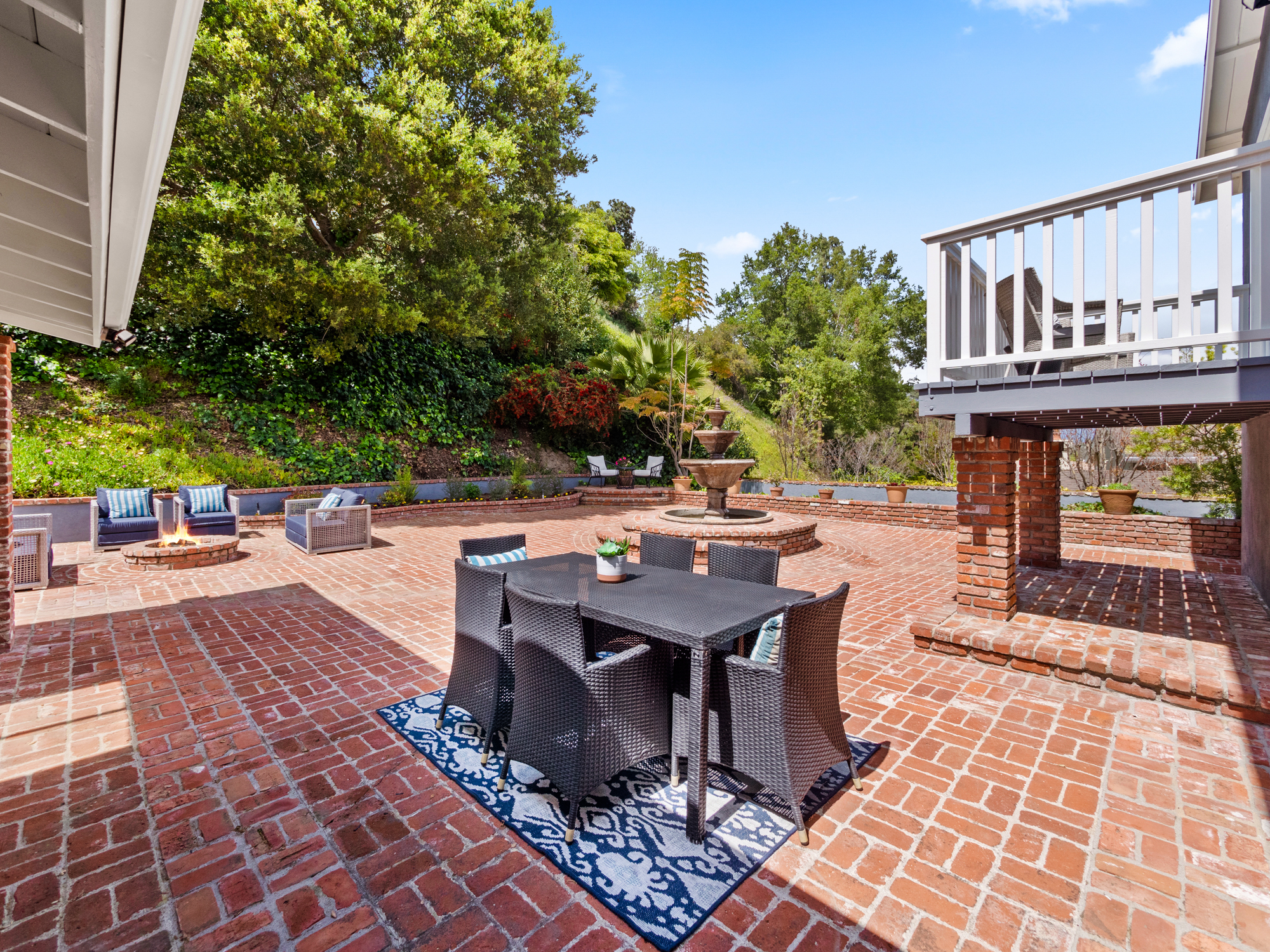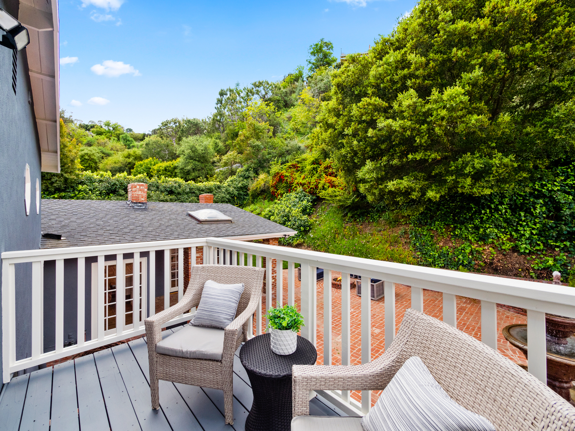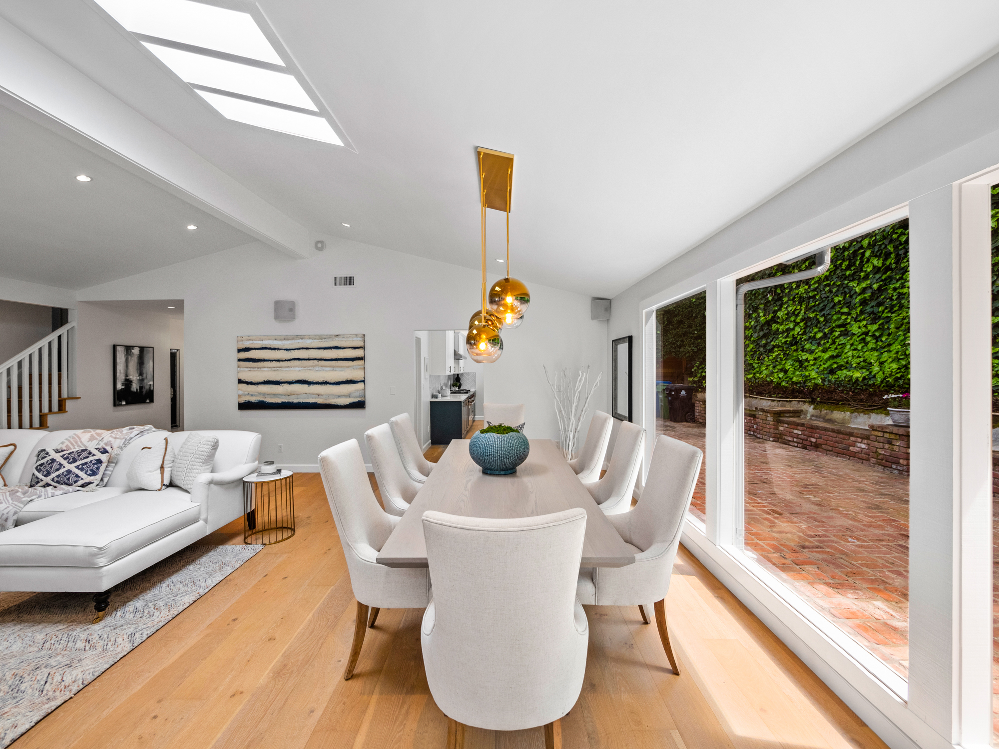 Lying on a quiet cul-de-sac in the hills of Sherman Oaks, this recently remodeled home is your refuge from the noise and traffic of LA. Upon entering, you are greeted by an expansive great room with vaulted ceilings, hardwood floors, and a beautiful tiled fireplace. The room is wired for surround sound for entertaining and can double as a home theater. The dining area is illuminated by large windows and a modern chandelier, with enough room to host large dinner parties and family meals. The chef’s kitchen features vaulted ceilings, quartz countertops, Carrara marble backsplash, top-of-the line appliances, and a breakfast nook with doors that open to a secluded patio. A large family room with high ceilings and skylights features a wood-burning fireplace and direct access to the backyard. An additional room on the first floor could be used as an office, guest room, or playroom. Upstairs, the master suite features a spacious balcony offering wonderful views of the mountains and lush backyard. Two additional upstairs bedrooms share a remodeled bath with dual sinks. The second floor also includes convenient upstairs laundry. The backyard features stunning mountain views, a bubbling fountain, multiple seating areas, and grass for kids and pets alike. Wine lovers will appreciate the climate controlled wine cellar in the garage. Conveniently located for easy Westside access, and with all the amenities you could want, this home is sure to go quick!