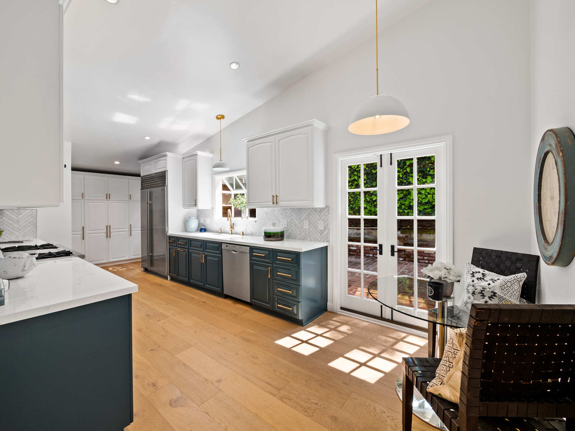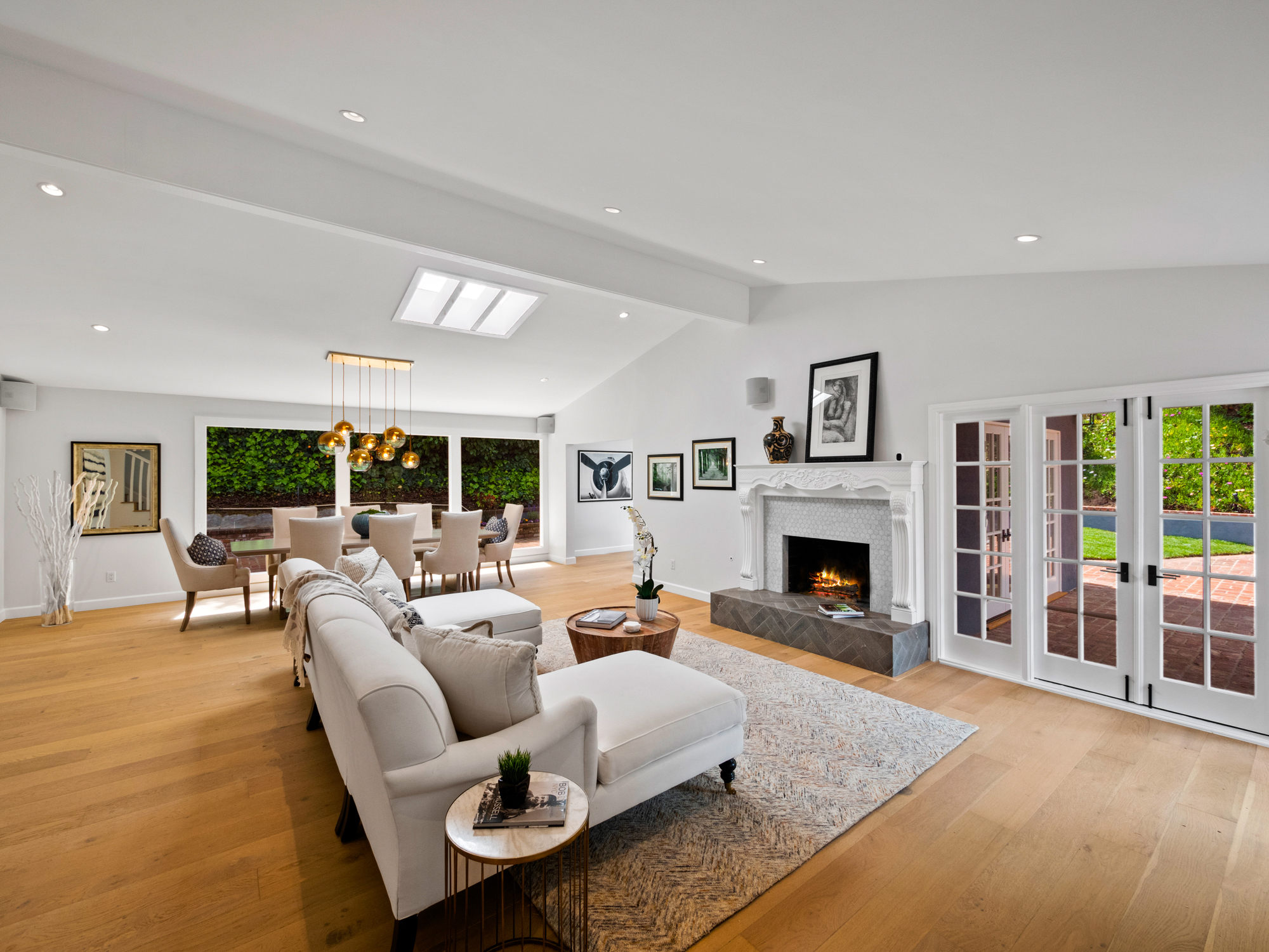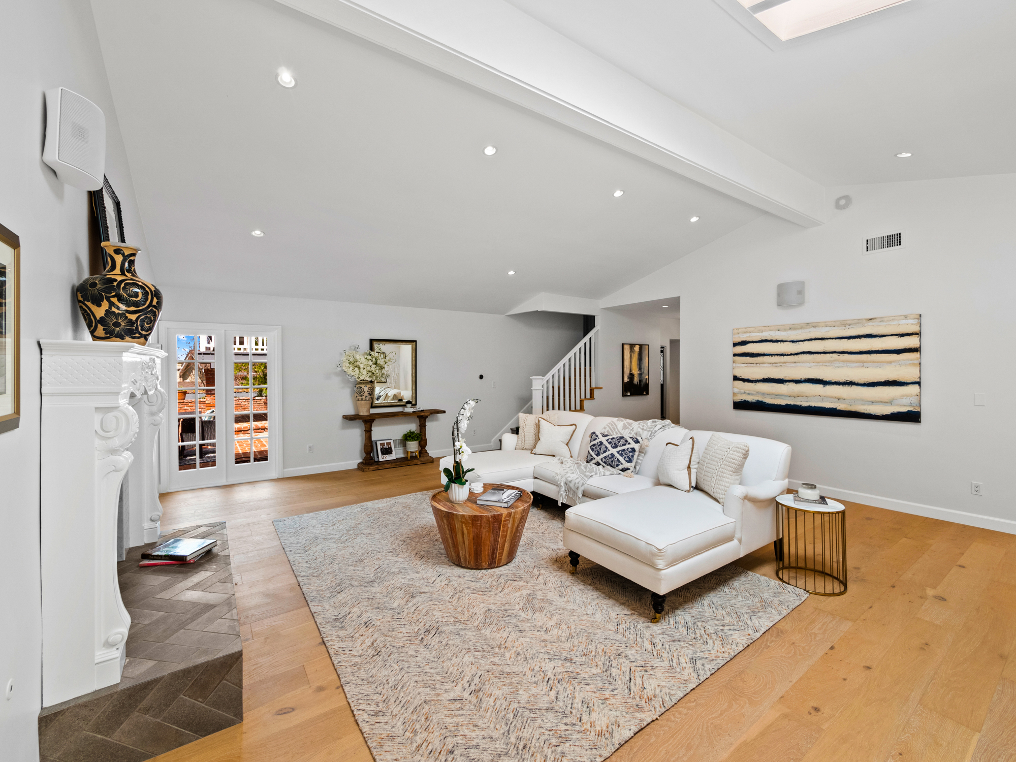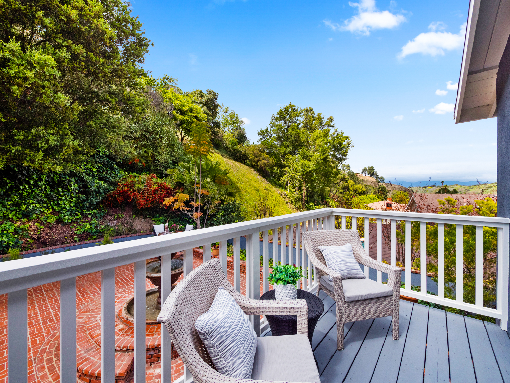 Lying on a quiet cul-de-sac in the hills of Sherman Oaks, this recently remodeled home is your refuge from the noise and traffic of LA. Upon entering, you are greeted by an expansive great room with vaulted ceilings, hardwood floors, and a beautiful tiled fireplace. The room is wired for surround sound for entertaining and can double as a home theater. The dining area is illuminated by large windows and a modern chandelier, with enough room to host large dinner parties and family meals. The chef’s kitchen features vaulted ceilings, quartz countertops, Carrara marble backsplash, top-of-the line appliances, and a breakfast nook with doors that open to a secluded patio. A large family room with high ceilings and skylights features a wood-burning fireplace and direct access to the backyard. An additional room on the first floor could be used as an office, guest room, or playroom. Upstairs, the master suite features a spacious balcony offering wonderful views of the mountains and lush backyard. Two additional upstairs bedrooms share a remodeled bath with dual sinks. The second floor also includes convenient upstairs laundry. The backyard features stunning mountain views, a bubbling fountain, multiple seating areas, and grass for kids and pets alike. Wine lovers will appreciate the climate controlled wine cellar in the garage. Conveniently located for easy Westside access, and with all the amenities you could want, this home is sure to go quick!