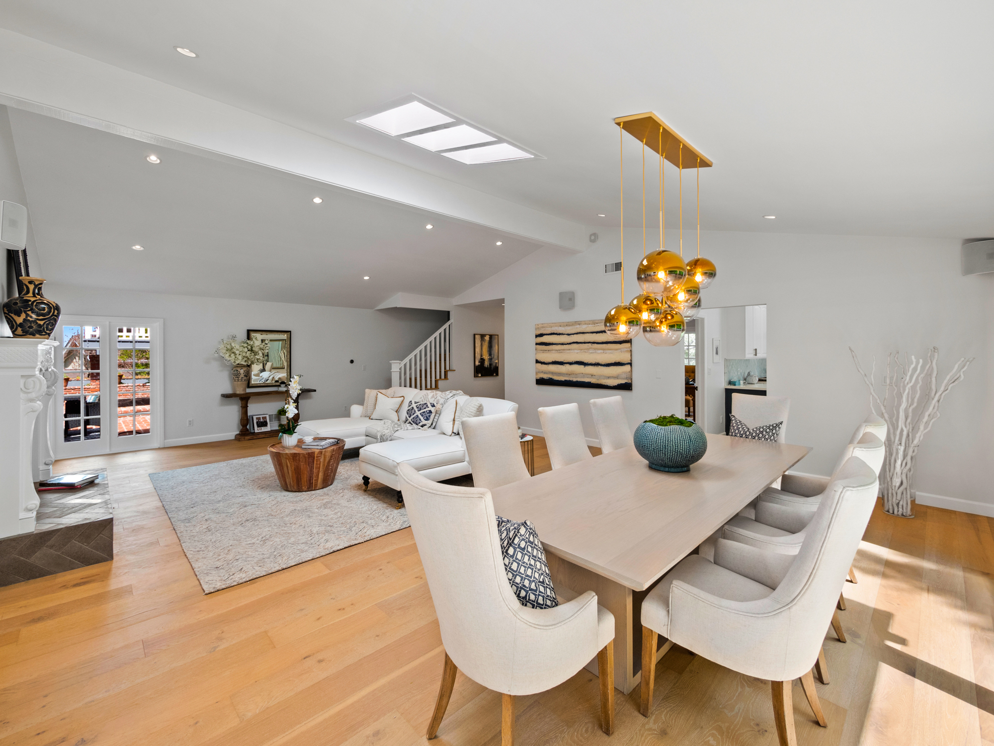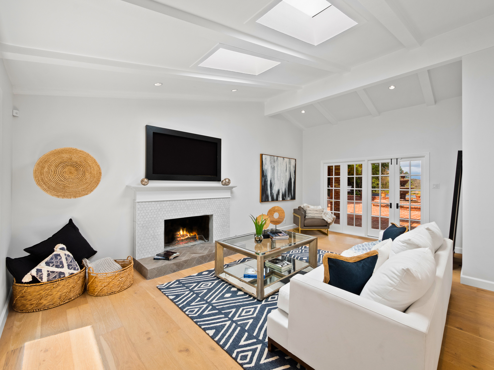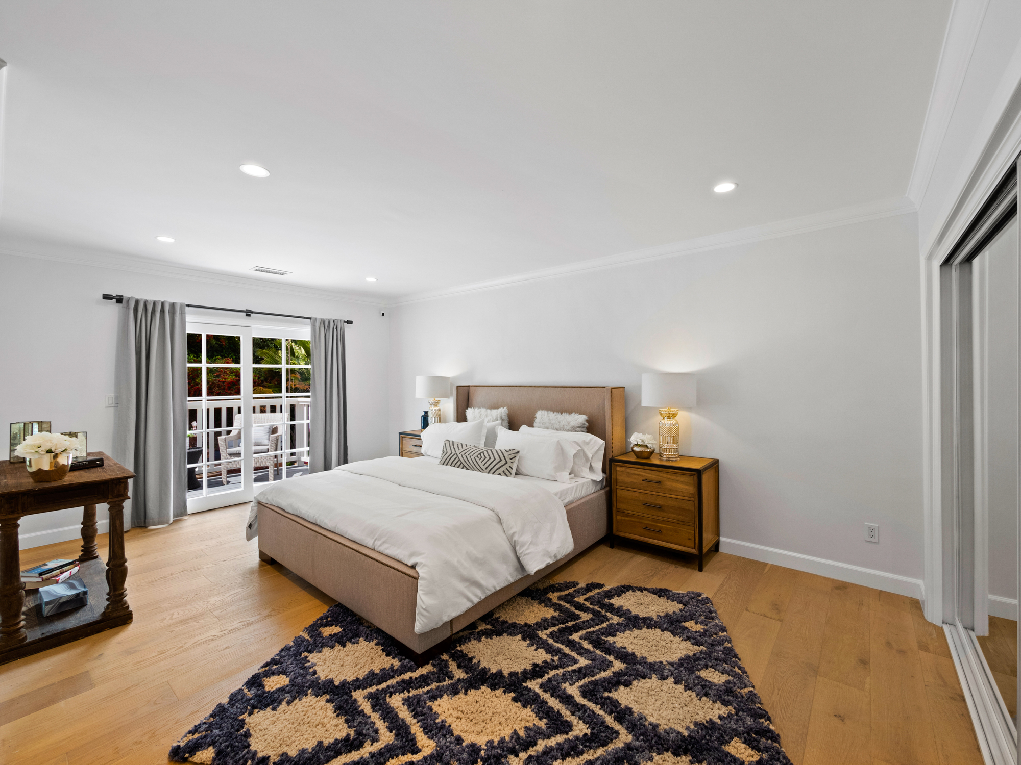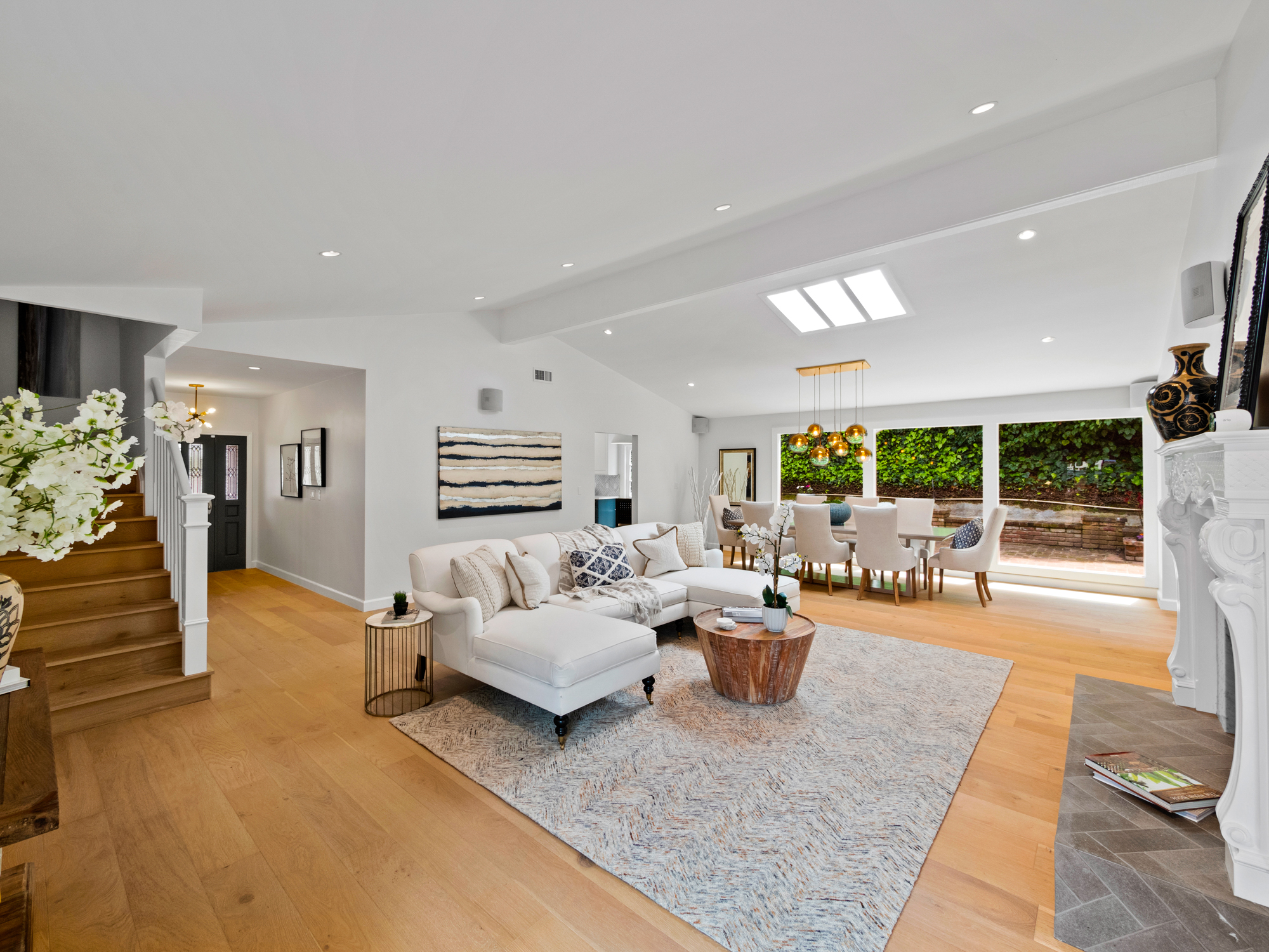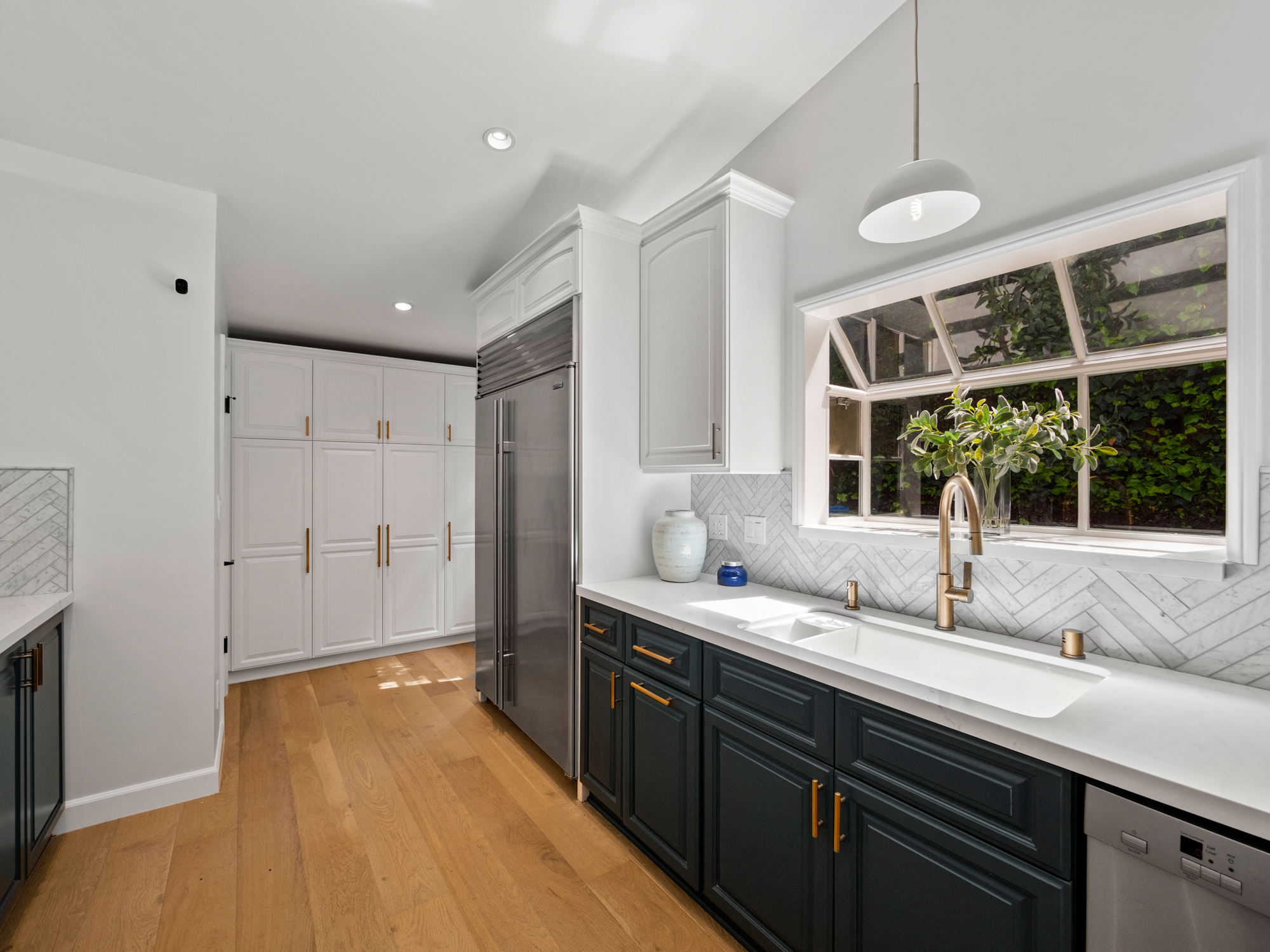 Lying on a quiet cul-de-sac in the hills of Sherman Oaks, this recently remodeled home is your refuge from the noise and traffic of LA. Upon entering, you are greeted by an expansive great room with vaulted ceilings, hardwood floors, and a beautiful tiled fireplace. The room is wired for surround sound for entertaining and can double as a home theater. The dining area is illuminated by large windows and a modern chandelier, with enough room to host large dinner parties and family meals. The chef’s kitchen features vaulted ceilings, quartz countertops, Carrara marble backsplash, top-of-the line appliances, and a breakfast nook with doors that open to a secluded patio. A large family room with high ceilings and skylights features a wood-burning fireplace and direct access to the backyard. An additional room on the first floor could be used as an office, guest room, or playroom. Upstairs, the master suite features a spacious balcony offering wonderful views of the mountains and lush backyard. Two additional upstairs bedrooms share a remodeled bath with dual sinks. The second floor also includes convenient upstairs laundry. The backyard features stunning mountain views, a bubbling fountain, multiple seating areas, and grass for kids and pets alike. Wine lovers will appreciate the climate controlled wine cellar in the garage. Conveniently located for easy Westside access, and with all the amenities you could want, this home is sure to go quick!