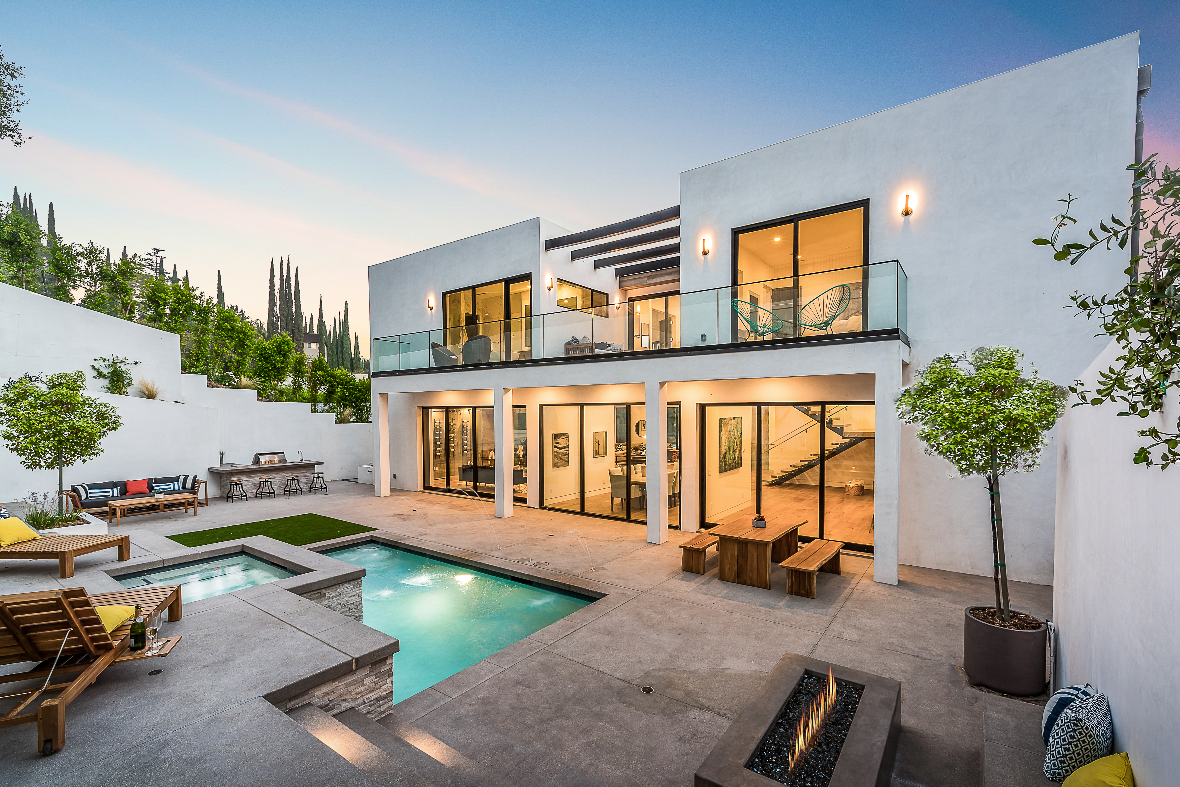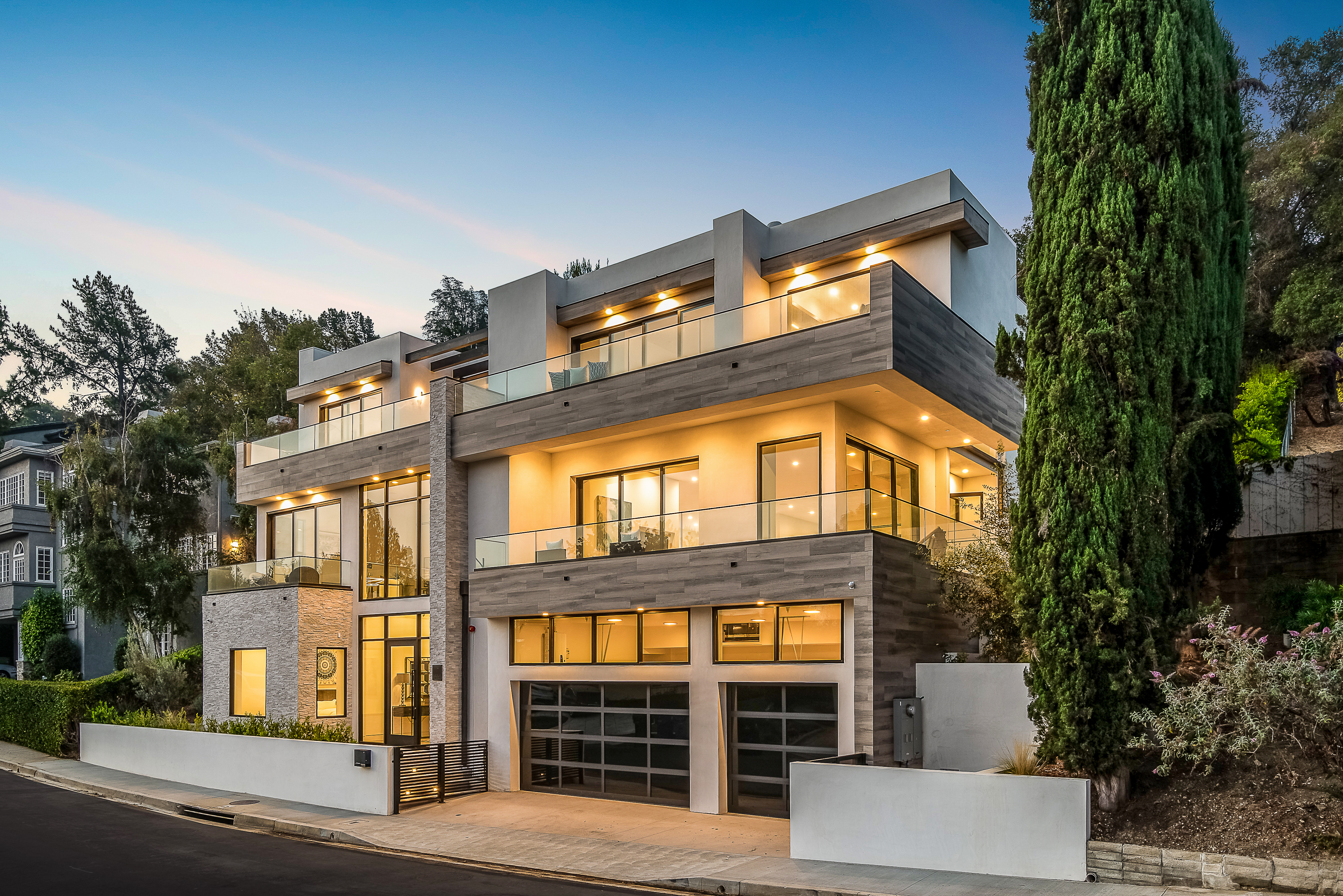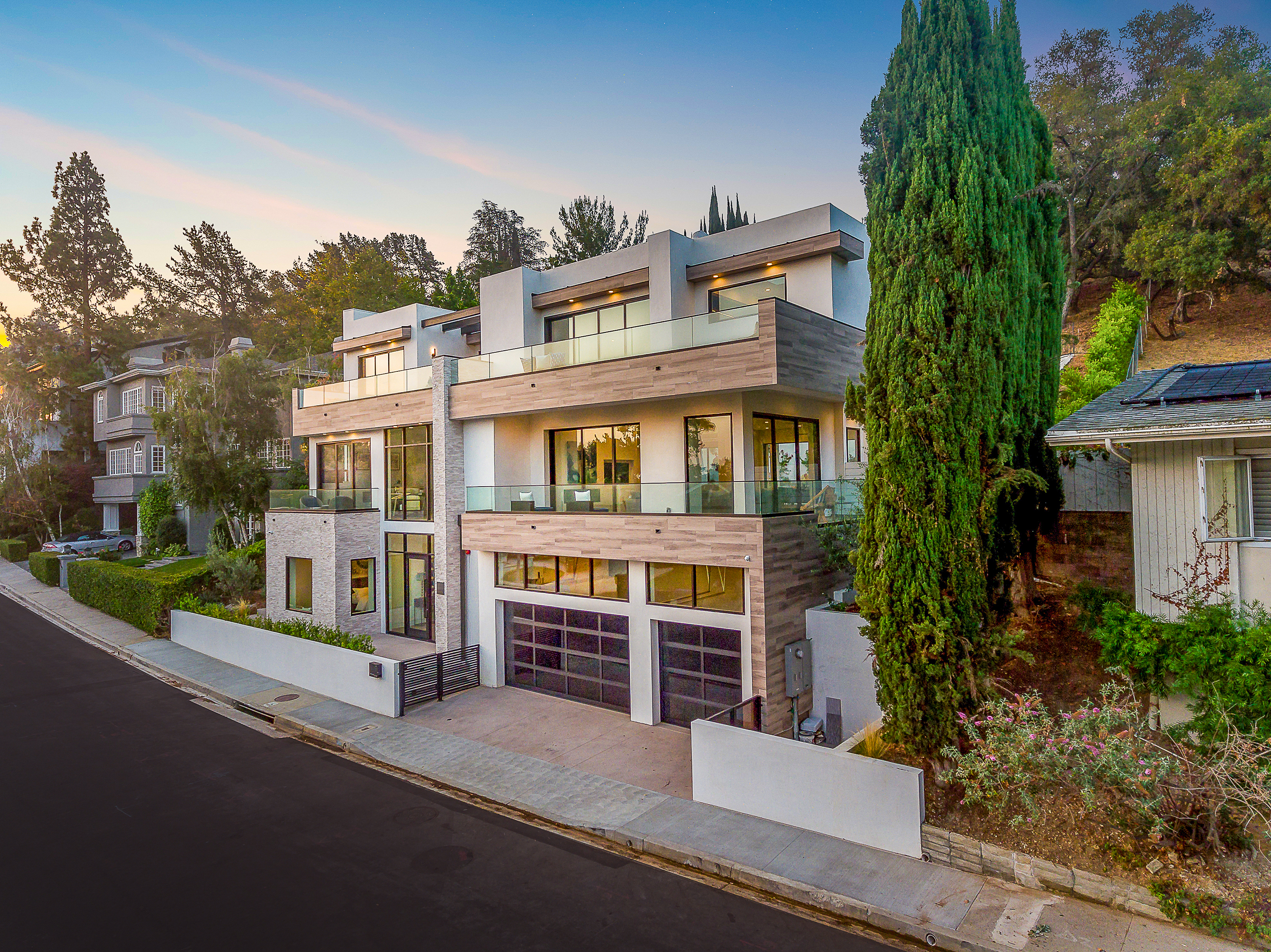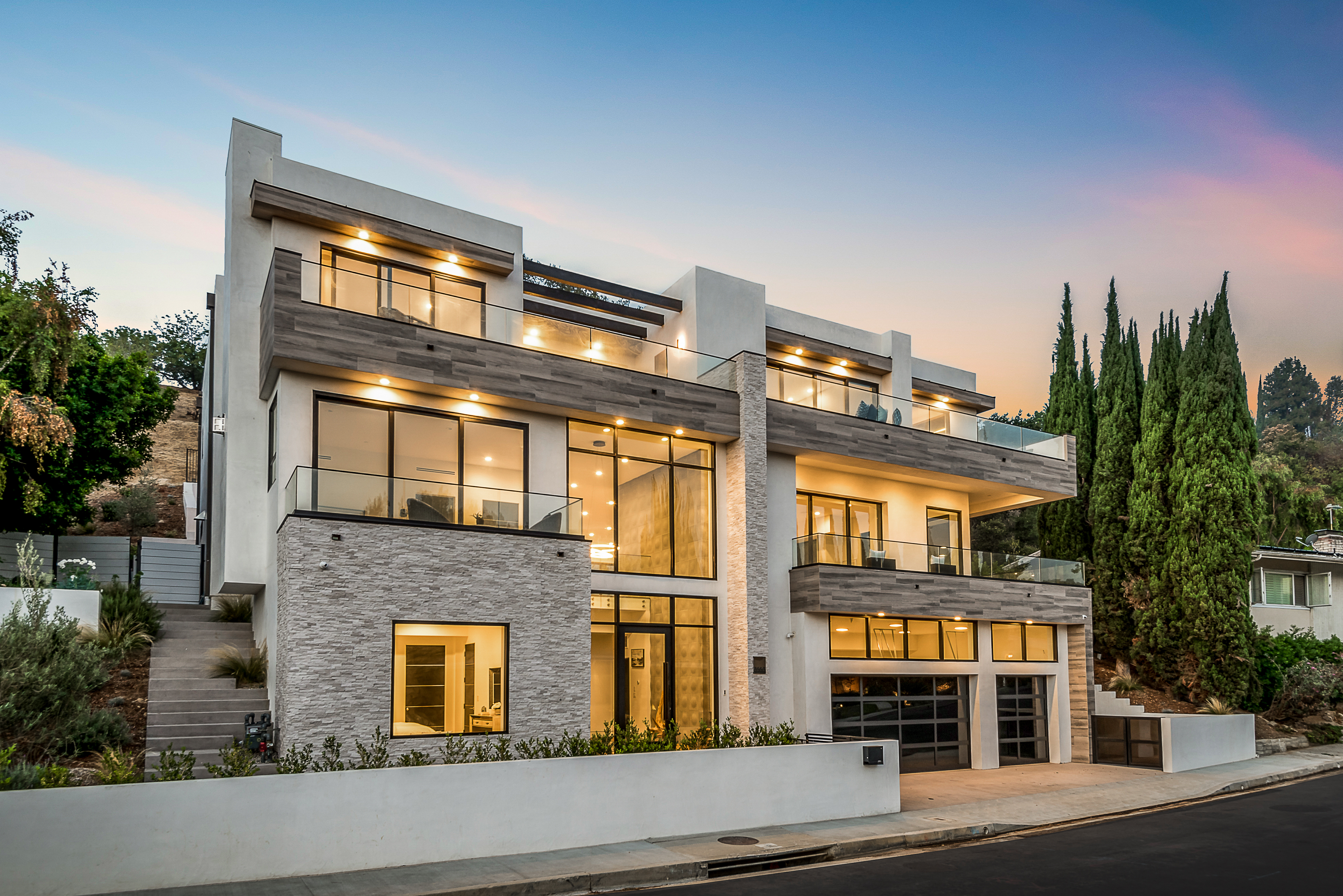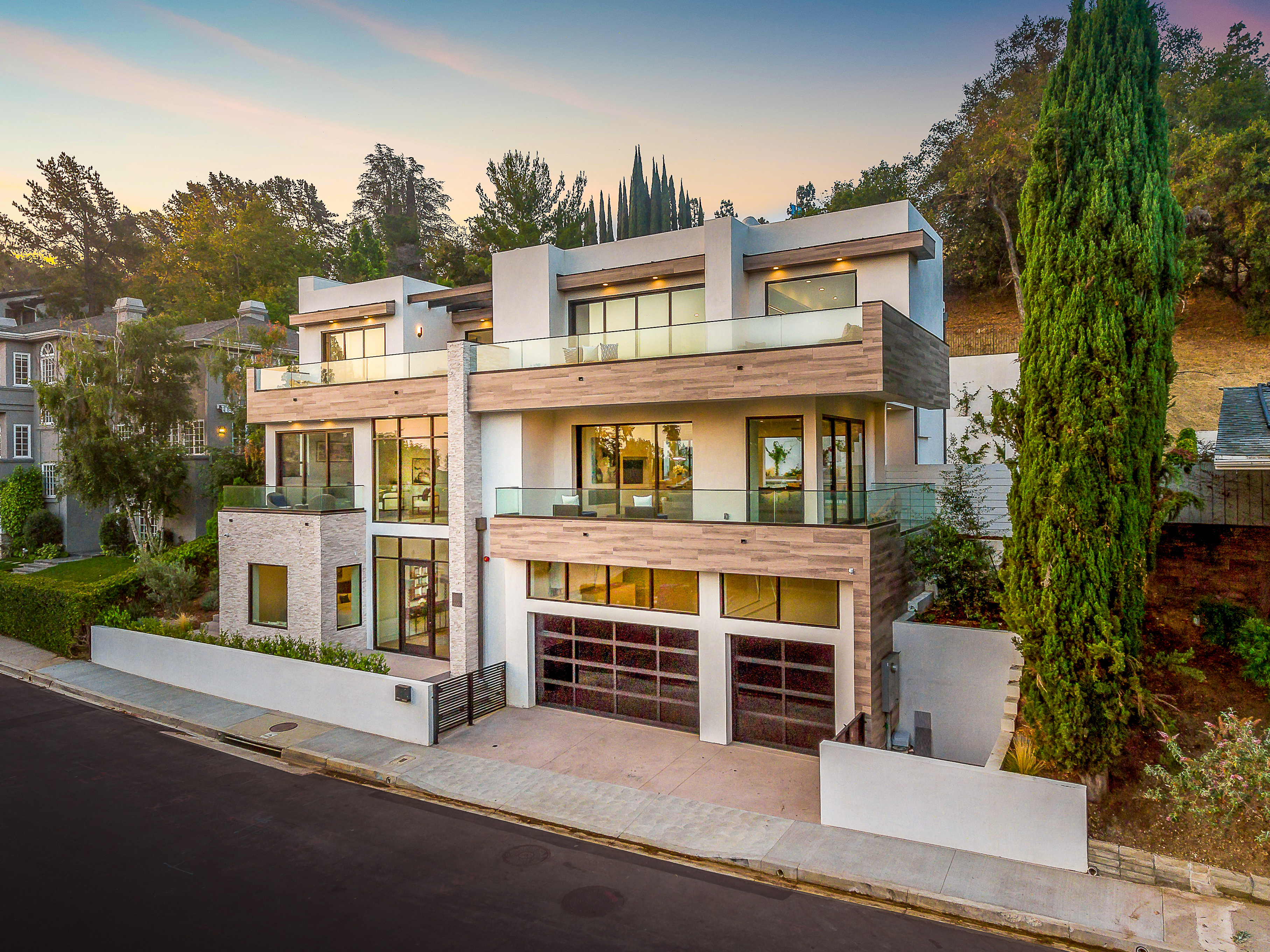 Outstanding contemporary 3 story architectural home designed with inspiring attention to details. Exterior is uniquely detailed with a combination of split-face stone/Porcelain/Ceramic tile and glass. Main entrance holds a lobby with a dramatic 2 story ceilings, maid's quarters, a large home theatre, and an elevator. Comprehensive second floor boasts a custom high-end kitchen featuring Rift Oak cabinets, black and white Vadara counters and center island, Thermador appliances, and walk-in & Butler’s pantries. Open plan living creates perfect functionality for families who entertain, integrating separate loft area, dining area, family room, living room w/ wine cellar, and balconies all around creating a smooth indoor-outdoor luxury lifestyle. Floating staircase leads to the third level that has two en-suite bedrooms and a master retreat where you can enjoy generous private balconies in both the front and back of the home, romantic linear fireplace, huge walk in closet, free-standing bath, rain shower and Porcelain walls/floors. This custom masterpiece of almost 6,400 sqft includes a home theatre, 4 A/C, latest Control4 technology, elevator, outdoor entertainment delight with a pool/spa, Lynx BBQ, patio, fire pit, and gorgeously designed flower wall. Sophisticated, innovative, state of the art!