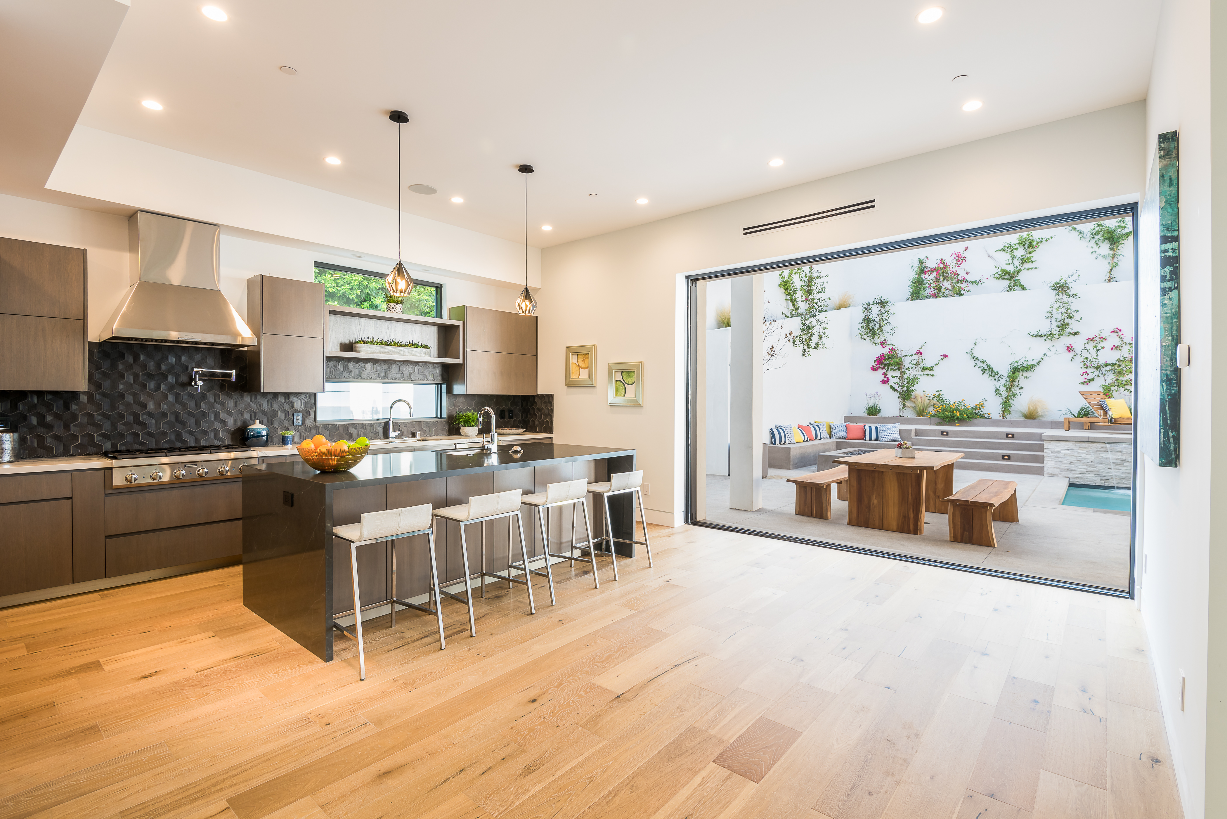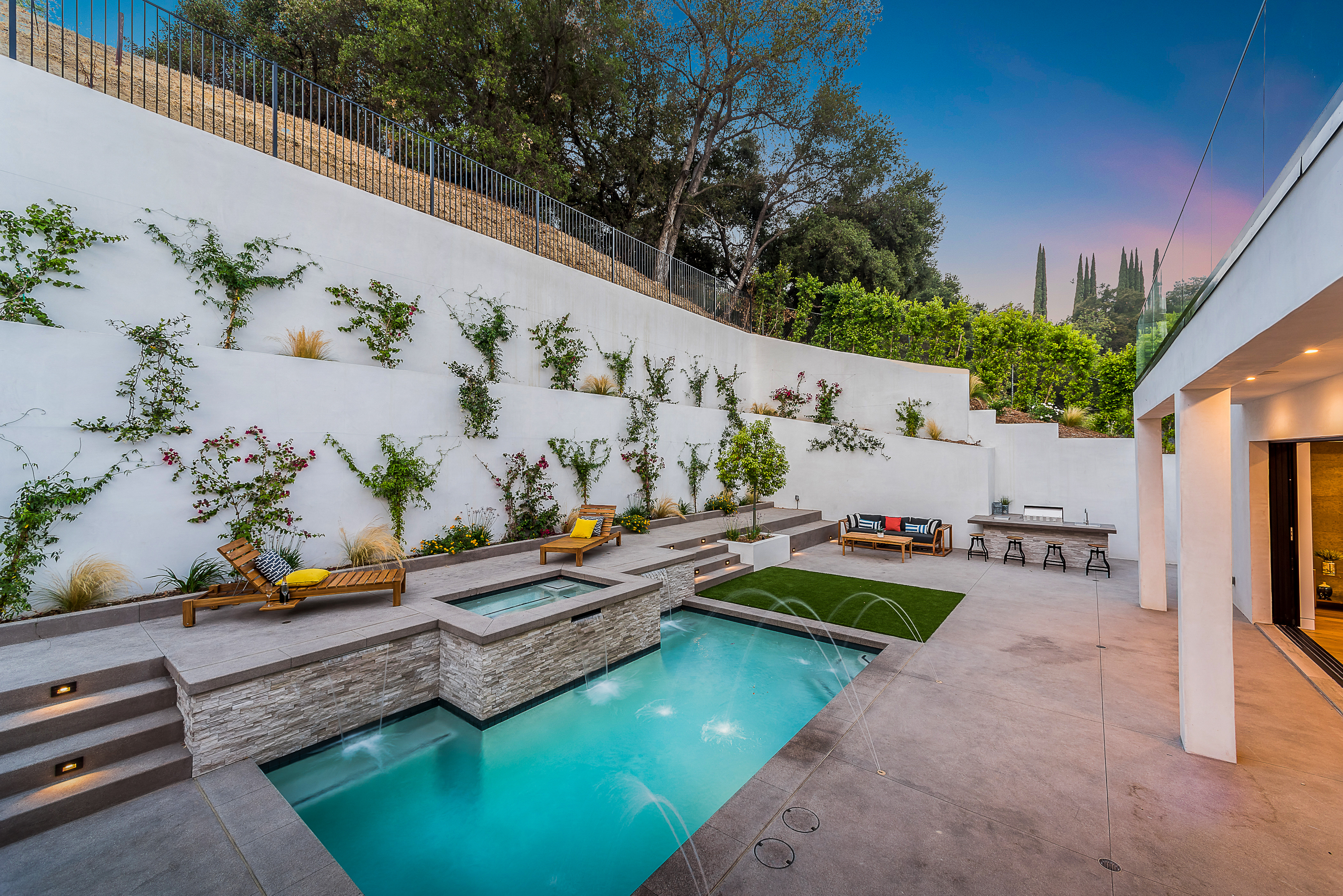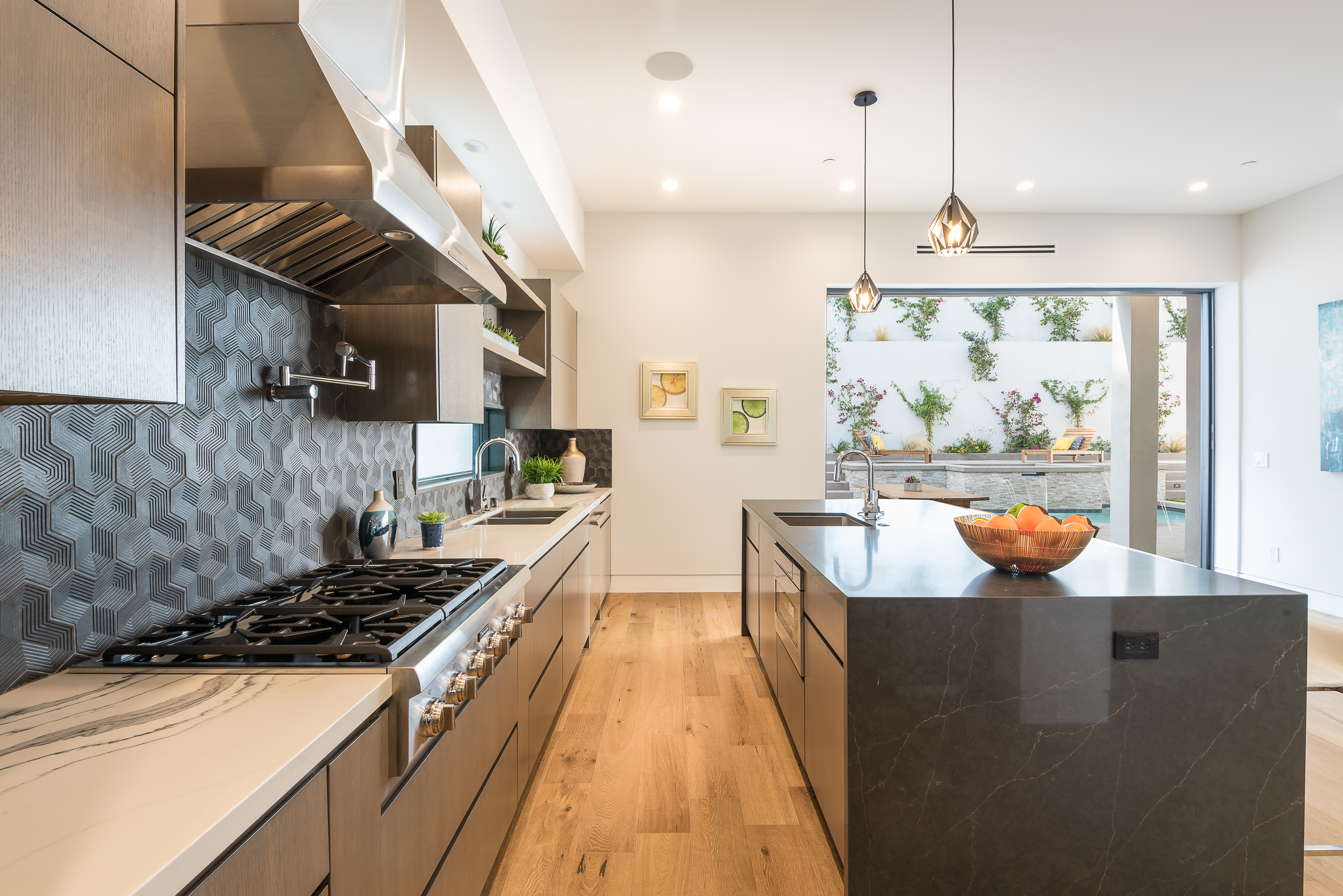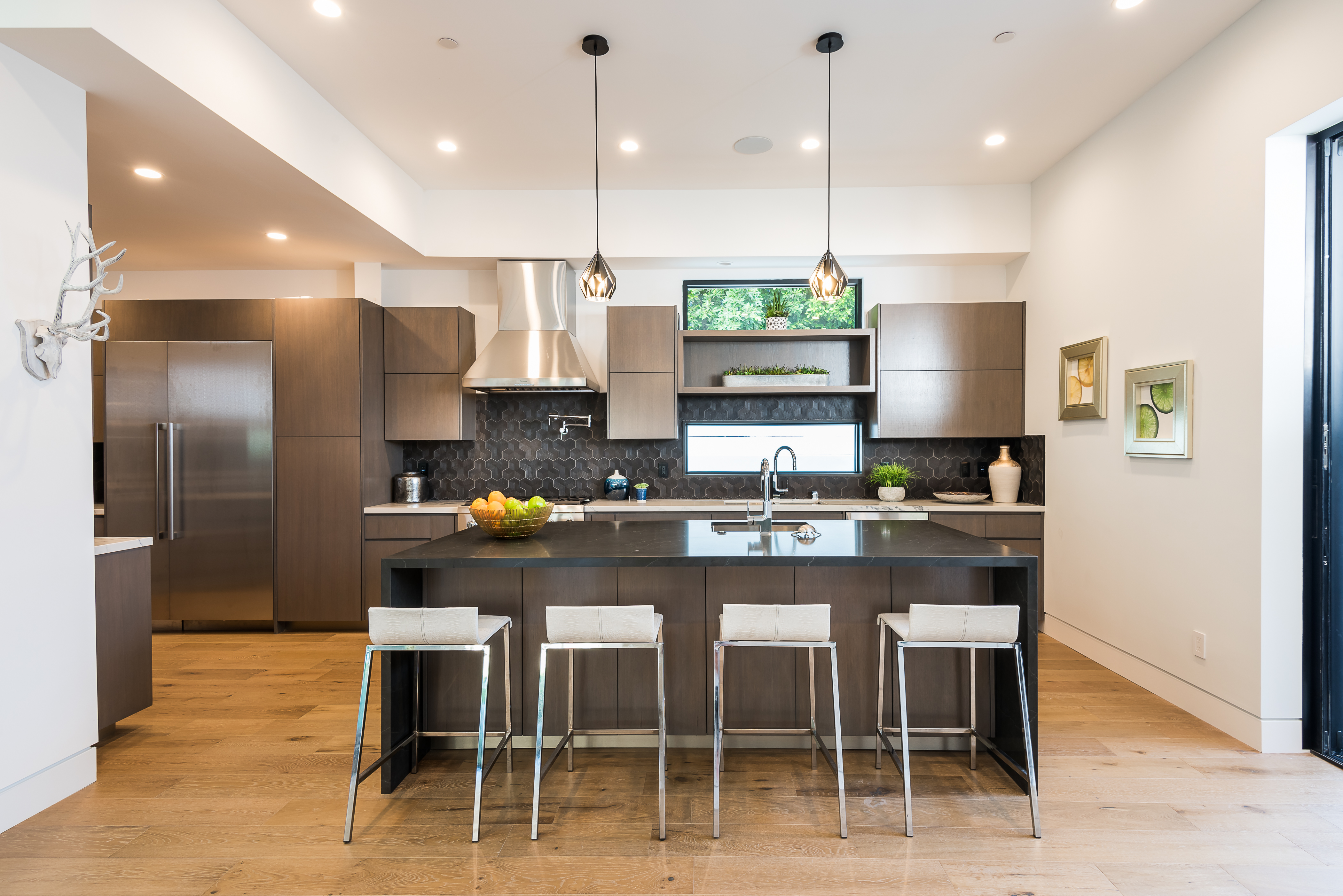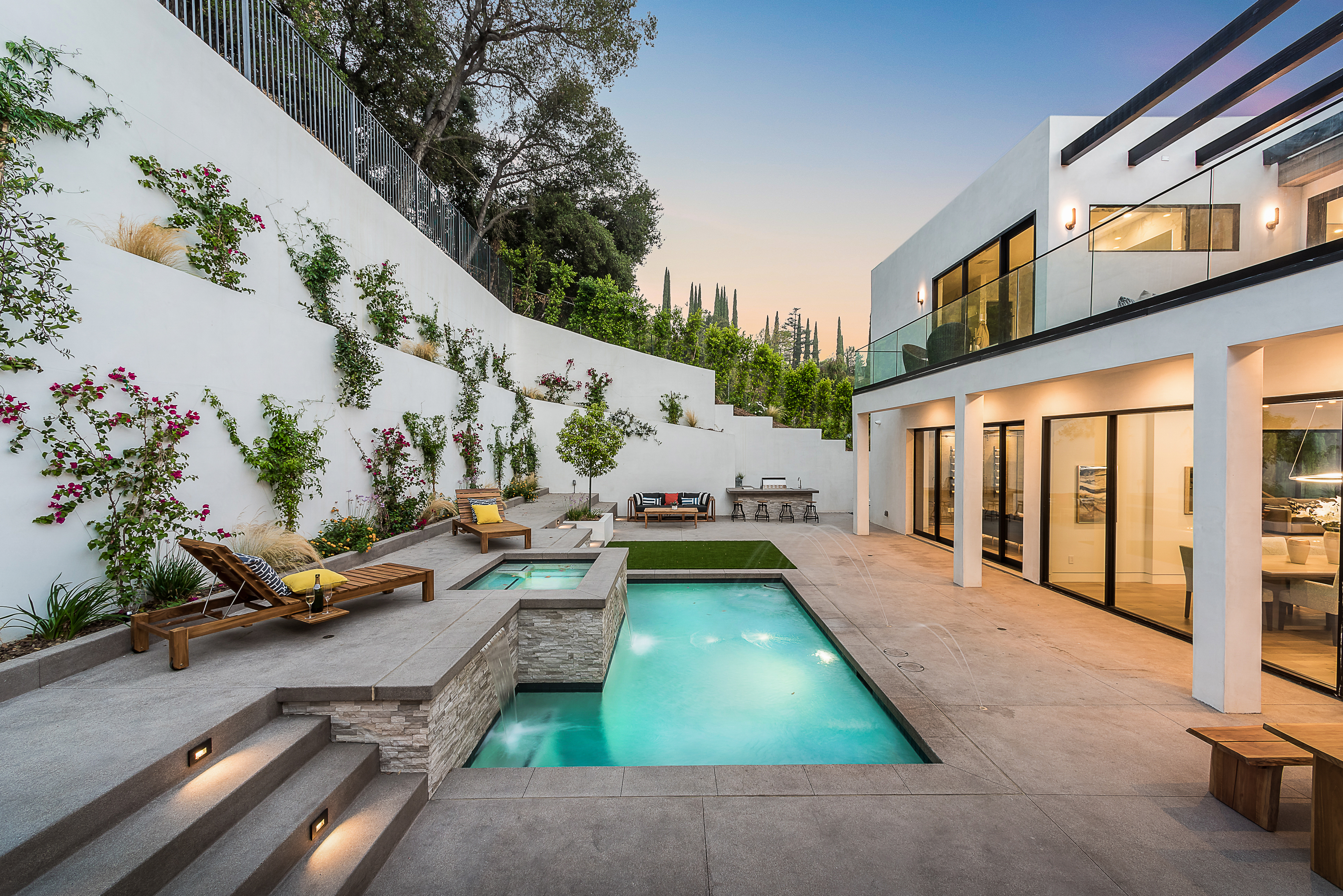 Outstanding contemporary 3 story architectural home designed with inspiring attention to details. Exterior is uniquely detailed with a combination of split-face stone/Porcelain/Ceramic tile and glass. Main entrance holds a lobby with a dramatic 2 story ceilings, maid's quarters, a large home theatre, and an elevator. Comprehensive second floor boasts a custom high-end kitchen featuring Rift Oak cabinets, black and white Vadara counters and center island, Thermador appliances, and walk-in & Butler’s pantries. Open plan living creates perfect functionality for families who entertain, integrating separate loft area, dining area, family room, living room w/ wine cellar, and balconies all around creating a smooth indoor-outdoor luxury lifestyle. Floating staircase leads to the third level that has two en-suite bedrooms and a master retreat where you can enjoy generous private balconies in both the front and back of the home, romantic linear fireplace, huge walk in closet, free-standing bath, rain shower and Porcelain walls/floors. This custom masterpiece of almost 6,400 sqft includes a home theatre, 4 A/C, latest Control4 technology, elevator, outdoor entertainment delight with a pool/spa, Lynx BBQ, patio, fire pit, and gorgeously designed flower wall. Sophisticated, innovative, state of the art!