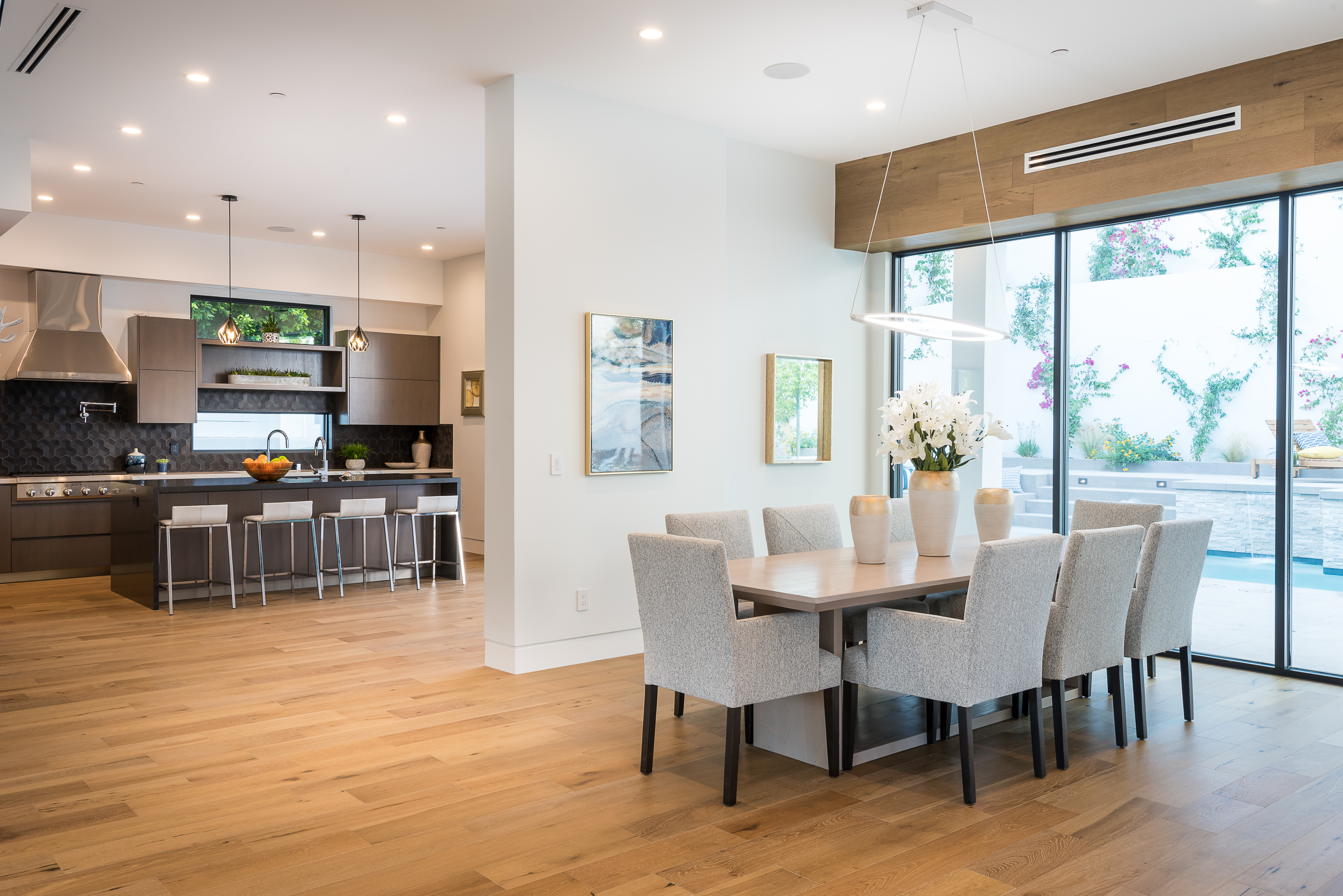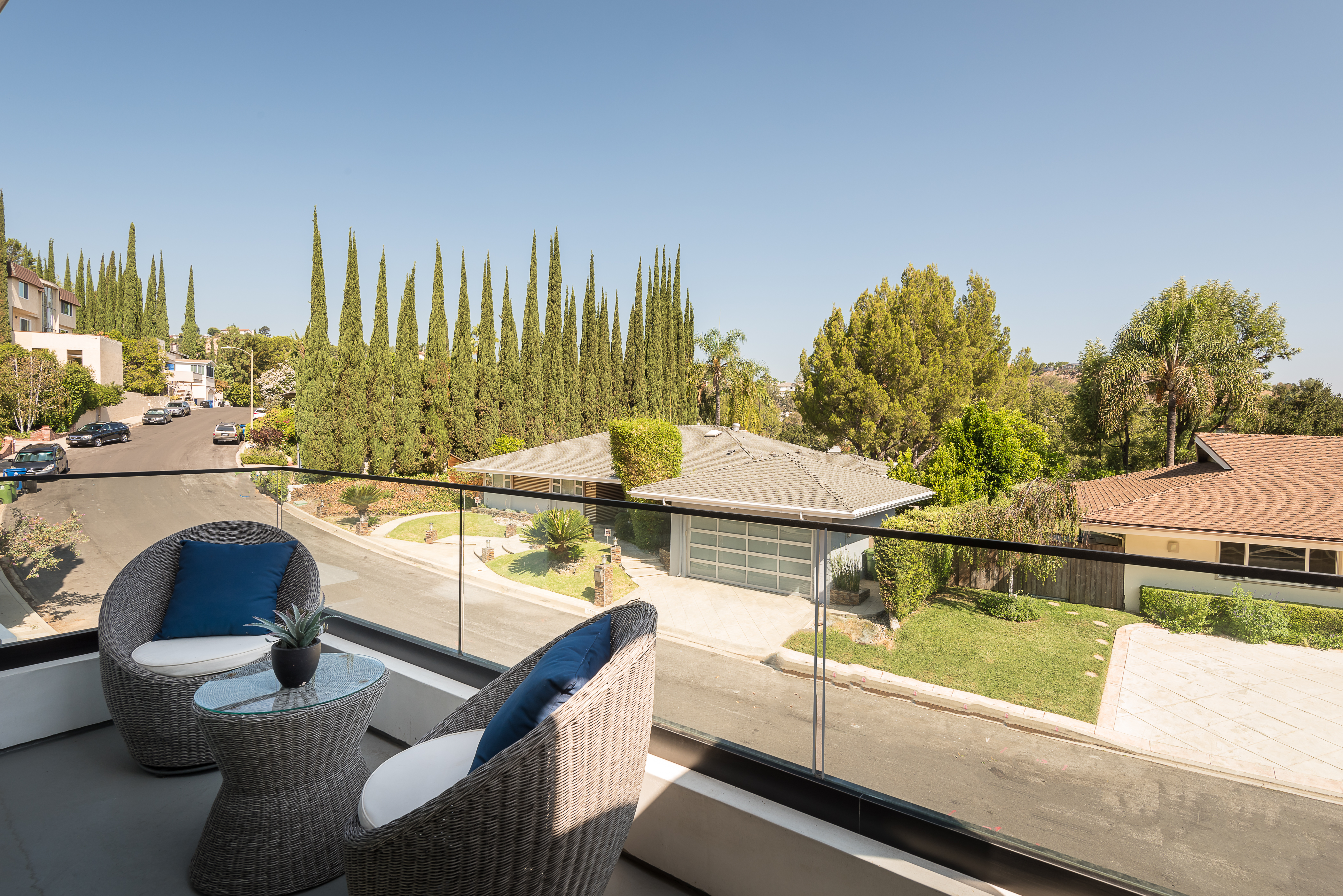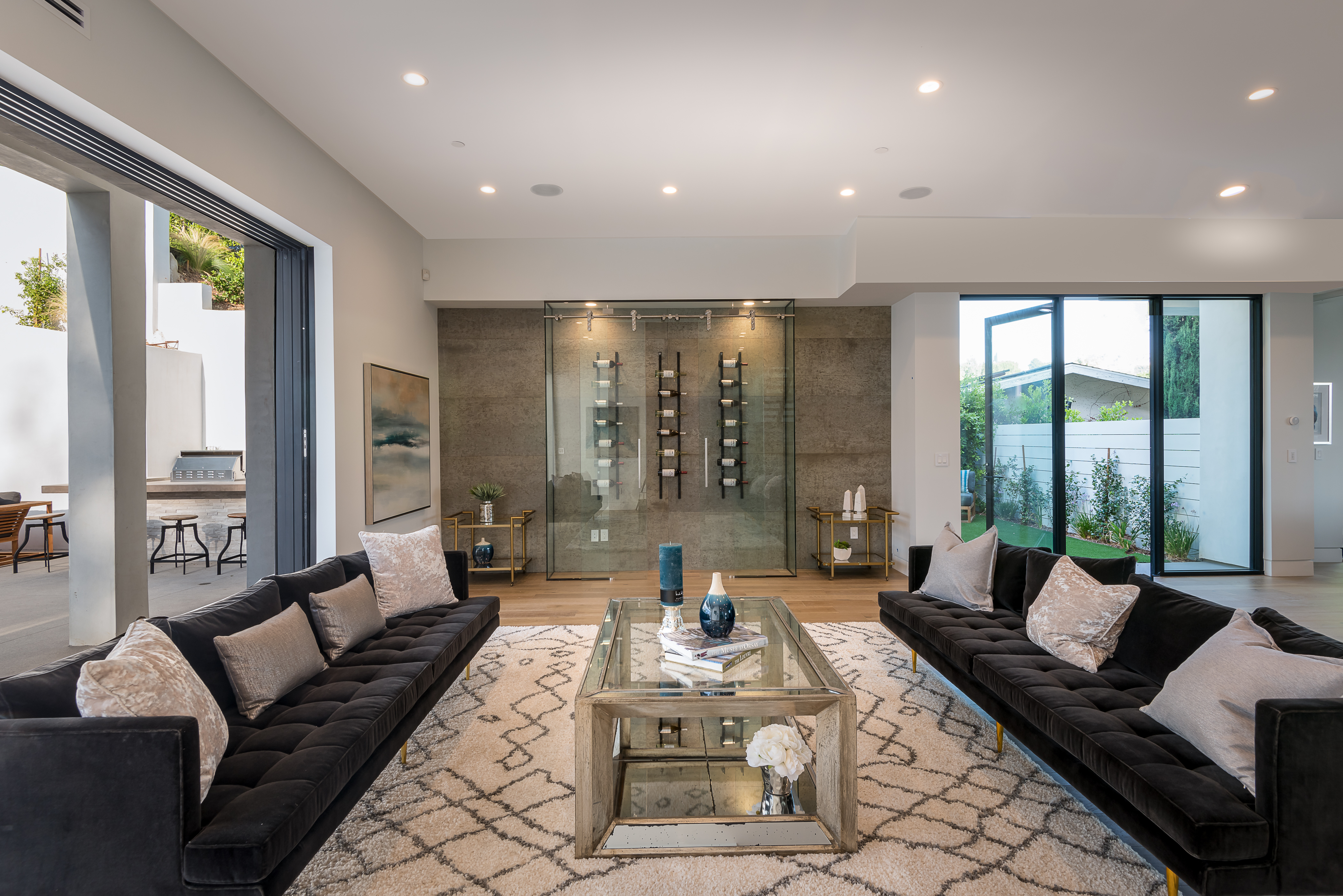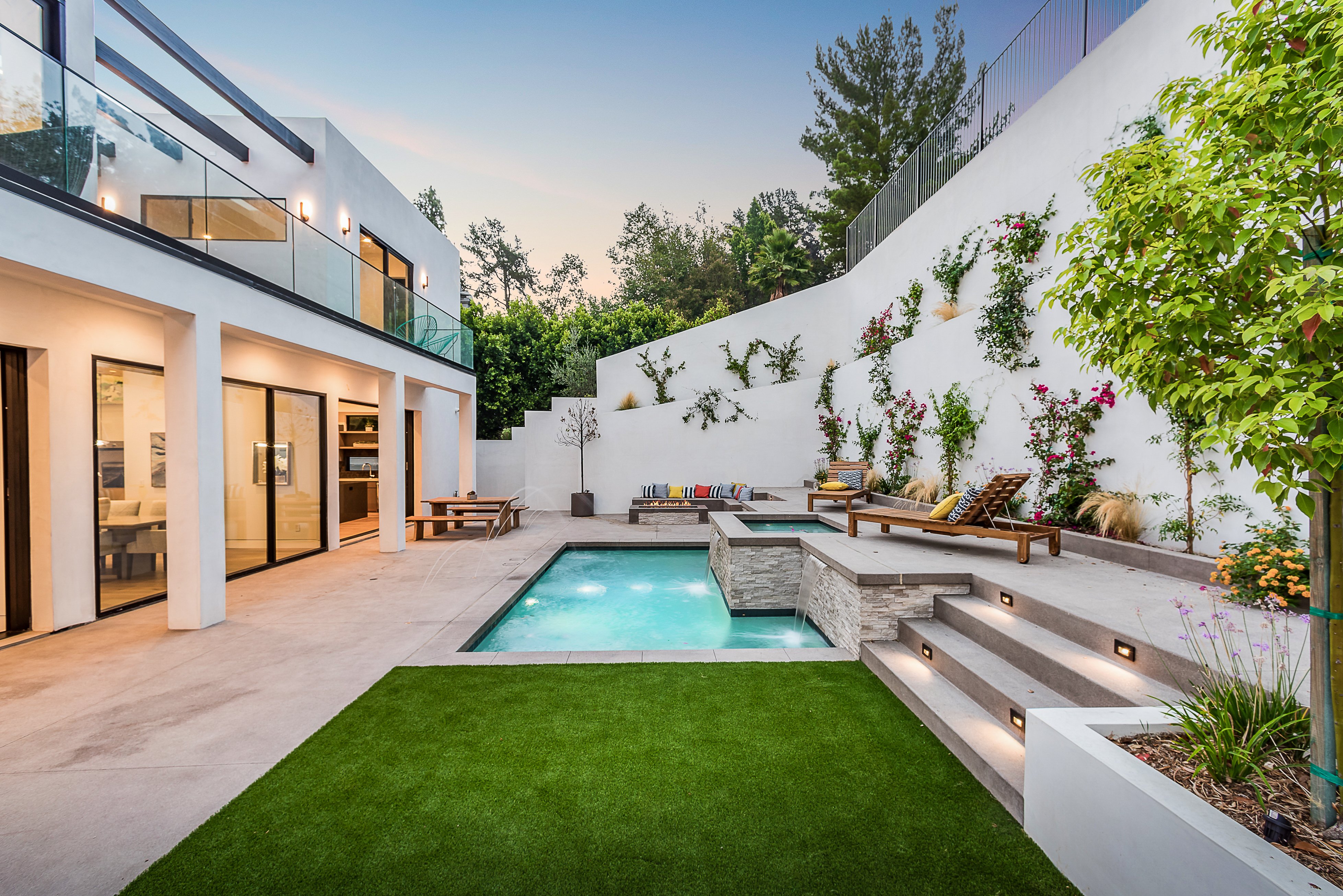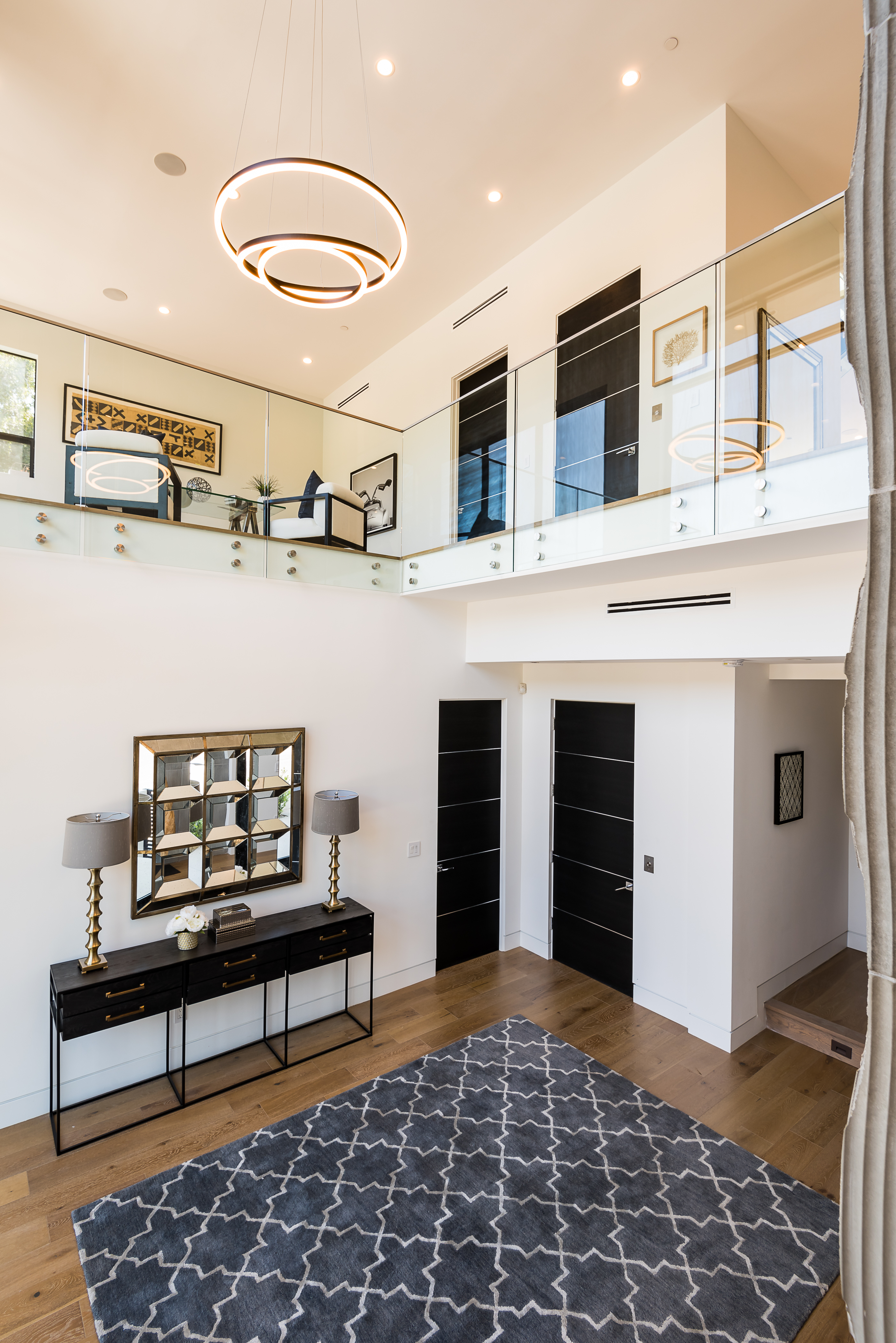 Outstanding contemporary 3 story architectural home designed with inspiring attention to details. Exterior is uniquely detailed with a combination of split-face stone/Porcelain/Ceramic tile and glass. Main entrance holds a lobby with a dramatic 2 story ceilings, maid's quarters, a large home theatre, and an elevator. Comprehensive second floor boasts a custom high-end kitchen featuring Rift Oak cabinets, black and white Vadara counters and center island, Thermador appliances, and walk-in & Butler’s pantries. Open plan living creates perfect functionality for families who entertain, integrating separate loft area, dining area, family room, living room w/ wine cellar, and balconies all around creating a smooth indoor-outdoor luxury lifestyle. Floating staircase leads to the third level that has two en-suite bedrooms and a master retreat where you can enjoy generous private balconies in both the front and back of the home, romantic linear fireplace, huge walk in closet, free-standing bath, rain shower and Porcelain walls/floors. This custom masterpiece of almost 6,400 sqft includes a home theatre, 4 A/C, latest Control4 technology, elevator, outdoor entertainment delight with a pool/spa, Lynx BBQ, patio, fire pit, and gorgeously designed flower wall. Sophisticated, innovative, state of the art!