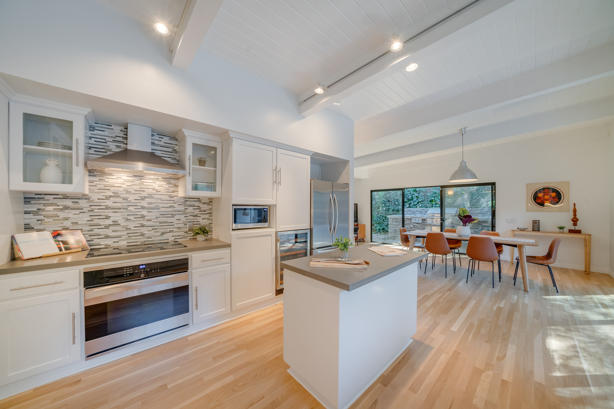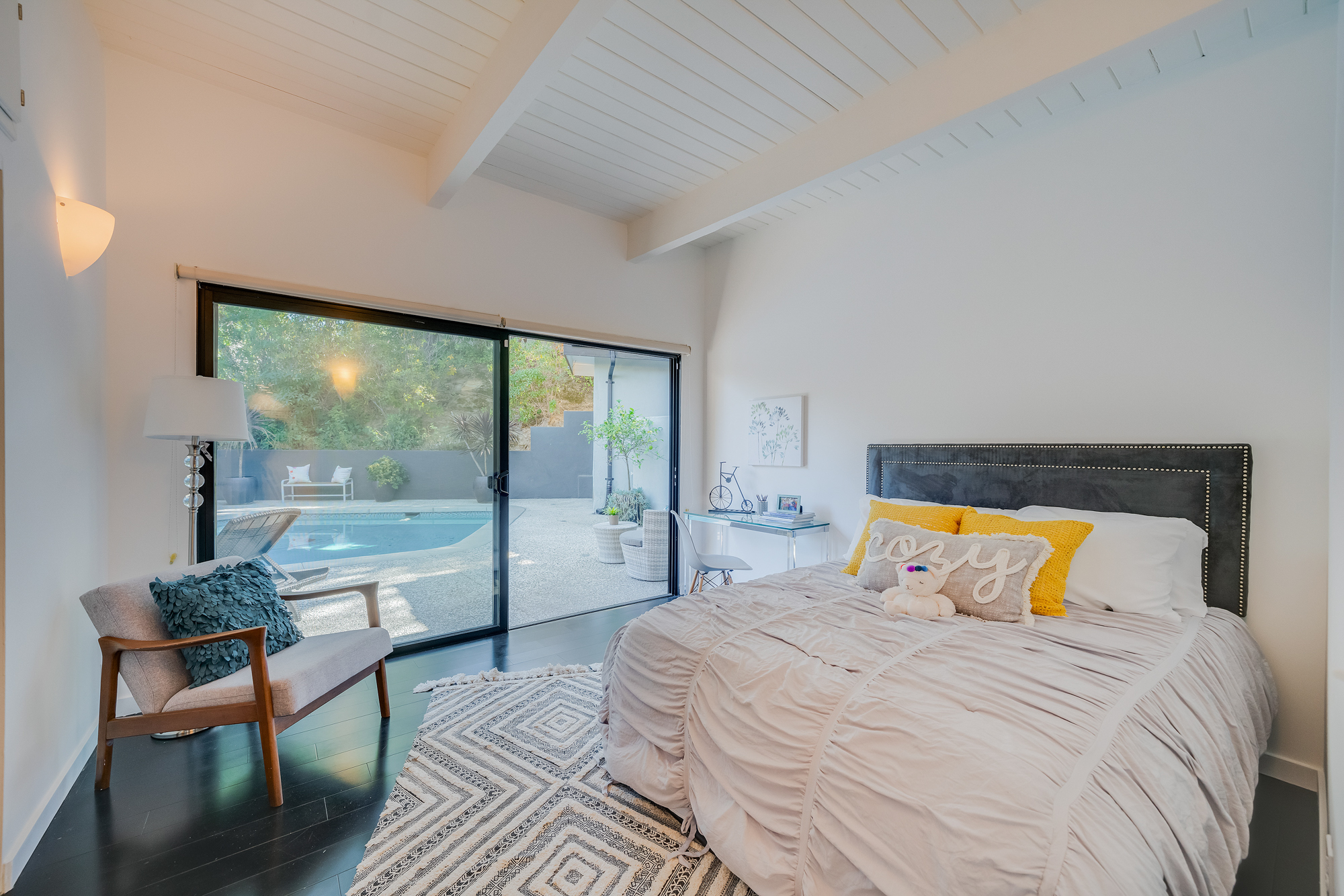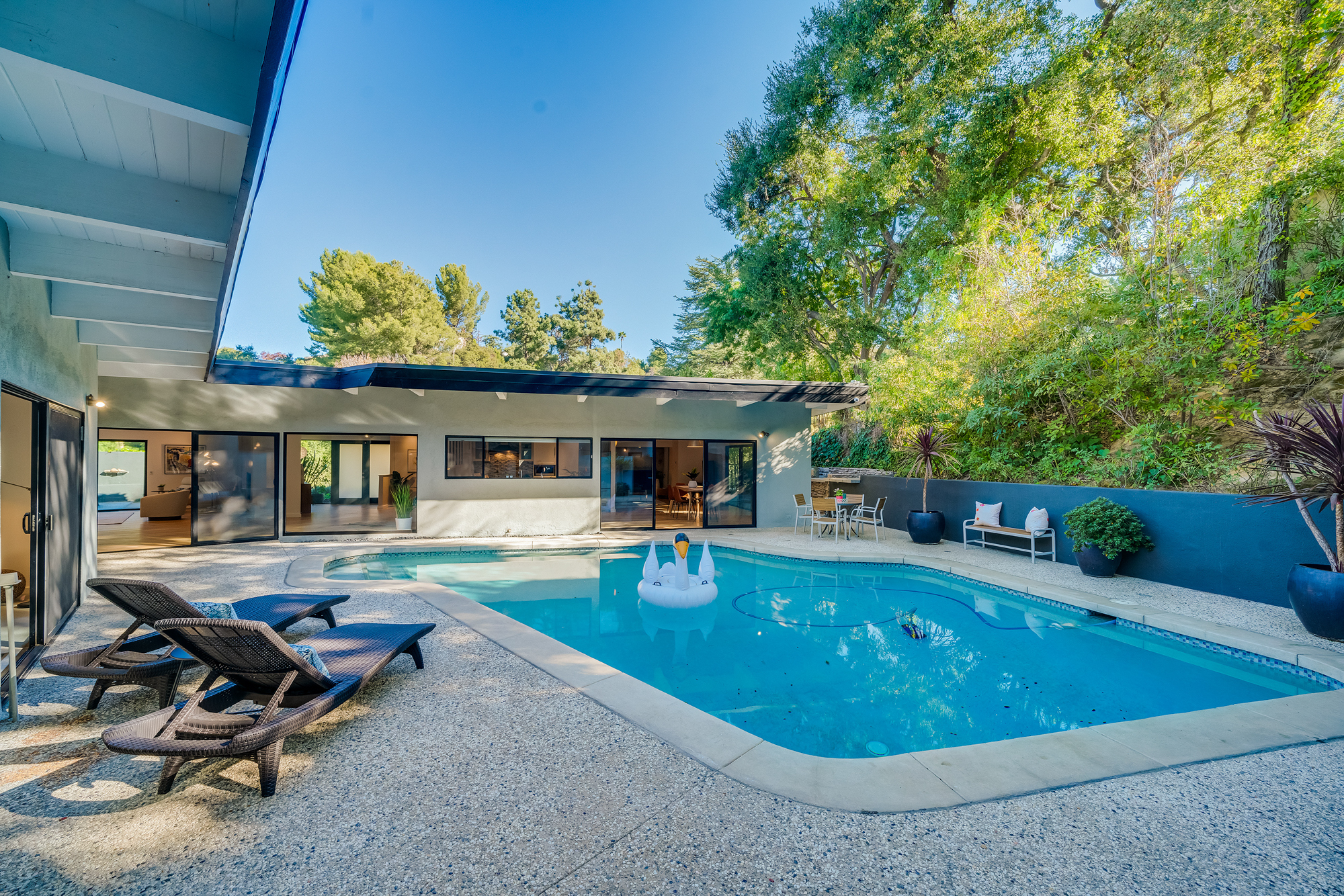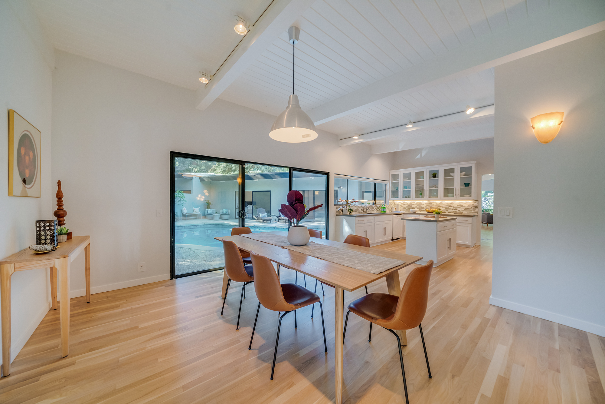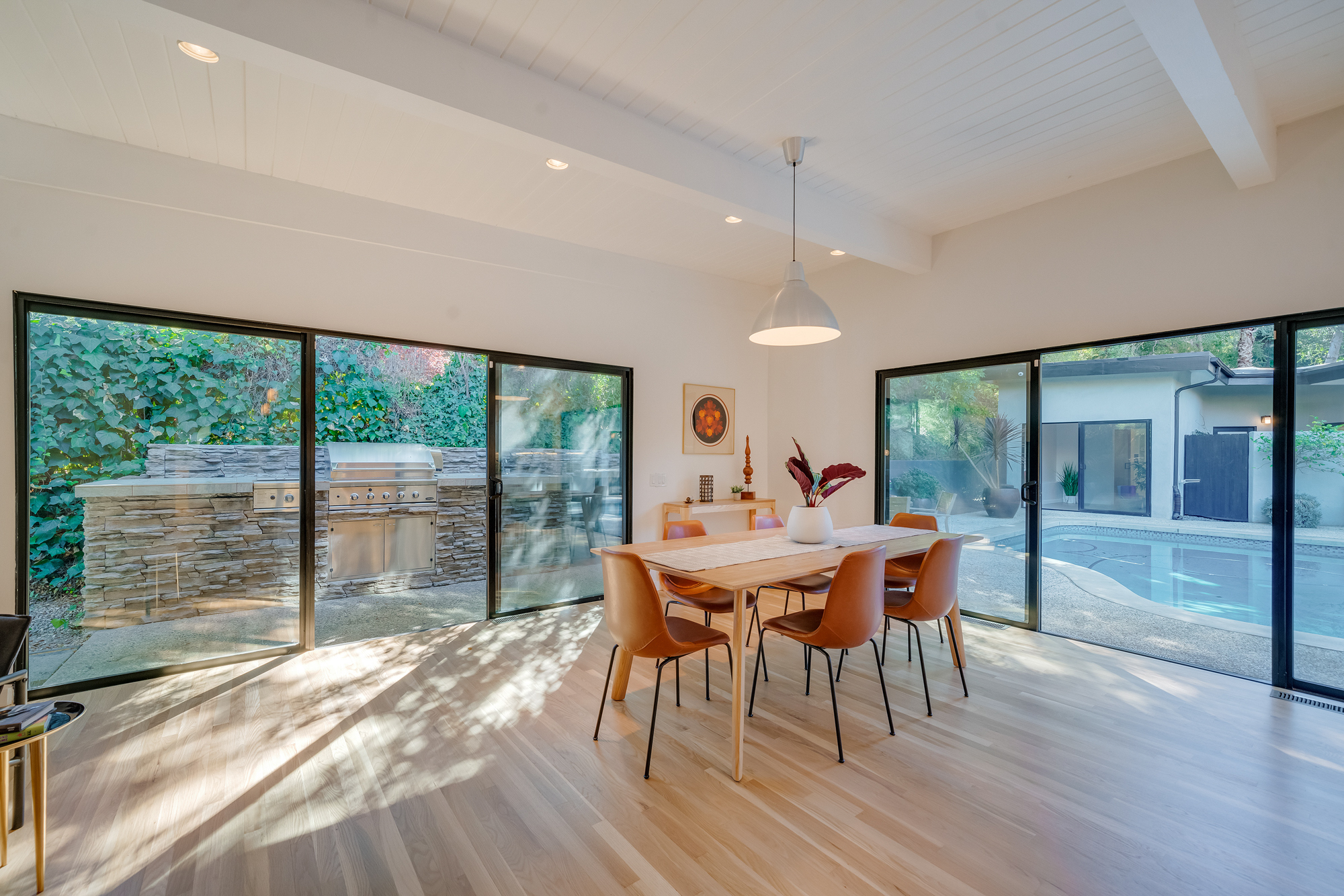 sparkling pool and fruit trees. This home has a hip & contemporary vibe with updated, custom kitchen & baths, 9’ exposed beam ceilings, 2 fireplaces, plentiful windows & sliding glass doors, solid hardwood flooring, & bonus room off the Master bed that can be used as a workout space, studio, & much more. Of note, numerous improvements have recently been performed making this home move-in ready, including installation of a new central security system, 200 amp electric, upgrades to the HVAC to enhance system performance, new lighting, closet systems, paint, hardwood floors newly refinished, & more. Dine, entertain family & friends, work from home, or simply relax inside or outdoors in a serene setting, with access to the large built-in bbq & poolside area from almost every room. This is a rare opportunity to own a beautiful and sizable 1-story home conveniently located to shops, restaurants, the Studios, & more, in a wonderful, family-friendly neighborhood on a desirable street, with easy access to the Westside, city, & Valley. Come see this home, it could be your dream home to enjoy & make happy memories in for years to come!