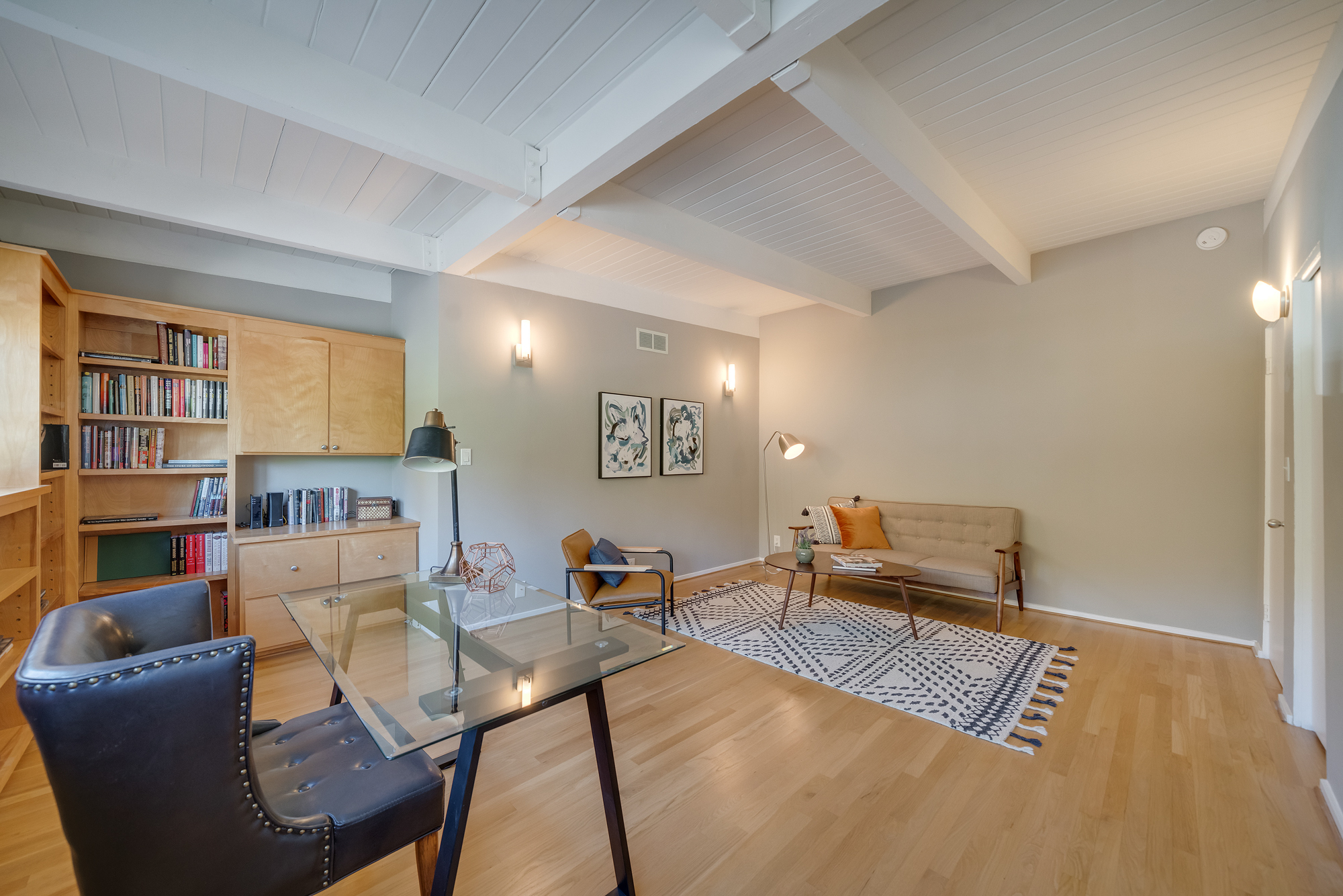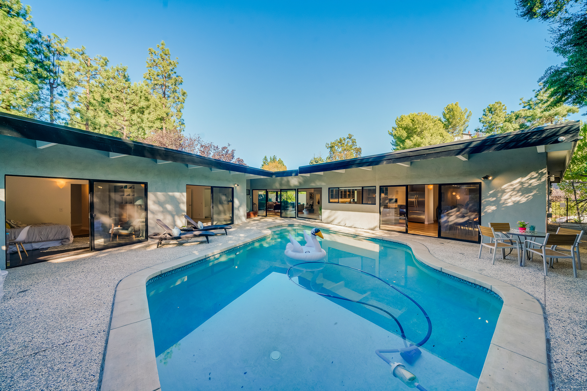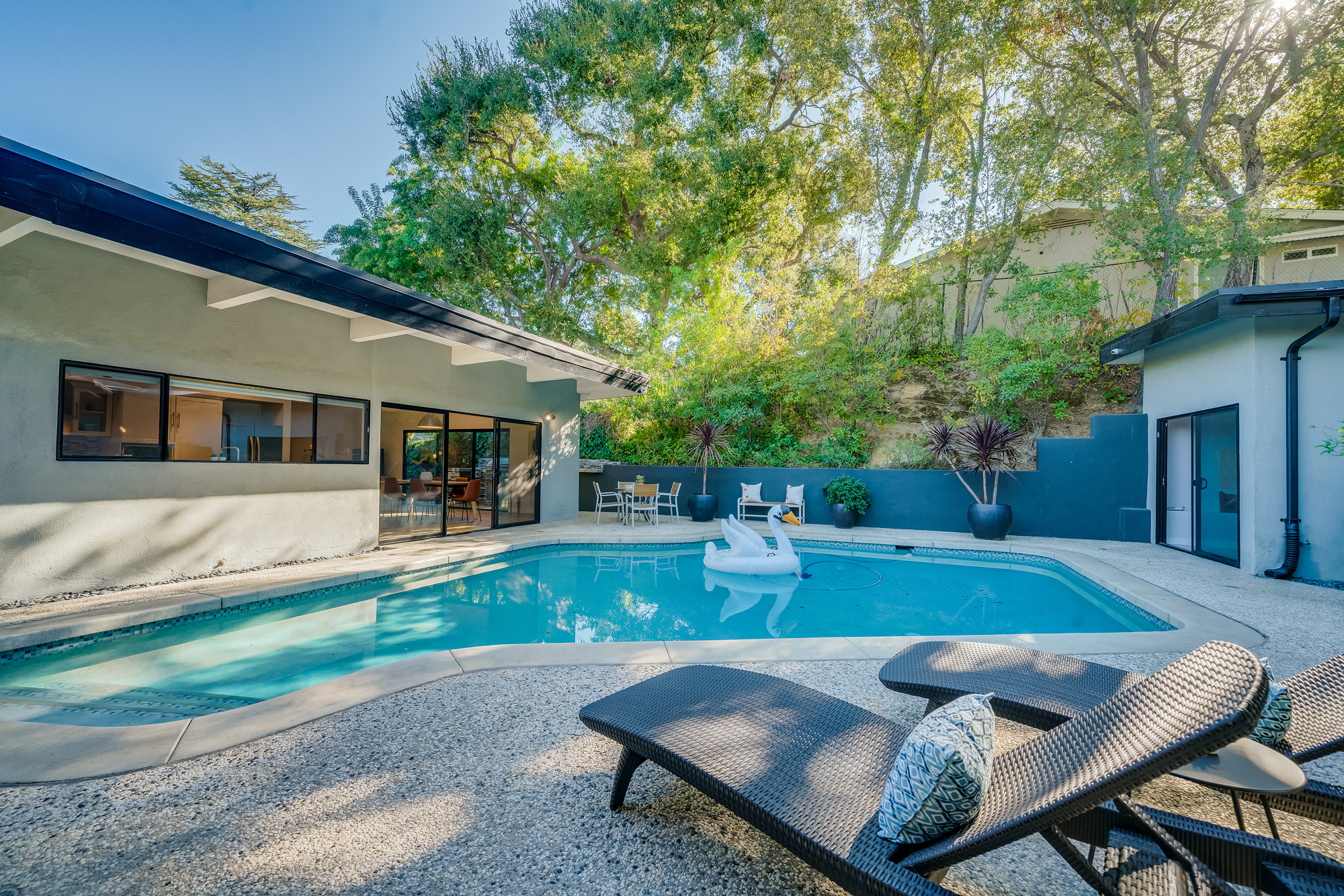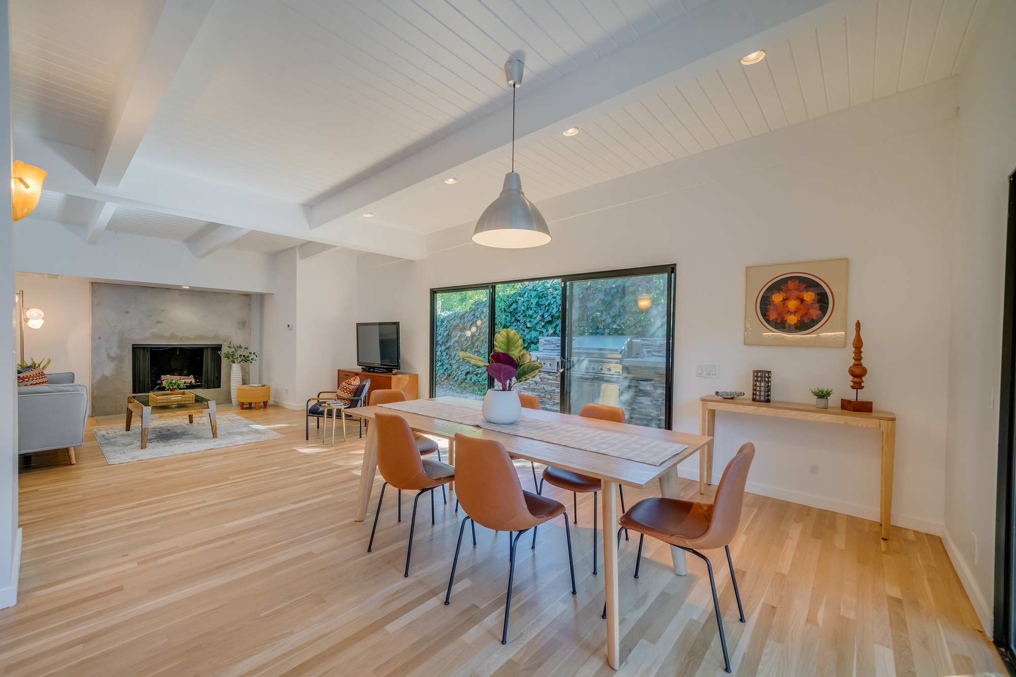 sparkling pool and fruit trees. This home has a hip & contemporary vibe with updated, custom kitchen & baths, 9’ exposed beam ceilings, 2 fireplaces, plentiful windows & sliding glass doors, solid hardwood flooring, & bonus room off the Master bed that can be used as a workout space, studio, & much more. Of note, numerous improvements have recently been performed making this home move-in ready, including installation of a new central security system, 200 amp electric, upgrades to the HVAC to enhance system performance, new lighting, closet systems, paint, hardwood floors newly refinished, & more. Dine, entertain family & friends, work from home, or simply relax inside or outdoors in a serene setting, with access to the large built-in bbq & poolside area from almost every room. This is a rare opportunity to own a beautiful and sizable 1-story home conveniently located to shops, restaurants, the Studios, & more, in a wonderful, family-friendly neighborhood on a desirable street, with easy access to the Westside, city, & Valley. Come see this home, it could be your dream home to enjoy & make happy memories in for years to come!