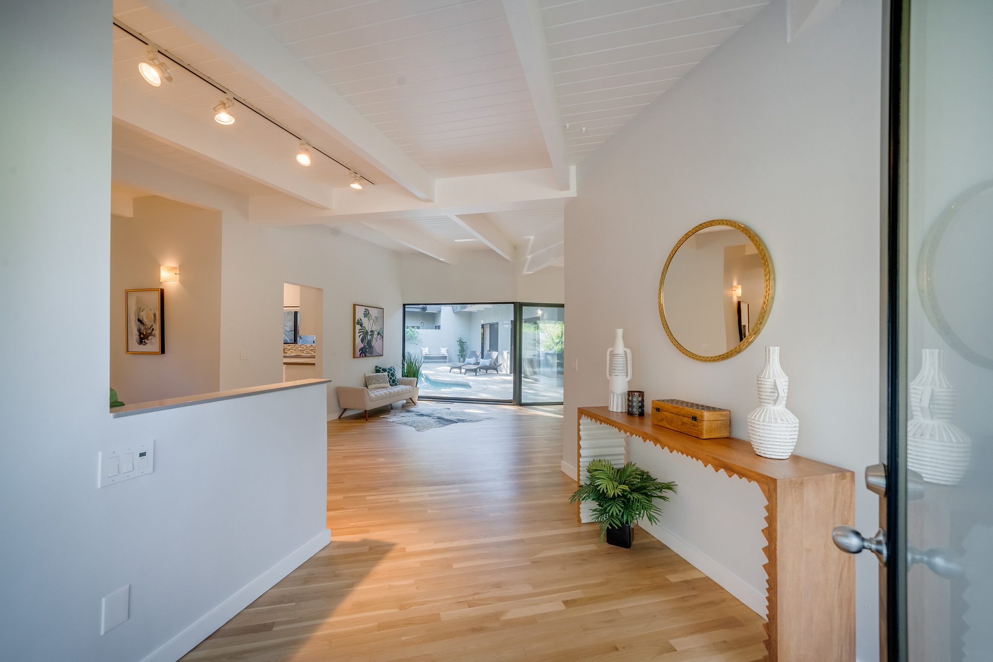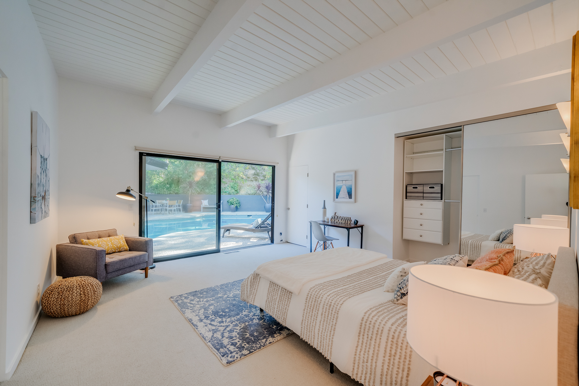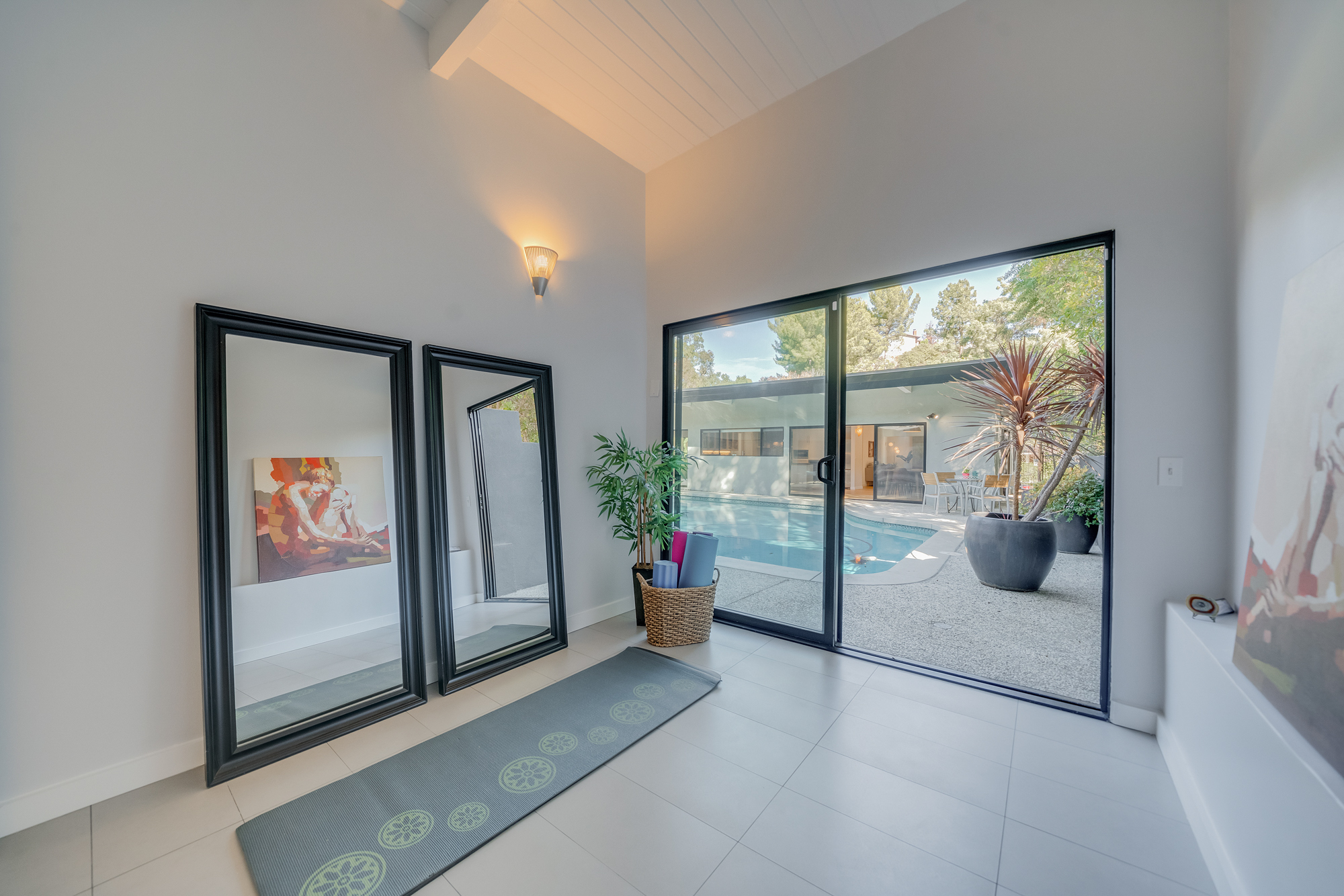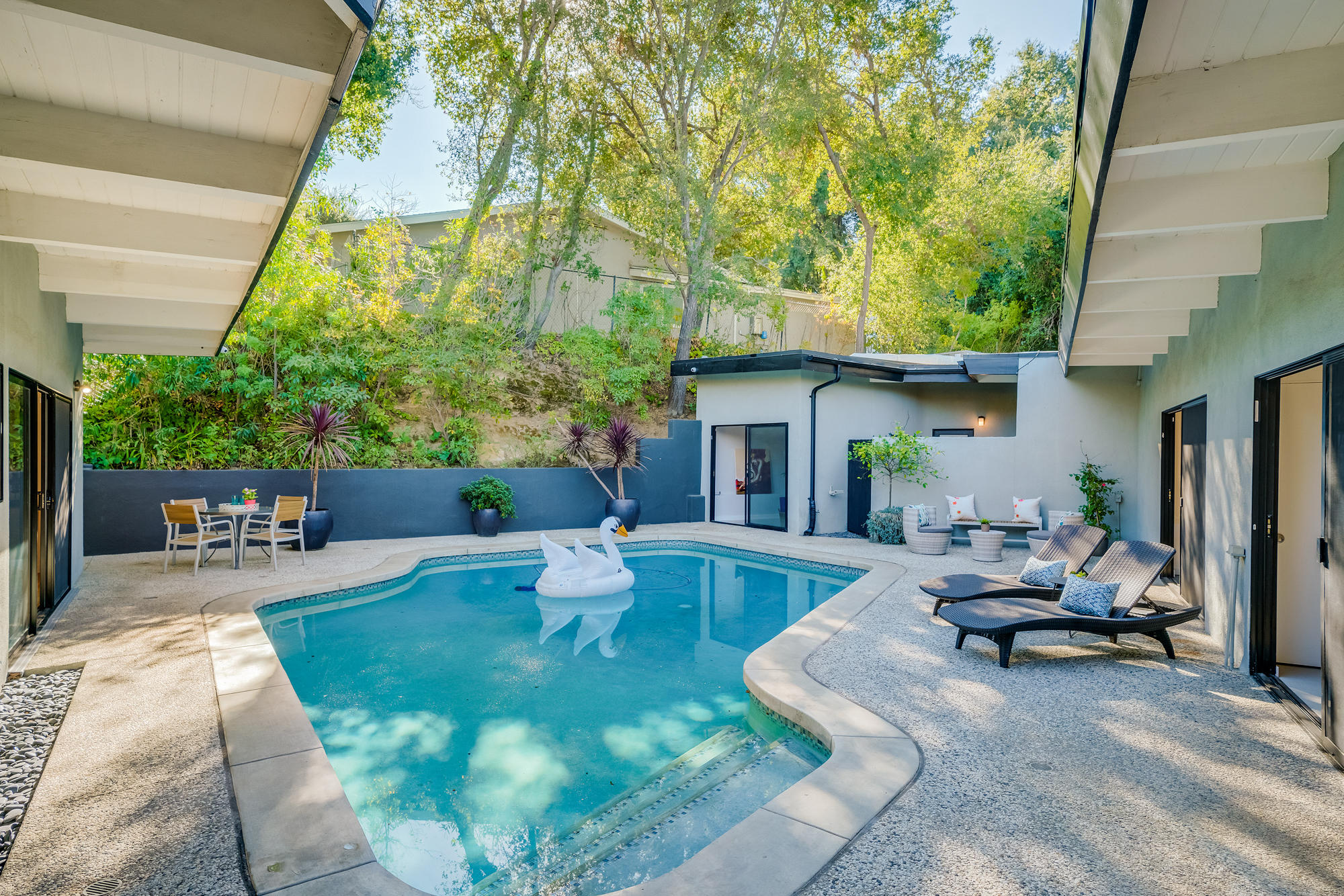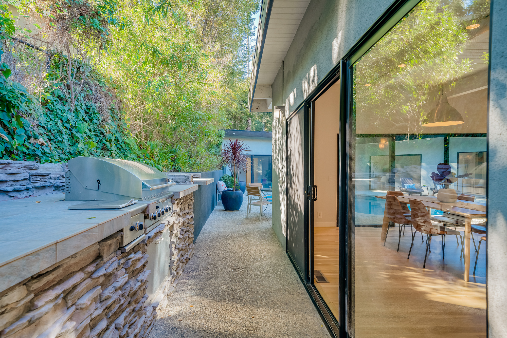 sparkling pool and fruit trees. This home has a hip & contemporary vibe with updated, custom kitchen & baths, 9’ exposed beam ceilings, 2 fireplaces, plentiful windows & sliding glass doors, solid hardwood flooring, & bonus room off the Master bed that can be used as a workout space, studio, & much more. Of note, numerous improvements have recently been performed making this home move-in ready, including installation of a new central security system, 200 amp electric, upgrades to the HVAC to enhance system performance, new lighting, closet systems, paint, hardwood floors newly refinished, & more. Dine, entertain family & friends, work from home, or simply relax inside or outdoors in a serene setting, with access to the large built-in bbq & poolside area from almost every room. This is a rare opportunity to own a beautiful and sizable 1-story home conveniently located to shops, restaurants, the Studios, & more, in a wonderful, family-friendly neighborhood on a desirable street, with easy access to the Westside, city, & Valley. Come see this home, it could be your dream home to enjoy & make happy memories in for years to come!