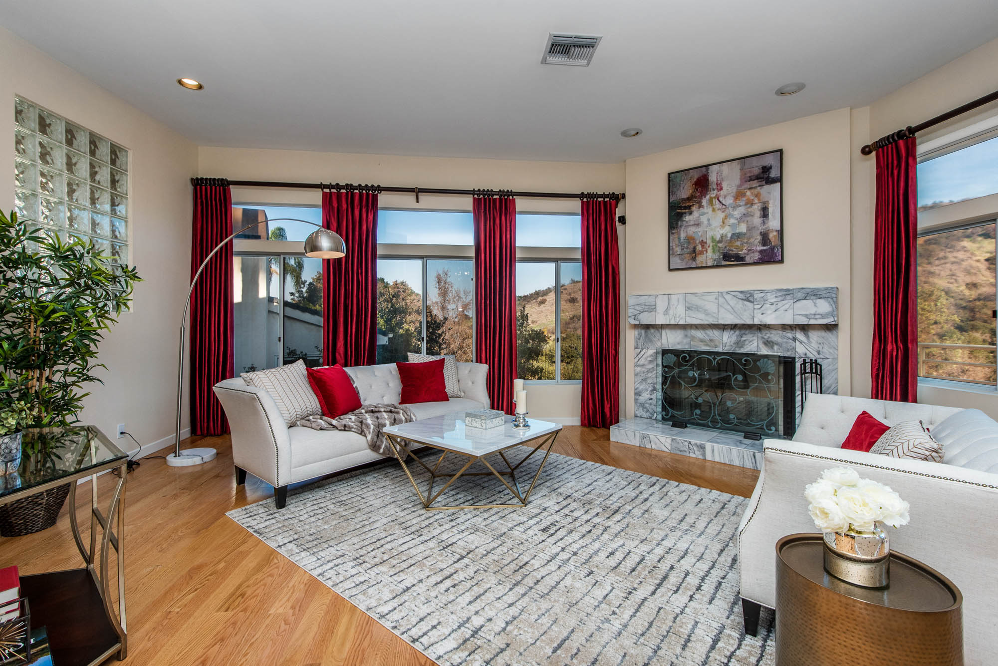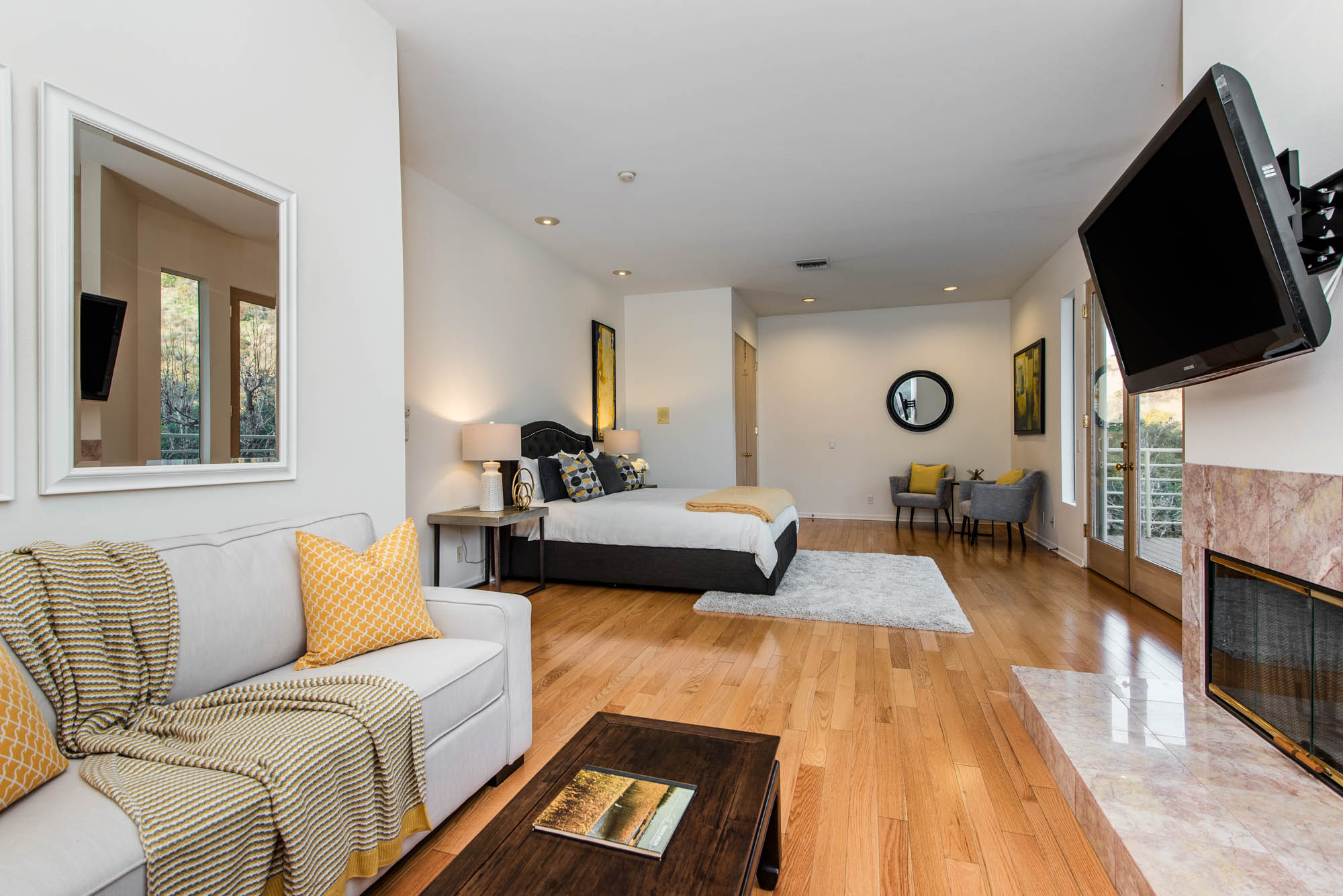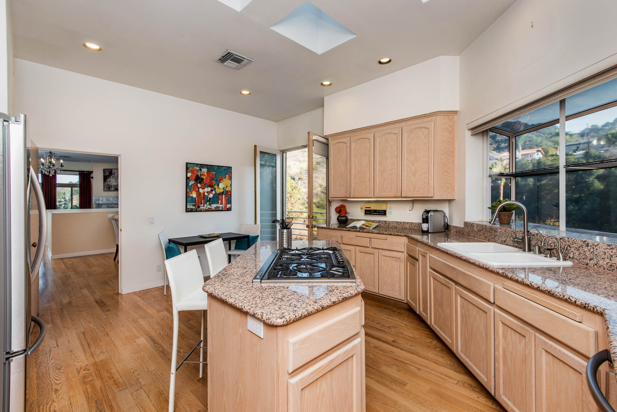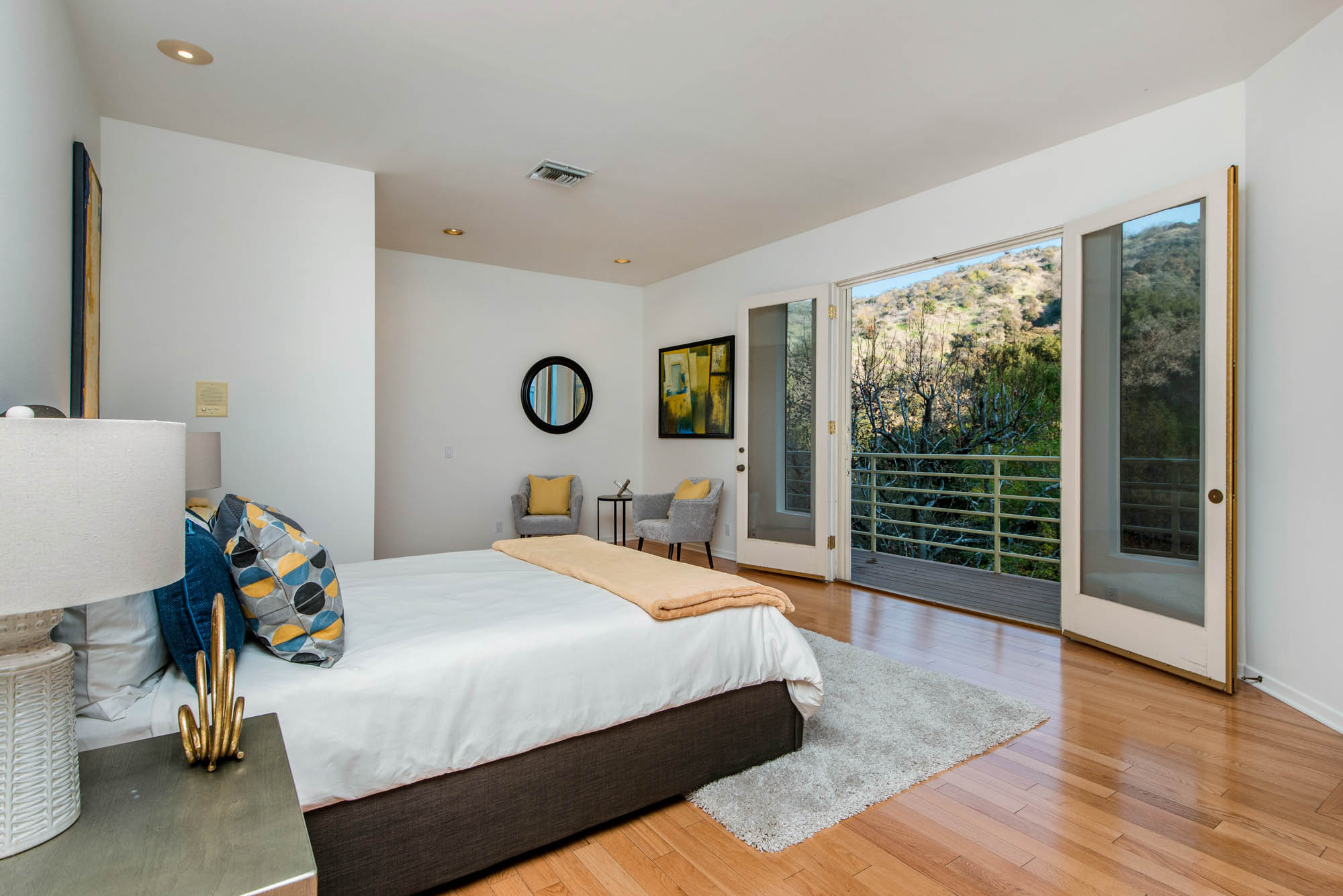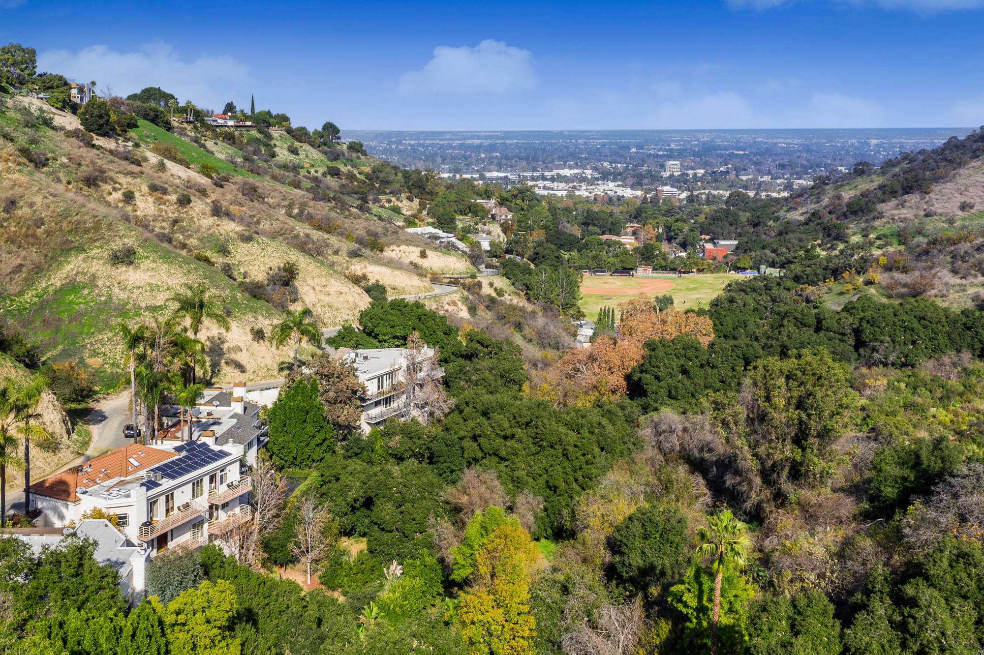 Located in the hills of Sherman Oaks is this private 4 bedroom, 4 bathroom home with mountain views from almost every room. Through the double doors, you’re greeted by an open concept living space. A wet bar off of the entrance features a wine fridge and barstool seating. Continuing into the home is the formal living room featuring a fireplace, high ceilings and tall windows which bring in an abundance of natural light. French doors open the living room to a private balcony with breathtaking nature views. The high ceilings continue into the dining room which is conveniently located off of the kitchen. The kitchen has a large center island with a built-in range and plenty of storage. The double sink looks out over the hills and a breakfast nook provides the perfect place for a quick meal. The grand master suite boasts more beautiful views and has the home’s second fireplace situated in its private sitting area. A large walk-in closet and bathroom with a walk-in shower and separate tub complete the suite. Also located on this floor are two additional bedrooms and the home's third bathroom. The lower level of the home has a spacious den ideal for movie and game nights. A well-sized private bedroom is perfect for hosting overnight guests. Off of the den is another balcony leading to the backyard. The tranquil zen garden with lush landscaping offers lots of grounds to explore. Additional features include solar panels, security system, individual laundry room, two-car garage, and access to public hiking trails!
