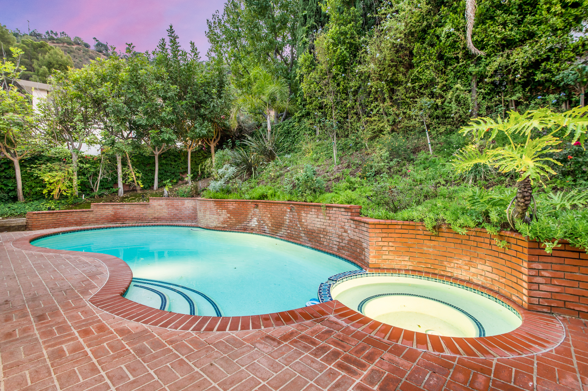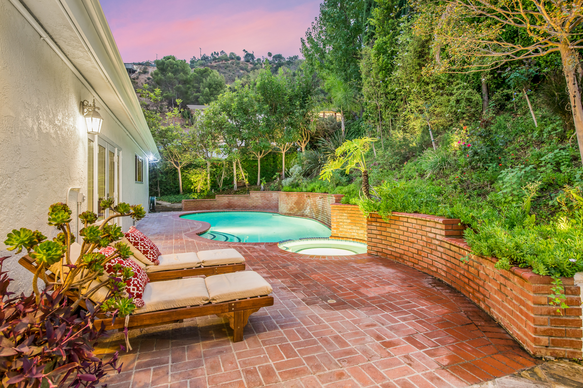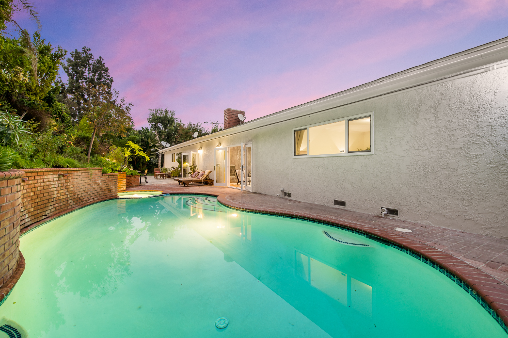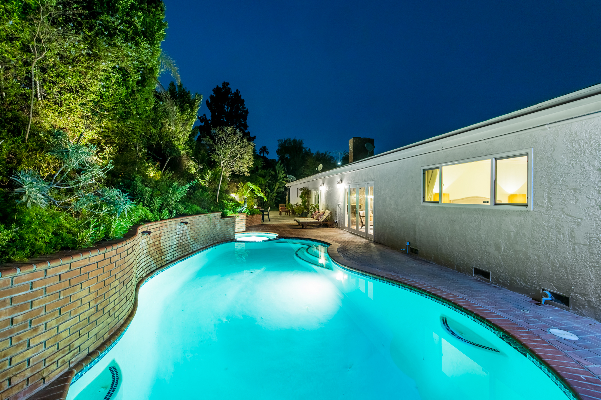 Tucked away in the hills of Studio City is this beautifully updated 4 bed, 3 bath single-level home on a sweeping corner lot of more than 10,000 sft. Lush landscaping and elegant stone work welcome you as you approach the custom wrought iron front door. Inside, the open floor plan is perfect for entertaining. The living and family rooms both are separated by an eye catching fireplace, and both open to the spectacular backyard. The kitchen has rich wood cabinetry, granite countertops, Viking appliances, and large center island with bar seating. Just adjacent is the spacious formal dining room with custom chandelier. The private master retreat is located in its own wing of the home and offers high ceilings, dual walk in closets, and spa-like bath with dual sink vanity, jetted tub, bidet, and walk in shower w/ rainfall shower head. The 3 additional bedrooms are well appointed and share 2 tastefully updated baths. The serene backyard has a sparkling pool & spa, huge patio perfect for outdoor dining and entertaining, and a large grassy area with mature trees. Additional features include 2 car garage, recessed lighting throughout, and camera security system. Minutes from Hollywood, Ventura Boulevard, and the Westside, the location could not be better. You must come see this amazing home for yourself!