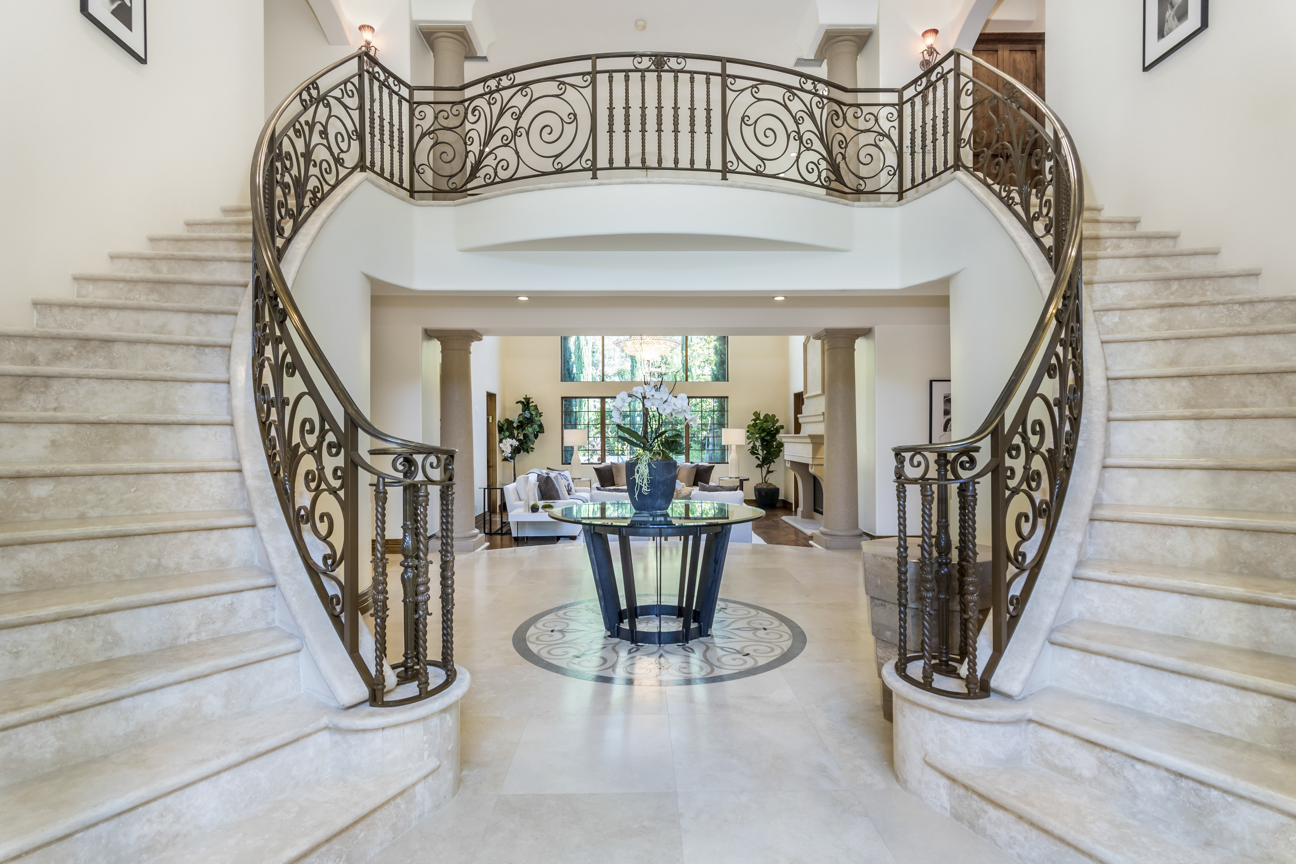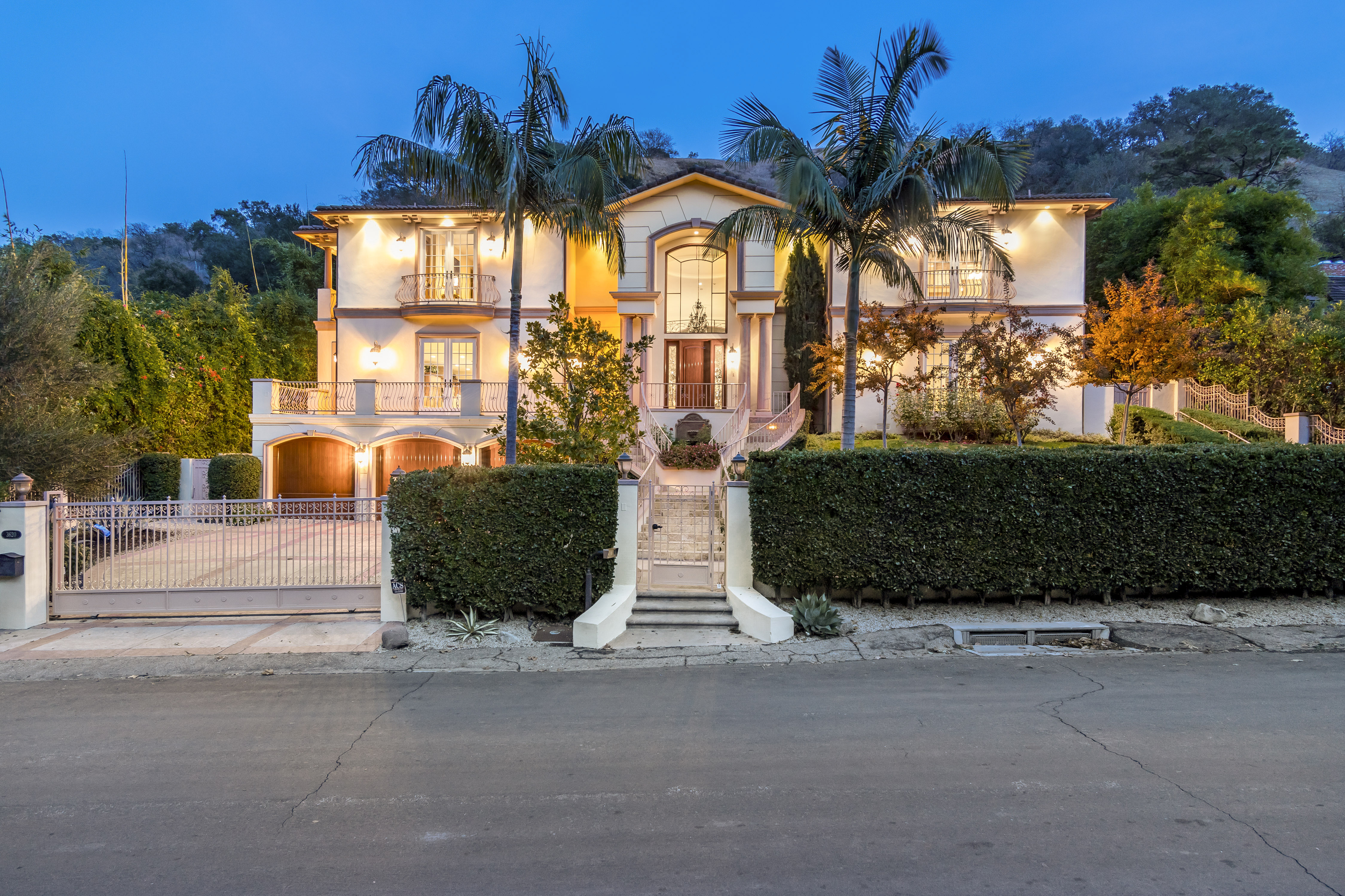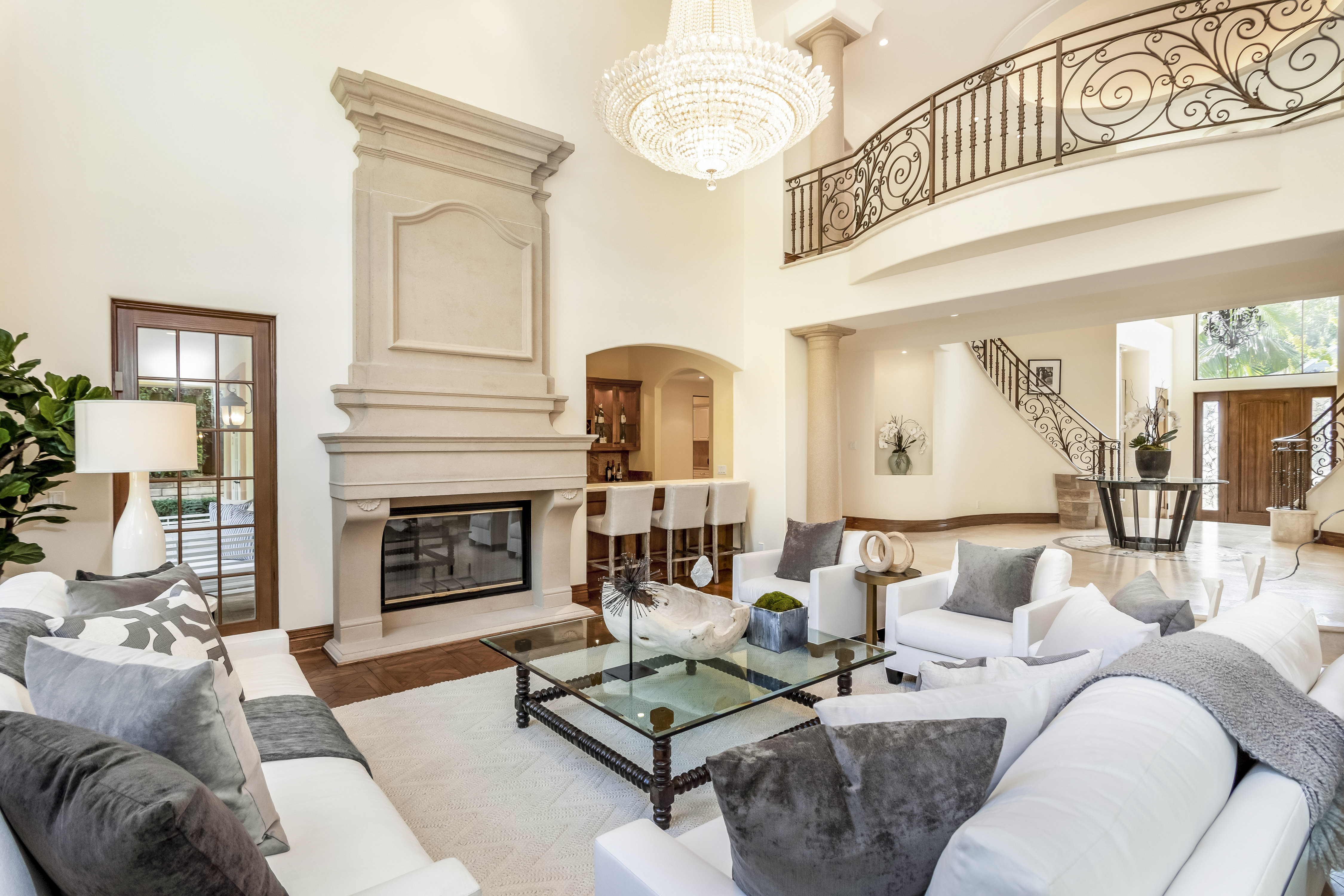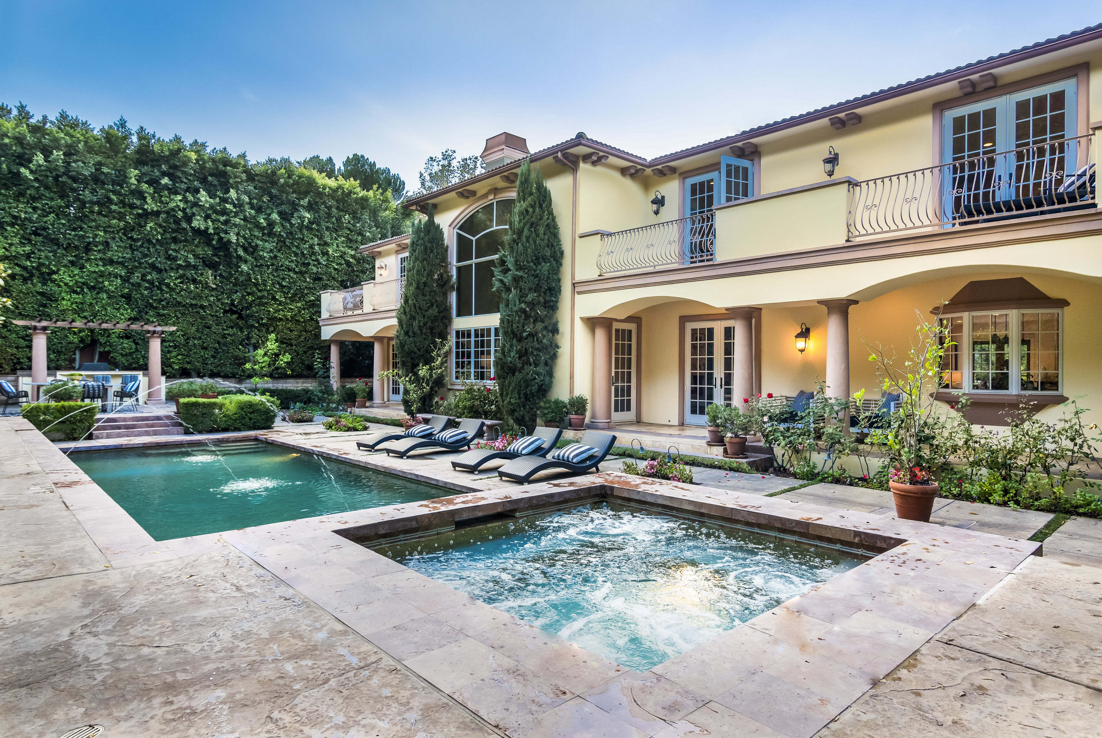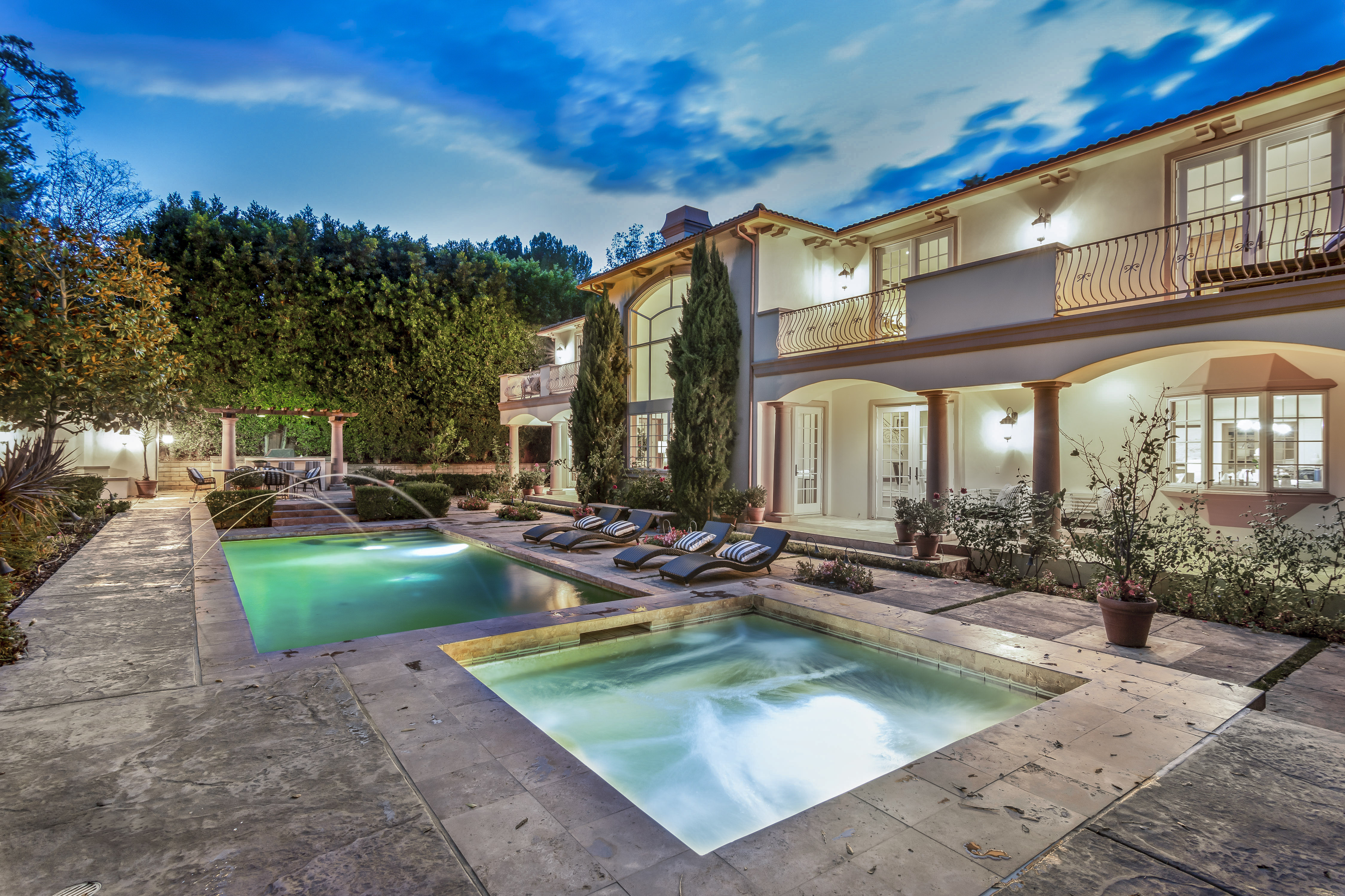 Sitting on almost an acre down a quiet street in the prestigious Longridge Estates, is this breathtaking Mediterranean Estate. This stunning home offers 6 bedrooms, 9 bathrooms, and almost 7,500 sft. As you go beyond privacy gates and enter the home, you are greeted by the spectacular entry with high pitched ceilings and a double grand staircase. On the main floor, the living room features two story windows, an opulent fireplace, wine room and wet bar. The spacious formal dining room flows into the incredible chef’s kitchen with stainless steel top of the line appliances, large center island, and an abundance of cabinets. The kitchen opens directly to the large and well appointed family room. Hardwood floors, crown moldings, custom built-ins, doors and windows overlooking and opening out to lush gardens. The first floor also holds two of the six bedrooms, each with their own bath. Upstairs the South wing of the home holds a private master retreat with large bedroom, sitting room, 2 extensive walk in closets, multiple balconies, and a luxurious bathroom. A see through fireplace is shared by the bedroom and bathroom. Connecting the two wings is a lovely family room area with french doors that open to a large balcony. The remaining four bedrooms each have their own private balconies and en suite bathrooms. On the lower level of the home, there a huge bonus room, wired to be used as a home theatre but also great as a gym, dance studio, or game room. The spacious backyard has a large salt water pool/spa and beautiful gardens with mature trees for total privacy. The backyard features separate sitting areas, bubbling fountain, and built in BBQ area w/ Viking grill, fridge, and wet bar, perfect for outdoor entertaining. Additional features include a 3-car garage, sound wiring throughout, security system, water softener, and so much more!