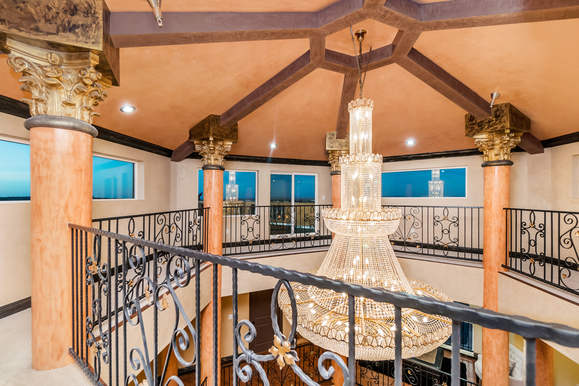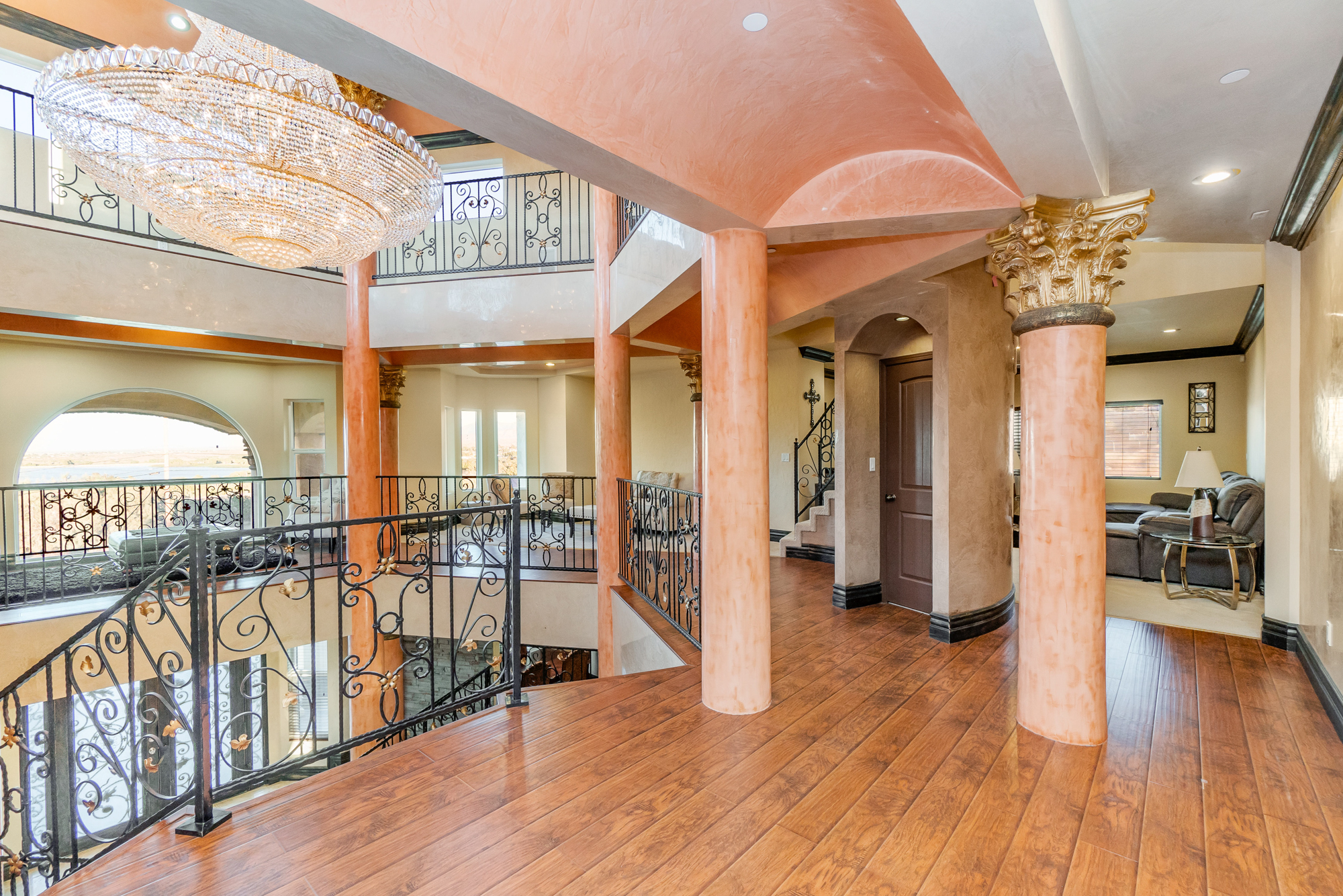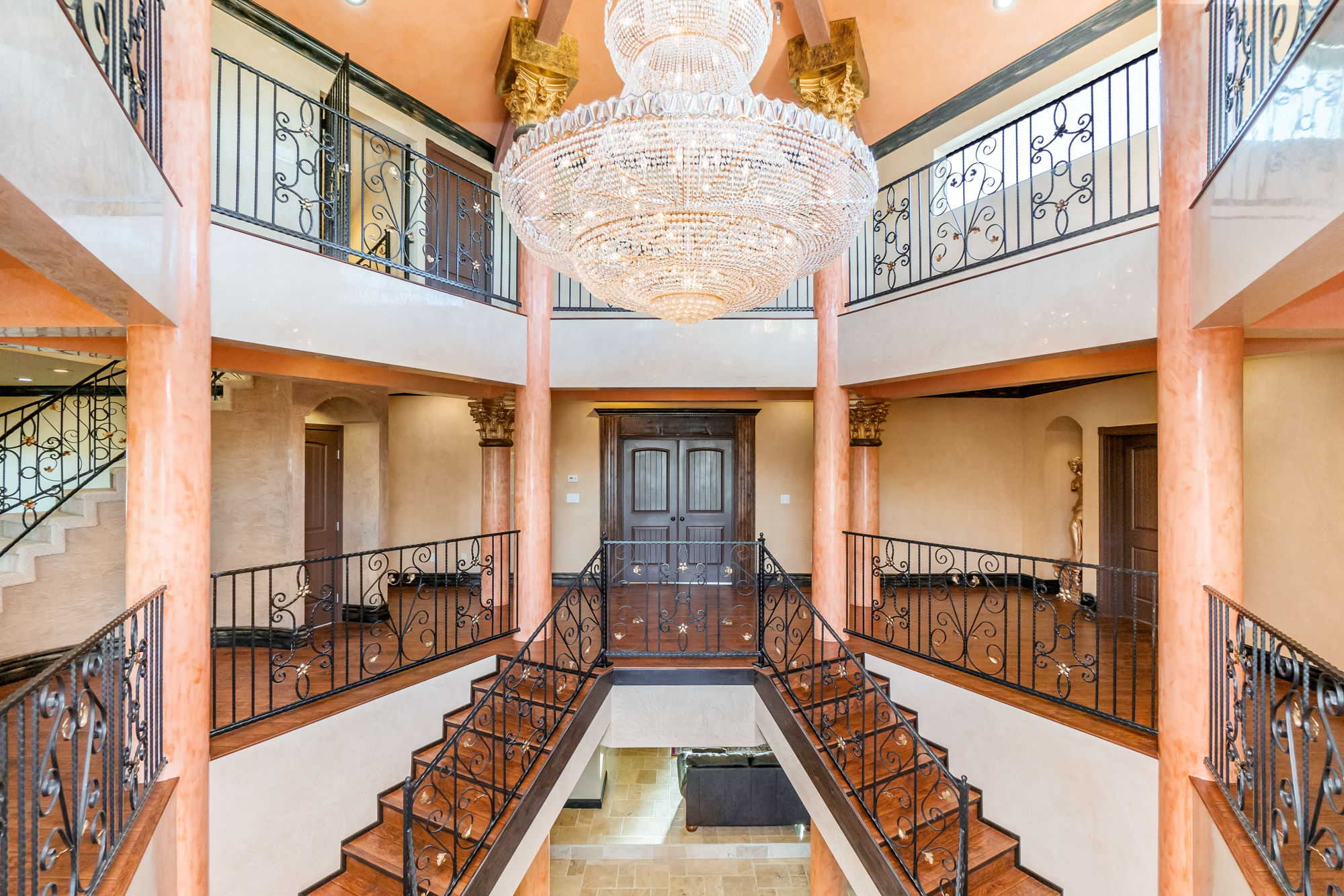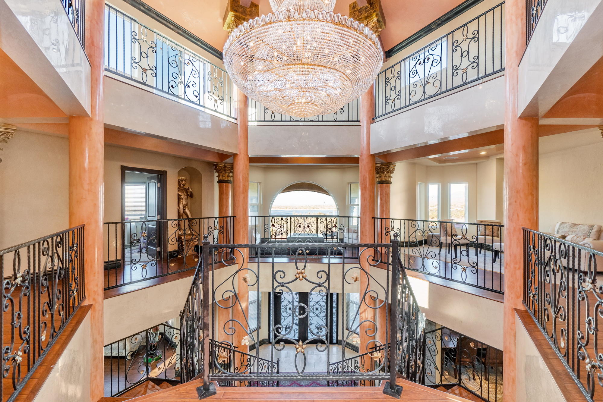 Welcome to your very own custom mediterranean palace situated on over a 2 acre lot. Access this estate via private drive leading to exclusive gates welcoming you through the massive circular driveway w/ a stunning centerpiece fountain. This showstopping home boasts just under 6,700 sqft of luxurious refinement. Upon entry you are greeted w/ an elegant foyer featuring an oversized chandelier, soaring ceilings, large columns, artistry, imported travertine, venetian plaster, & rich custom craftsmanship that extends all throughout. The main level offers an incredible open floor plan designed for effortless entertaining- formal living room, massive dining room, large family room, breakfast room, bonus room, & ensuite bedroom. Gourmet chef?s kitchen features a center island w/ room for seating, 2 walk in pantries, top of the line appliances, & 2 oversized sinks. Dual stairs lead up to the 2nd floor featuring 4 outstanding ensuite bedrooms, family room, laundry room, & lounge space w/ large windows w/ obstructed views of the gleaming Lake. Master suite offers private balcony, walk in closet, jacuzzi tub, privacy toilet, & dual sinks. 3rd floor wraparound looks to the downstairs floors & leads to rooftop patio, perfect for hosting or lounging & gazing at the stars. Vast backyard has plenty of space for all your needs w/ a kids playground & an additional 1 acre w/ private road for adding building. This outstanding estate checks all the boxes for private, luxurious living.