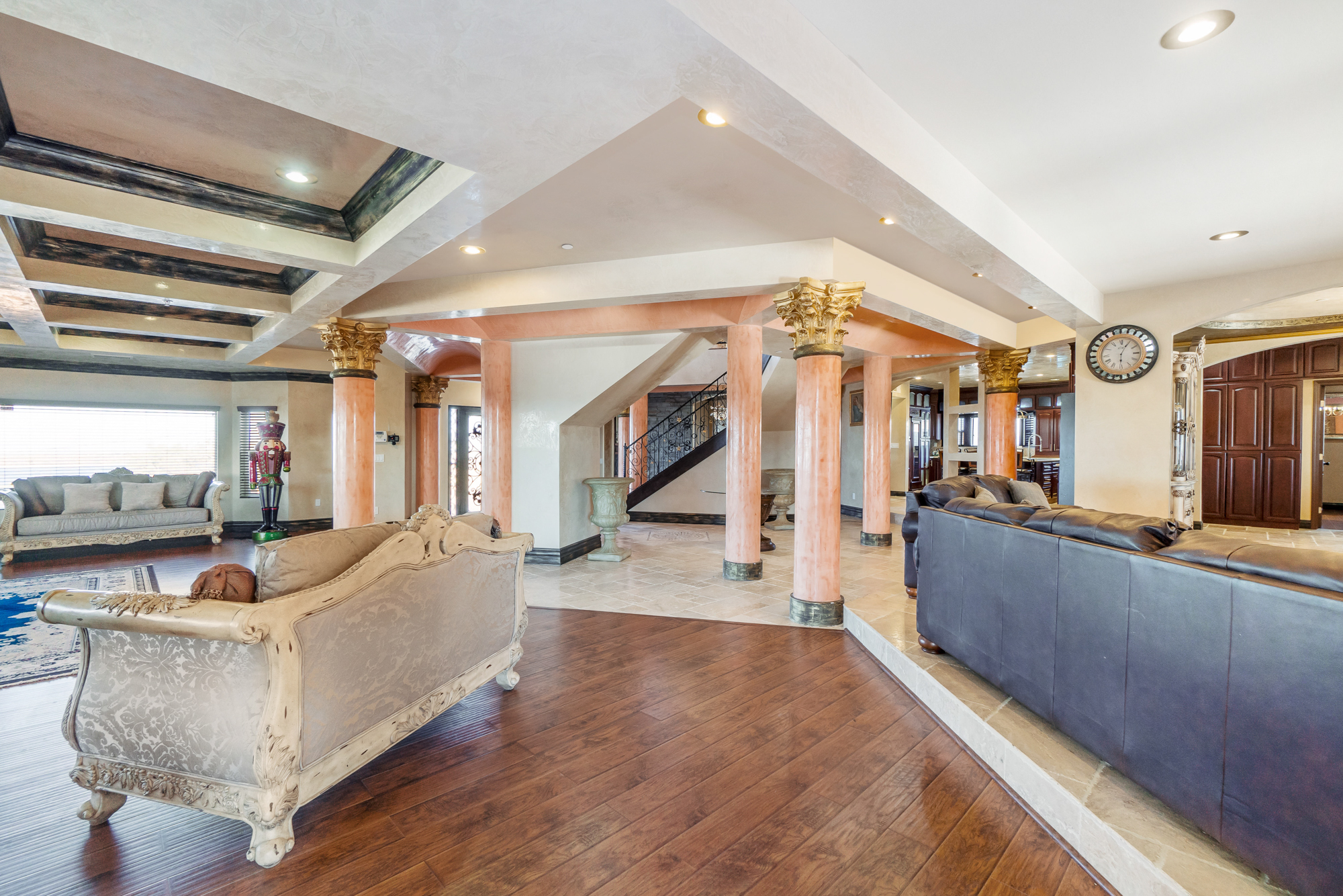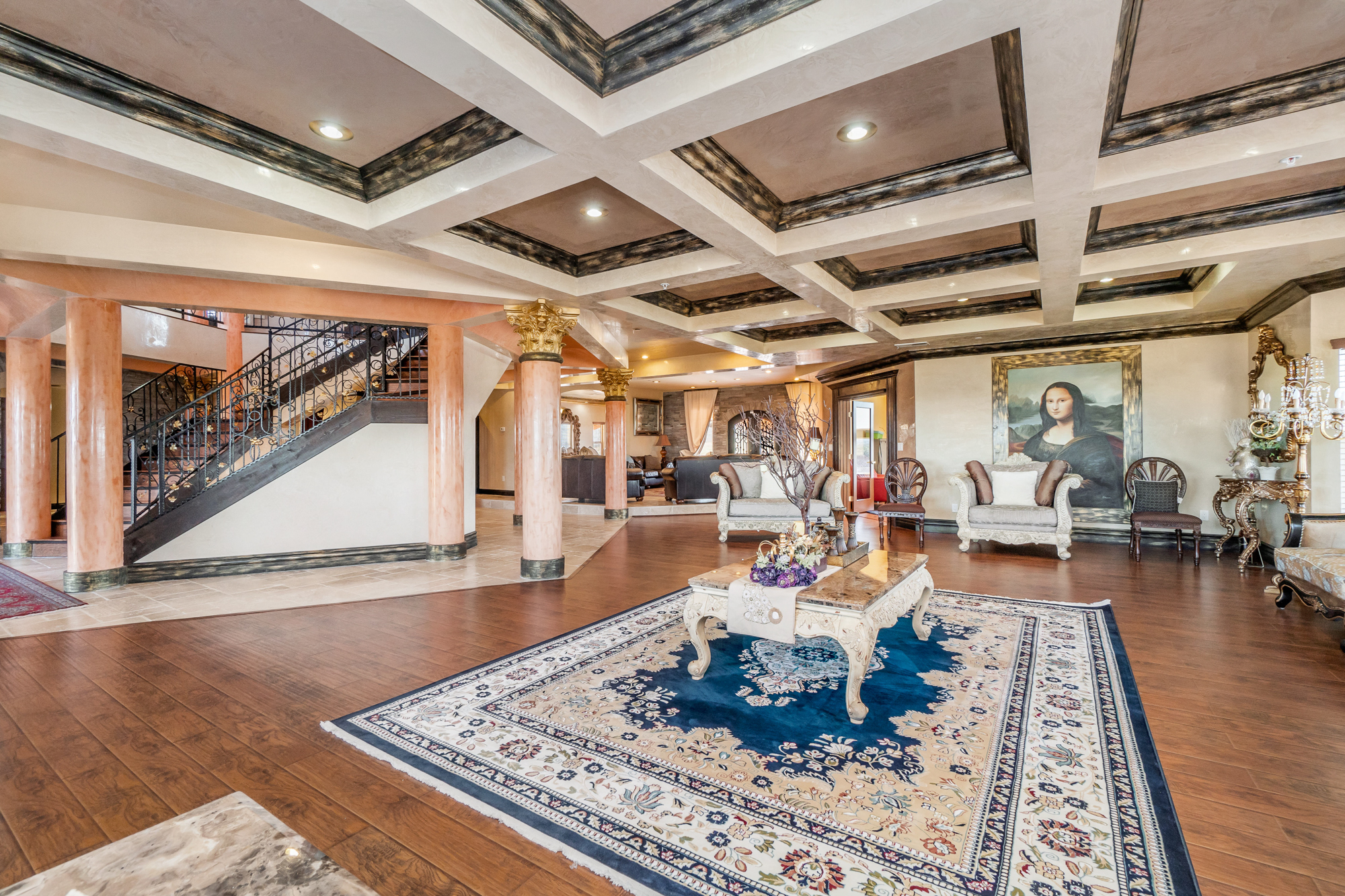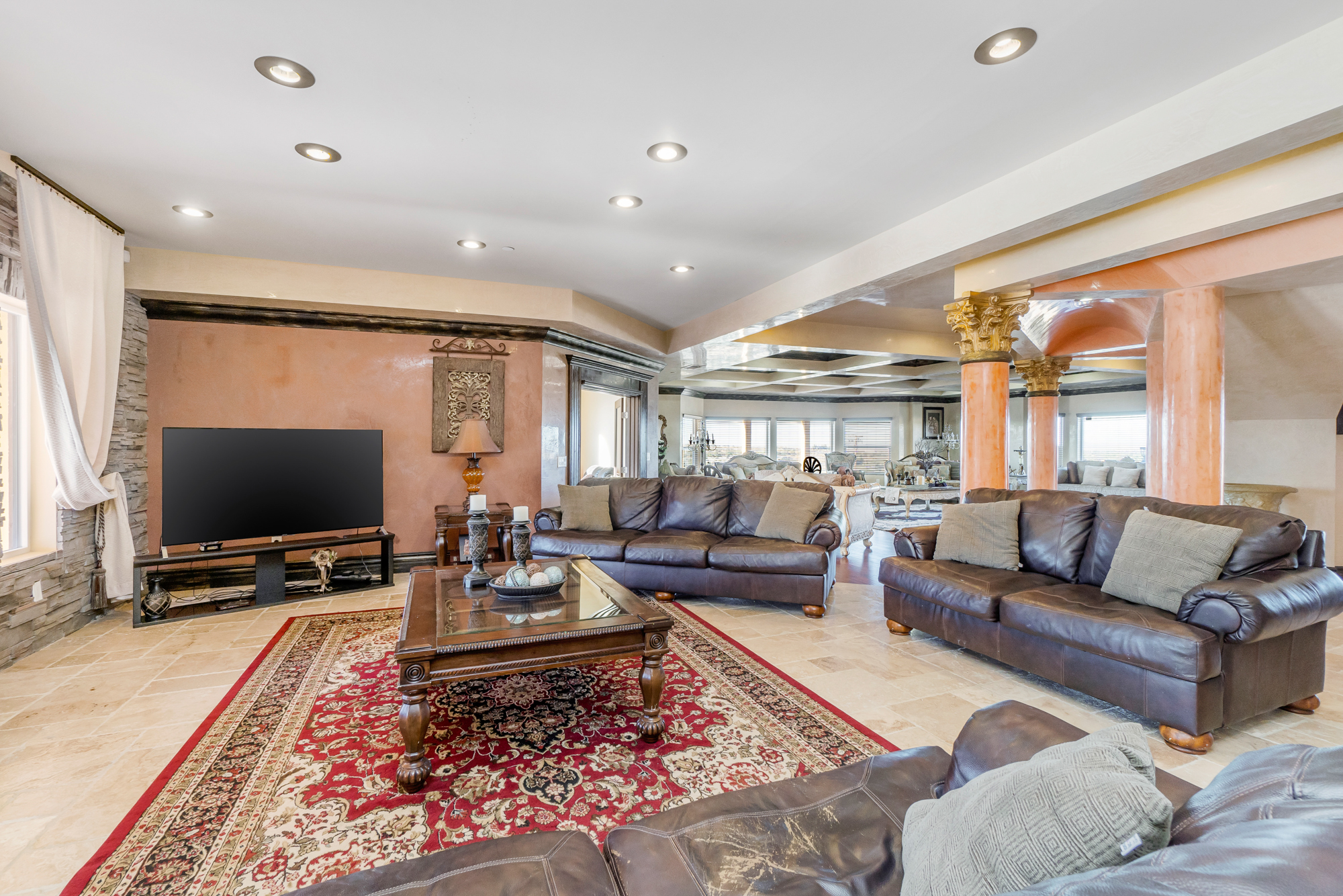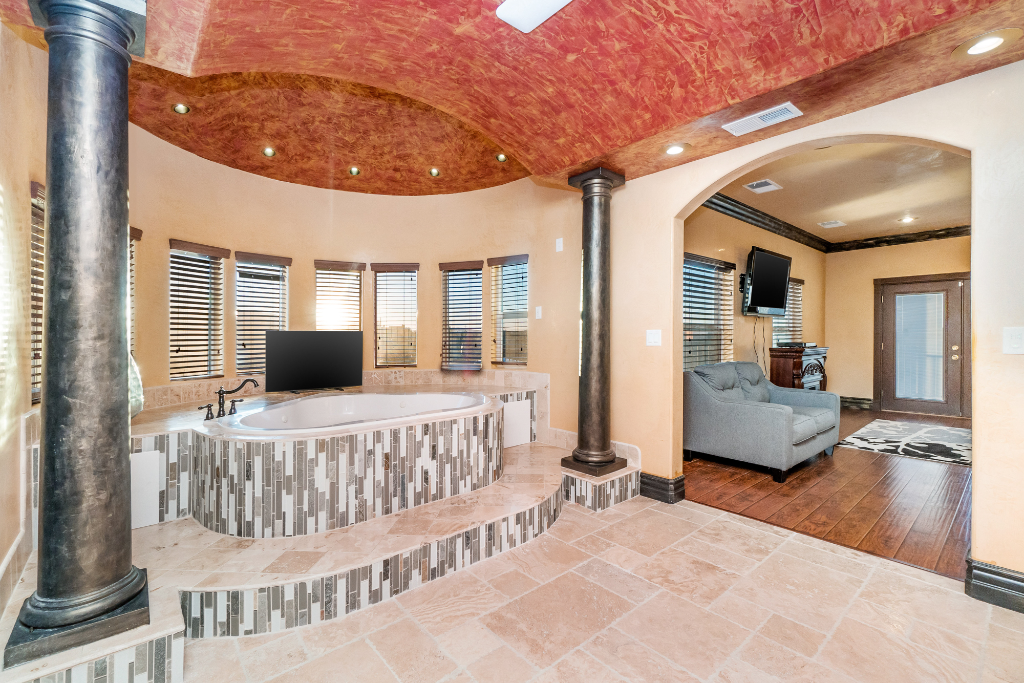 Welcome to your very own custom mediterranean palace situated on over a 2 acre lot. Access this estate via private drive leading to exclusive gates welcoming you through the massive circular driveway w/ a stunning centerpiece fountain. This showstopping home boasts just under 6,700 sqft of luxurious refinement. Upon entry you are greeted w/ an elegant foyer featuring an oversized chandelier, soaring ceilings, large columns, artistry, imported travertine, venetian plaster, & rich custom craftsmanship that extends all throughout. The main level offers an incredible open floor plan designed for effortless entertaining- formal living room, massive dining room, large family room, breakfast room, bonus room, & ensuite bedroom. Gourmet chef?s kitchen features a center island w/ room for seating, 2 walk in pantries, top of the line appliances, & 2 oversized sinks. Dual stairs lead up to the 2nd floor featuring 4 outstanding ensuite bedrooms, family room, laundry room, & lounge space w/ large windows w/ obstructed views of the gleaming Lake. Master suite offers private balcony, walk in closet, jacuzzi tub, privacy toilet, & dual sinks. 3rd floor wraparound looks to the downstairs floors & leads to rooftop patio, perfect for hosting or lounging & gazing at the stars. Vast backyard has plenty of space for all your needs w/ a kids playground & an additional 1 acre w/ private road for adding building. This outstanding estate checks all the boxes for private, luxurious living.