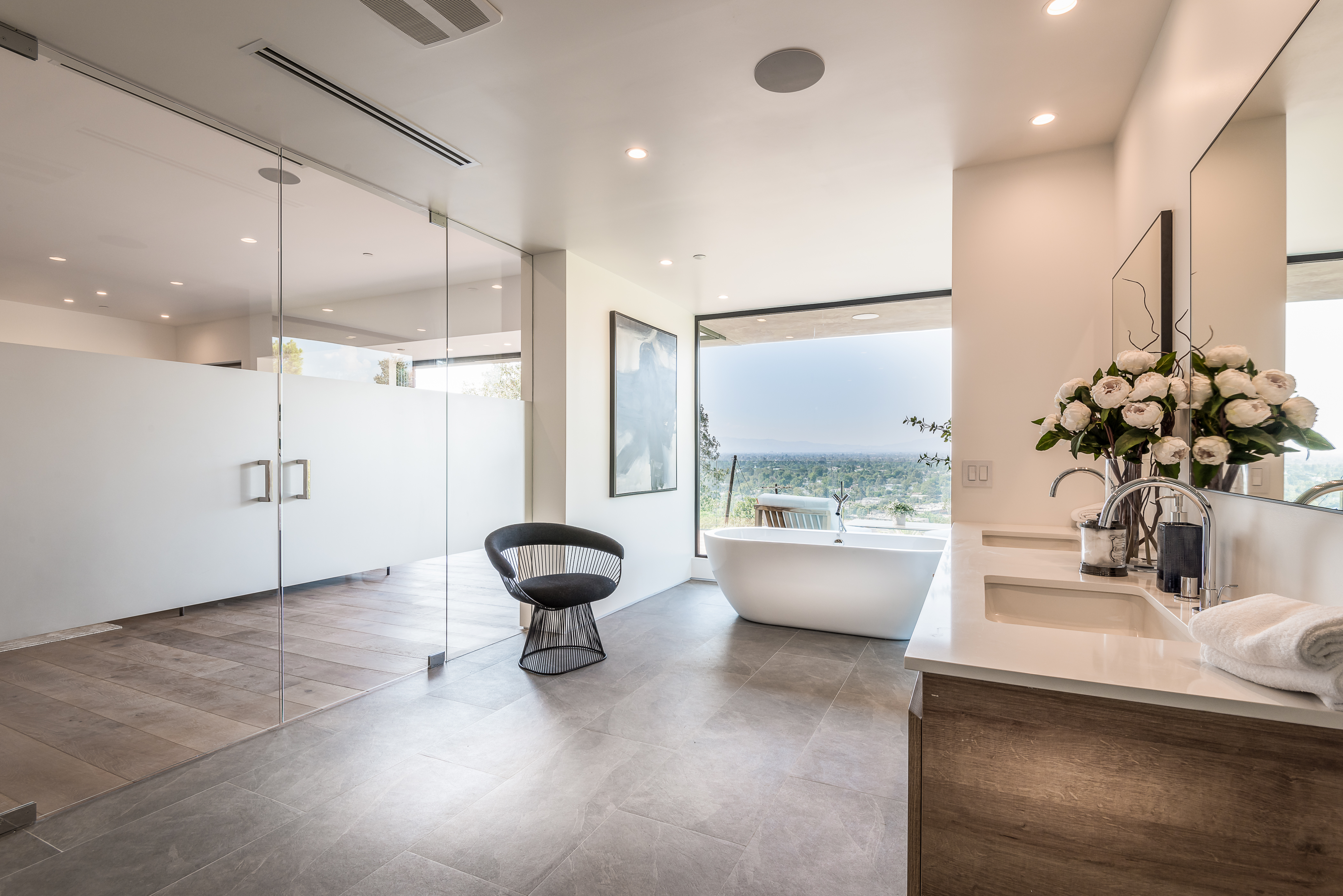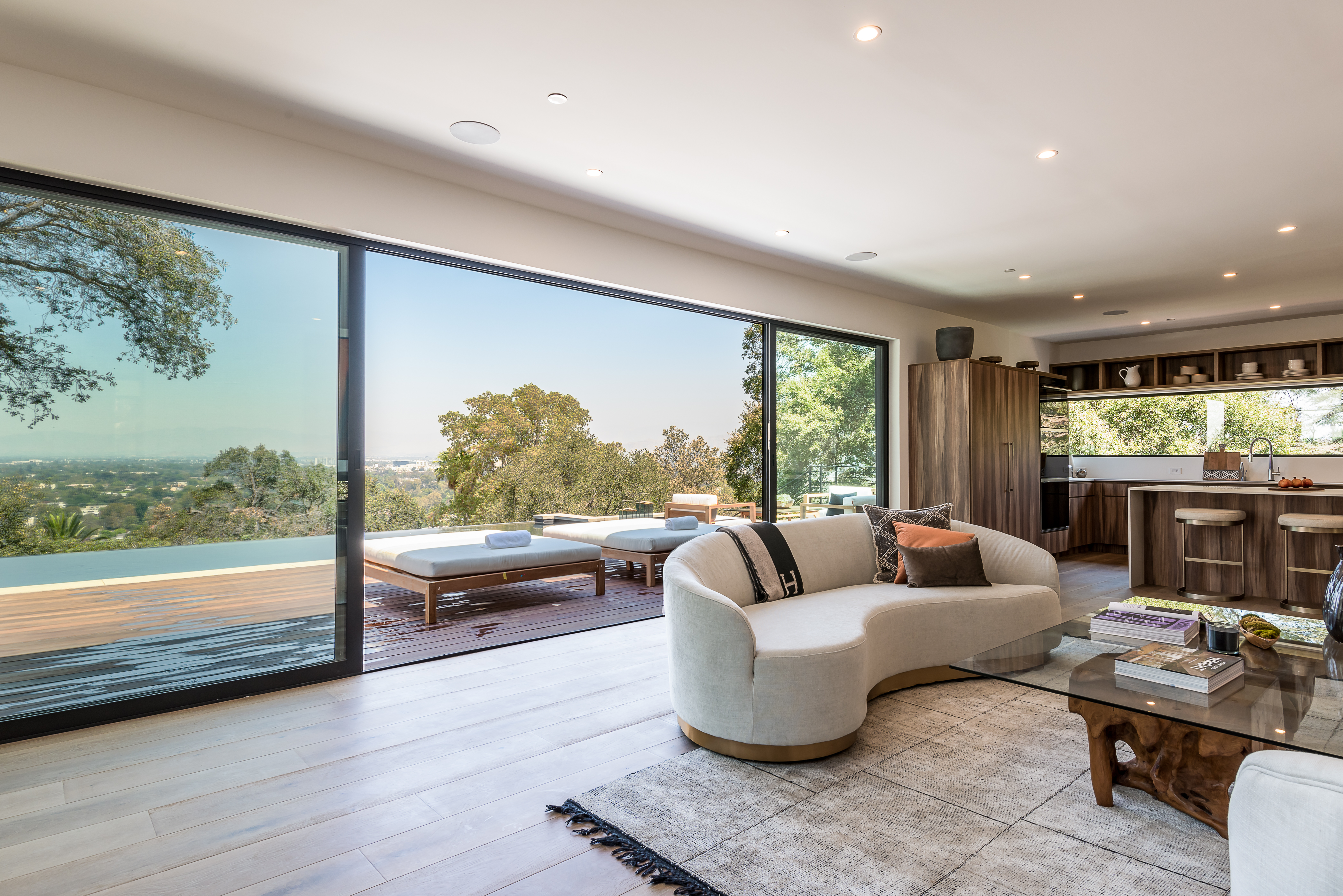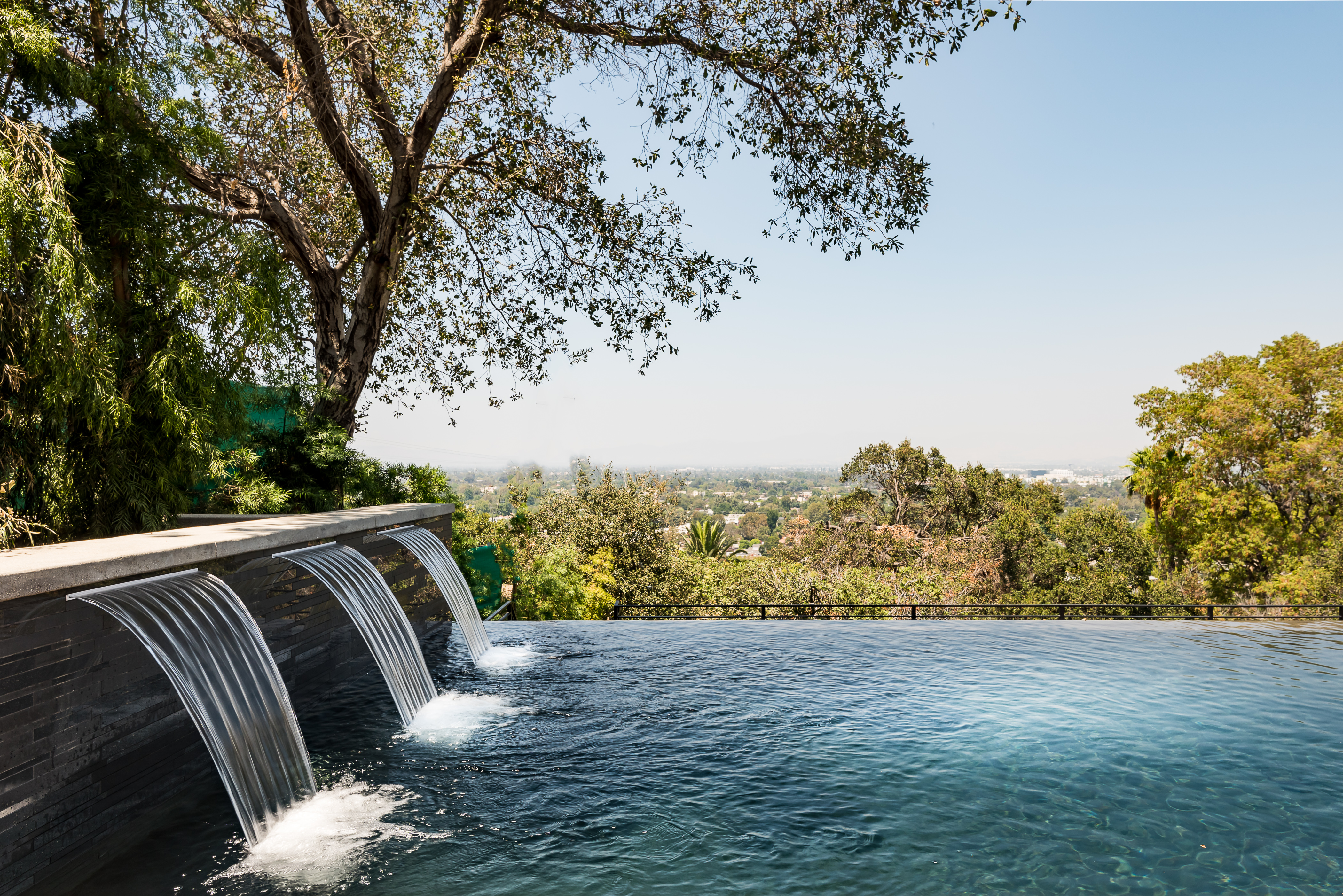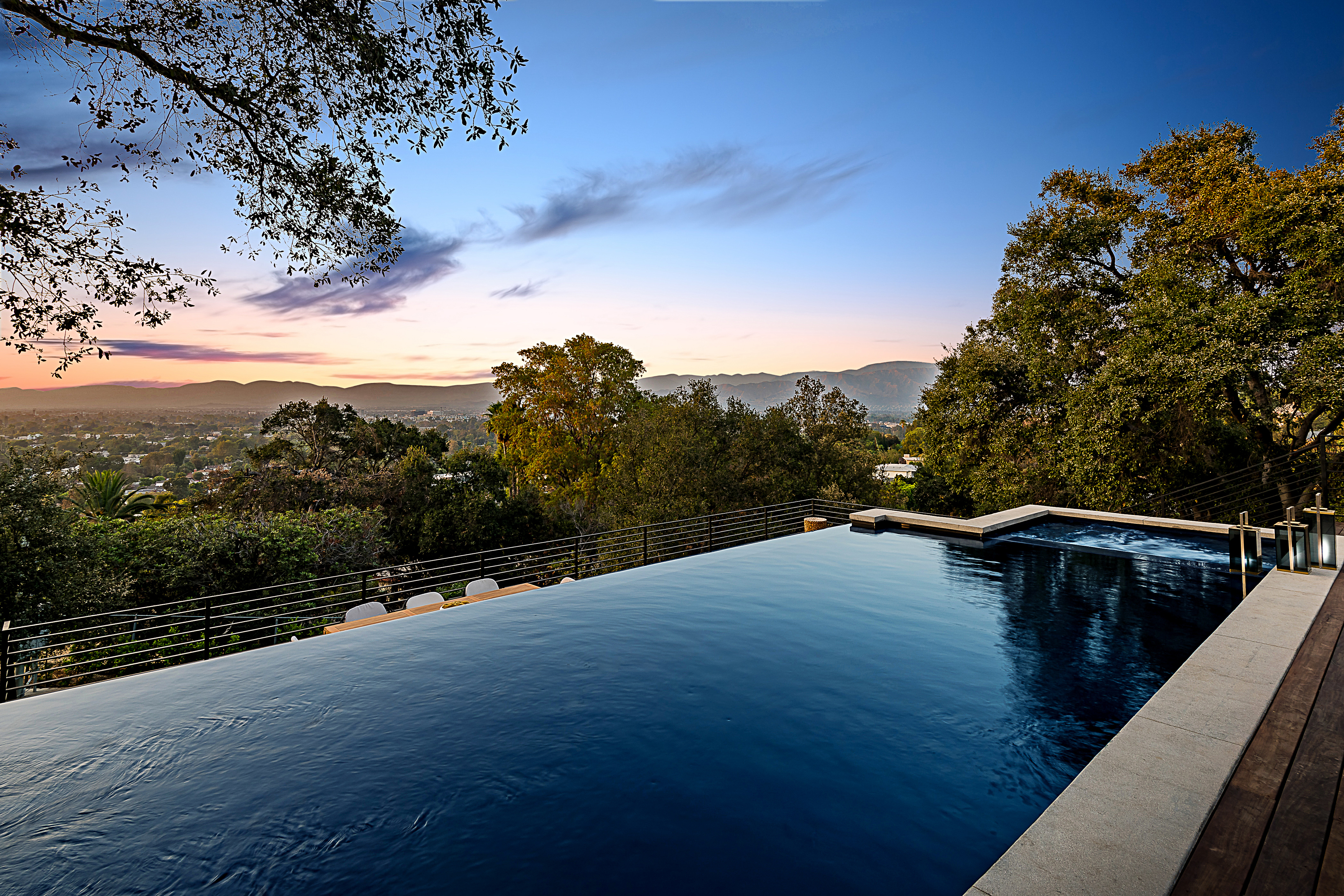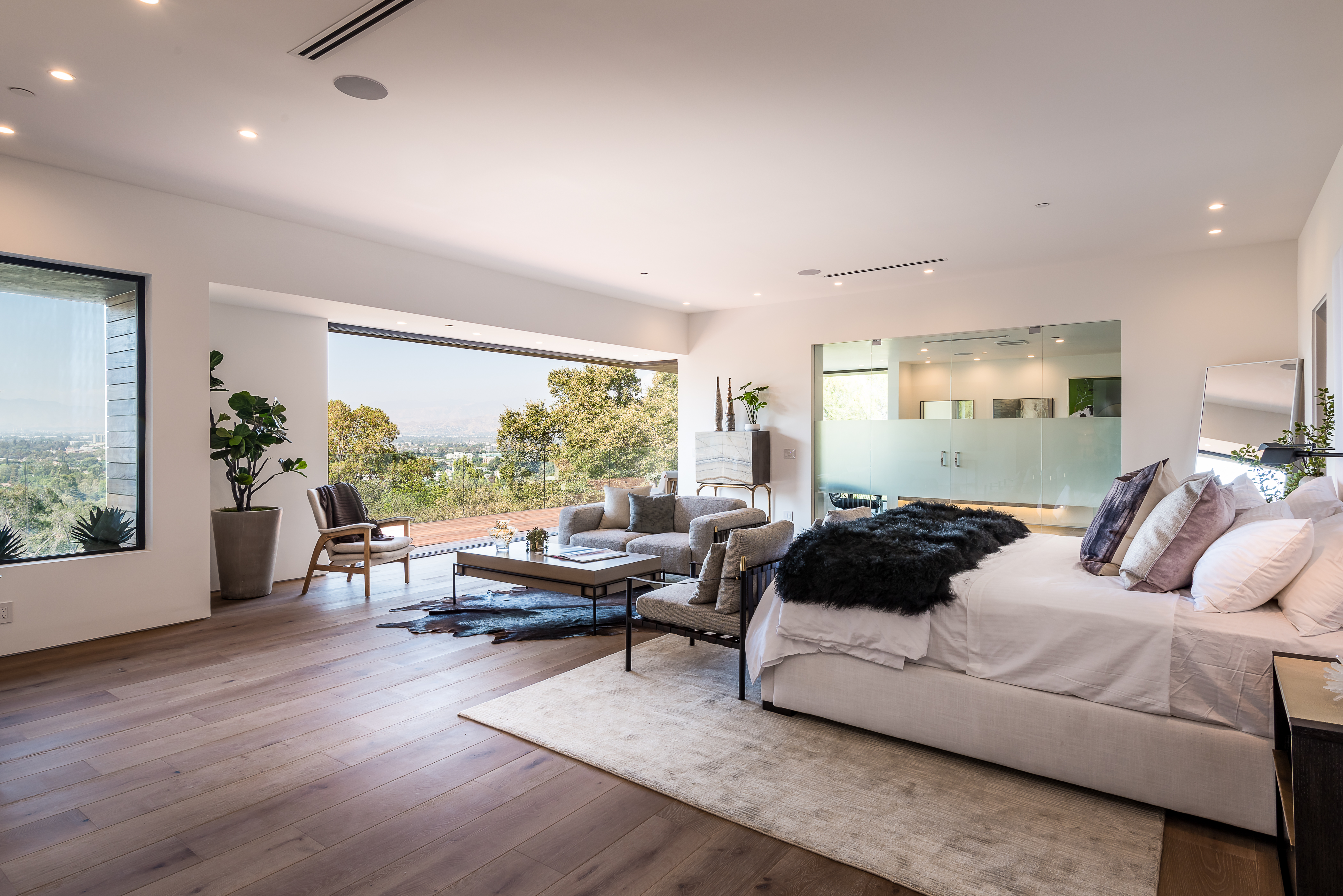 Nestled in the Hills of Studio City, this luxurious contemporary newly developed estate offers a masterful achievement of concept and design. Long driveway leads to a secluded, half acre property with unobstructed city and mountain views. The 5050 square foot modern residence showcases a warm, sophisticated interior, capable of accommodating multiple layout options. Soaring high ceilings and walls of glass seamlessly integrate indoor and outdoor living spaces while bringing phenomenal views to the forefront of the living experience. ccccxpansive lower level includes a linear double sided fireplace, surround sound system, gourmet kitchen with large center stone island. Ensuite bedroom tucked into its own corner downstairs includes private balcony w/ hillside views. A sculptural staircase leads to a second and third level, which holds three light-filled, ensuite bedrooms. A grand 1200 Sq Ft Master suite is equipped with sliding glass doors to a large terrace showcasing stretched valley views, spacious walk in-closets, and exquisite bathroom with a free standing bath tub w/ picturesque views. Serving as a natural extension of the home’s interiors, a zero-edge infinity pool and spa spill over the hillside, while expansive, sunlit decks take full advantage of the sweeping views. A masterpiece in its own right, a separate guest house holds a full kitchen, bedroom, bathroom, and sitting area.