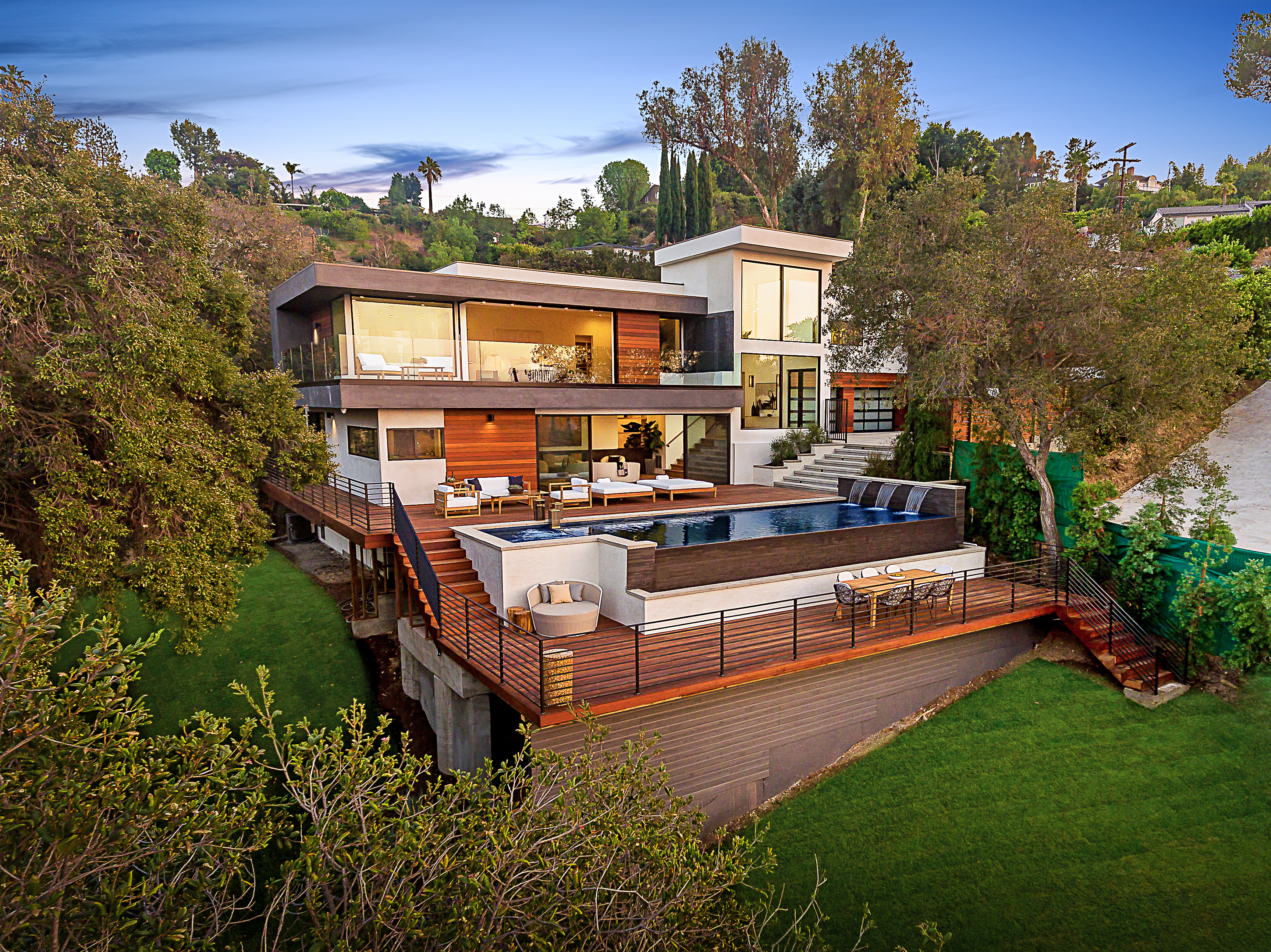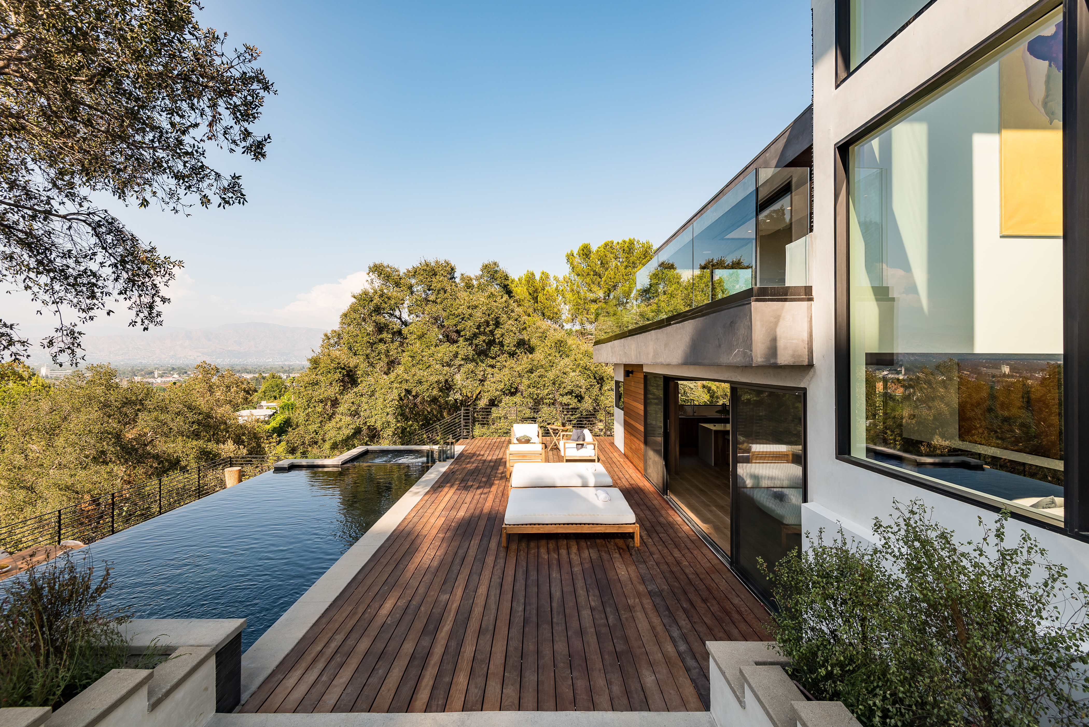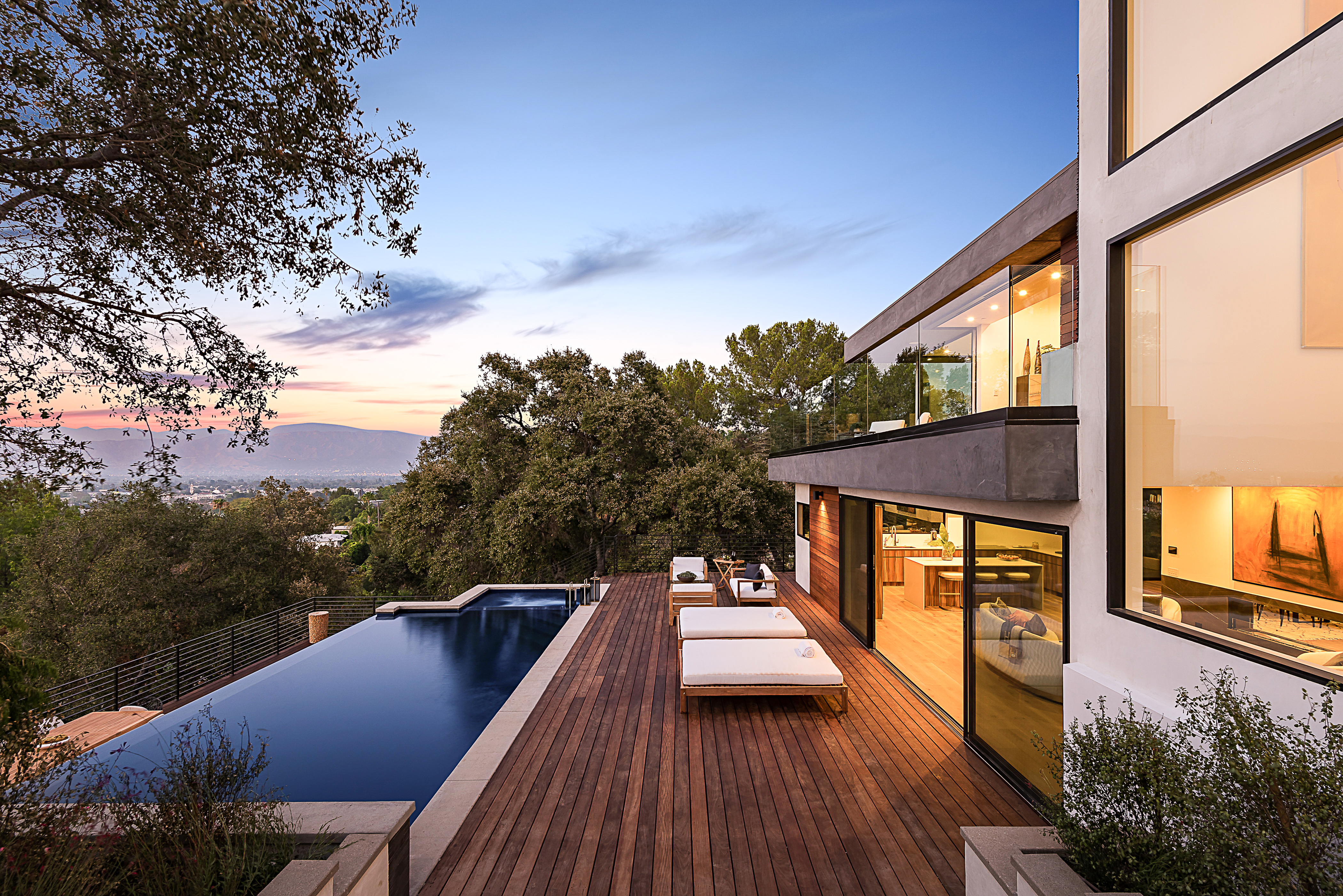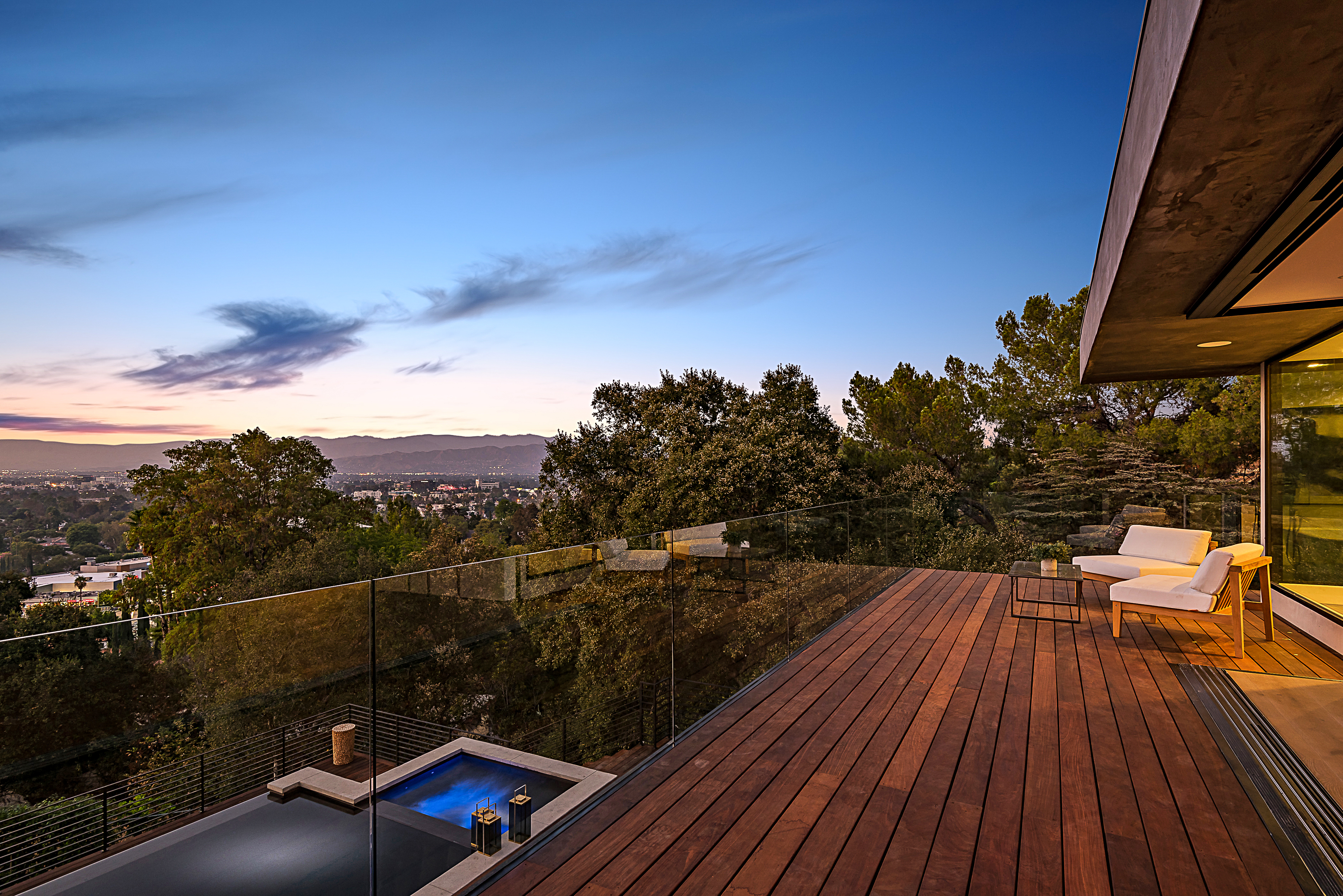 Nestled in the Hills of Studio City, this luxurious contemporary newly developed estate offers a masterful achievement of concept and design. Long driveway leads to a secluded, half acre property with unobstructed city and mountain views. The 5050 square foot modern residence showcases a warm, sophisticated interior, capable of accommodating multiple layout options. Soaring high ceilings and walls of glass seamlessly integrate indoor and outdoor living spaces while bringing phenomenal views to the forefront of the living experience. ccccxpansive lower level includes a linear double sided fireplace, surround sound system, gourmet kitchen with large center stone island. Ensuite bedroom tucked into its own corner downstairs includes private balcony w/ hillside views. A sculptural staircase leads to a second and third level, which holds three light-filled, ensuite bedrooms. A grand 1200 Sq Ft Master suite is equipped with sliding glass doors to a large terrace showcasing stretched valley views, spacious walk in-closets, and exquisite bathroom with a free standing bath tub w/ picturesque views. Serving as a natural extension of the home’s interiors, a zero-edge infinity pool and spa spill over the hillside, while expansive, sunlit decks take full advantage of the sweeping views. A masterpiece in its own right, a separate guest house holds a full kitchen, bedroom, bathroom, and sitting area.