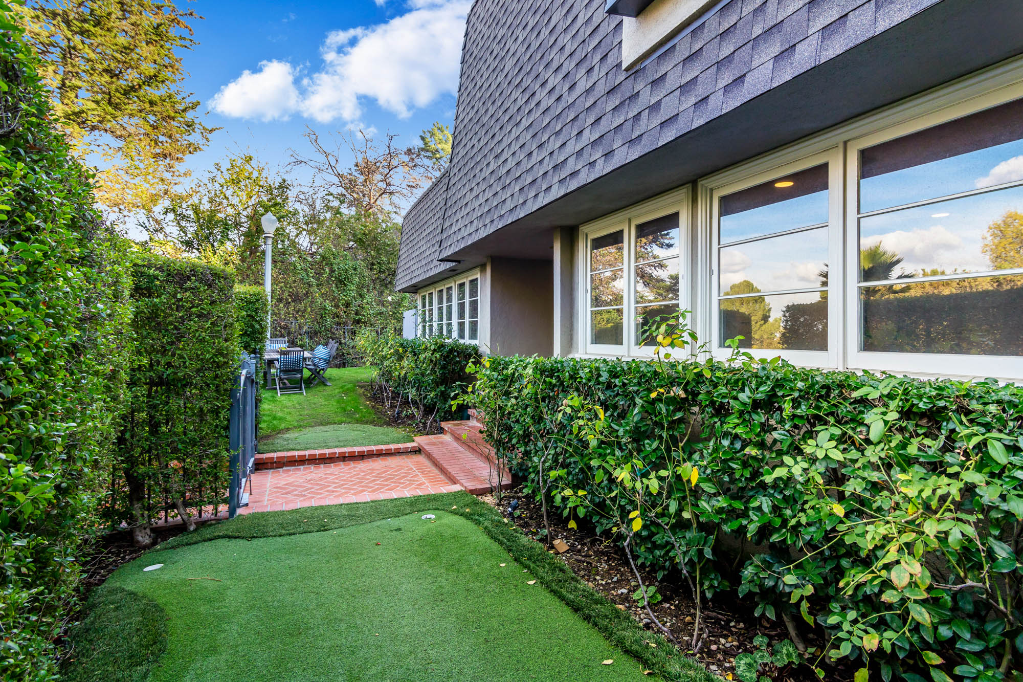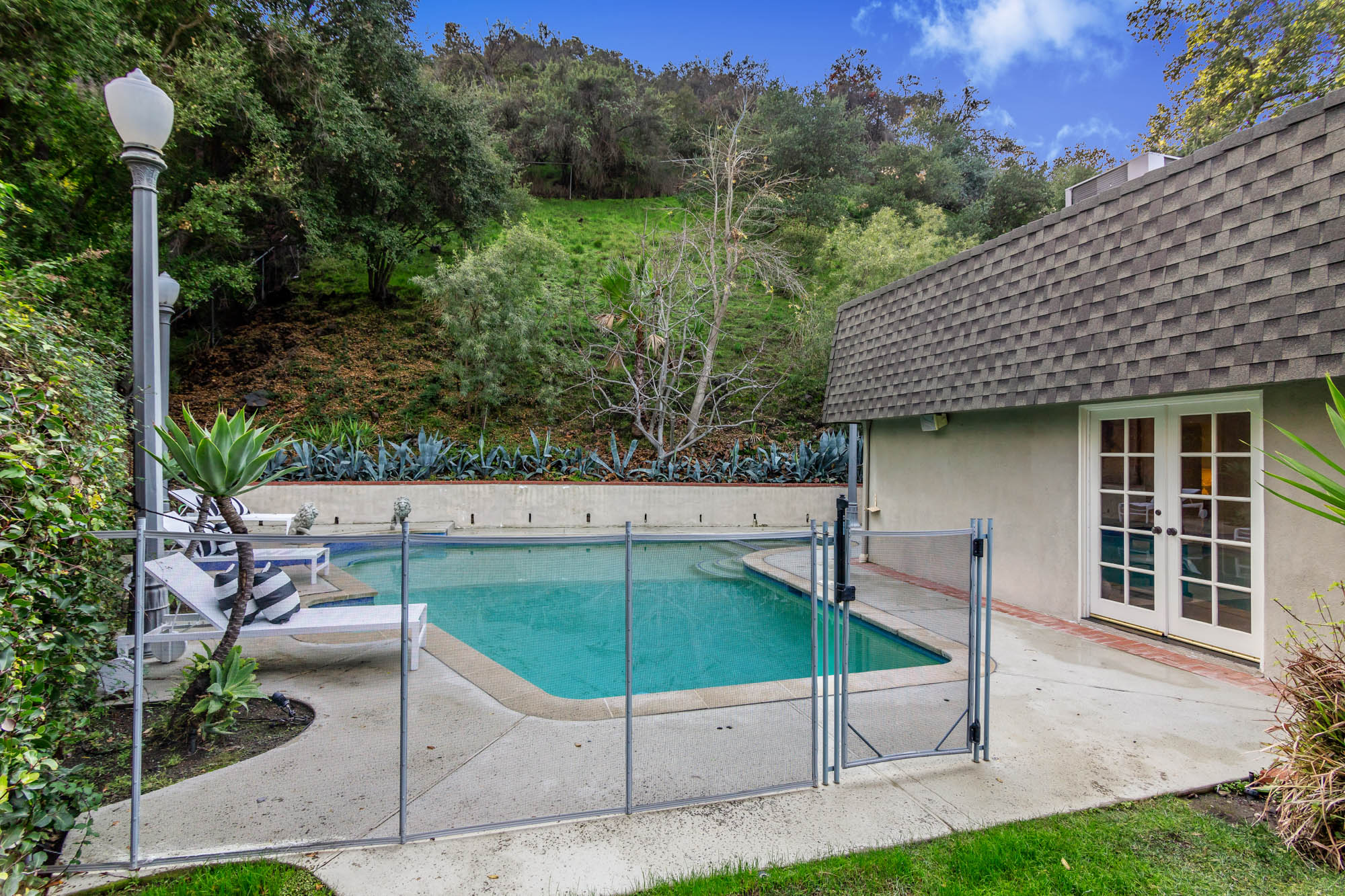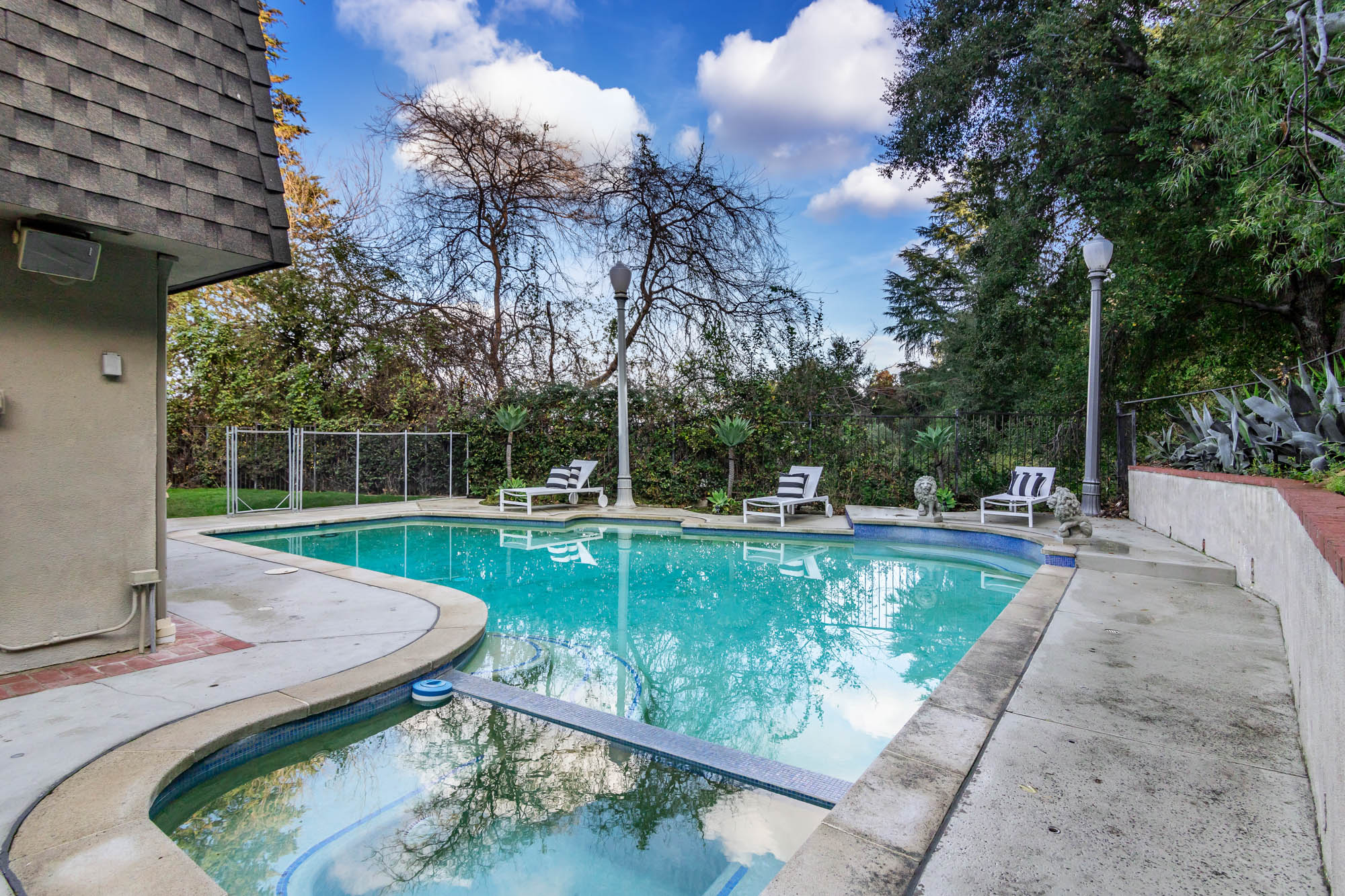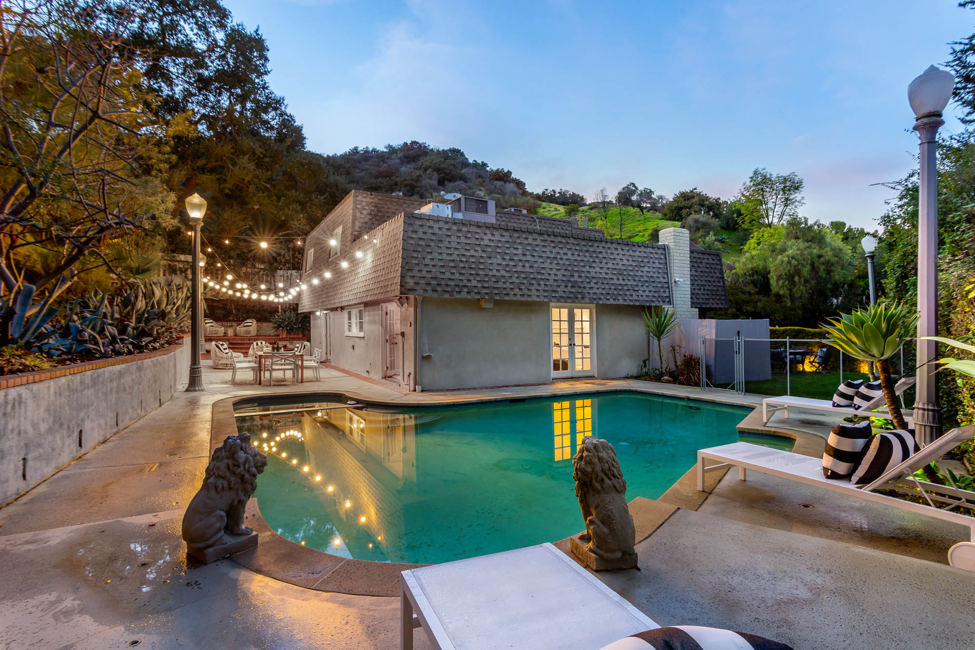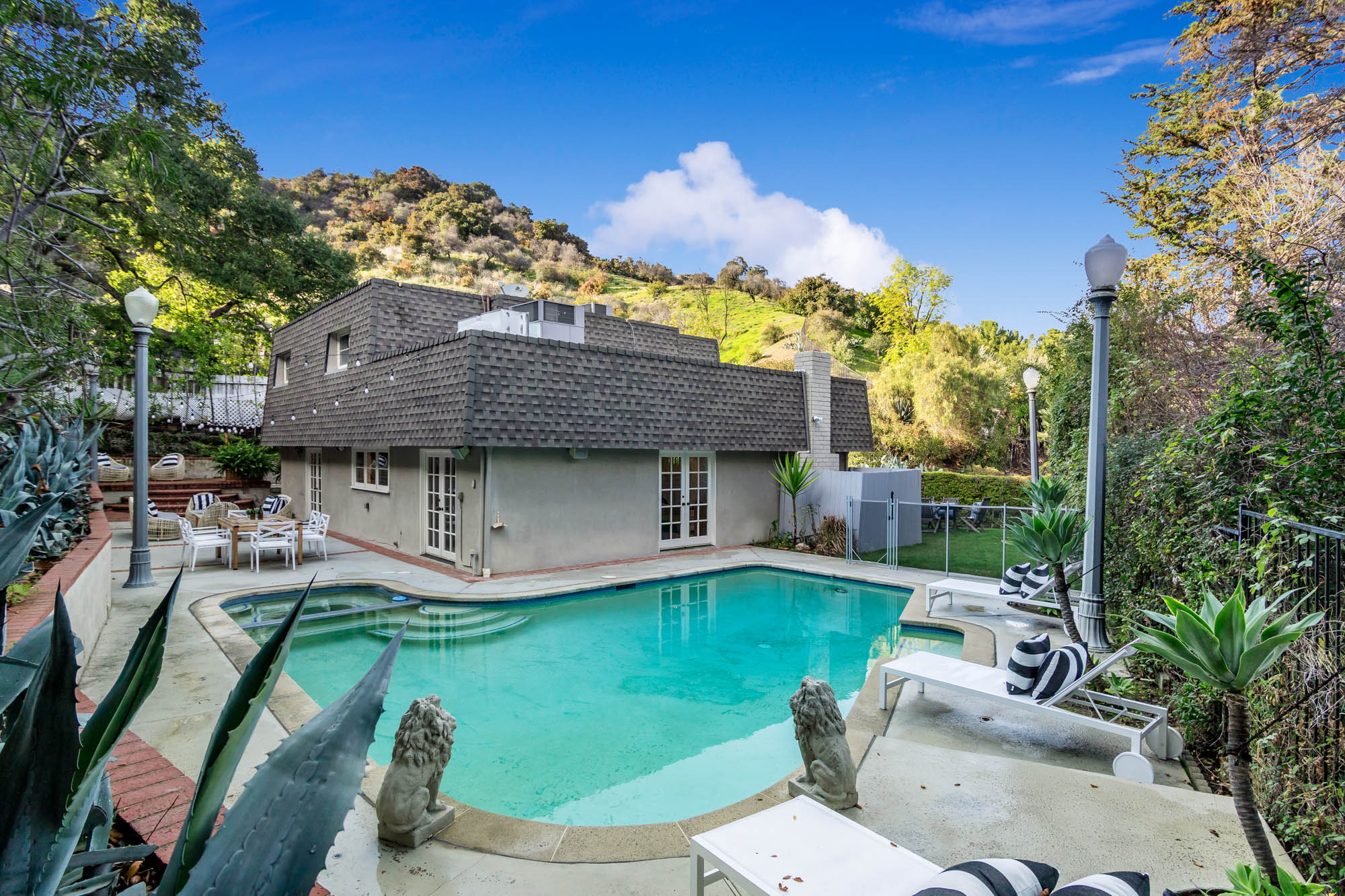 Welcome home to this charmingly updated 3 bedroom 3 bathroom home in the hills of Encino in Lanai School District. Located on a cul de sac, this home encompasses privacy and peek-a-boo views all in one. Through the gated courtyard and front door, you’re greeted by a family living room with plenty of natural light. Continuing past the family room, a chef’s kitchen awaits. Featuring double ovens, a six burner stove, marble countertops, and a breakfast nook, this kitchen has everything you could want and need. Plenty of counter space and storage continue along all sides of the kitchen. French doors bring in an abundance of natural light and welcome you to the backyard. Conveniently located off of the kitchen is the formal dining room. Open to the dining room, is the living room with fireplace, high ceilings, and french doors to the backyard that makes this a great additional room for entertaining. Upstairs you’ll find your Master Suite with Two walk in closets and master bathroom. Within the bathroom is a spa tub, dual sinks, and a walk in shower with dual shower heads. Down the hall from the Master Suite are two spacious bedrooms and a bathroom. Outside you’ll find a pool & spa, grassy area and plenty of patio space, complete with beautiful lighting, to entertain guests. Additional features include a putting green, built in storage, laundry room, Electrical Vehicle Charger, and built-in speakers.