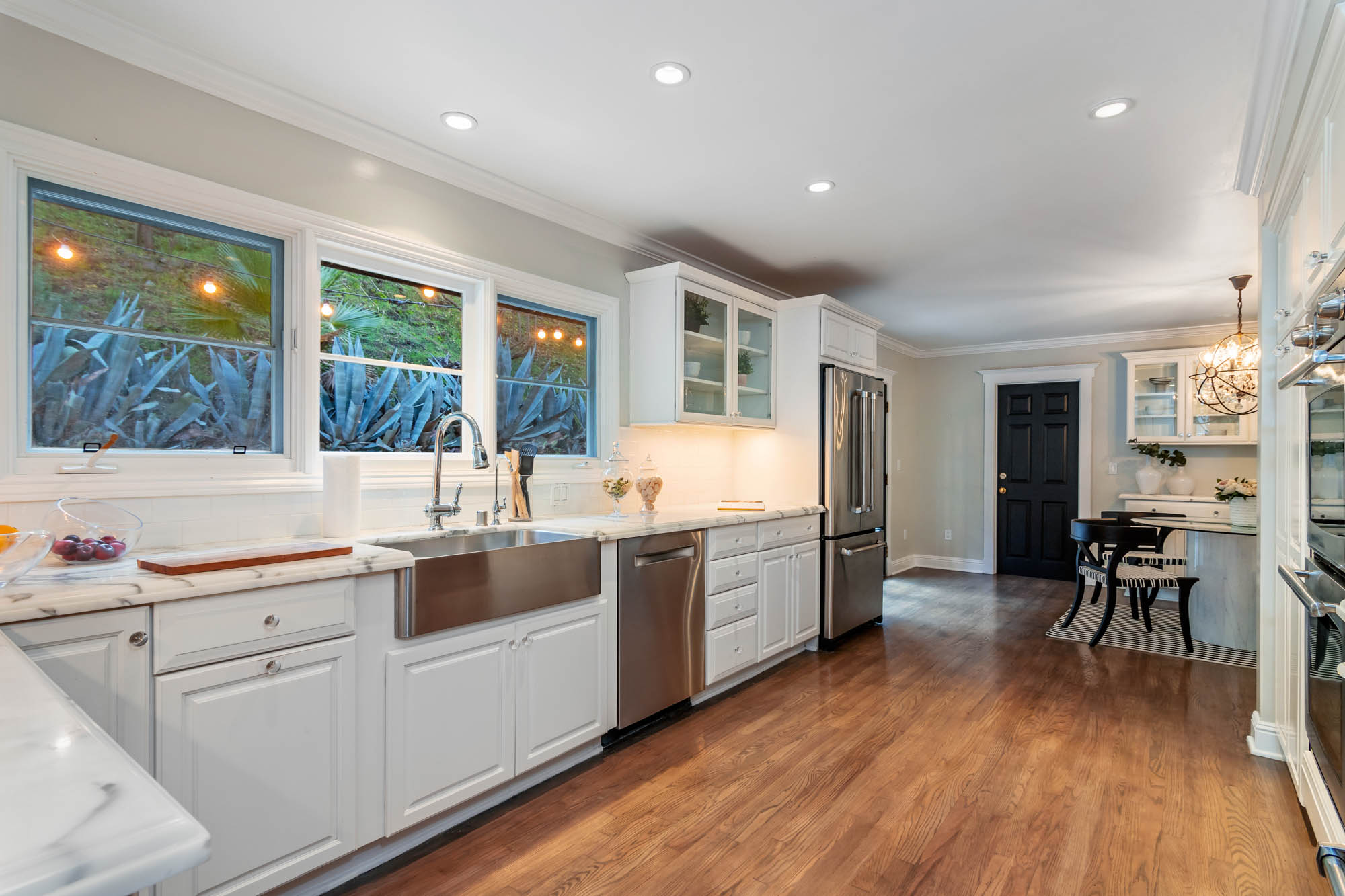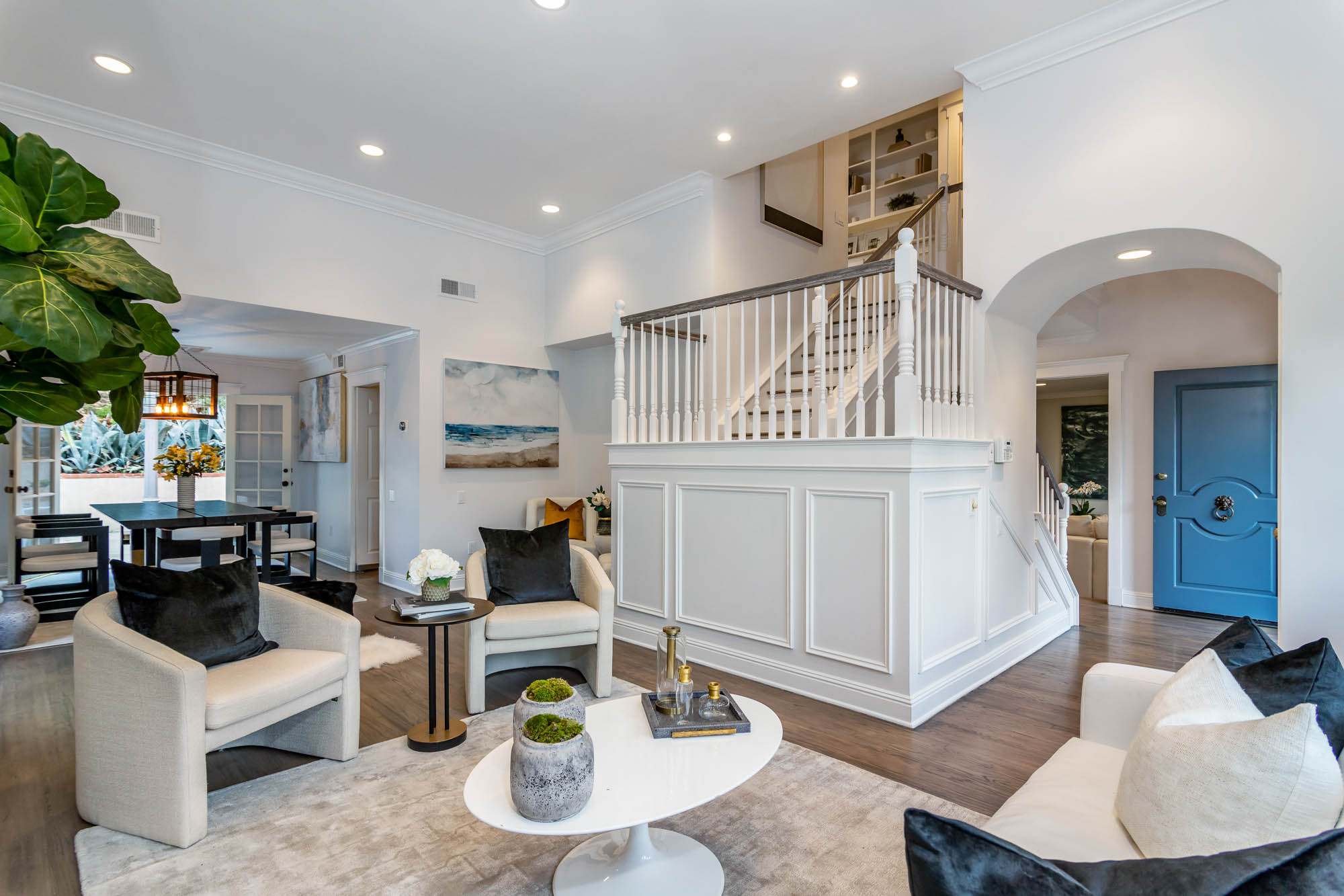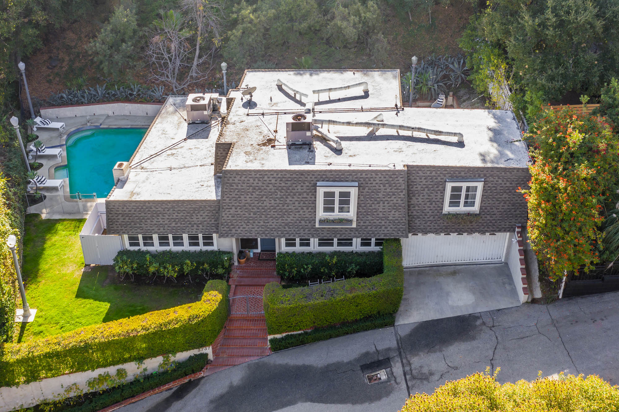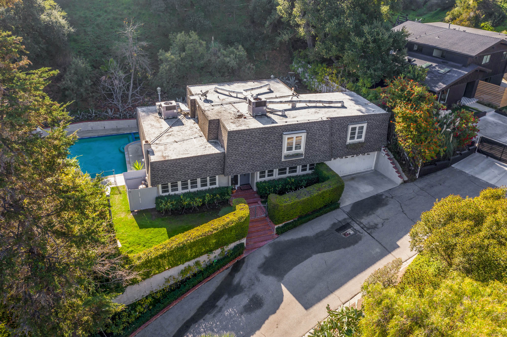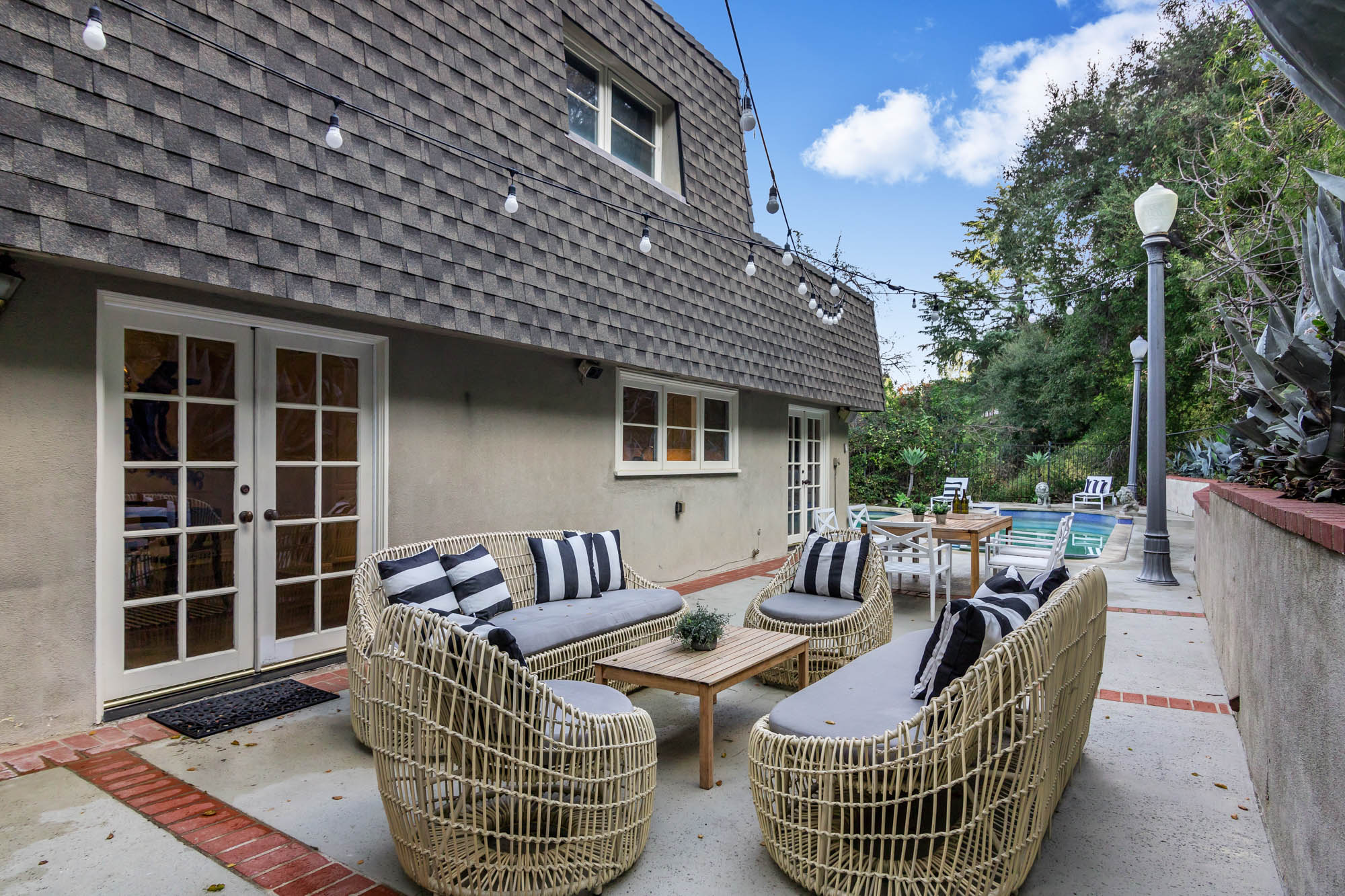 Welcome home to this charmingly updated 3 bedroom 3 bathroom home in the hills of Encino in Lanai School District. Located on a cul de sac, this home encompasses privacy and peek-a-boo views all in one. Through the gated courtyard and front door, you’re greeted by a family living room with plenty of natural light. Continuing past the family room, a chef’s kitchen awaits. Featuring double ovens, a six burner stove, marble countertops, and a breakfast nook, this kitchen has everything you could want and need. Plenty of counter space and storage continue along all sides of the kitchen. French doors bring in an abundance of natural light and welcome you to the backyard. Conveniently located off of the kitchen is the formal dining room. Open to the dining room, is the living room with fireplace, high ceilings, and french doors to the backyard that makes this a great additional room for entertaining. Upstairs you’ll find your Master Suite with Two walk in closets and master bathroom. Within the bathroom is a spa tub, dual sinks, and a walk in shower with dual shower heads. Down the hall from the Master Suite are two spacious bedrooms and a bathroom. Outside you’ll find a pool & spa, grassy area and plenty of patio space, complete with beautiful lighting, to entertain guests. Additional features include a putting green, built in storage, laundry room, Electrical Vehicle Charger, and built-in speakers.