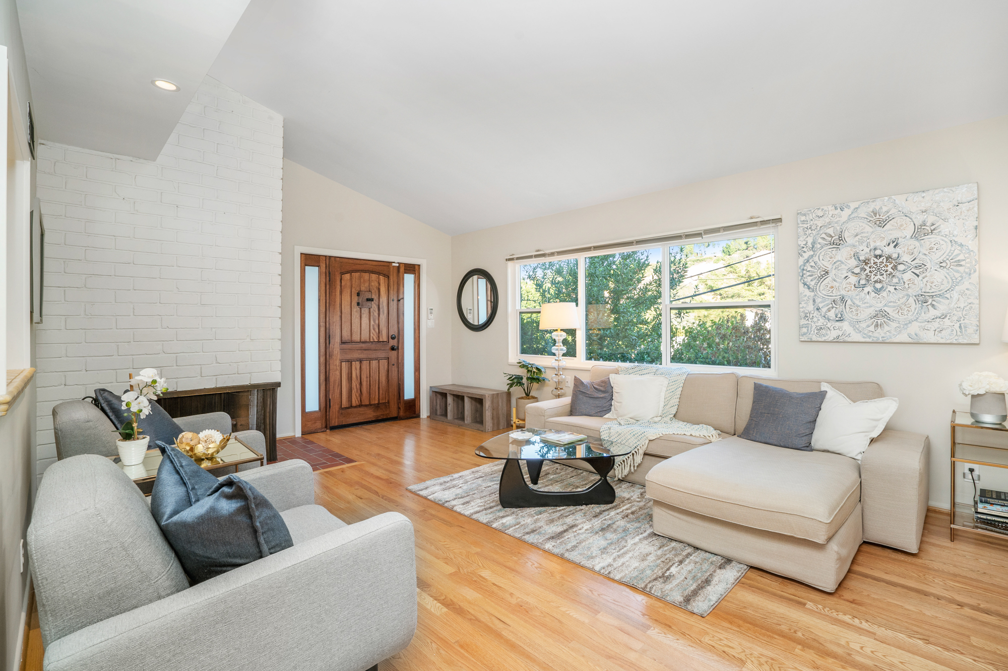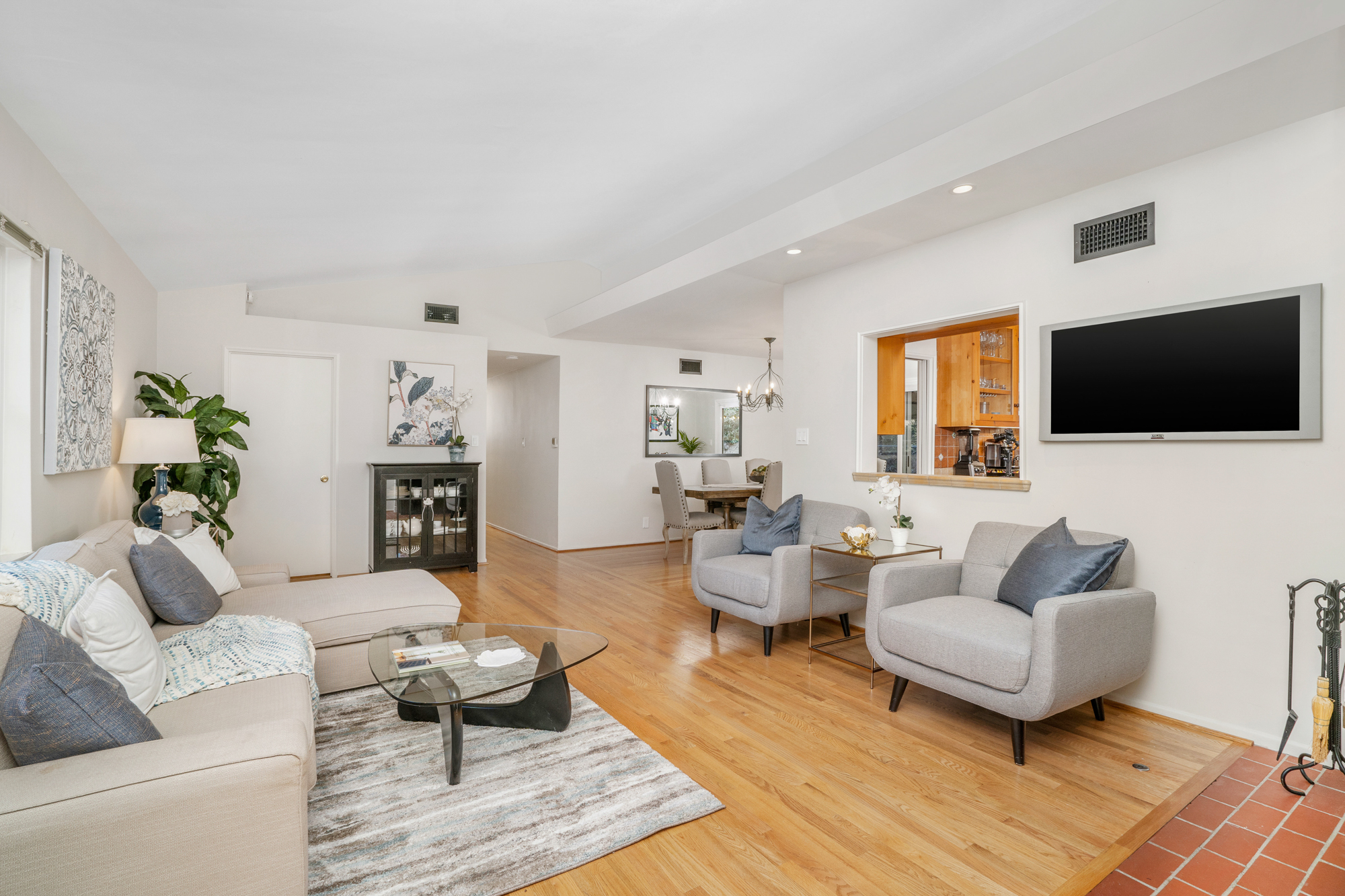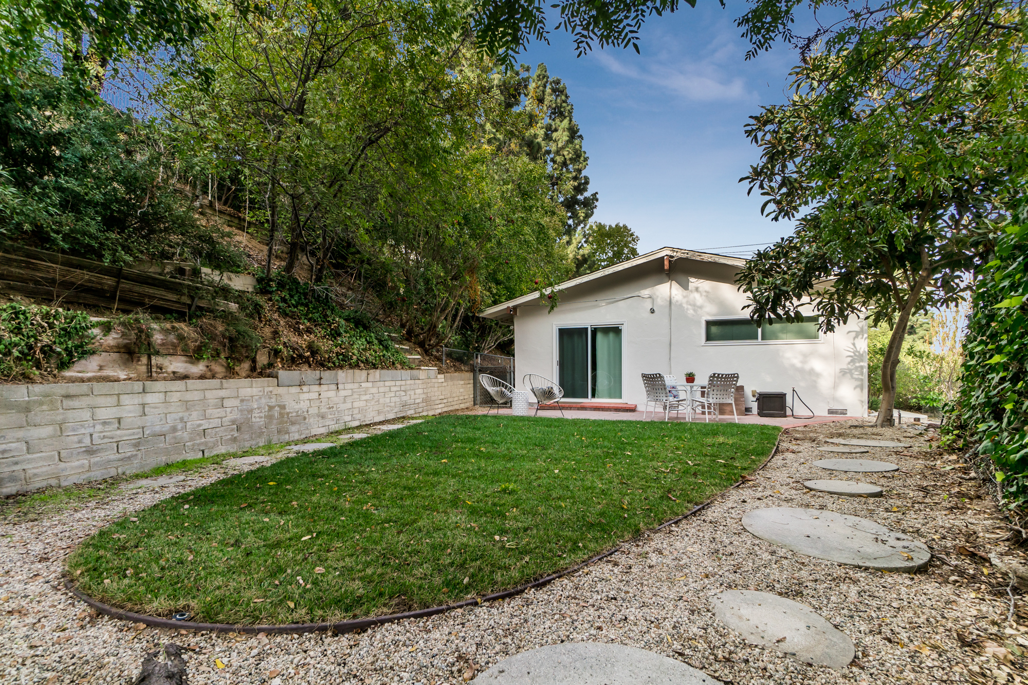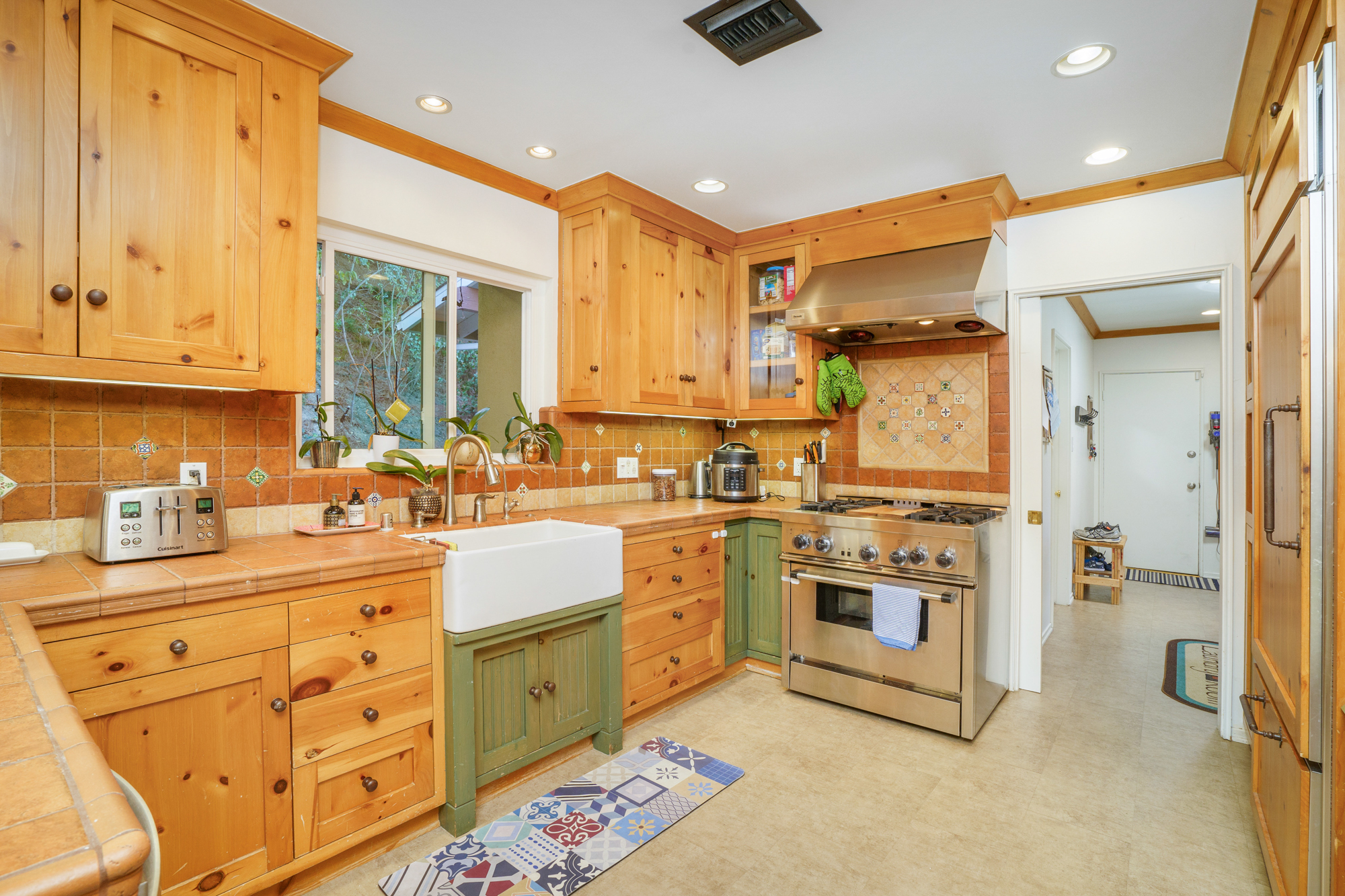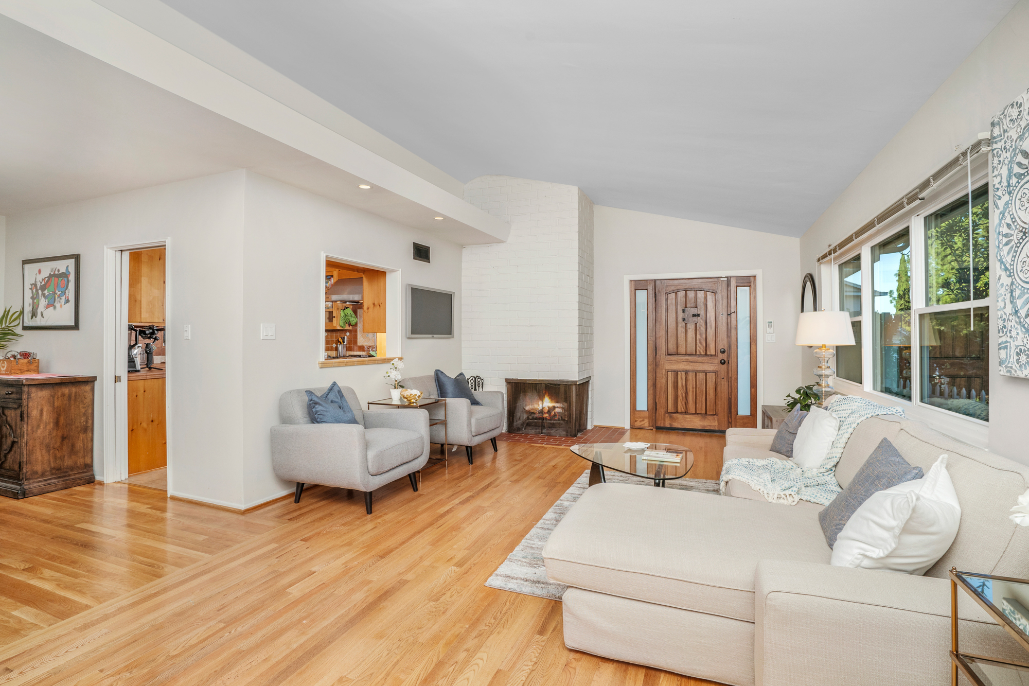 This brilliant Mid-Century contemporary home is located in the desirable South-of-the-Boulevard Sherman Oaks hills. Tucked away well above the street, this home offers privacy and a sense of tranquility, with its towering pine trees on the hillside above. This 4 bed 3.5 bath home with numerous windows and glass doors features uplifting mountain views, encouraging indoor-outdoor living. You’ll love coming home to this country kitchen featuring a pantry area, built-in wood-paneled Sub-Zero fridge, stainless steel Thermador Professional range & hood, custom cabinetry, recessed lighting, and spacious adjoining laundry area. An open living and dining room layout with hardwood floors and a modern brick wall fireplace creates an inviting and cozy spot for family gatherings or social events. Recent upgrades include brand new bathrooms, new front door, new double paned windows, and hardwood flooring in two of the bedrooms. With an en-suite bathroom, the fourth bedroom makes a fantastic guest room, office, or at-home gym. With an attached garage that includes built-in storage cabinets, this home is move-in ready. Enjoy the updated landscaped backyard, with brick paved patio, surrounded by lush greenery and plenty of room for outdoor dining. Ideally situated, only minutes to Ventura Blvd, the Galleria, Arclight Cinemas and great restaurants, as well as quick freeway access to all Valley and Westside destinations.
