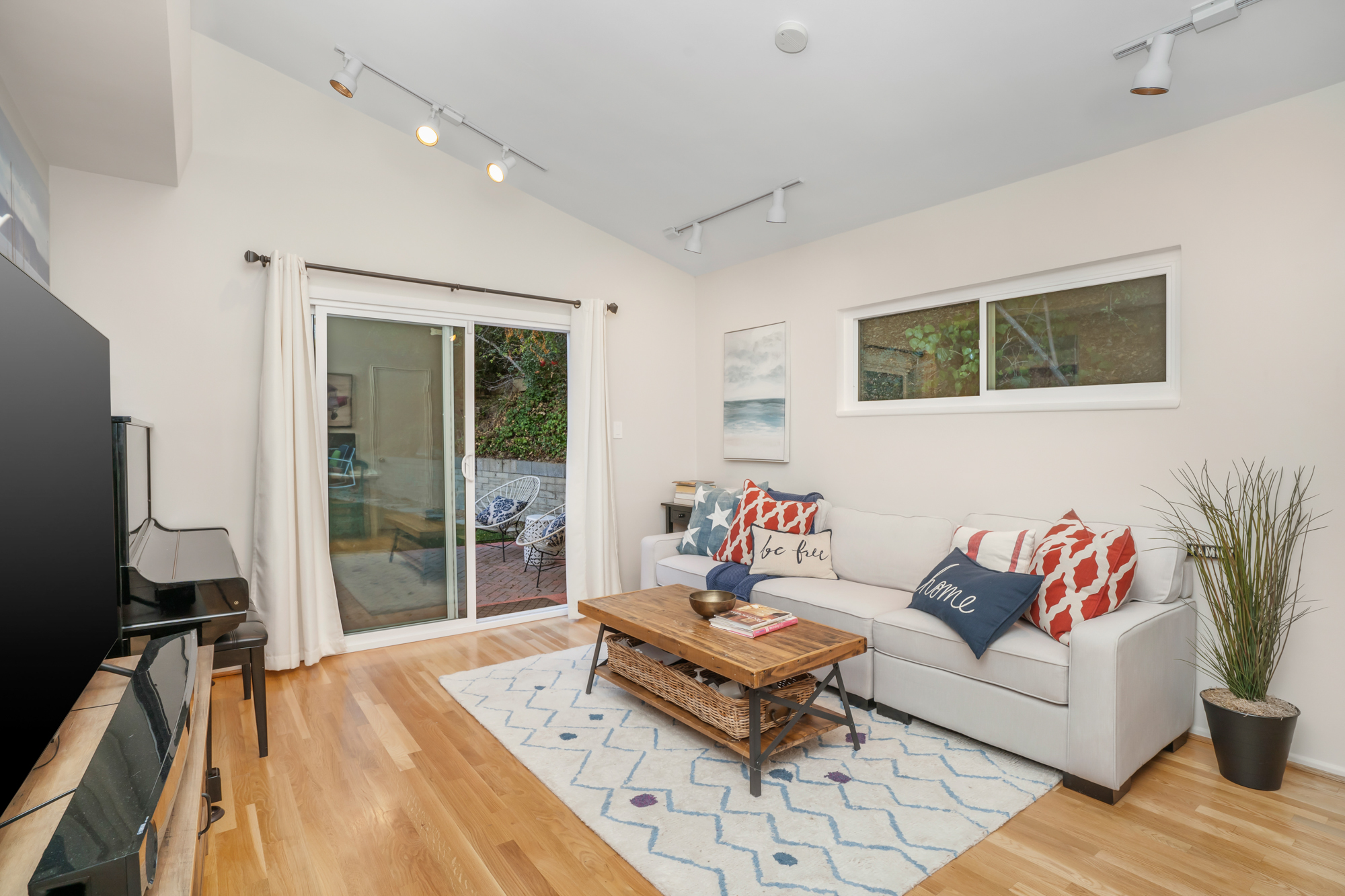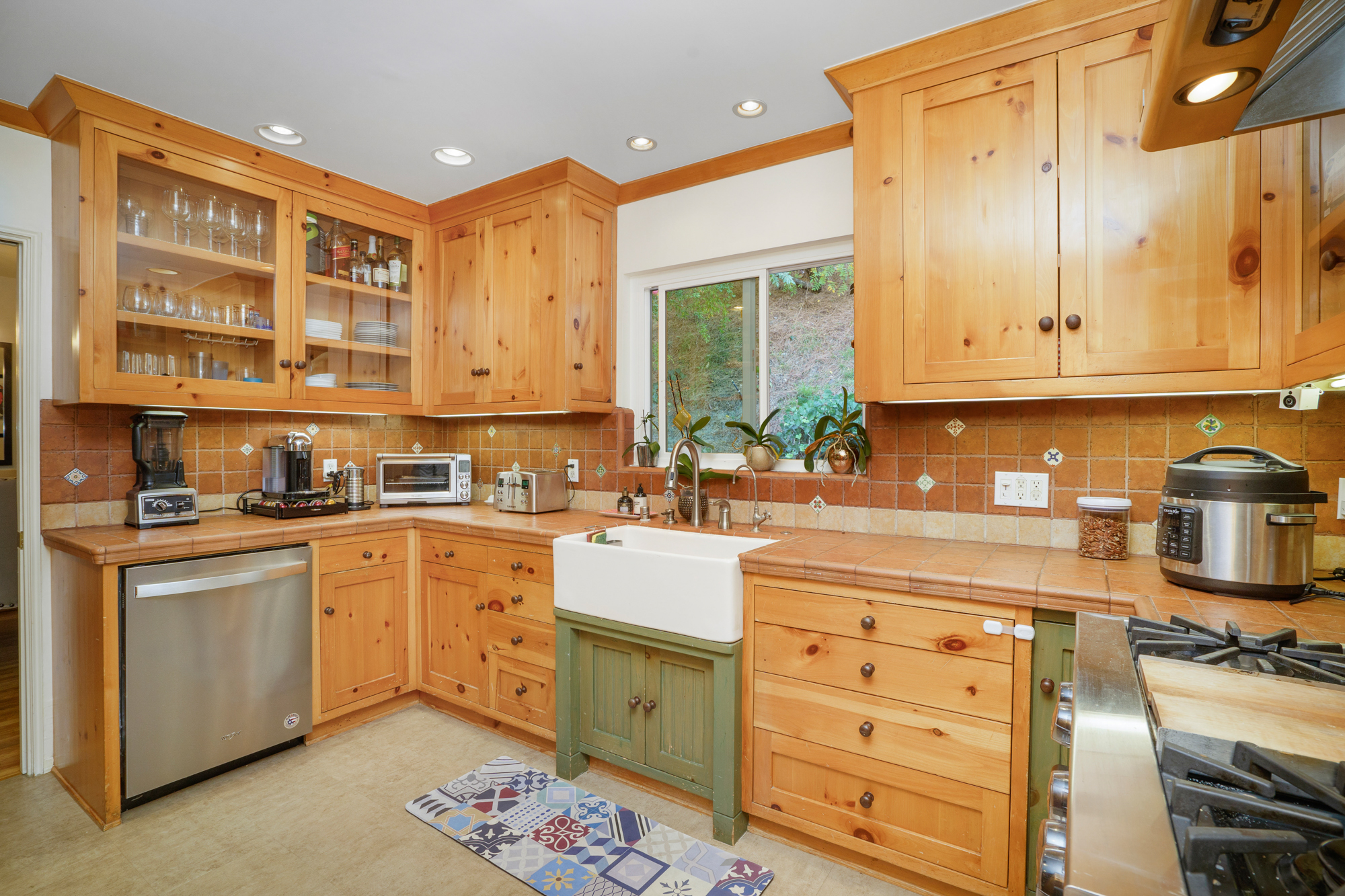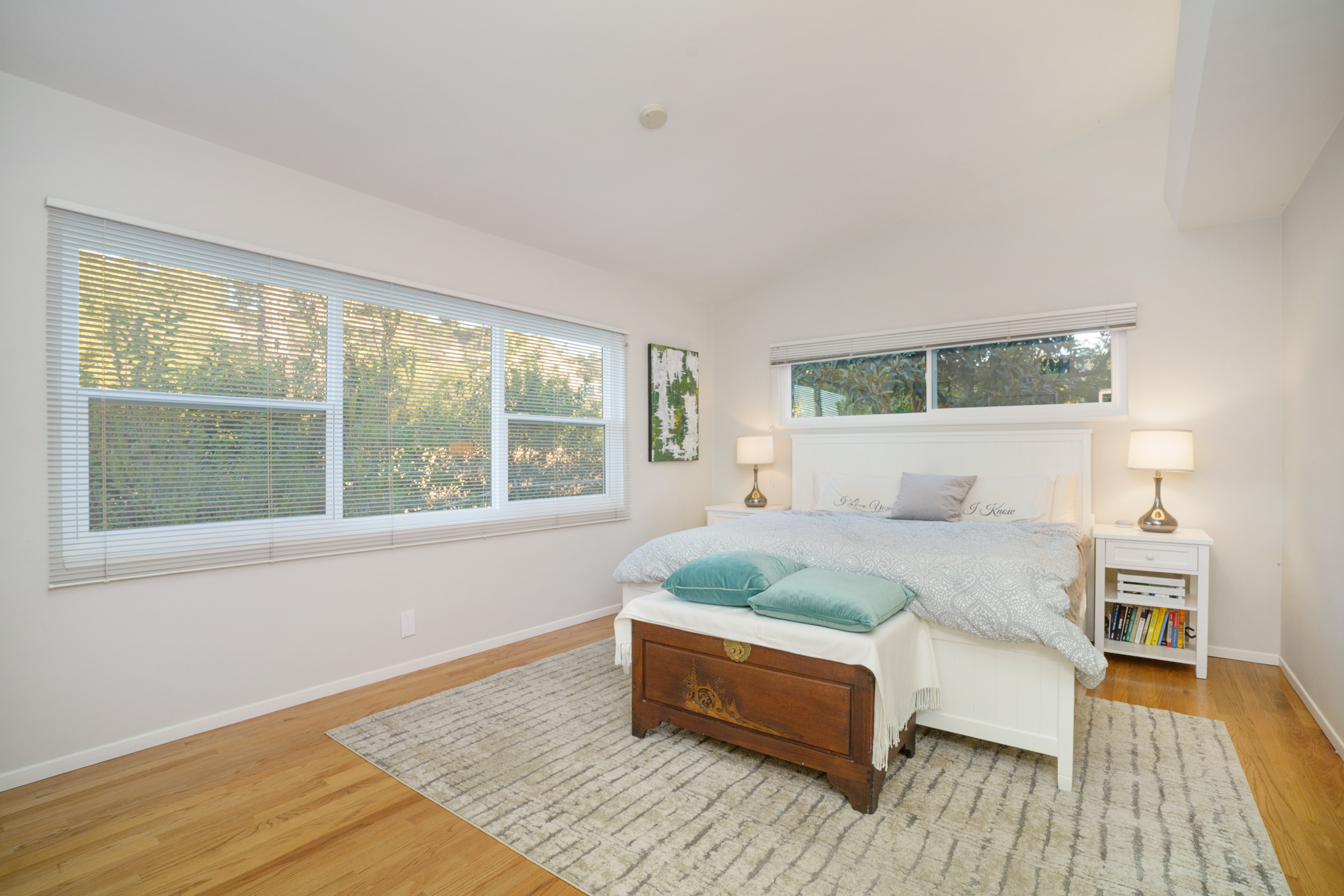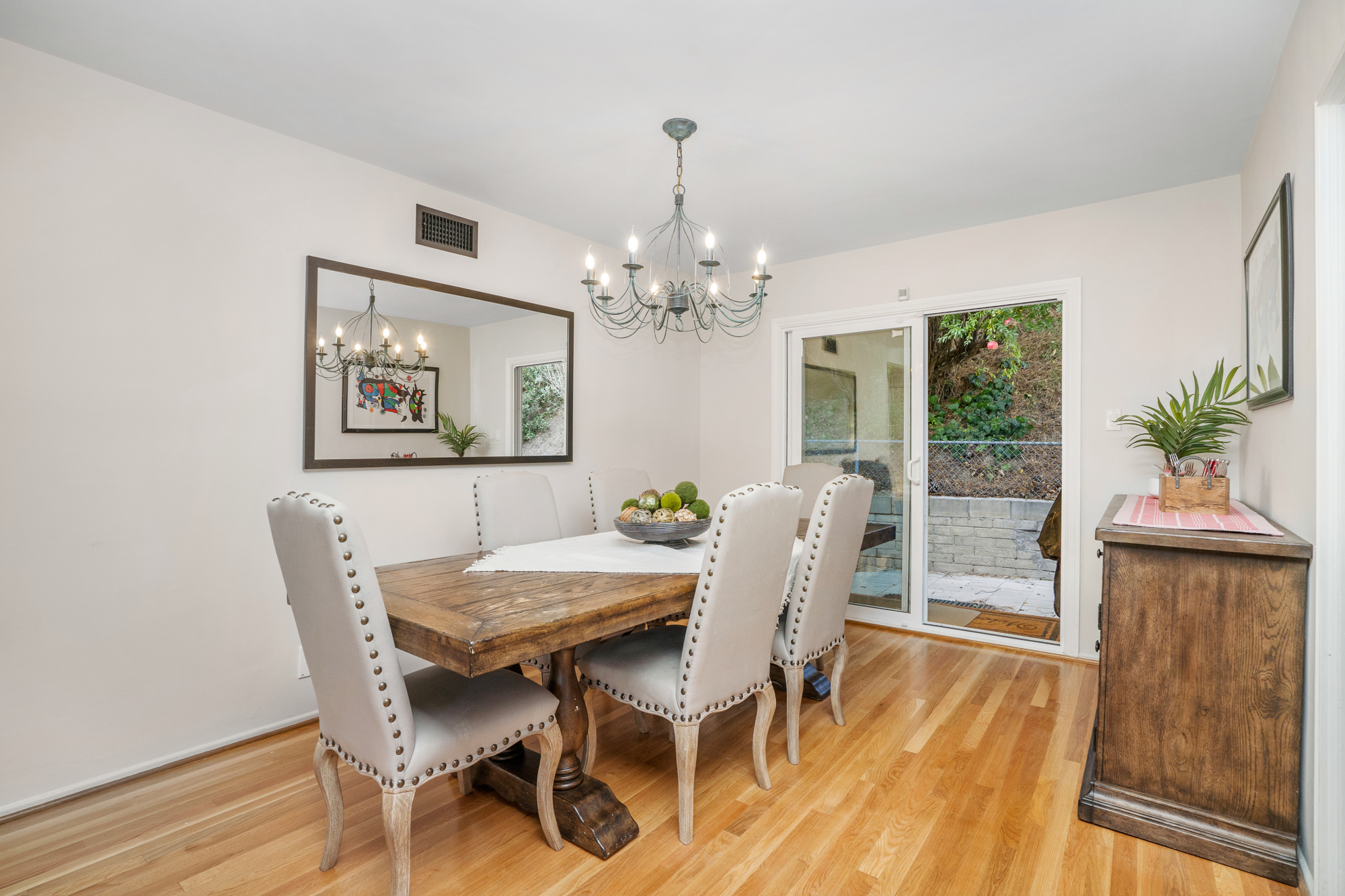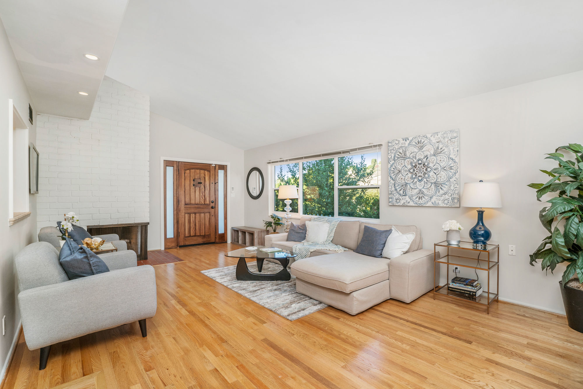 This brilliant Mid-Century contemporary home is located in the desirable South-of-the-Boulevard Sherman Oaks hills. Tucked away well above the street, this home offers privacy and a sense of tranquility, with its towering pine trees on the hillside above. This 4 bed 3.5 bath home with numerous windows and glass doors features uplifting mountain views, encouraging indoor-outdoor living. You’ll love coming home to this country kitchen featuring a pantry area, built-in wood-paneled Sub-Zero fridge, stainless steel Thermador Professional range & hood, custom cabinetry, recessed lighting, and spacious adjoining laundry area. An open living and dining room layout with hardwood floors and a modern brick wall fireplace creates an inviting and cozy spot for family gatherings or social events. Recent upgrades include brand new bathrooms, new front door, new double paned windows, and hardwood flooring in two of the bedrooms. With an en-suite bathroom, the fourth bedroom makes a fantastic guest room, office, or at-home gym. With an attached garage that includes built-in storage cabinets, this home is move-in ready. Enjoy the updated landscaped backyard, with brick paved patio, surrounded by lush greenery and plenty of room for outdoor dining. Ideally situated, only minutes to Ventura Blvd, the Galleria, Arclight Cinemas and great restaurants, as well as quick freeway access to all Valley and Westside destinations.
