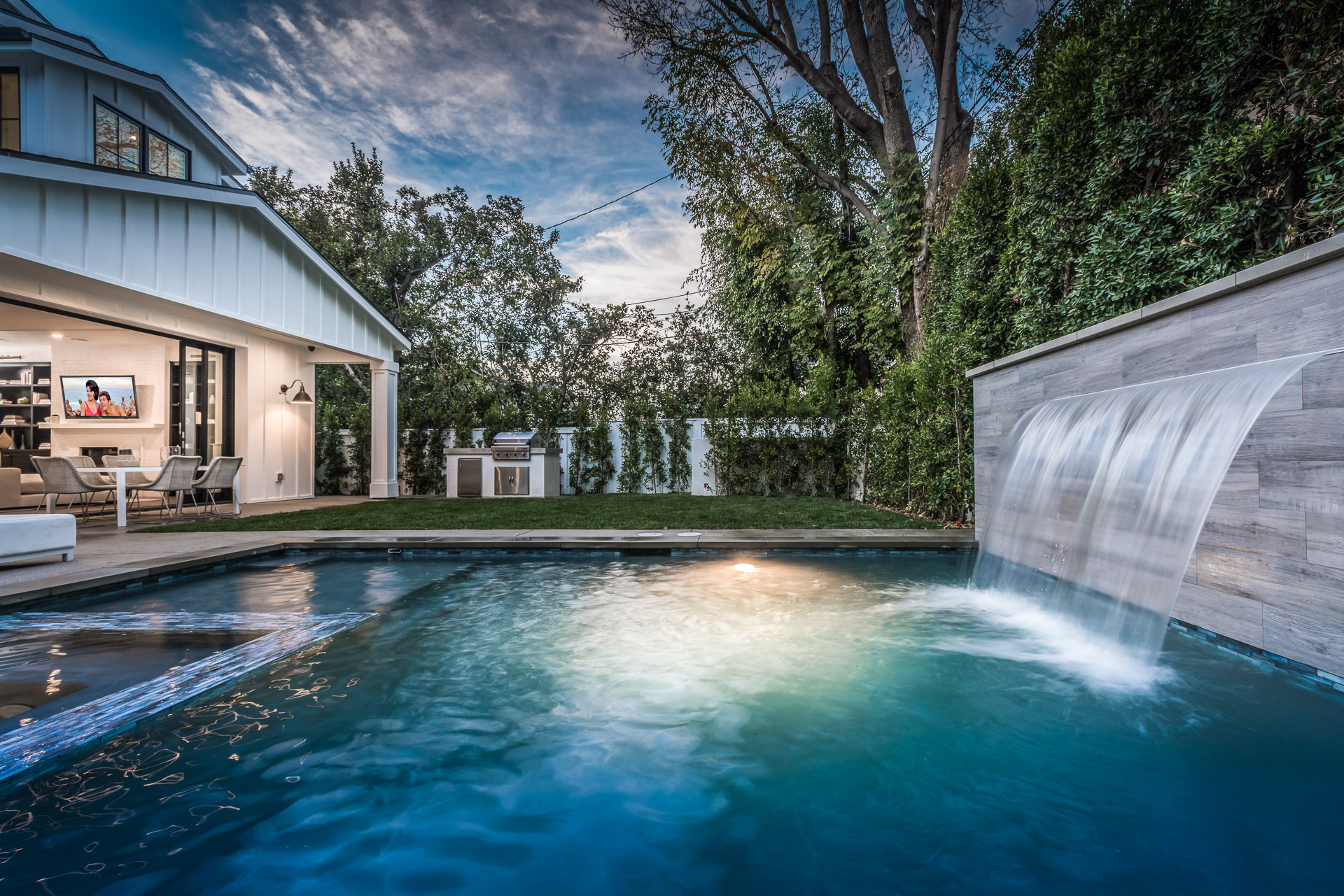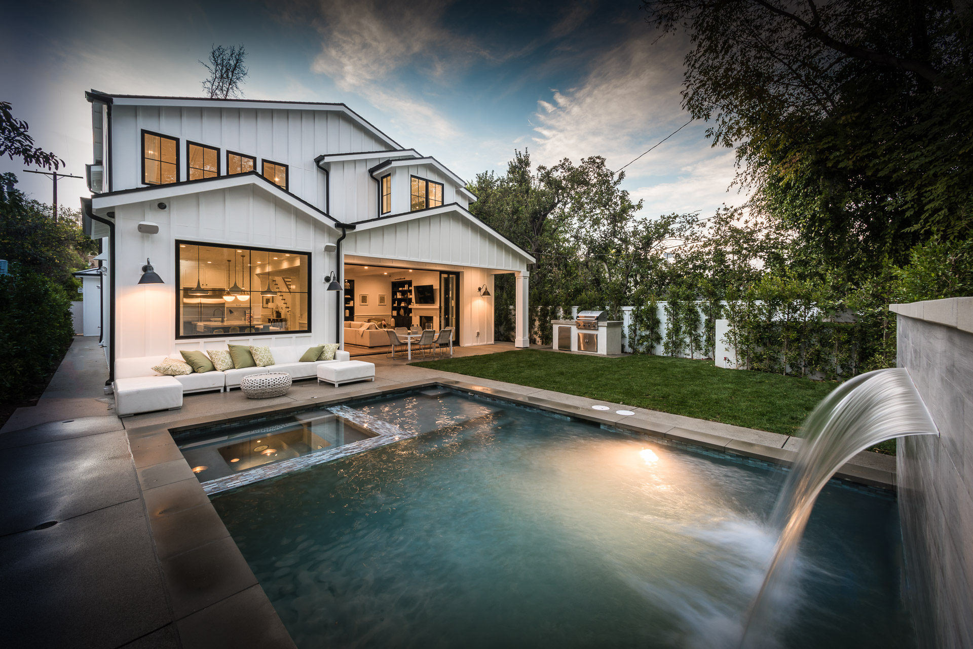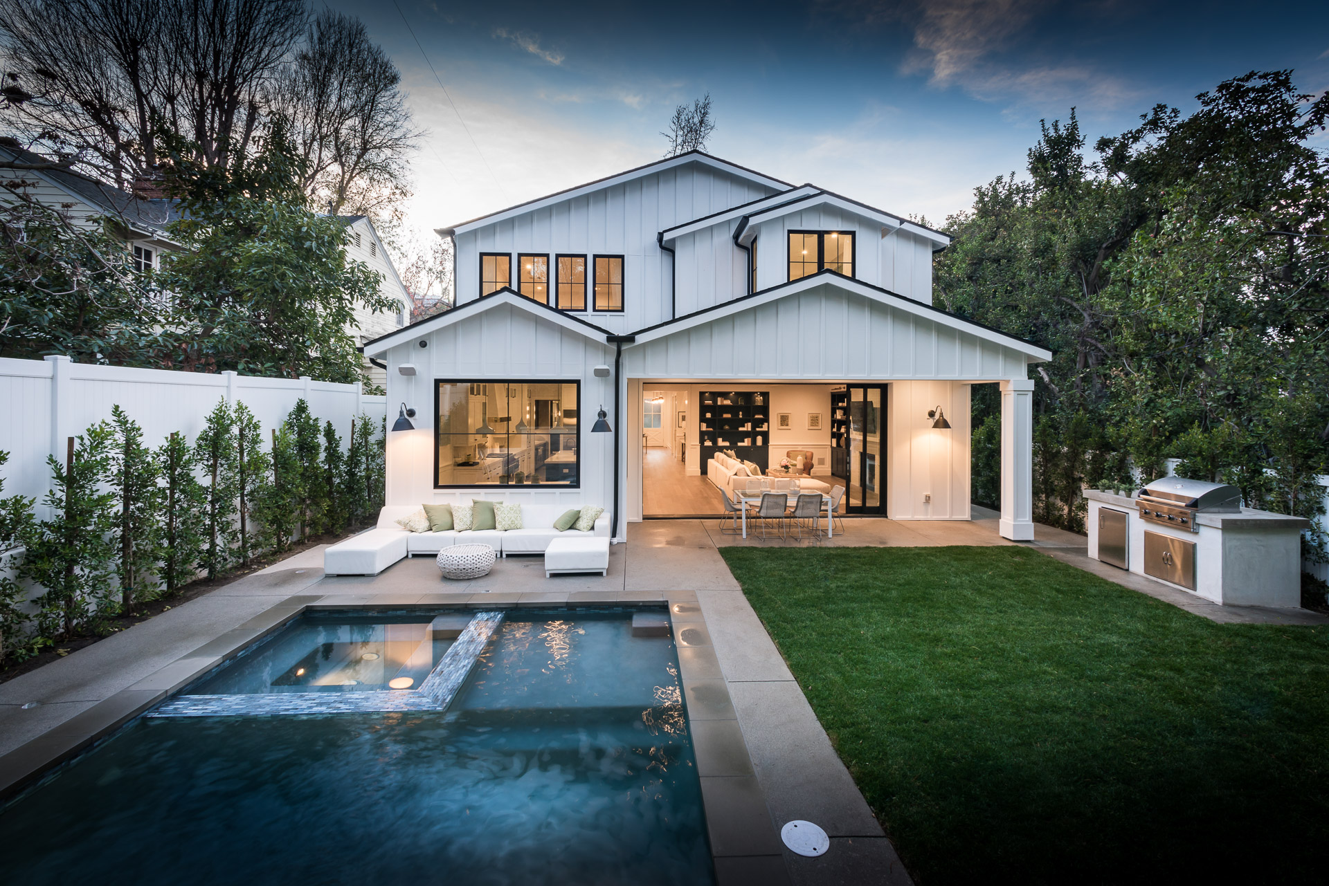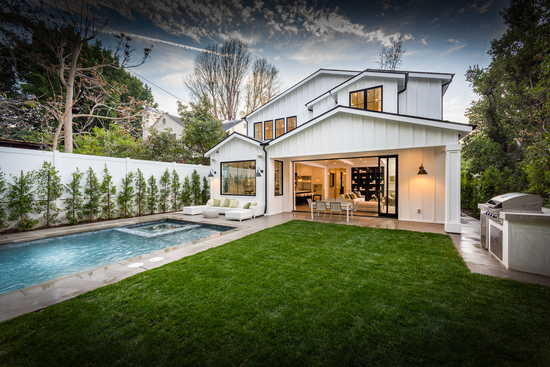 This exquisite new construction two story modern farm house with 5 bedrooms, den, and 6 baths is focused on aesthetic simplicity and impeccable quality. Celebrate family life with a deluxe kitchen including top of the line appliances, stylish pendant lights, and an over-sized island. Hardwood flooring and use of rich materials make a timeless and natural appearance. Gabled bedroom ceilings create a sense of grandeur. Board and batten wainscoting enrich the interior and exterior walls with elegant detail. Coffered ceilings throughout introduce texture and audio comfort to the home. The bedrooms offer generous light, private baths, large closets, and unique light fixtures. The formal Dining room with great room make a bold appearance with floor to ceiling curio cabinets, a modern art chandelier, and fireplace. The stunning waterfall pool in the large backyard can be easily accessed from the living room floor to ceiling glass sliding doors. Clean lines and high end luxury finishes throughout, for the real estate aficionado, every detail is in place.