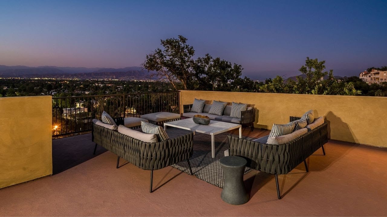 Nestled in the Studio City hills South of the Blvd is this gorgeous new construction home with breathtaking views. As you enter the home, either by the front stairs or your private elevator, you are greeted by wood floors, elegant tray ceilings, and an abundance of natural light flooding each room from its own balcony. The spacious living room flows into the dining room, which connects to the kitchen and family room by a beautiful arched opening, creating ideal flow and stunning architectural lines. The chef’s kitchen features Viking appliances, shaker cabinets, quartz counters, and a large center island which looks out onto the family room and balcony, perfect for entertaining. Make your way upstairs via the elevator or designer Spanish tiled staircase, to the second level which holds all 4 bedrooms, each offering balcony access and more views. The master and junior master suites have walk-in closets and luxurious baths while the 2 remaining bedrooms are well appointed and share a bath. The rooftop deck is not to be missed, with its sweeping views you can have a rooftop party or a quiet night in while watching the sunset over the mountains. Additional features include 3-car garage, skylights, upstairs laundry for convenience, and so much more. Moments from the best hiking trails in the valley, the famed Studio City Farmers Market, and the shops and restaurants of Ventura Blvd.