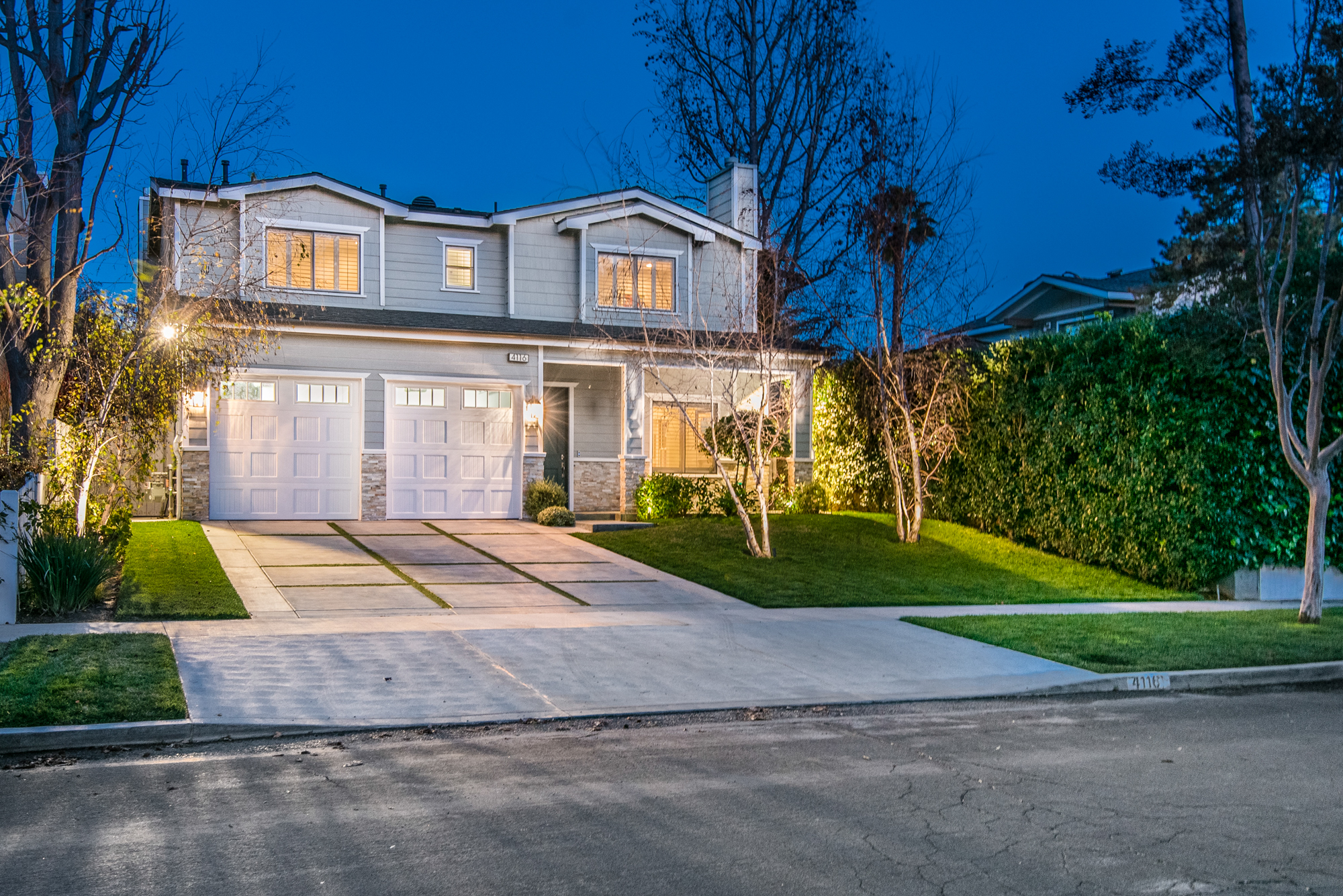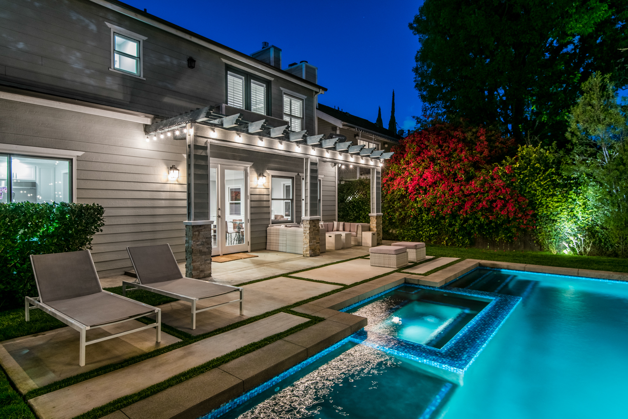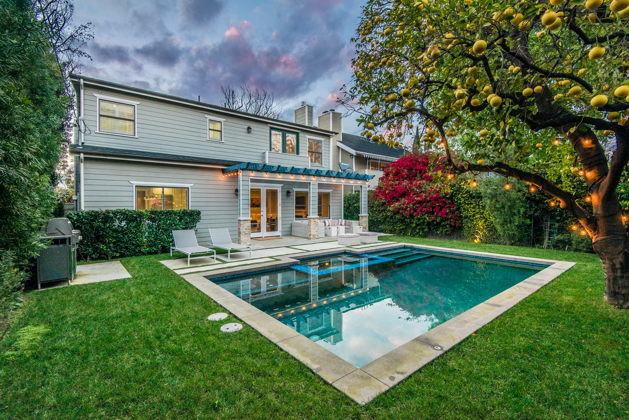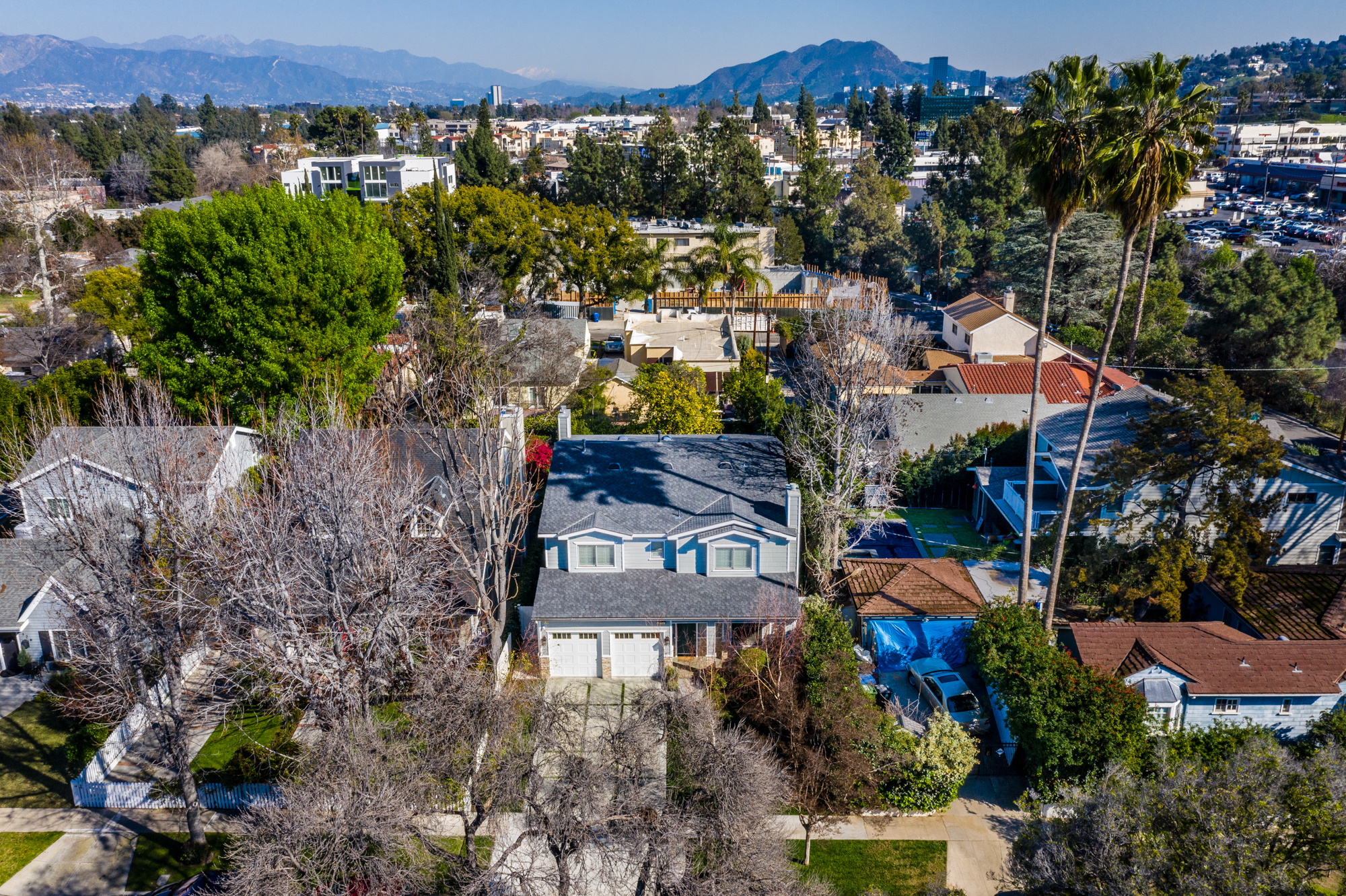 Immaculate newer construction 2 story Cape Cod family home located in the highly sought after "Footbridge Square" neighborhood and the award winning Carpenter School District. Walking distance to Ventura Blvd and the best shopping and restaurants Studio City has to offer. This custom home feels new from the moment you enter the front door. The many custom features include coffered and tray ceiling, wainscot paneling, custom moldings, hardwood floors and plantation shutters throughout. Formal living room and Dining room, dramatic open staircase with 2 story ceilings and windows that provide an abundance of natural light. The extra large gourmet kitchen features Dacor appliances, marble & quartz surfaces, a butlers pantry, and conveniently opens to the spacious entertainers family room. The master suite features a fireplace, dual walk-in closets, opulent bathroom with double sinks, spa tub and over-sized shower. The Oasis back yard features an open trellis patio area, pool & spa, BBQ area, and lushly landscaped grounds with lighting and grassy areas, ideal for outdoor living and entertaining.