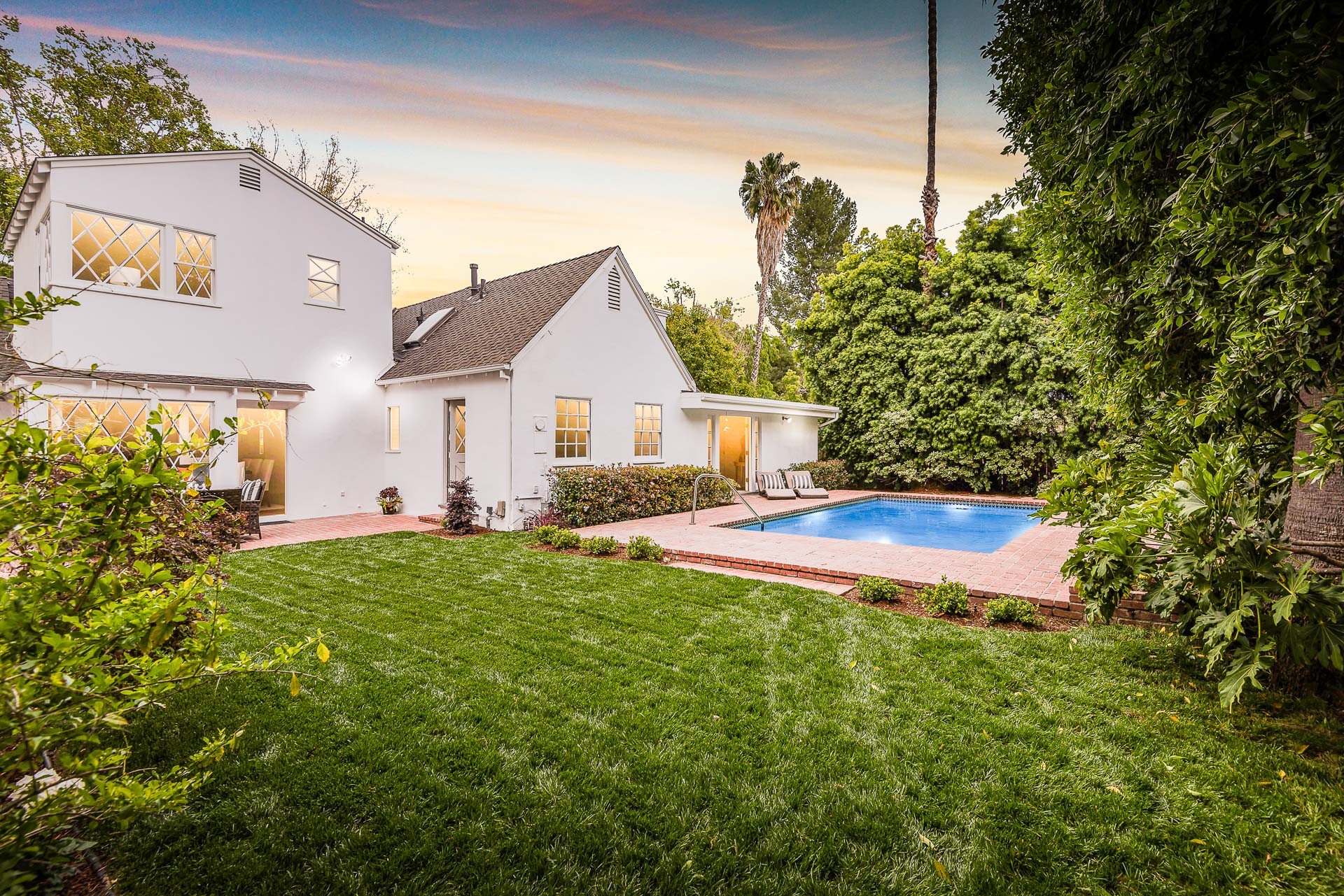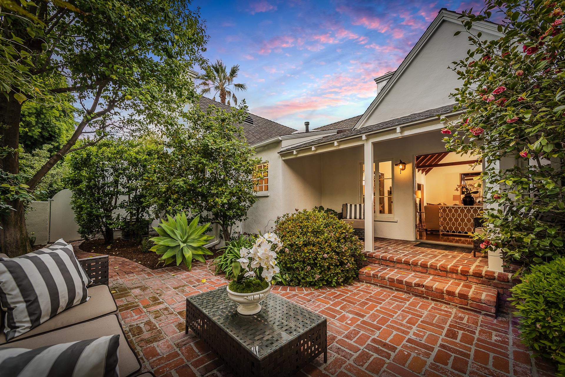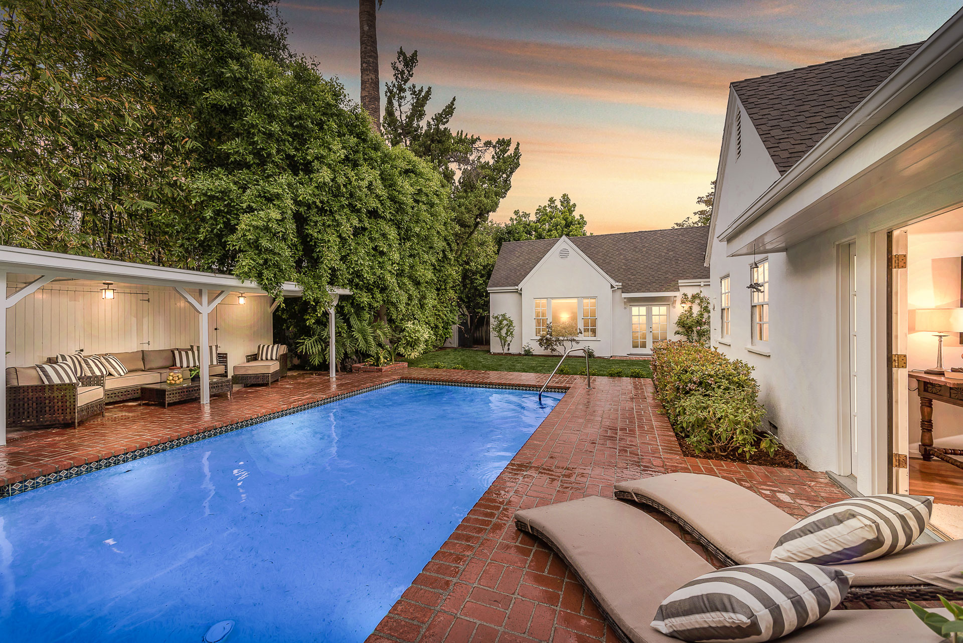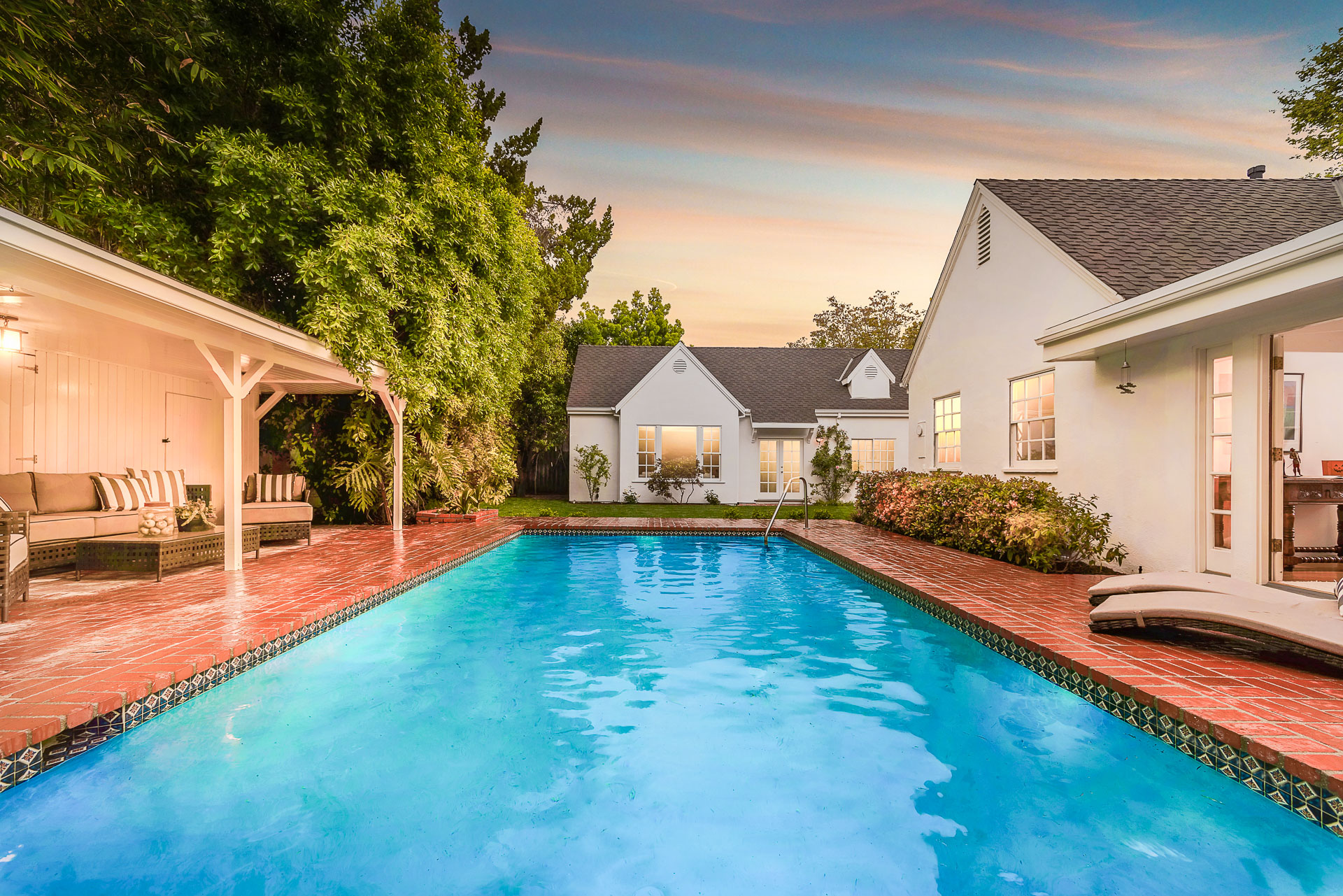 The spacious backyard has a large pool and beautiful gardens with mature trees for total privacy. Three separate brick patio areas are perfect for outdoor entertaining. Ideal for families, the estate sits on a quiet street/corner lot in the heart of Studio City, steps from Weddington Golf & Tennis and Ventura Blvd shops, and only minutes from 405 and 101.