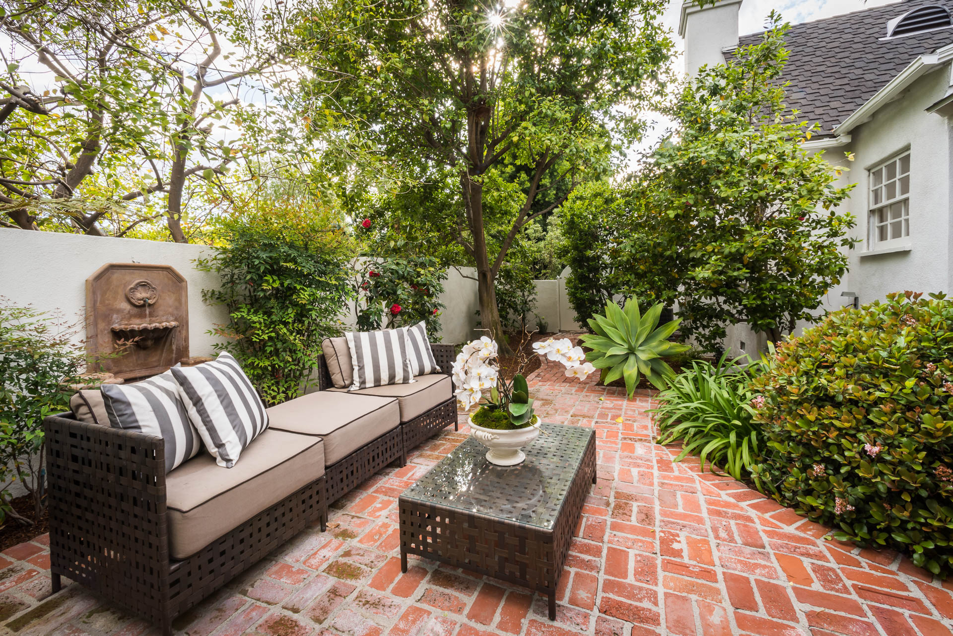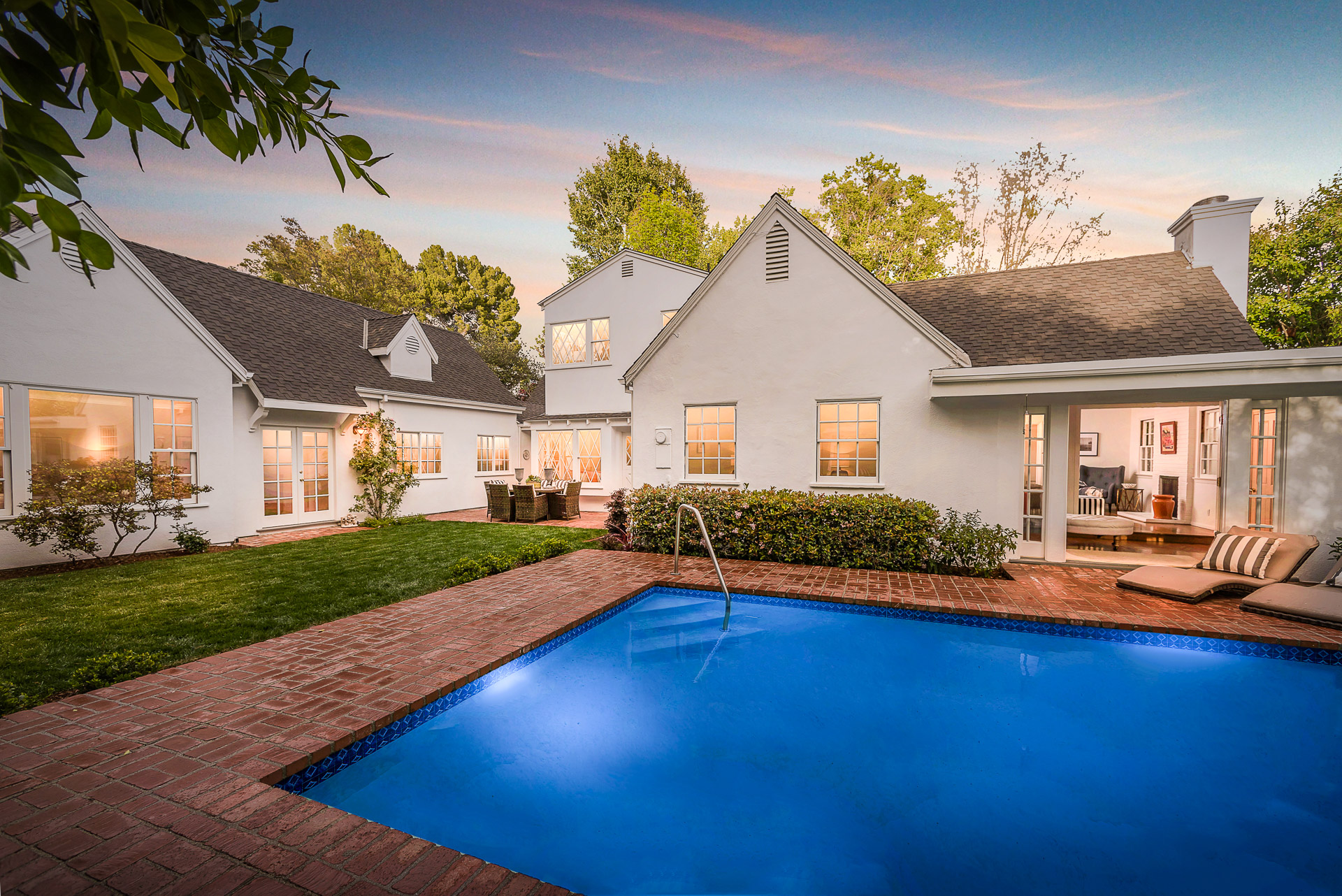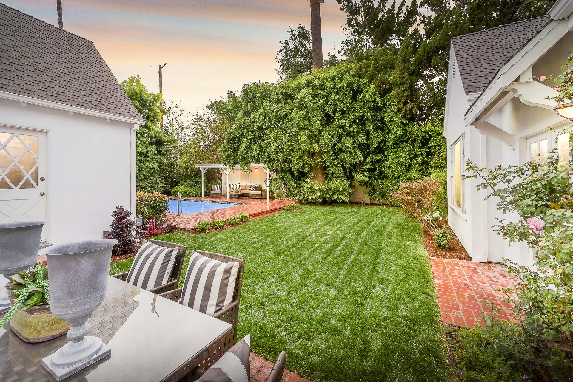 The spacious backyard has a large pool and beautiful gardens with mature trees for total privacy. Three separate brick patio areas are perfect for outdoor entertaining. Ideal for families, the estate sits on a quiet street/corner lot in the heart of Studio City, steps from Weddington Golf & Tennis and Ventura Blvd shops, and only minutes from 405 and 101.