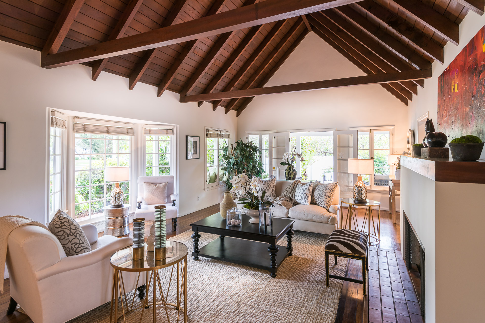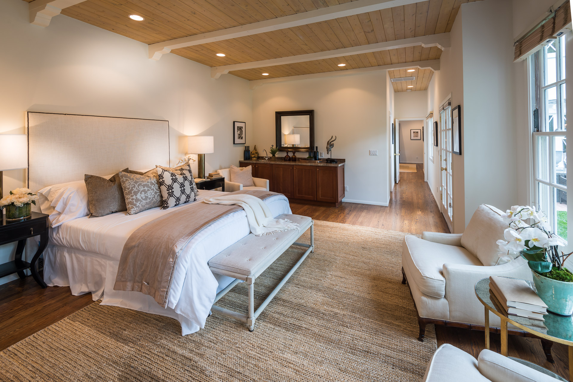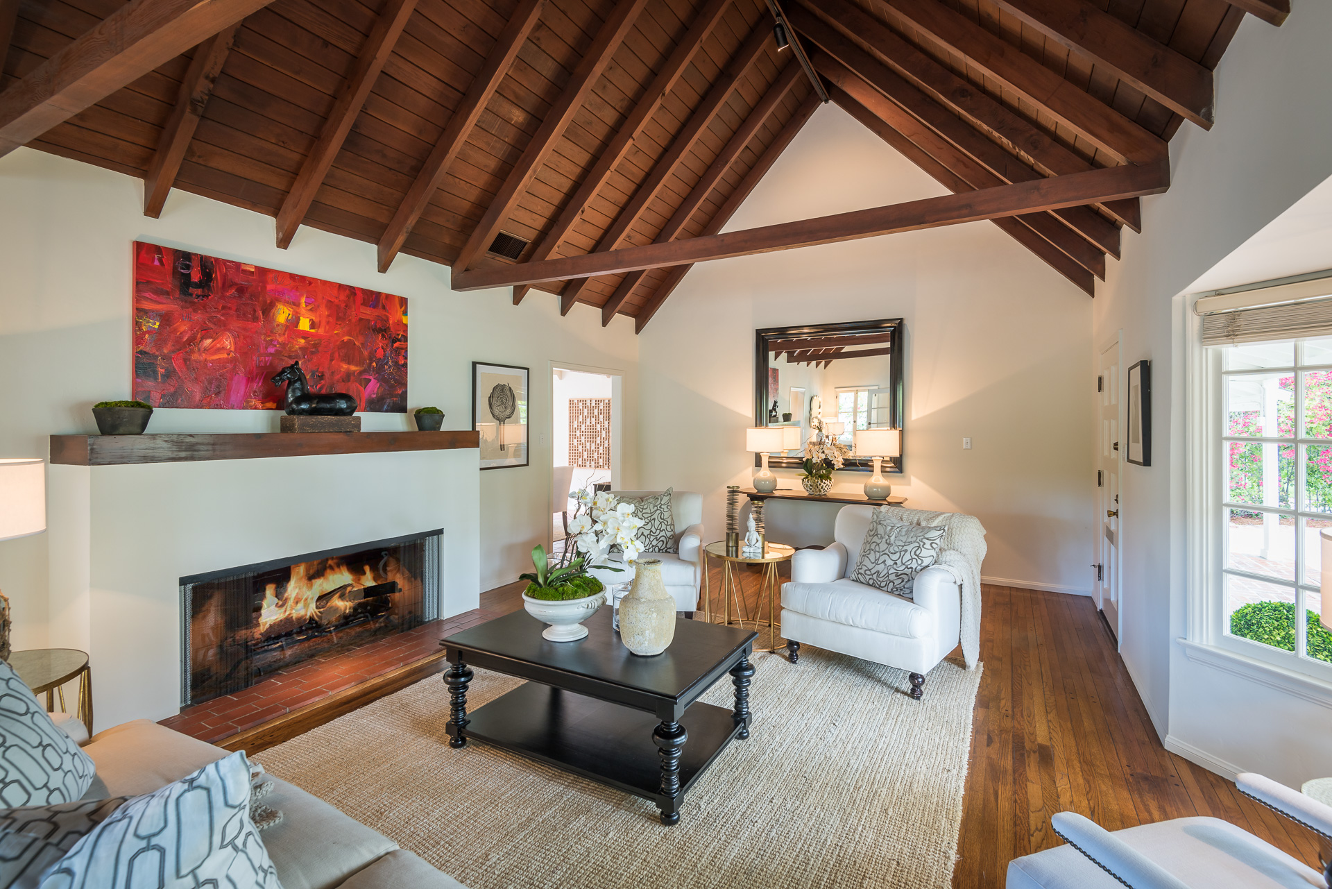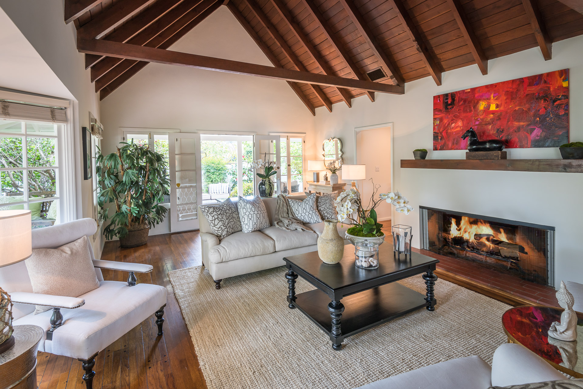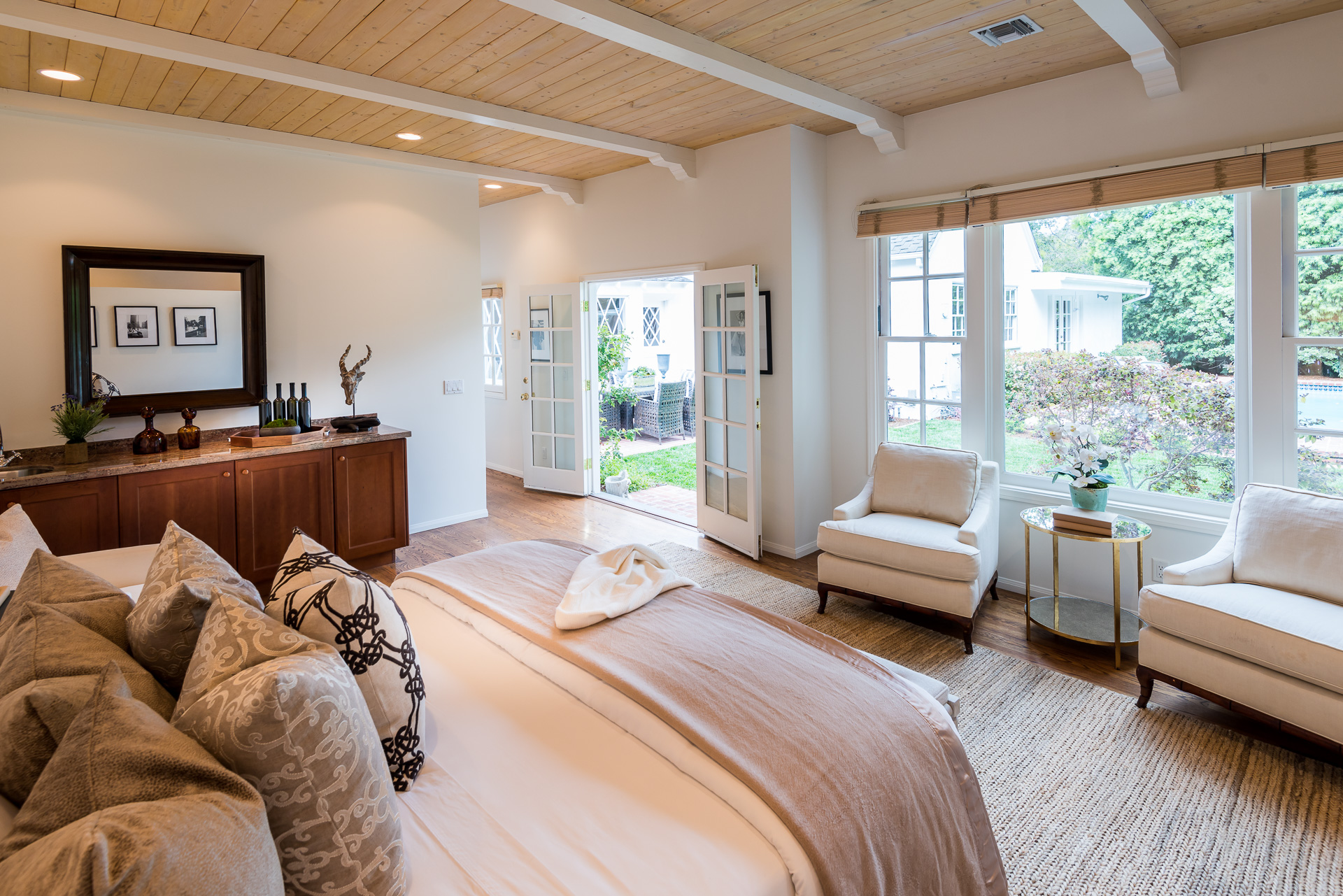 Nestled on a spacious 11,320 sqft parcel, this elegant 4 bedroom, 4 bath residence blends old-world charm with stunning private grounds. A stately entrance welcomes you into a large living room with high dramatic wooden vaulted ceilings and a huge fireplace, while French doors and ample windows beckon you to a private courtyard with a wall-mounted fountain. Two master bedroom suites are located on the ground floor, each with its own sitting area, large walk-in closet, and bathroom. From each master suite, French doors provide views and entry to the backyard gardens and pool. One suite with a fireplace also works well as a family room. The other features high wooden ceilings, a large picture window, built-in wet bar, and dedicated ac/heating. A separate office (or media room or playroom), adjacent to this bedroom, completes this wing of the house. The third bedroom also has a view of the backyard pool/garden and its own door. Tucked away on the 2nd floor is the fourth bedroom and full bath, again with a panoramic view of the lovely yard. Beautiful hardwood floors, window seats, large diamond pane windows, and five skylights add to the home’s beauty and natural light.