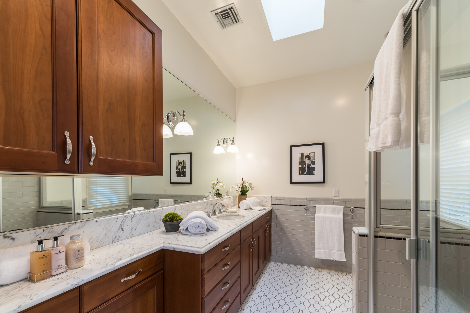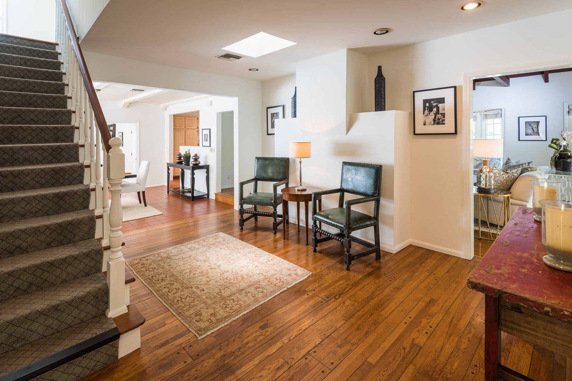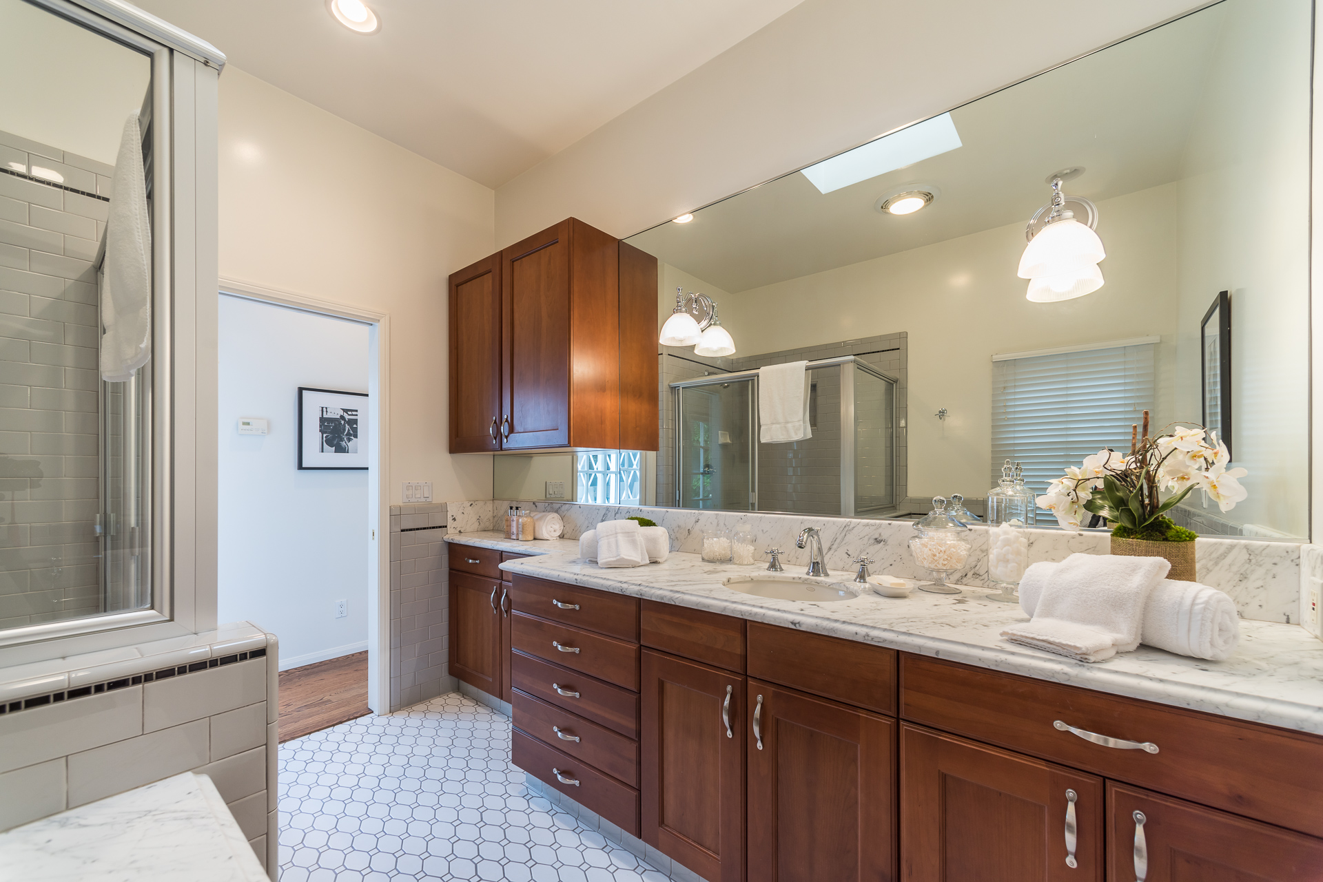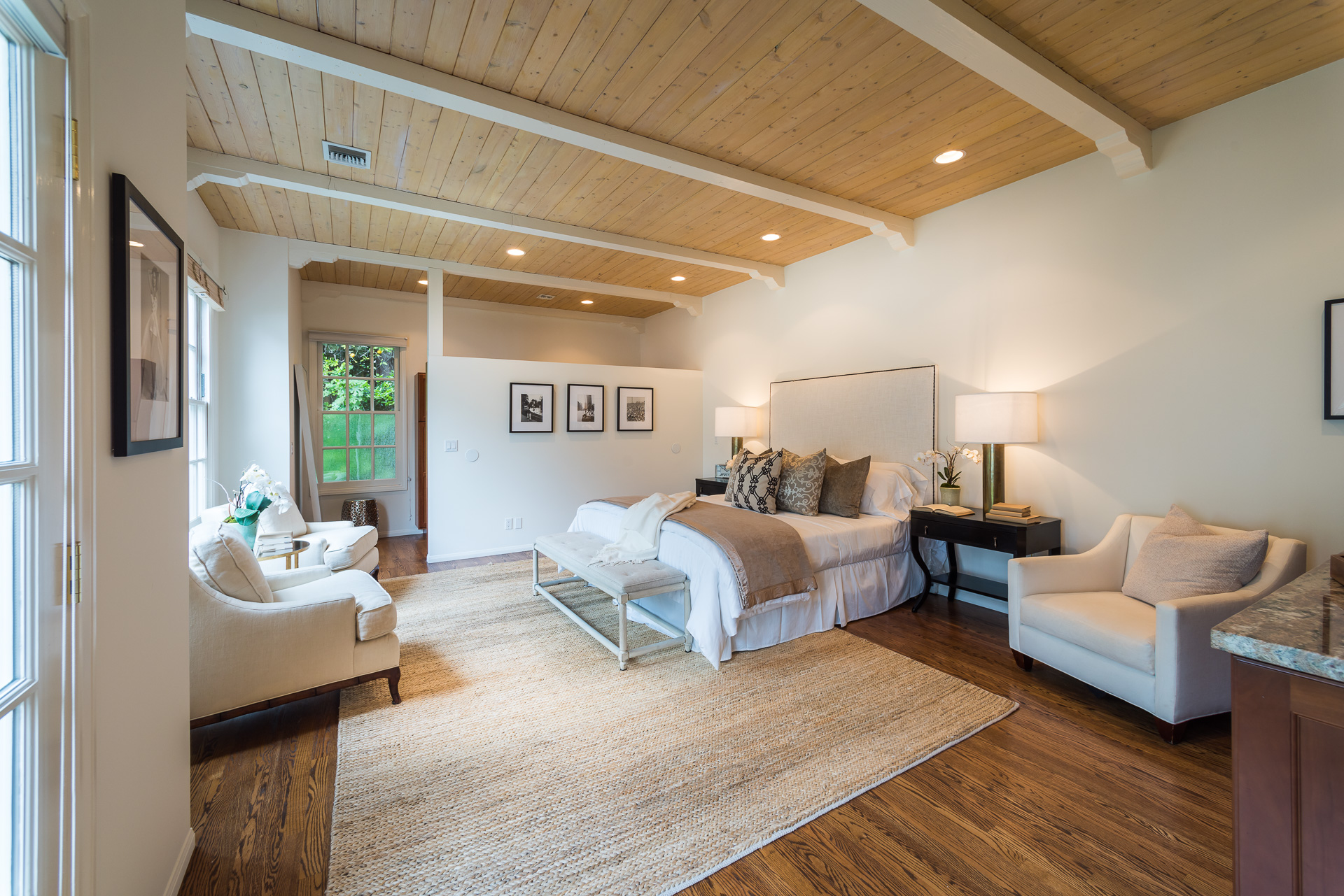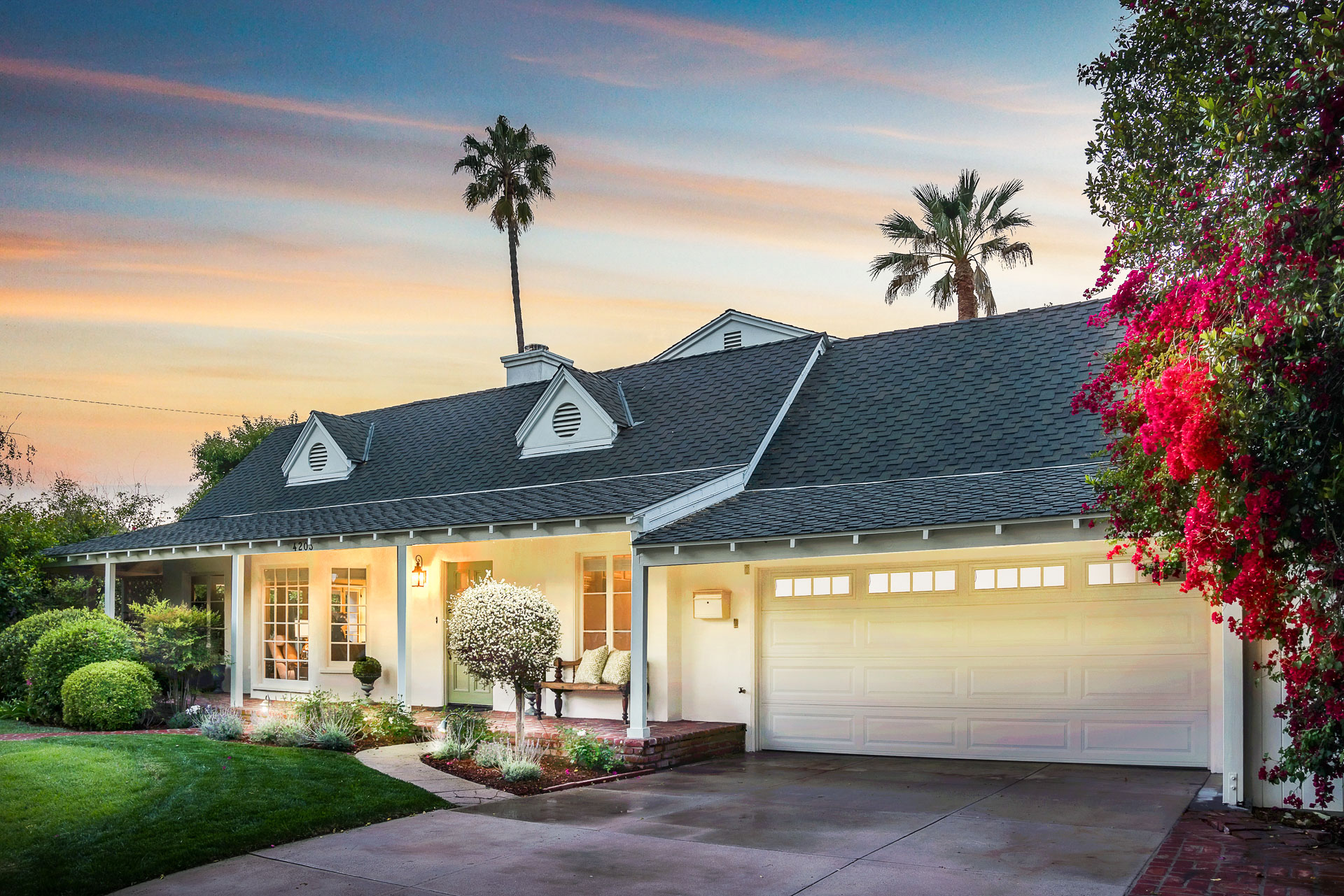 Nestled on a spacious 11,320 sqft parcel, this elegant 4 bedroom, 4 bath residence blends old-world charm with stunning private grounds. A stately entrance welcomes you into a large living room with high dramatic wooden vaulted ceilings and a huge fireplace, while French doors and ample windows beckon you to a private courtyard with a wall-mounted fountain. Two master bedroom suites are located on the ground floor, each with its own sitting area, large walk-in closet, and bathroom. From each master suite, French doors provide views and entry to the backyard gardens and pool. One suite with a fireplace also works well as a family room. The other features high wooden ceilings, a large picture window, built-in wet bar, and dedicated ac/heating. A separate office (or media room or playroom), adjacent to this bedroom, completes this wing of the house. The third bedroom also has a view of the backyard pool/garden and its own door. Tucked away on the 2nd floor is the fourth bedroom and full bath, again with a panoramic view of the lovely yard. Beautiful hardwood floors, window seats, large diamond pane windows, and five skylights add to the home’s beauty and natural light.