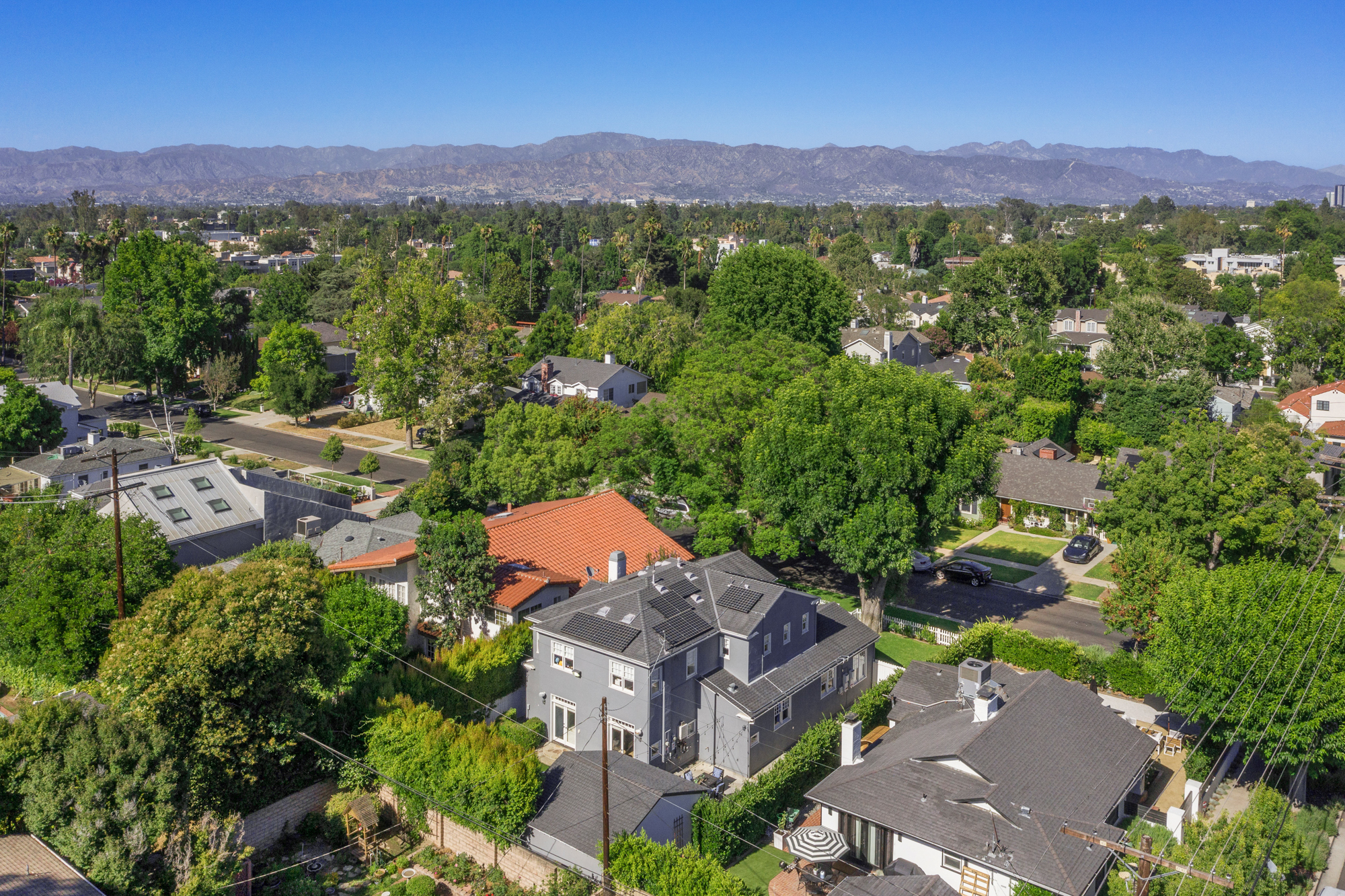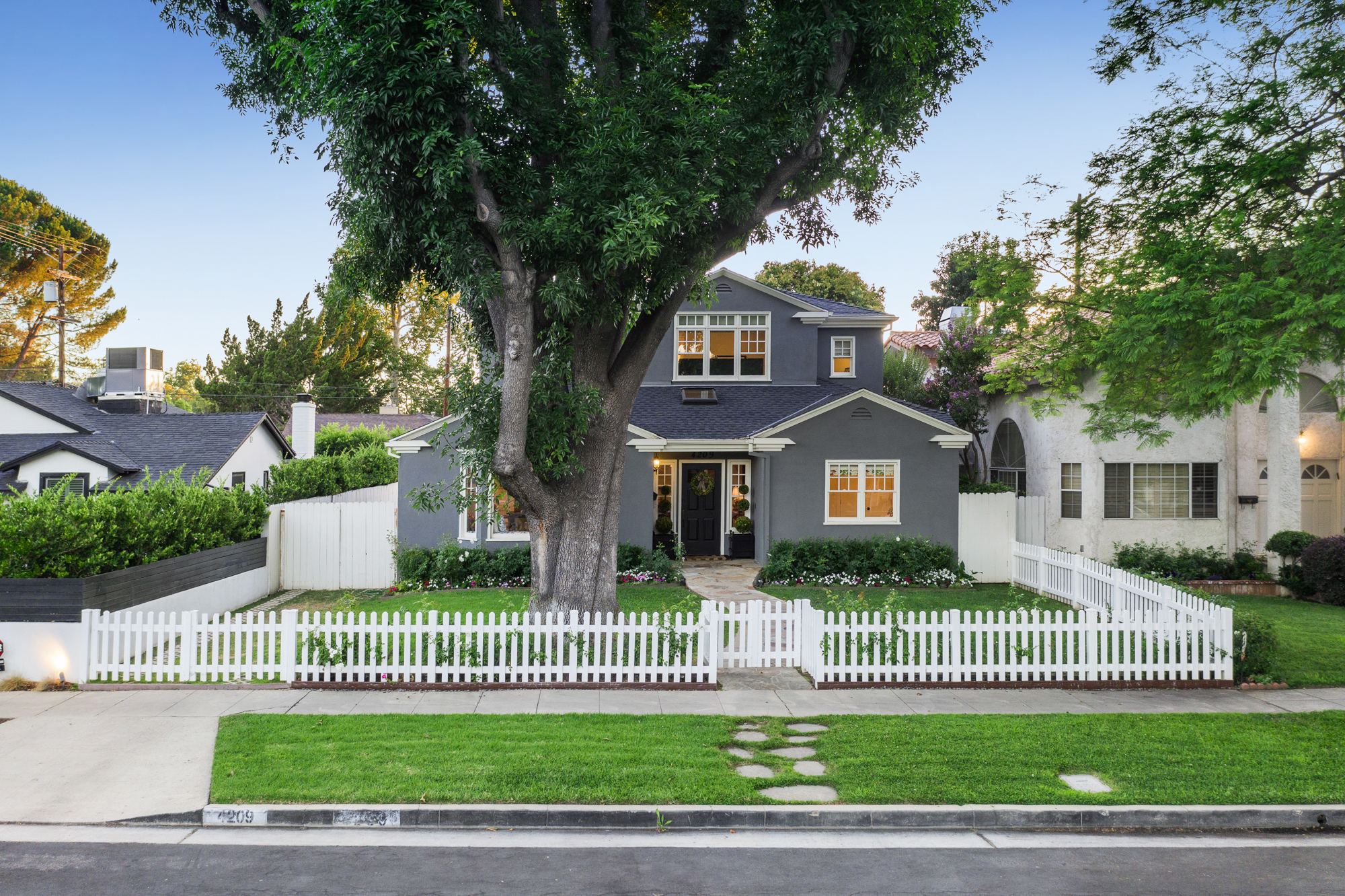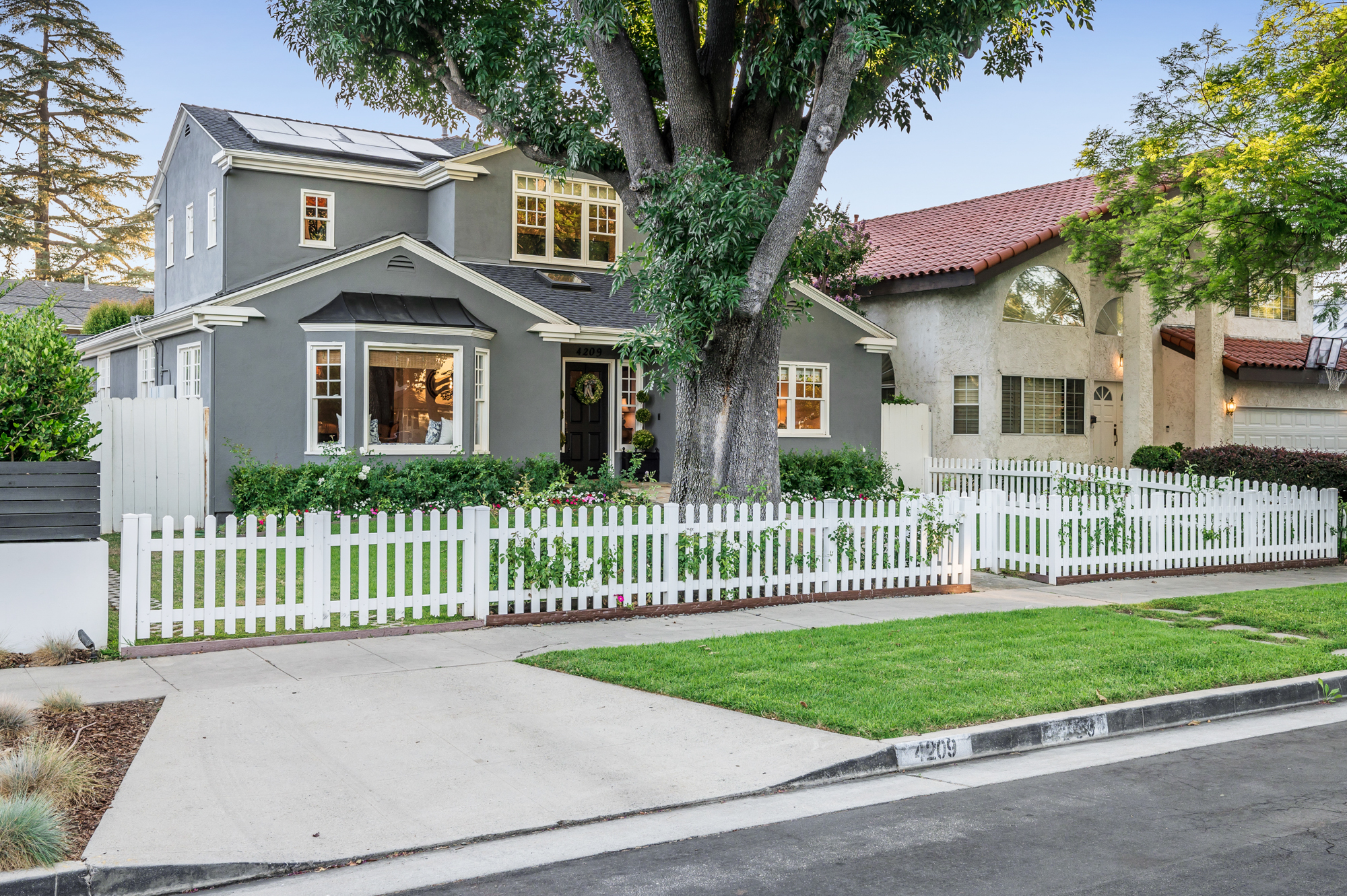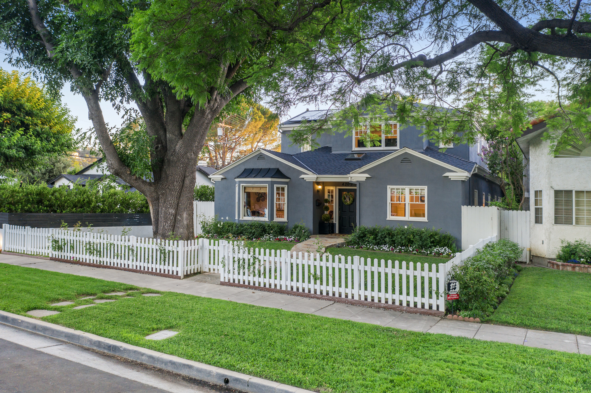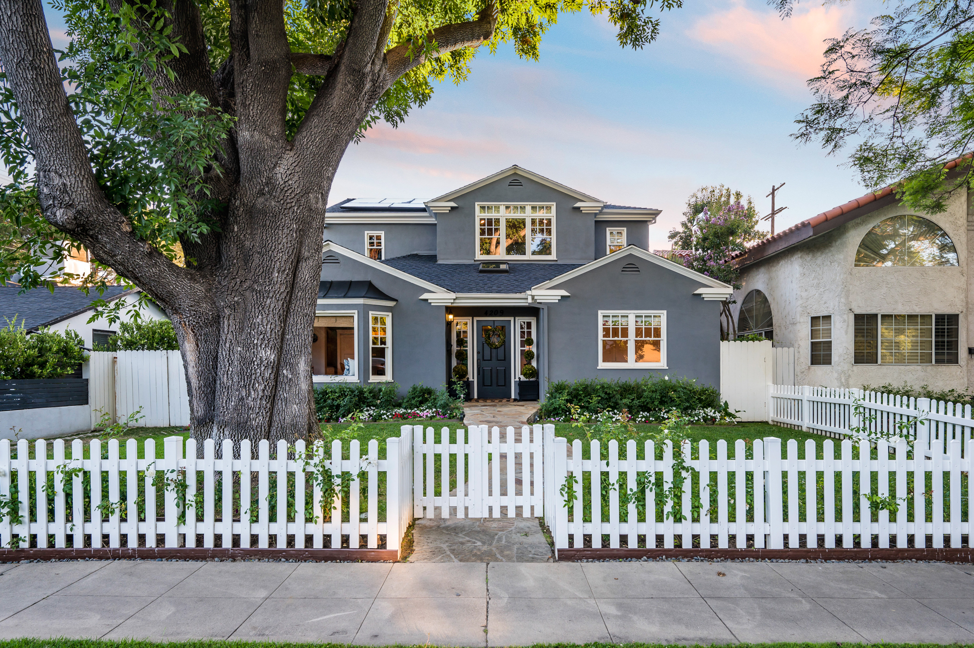 Set behind a charming picket fence on a tree lined street in the highly desirable Footbridge Square pocket of Studio City is this beautiful fully updated 5 bedroom traditional home in Carpenter School District. Down the walkway and past the spacious well manicured front lawn, enter into the light and bright formal entry with skylight. The living room is complete with a large bay window bench seat. Rich wood floors flow into the grand dining room with designer wall paper and built in cabinetry. The gourmet chef’s kitchen features Viking and Miele appliances, large center island, custom tile backsplash, and has a breakfast bar big enough for 5! Perfect for entertaining, the kitchen opens to the family room with floor to ceiling built-ins and double french doors to the backyard. The downstairs bedrooms are well sized and ideally situated as a guest room and playroom, home office, or more. Upstairs, the master retreat is the epitome of luxury with high ceilings, two walk in closets, and a bath with dual sink vanity and large shower with multiple shower heads and bench. The two additional bedrooms are well appointed and share a bath with dual sink vanity and large tub. The backyard offers the best of Southern California living, with ample space for dining, lounging, and playing. Additional features include custom drapery throughout, skylights, SOLAR PANELS, whole house filtration system, and so much more. This home is sure to provide years of happy memories to its new owners.
