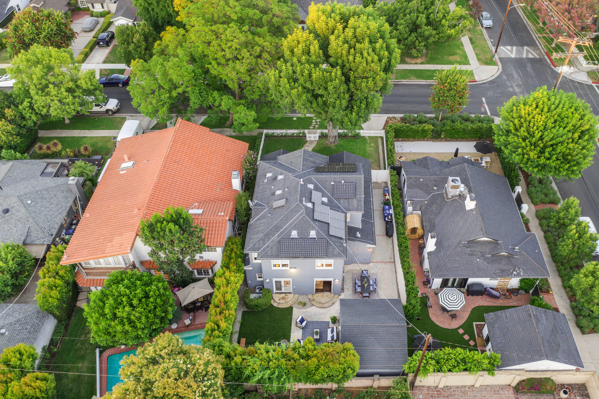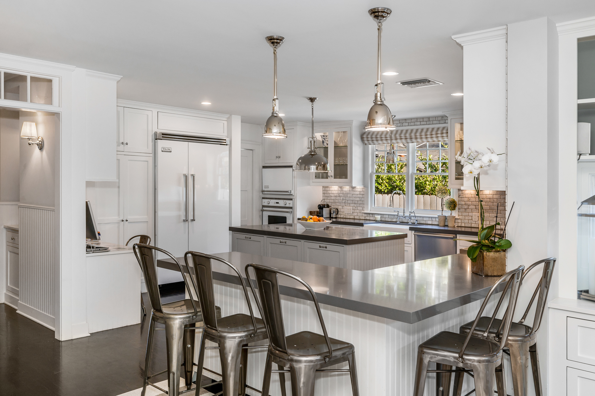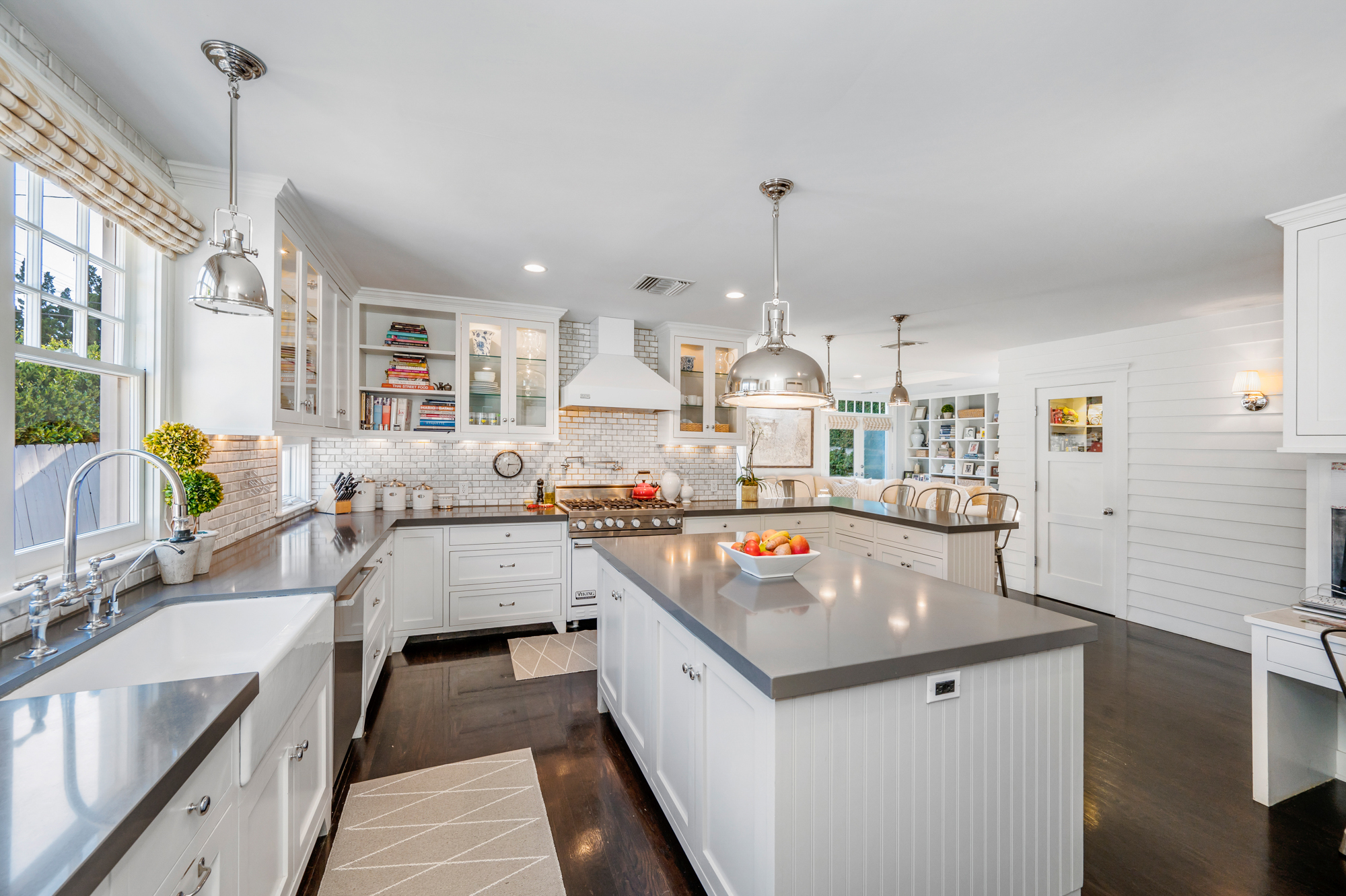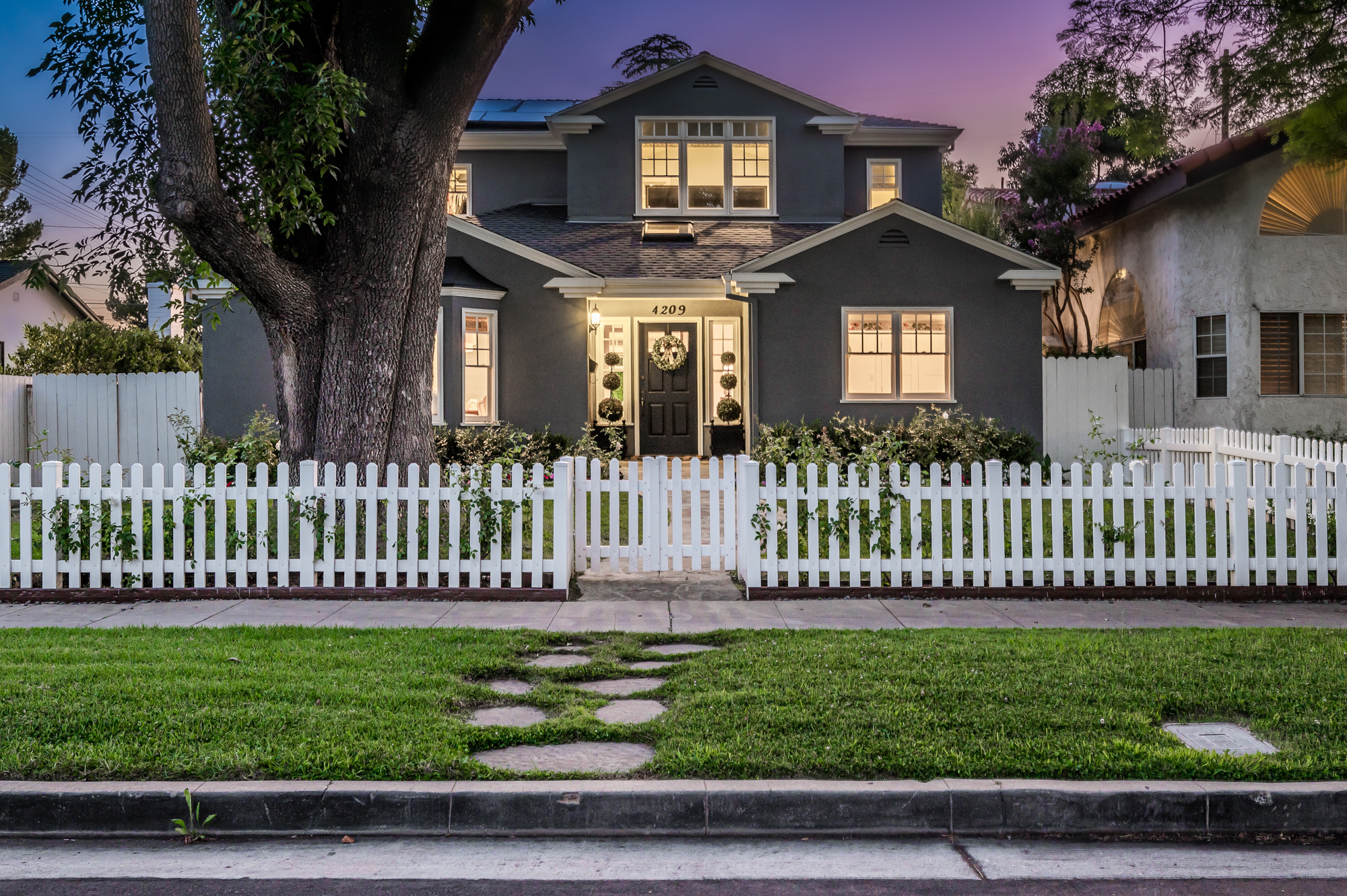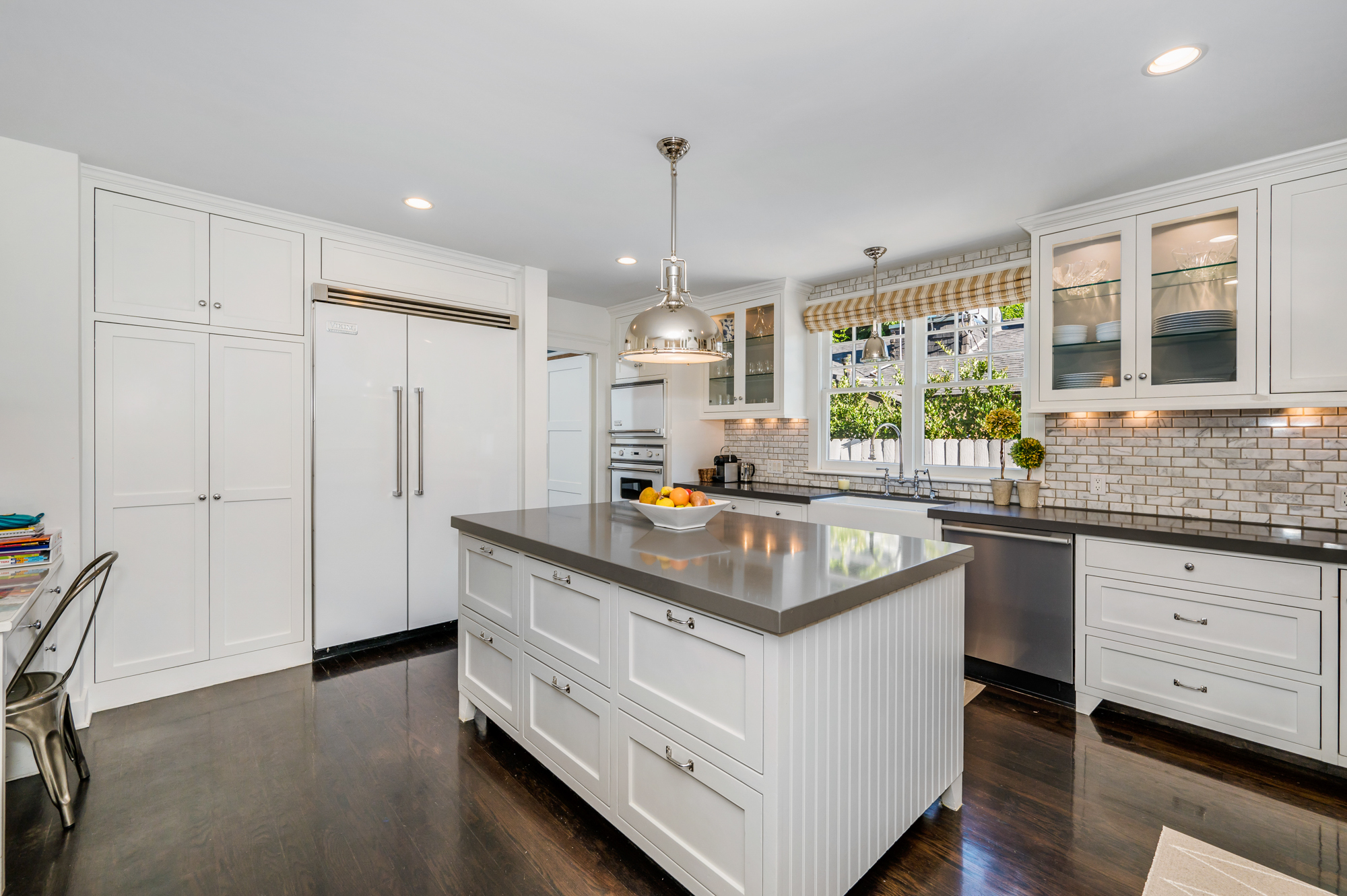 Set behind a charming picket fence on a tree lined street in the highly desirable Footbridge Square pocket of Studio City is this beautiful fully updated 5 bedroom traditional home in Carpenter School District. Down the walkway and past the spacious well manicured front lawn, enter into the light and bright formal entry with skylight. The living room is complete with a large bay window bench seat. Rich wood floors flow into the grand dining room with designer wall paper and built in cabinetry. The gourmet chef’s kitchen features Viking and Miele appliances, large center island, custom tile backsplash, and has a breakfast bar big enough for 5! Perfect for entertaining, the kitchen opens to the family room with floor to ceiling built-ins and double french doors to the backyard. The downstairs bedrooms are well sized and ideally situated as a guest room and playroom, home office, or more. Upstairs, the master retreat is the epitome of luxury with high ceilings, two walk in closets, and a bath with dual sink vanity and large shower with multiple shower heads and bench. The two additional bedrooms are well appointed and share a bath with dual sink vanity and large tub. The backyard offers the best of Southern California living, with ample space for dining, lounging, and playing. Additional features include custom drapery throughout, skylights, SOLAR PANELS, whole house filtration system, and so much more. This home is sure to provide years of happy memories to its new owners.